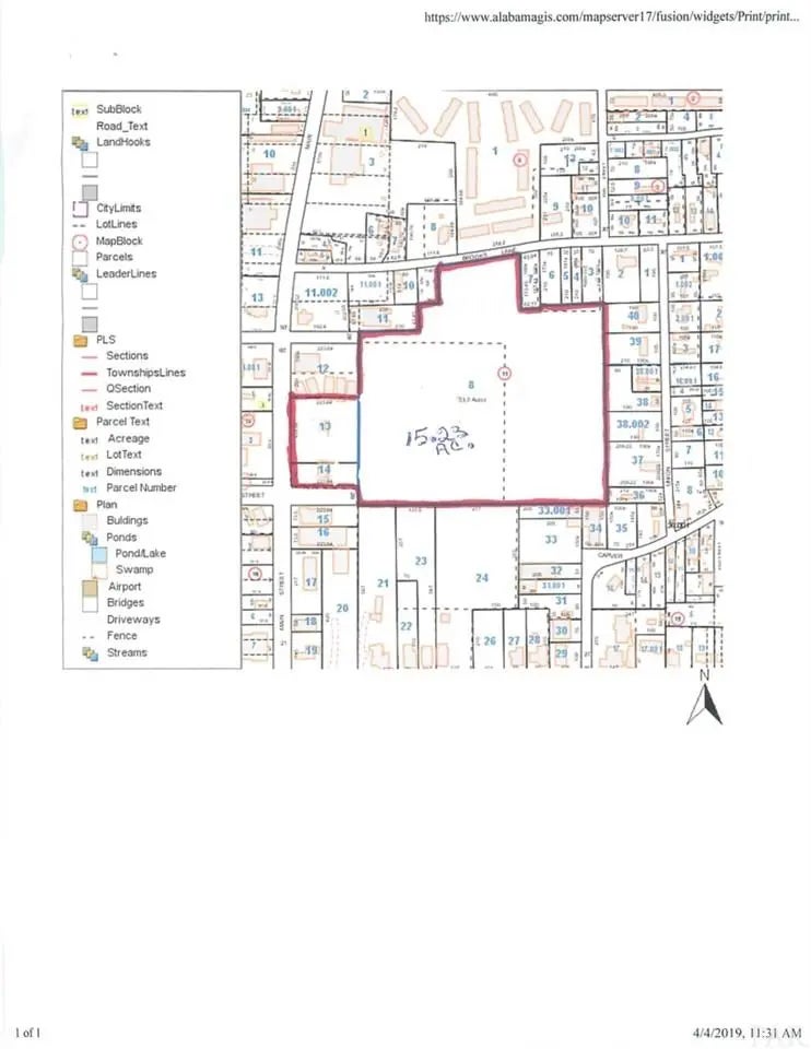 Opportunity & Potential Galore!! 'One of a kind' large 15+Acre land parcel located downtown Atmore on busy N Main ST. (AKA AL State Hwy 21). With 300+ feet street frontage, this parcel has great visibility and easy ingress and egress including two curb cuts & driveway entrances already in place. This site also has frontage along a side street. General Commercial 'B-2' Zoning already in place along with all utilities at the street. Possibilities are endless , Call for more details Soon!!