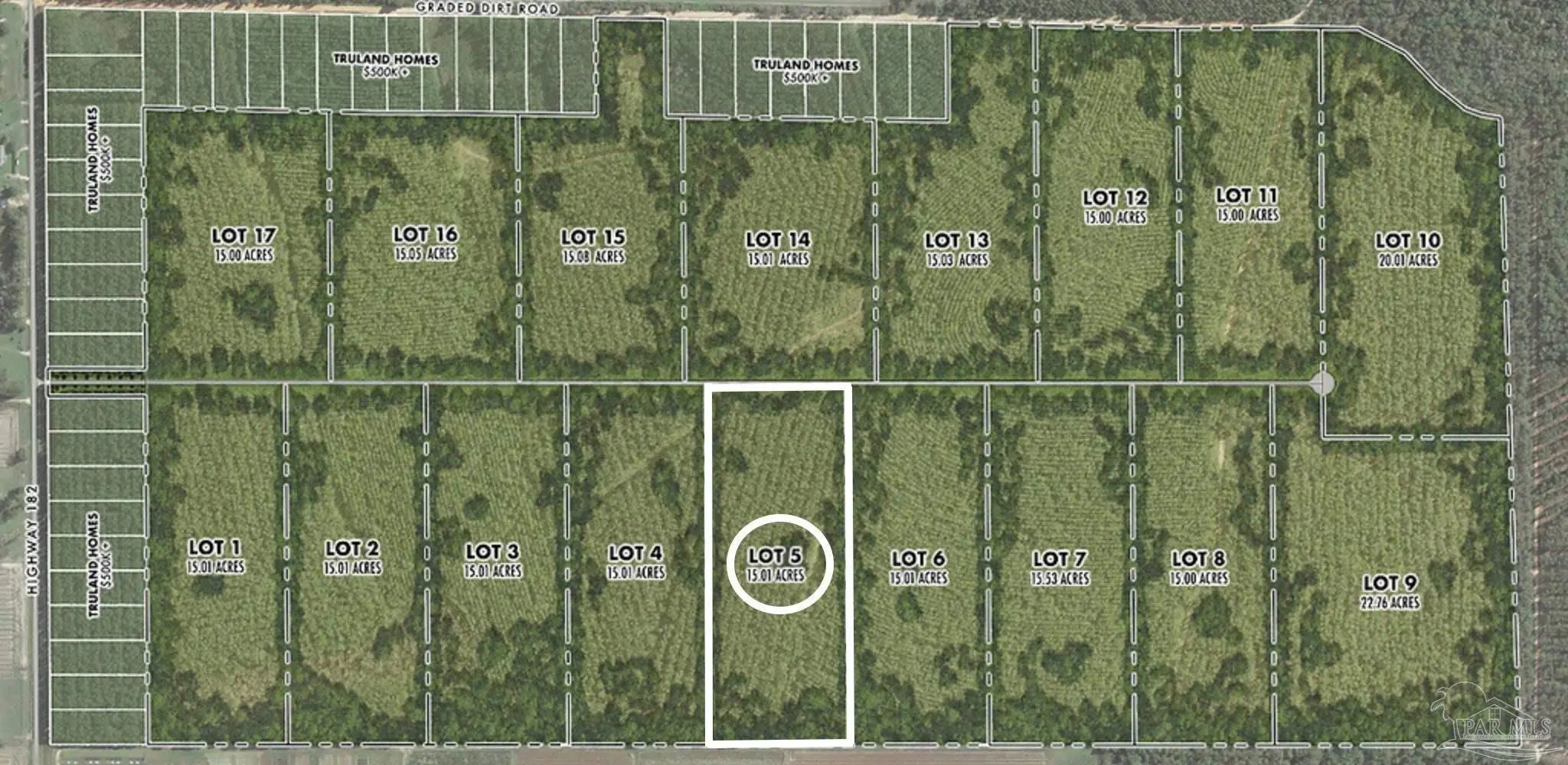 Lot 5 is a flat and private parcel located in the middle section of Denali Estates community. This beautiful and spacious homesite has 300 ft long cleared driveway leading to 1 acre cleared area ready for the future home and additional outbuilding. The culvert has been installed and is included with the property. Bring your builder or choose one of ours! DENALI ESTATES WAS JUST PAVED (NOVEMBER 2024). ONE OF THE MOST PRIVATE LAND COMMUNITIES IN SANTA ROSA COUNTY, FLORIDA. 15 & 20+ ACRE LOTS. 17 PARCELS ONLY. HIGH SPEED INTERNET AVAILABLE. Welcome to Denali Estates, a secluded large lot community situated just North of Pace, Florida in the beautiful Santa Rosa County Countryside. This 270 acre community offers you the upmost in privacy, tranquility, and spaciousness. Our 15 to 20+ acre lots are heavily wooded with mature pines, scattered oaks, and features road front widths of over 500’. These generous sized lots will allow for estate sized homes, outbuildings, pools, tennis courts, basketball courts, RV parking, and additional recreational vices. Denali Estates is close to many activities for the outdoor enthusiast. Santa Rosa County boast many opportunities to get outside and enjoy the best that nature has to offer. Our Gulf Coast welcomes you with the emerald blue waters of the Gulf of Mexico, some of the most beautiful sandy white beaches you’ve ever seen, and fun filled family water activities. If you prefer fresh water, Blackwater River offers freshwater fishing, kayaking and tubing. Blackwater State Forest has many small creeks, horseback riding, nature trails, zip lining, canoeing and tubing. While Denali Estates is located “off the beaten path” you will find the short drive to shopping (new Publix!), restaurants, and Big Box stores relaxing and enjoyable!