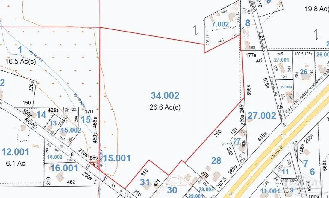 Flomaton, AL – Creek Front Acreage with Endless Possibilities! 26.67+/- acres with 200+/- feet of frontage on Bay Branch - Tucked away in the Pollard Community, this beautifully wooded tract of land offers an exceptional setting for those who crave space, privacy, and the peaceful sounds of nature. With creek frontage along Bay Branch—a tributary of the Conecuh River—this property delivers a truly scenic backdrop for your future home or weekend retreat. Mature trees surround the land, creating a natural buffer for your custom build or mobile home placement. Imagine days spent fishing, hunting, or riding trails by ATV—all without leaving your property. This is the kind of place where you can slow down, spread out, and enjoy the freedom that comes with rural living. There are wetlands present due to the creek, but the seller does not know how much. A gas line easement crosses the north end of the property (east to west), which is visible in the online photos. With 355 feet of paved road frontage on Wolf Log Road, you’ll enjoy easy year-round access and a smooth approach to your new homestead. Flomaton is a quiet, welcoming town that offers a break from the fast pace of city life—yet you're still close enough to daily essentials. If you’ve been looking for the right mix of natural beauty, recreational freedom, and potential for future development, this is one to act on. Call today to secure your next chapter in southern Alabama! Buyer is responsible for all due diligence and verifying all details related to this property.