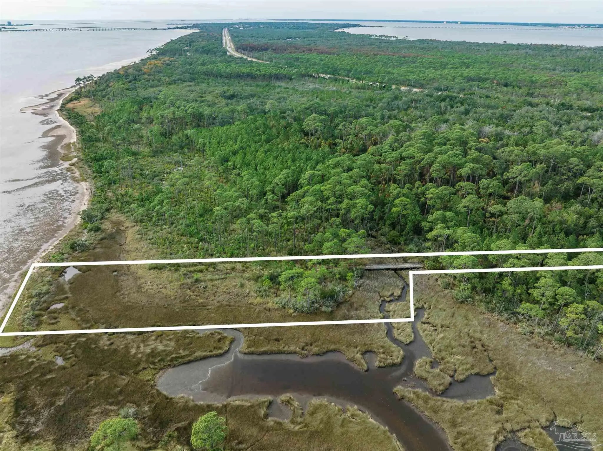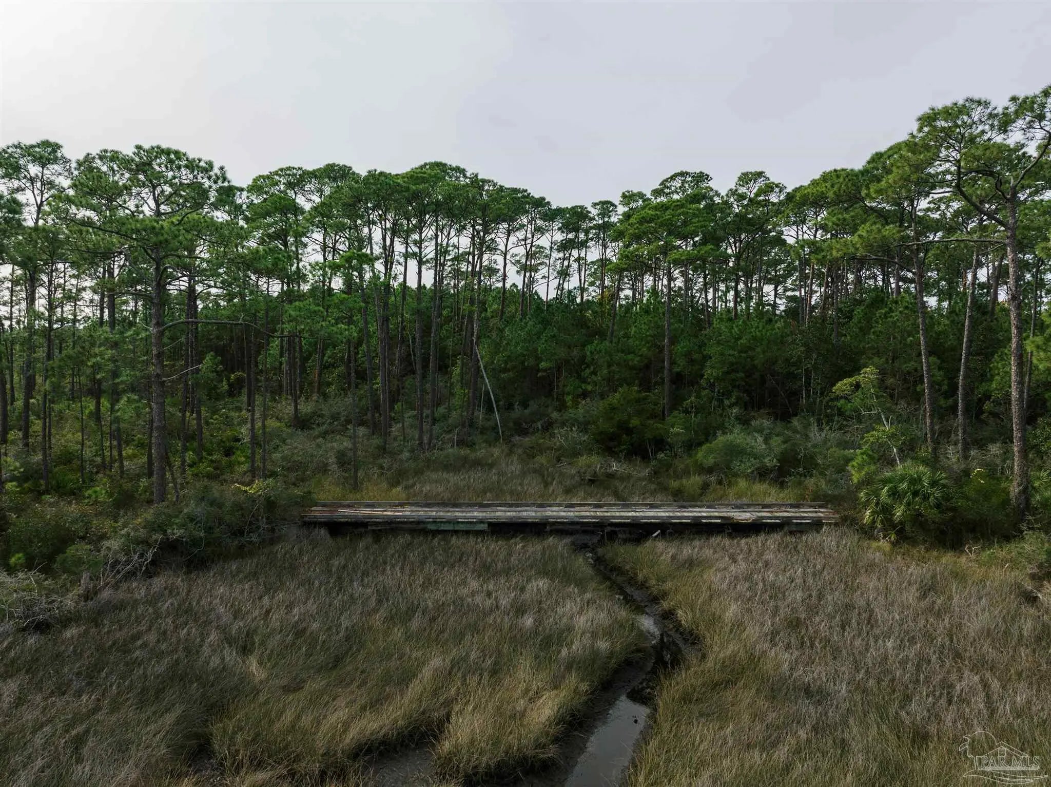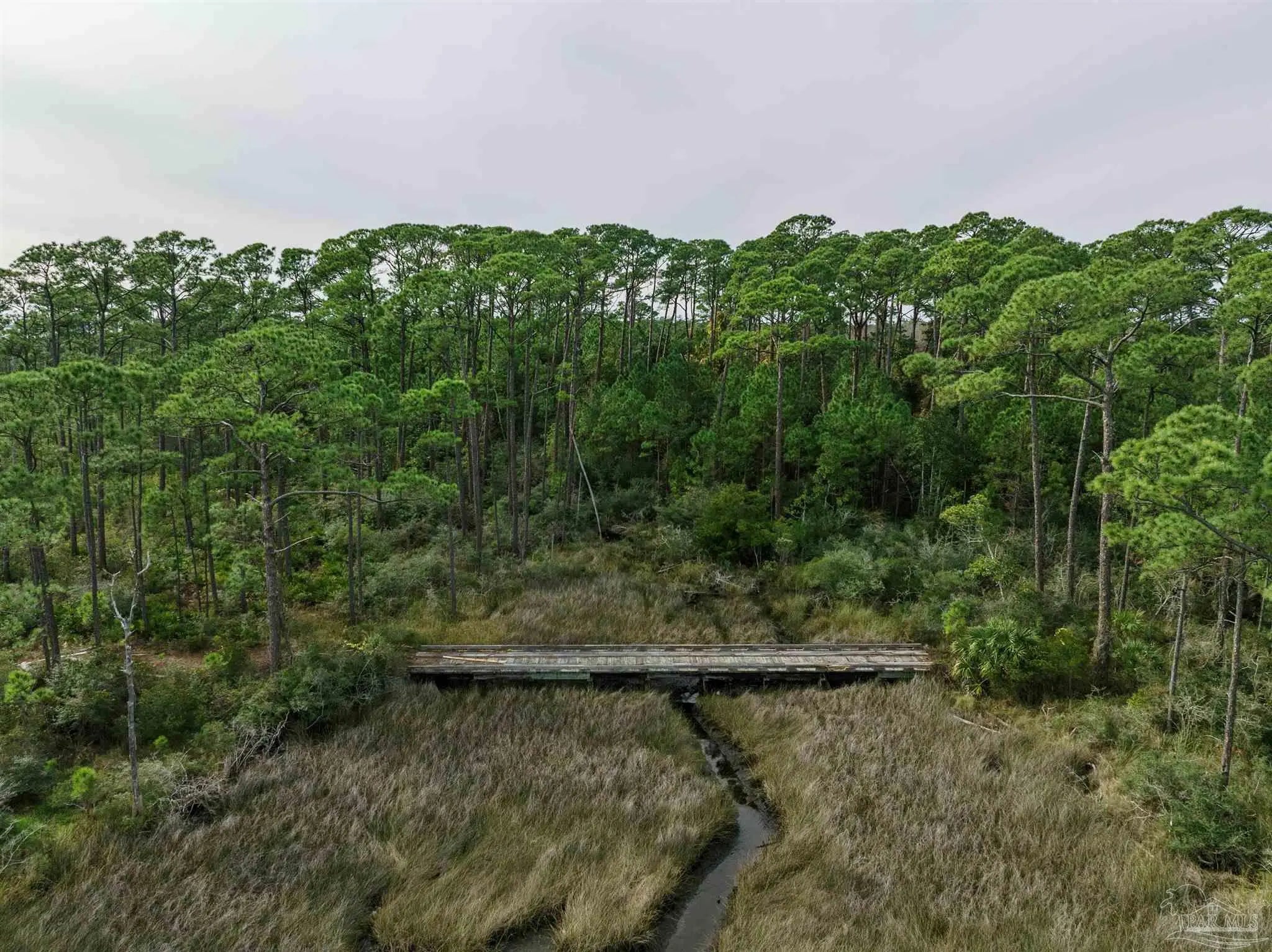 Waterfront and forest lot in Gulf Breeze on Santa Rosa Sound. Unique lot and location to build your dream home. This opportunity offers both waterfront living with fantastic sound views and the forest of the Naval Live Oaks Nature Preserve with access to over 7 miles of hiking trails! A true nature-lover’s paradise filled with mature trees, sawgrass, and with a continuously running spring, which attracts abundant wildlife. Access via private drive and bridge over estuary to partially-cleared lot. Home will require piling construction and further permitting prior to construction. Bring your love of nature and your imagination!