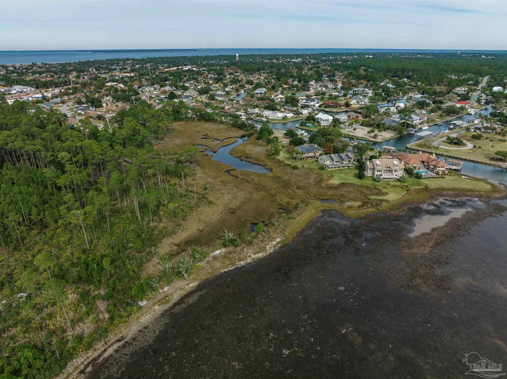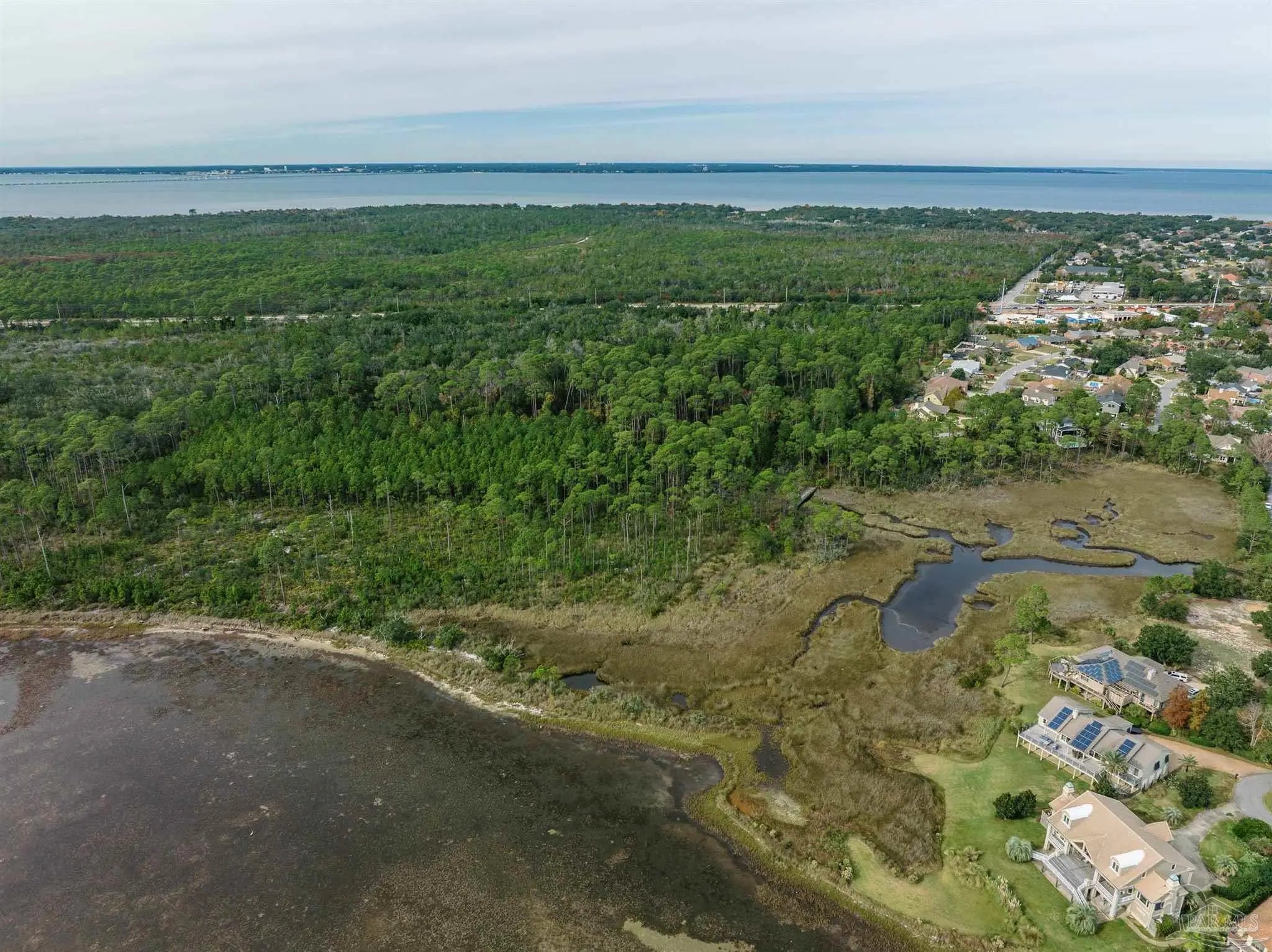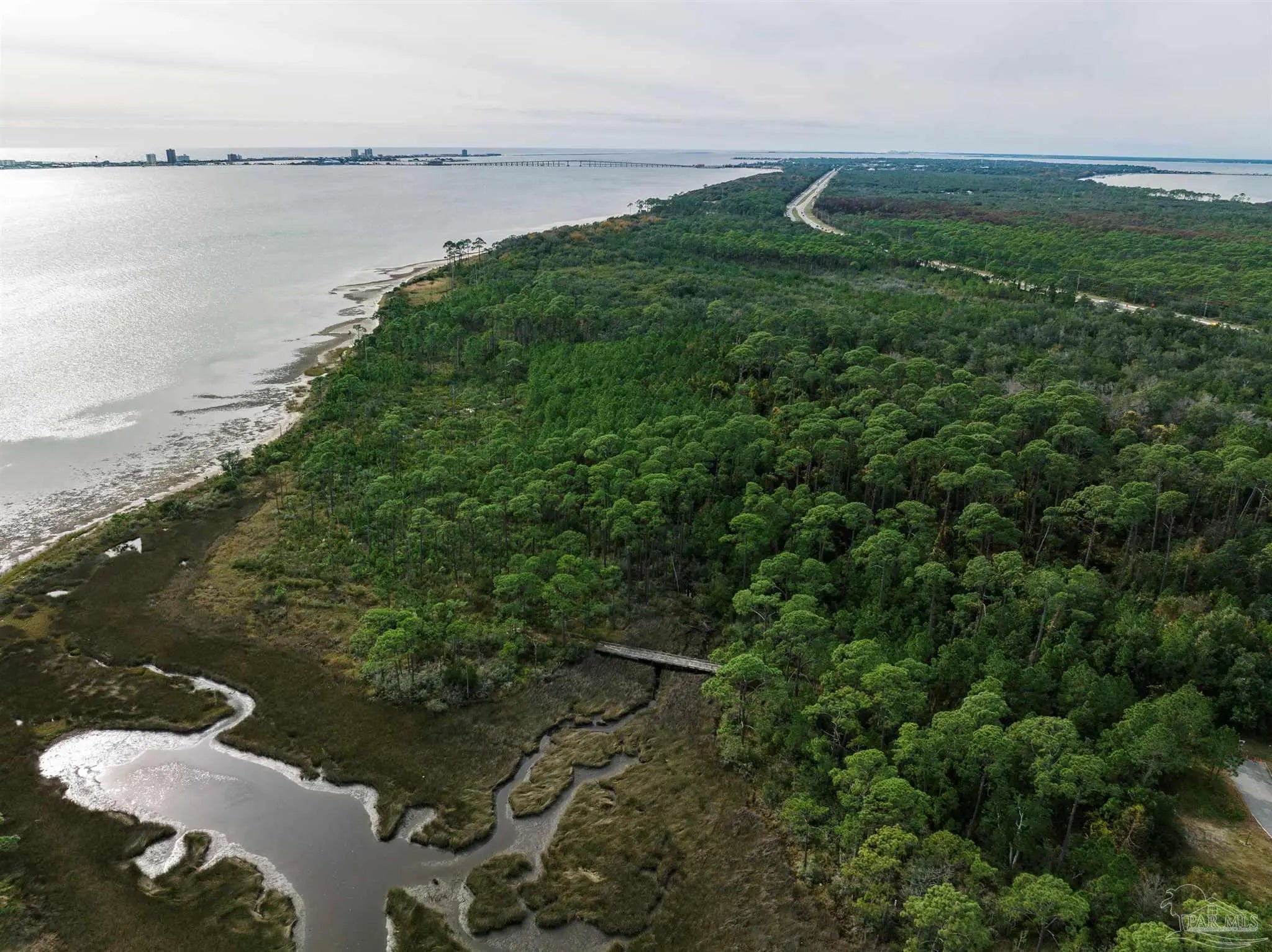 Waterfront and forest lot in Gulf Breeze on Santa Rosa Sound. Unique lot and location to build your dream home. This opportunity offers both waterfront living with fantastic sound views and the forest of the Naval Live Oaks Nature Preserve with access to over 7 miles of hiking trails! A true nature-lover’s paradise filled with mature trees, sawgrass, and with a continuously running spring, which attracts abundant wildlife. Access via private drive and bridge over estuary to partially-cleared lot. Home will require piling construction and further permitting prior to construction. Bring your love of nature and your imagination!