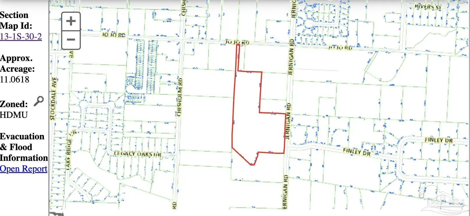 This property, spanning approximately 11.0618 acres, is zoned HDMU, 25 units per acrea, according to the Escambia County Property Appraiser website, making it suitable for development into apartments, condos, or townhouses. The site features 1.27 acres of wetlands, much of which comprises a lake along the southern boundary, providing natural buffers along with the wetlands on the western boundary. Key features of the property include: 458 feet of frontage along Jernigan Road 30 feet of frontage along Jo Jo Road Proximity to various amenities and landmarks, including: Approximately 2 miles from the University of West Florida (UWF) Close to Target Shopping Center, Publix, Walmart, and the Baptist Health Care Center on 9 Mile Road Near West Florida Hospital on University Parkway About 2 miles from Ellyson Clean Air Industrial Park and the University Mall area This prime location and natural surroundings make it an attractive site for residential development.