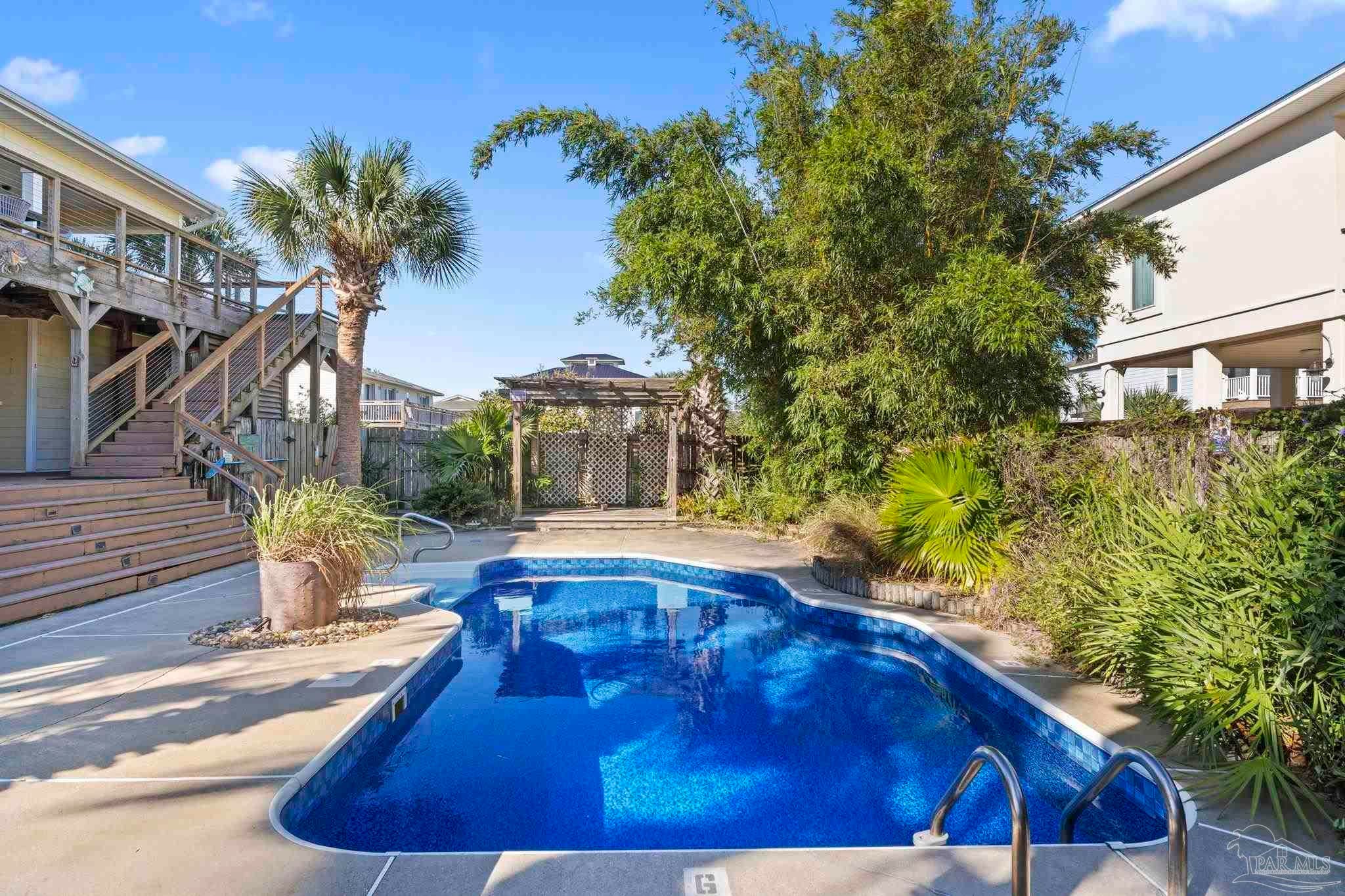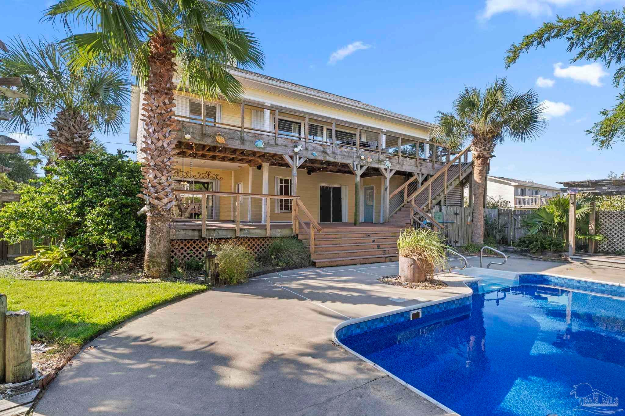 MOTIVATED SELLER — Proven Rental Income and 2025 Bookings Already Secured Exceptional opportunity to own a high-performing vacation rental just a short golf cart ride from Pensacola Beach. This two-story coastal home offers beautiful Sound views, convenient Gulf access, and a strong history of consistent rental bookings, making it ideal for both personal enjoyment and short-term rental income. Designed for maximum guest appeal, the home features expansive water-view decking and a private tropical backyard with a saltwater pool, hot tub, and tiki bar. The layout offers comfortable accommodations for large groups or multi-family stays. The main level includes: • Open-concept living area with fireplace, built-ins, and recessed lighting • Spacious kitchen with granite countertops, gas range, double ovens, and custom cabinetry • Primary suite with Sound views, private deck access, travertine double vanity, garden tub, and separate shower • Second en-suite bedroom with private south-facing balcony The elevated and fully insurable lower level adds value with: • Second kitchen and living area • Two additional bedrooms and full bath • Potential for separate rental unit to increase income Constructed for long-term durability with impact windows, storm shutters, Hardie siding, spray-foam insulation, and a metal roof. An oversized two-car garage offers excellent storage for beach gear and golf carts. With strong rental performance, advance bookings, and desirable coastal amenities, this property stands out as a rental investment on the Emerald Coast. A rare opportunity to own a turnkey coastal income property in a highly sought-after location.
