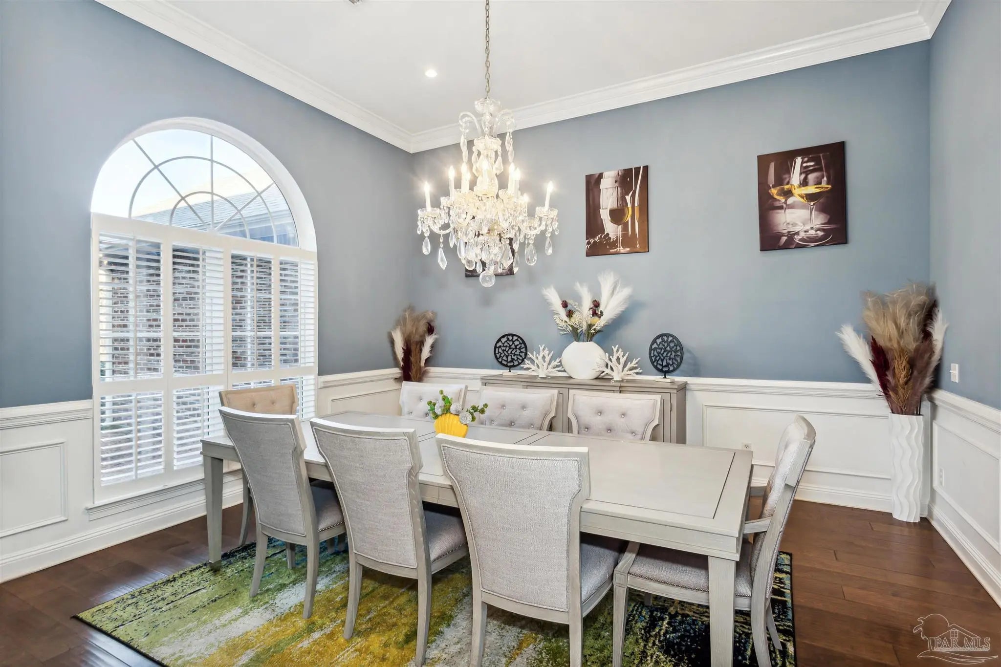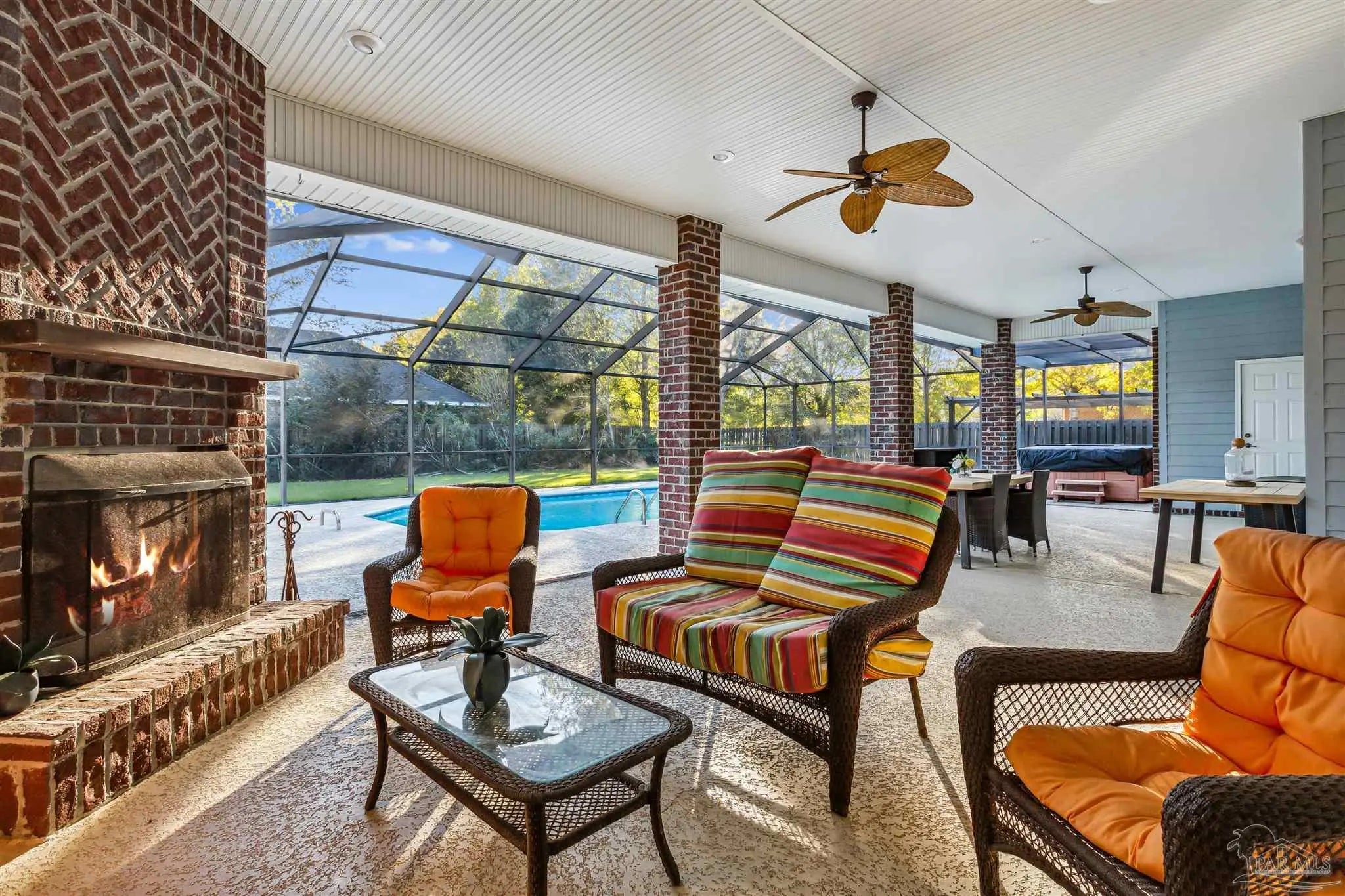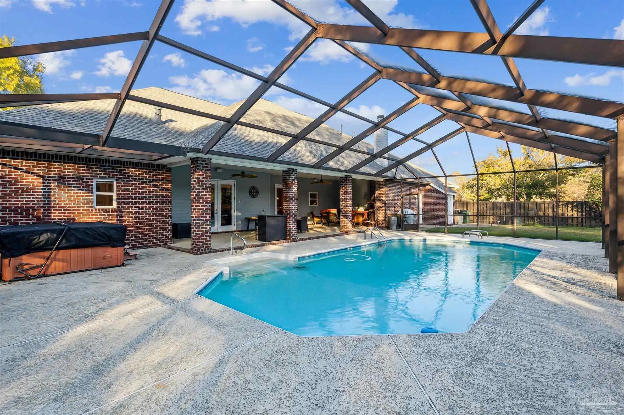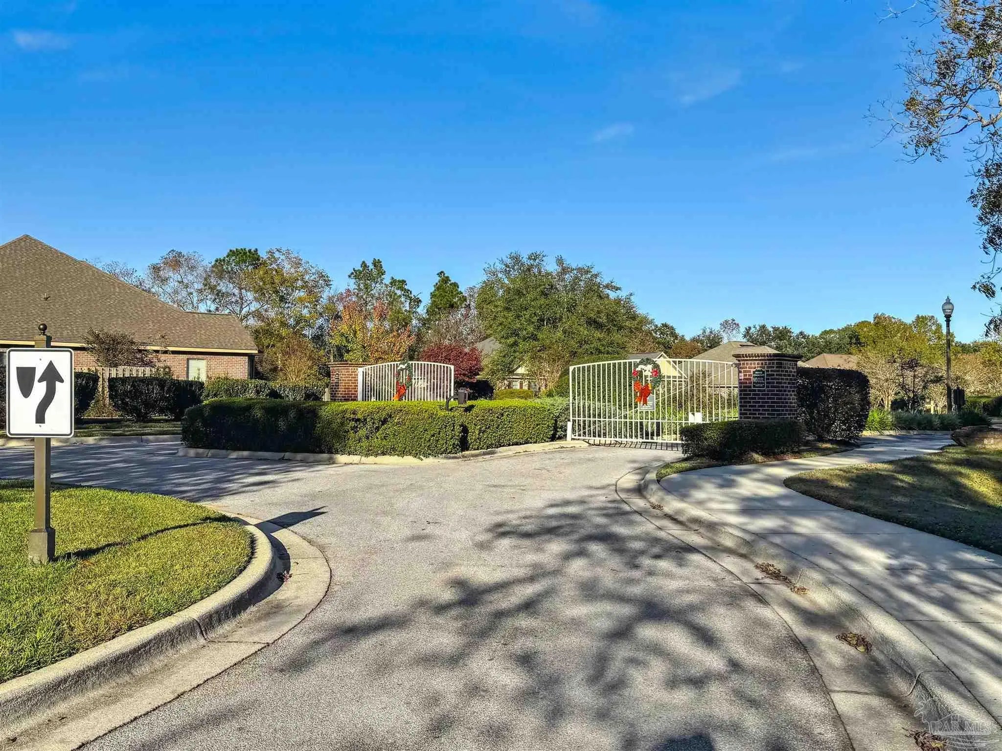 Beautiful custom-built home with lots of details, in a private gated community. In-ground swimming pool with enclosure, covered lanai, hot tub, outside kitchen with a wood burning fireplace. Great curb appeal with pavers welcoming you to the front door. This all-brick home has a 3-car side entry garage with additional workspace on an oversized corner lot overlooking landscaped common areas offering additional privacy. This neighborhood has matured landscaping with sidewalks and street lights. Upon entering this home, you will be amazed at the inviting foyer, high ceilings, ached entryways with columns, with open design and beautiful wood floors. The kitchen has plenty of cabinet space, granite countertops, gas Jenn-Air cooktop, a HUGE pantry and small desk area. Large family room with gas fireplace, wet bar, and double crown molding with beautiful ceiling details. Formal dining room with wainscoting, a large beautiful crystal chandelier, and crown molding. Huge master bedroom and lovely bath suite and huge closets. All bedrooms are very spacious, 4 bedrooms, 3.5 baths. The exterior features beautiful Crepe Myrtles and season changing Maple trees, a well and sprinkler, an outdoor gas fireplace, additional pad with access to the exterior storage, Generac generator. HVAC 2019 - Gas Furnace and 20 Seer 5-ton Rheem AC, heat pump, roof 2021. Home is close to Navy Federal and Interstate 10 from 2 Exits, for easy travel and convenience to and from, and to Beautiful Pensacola Beach!