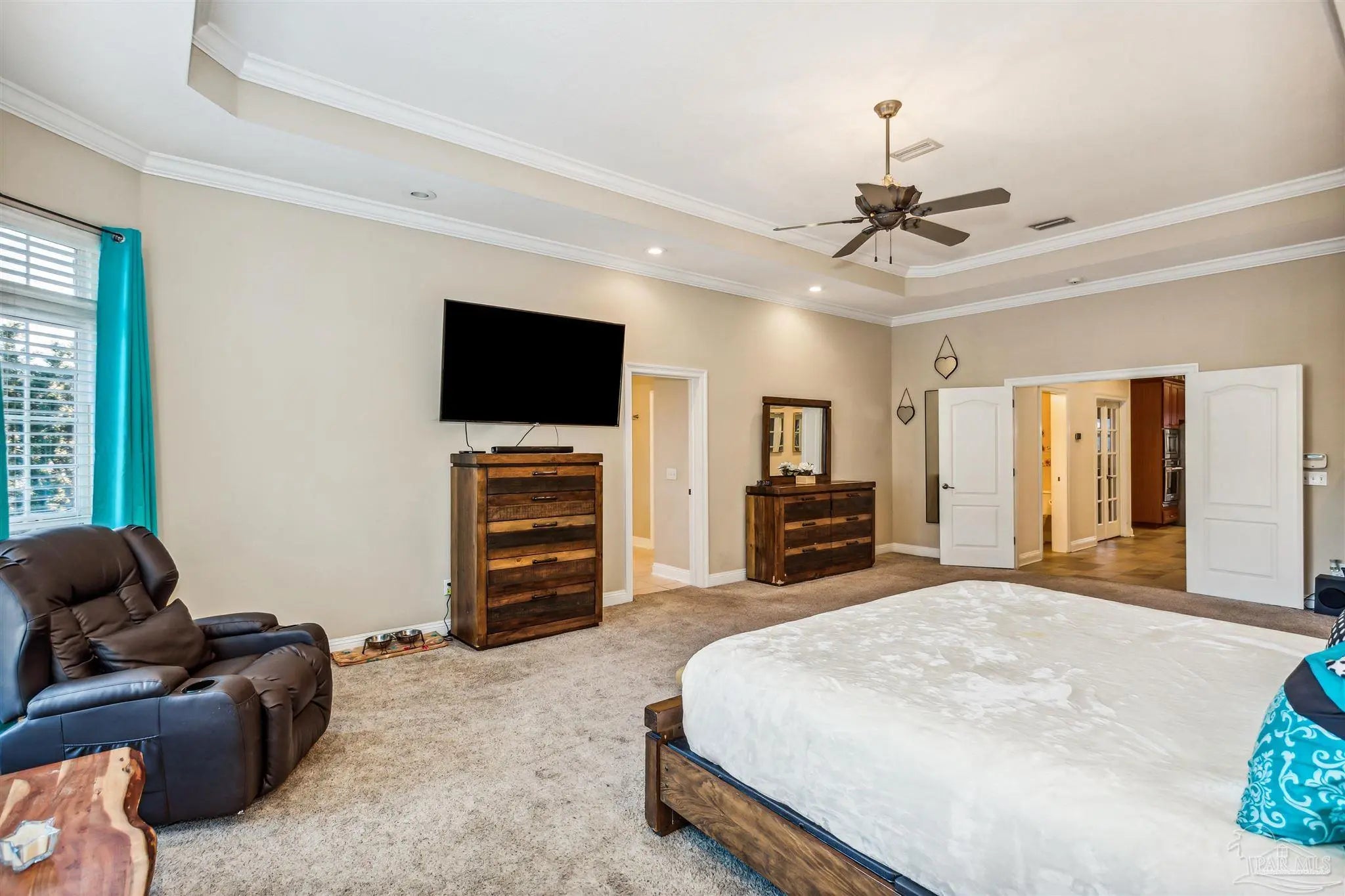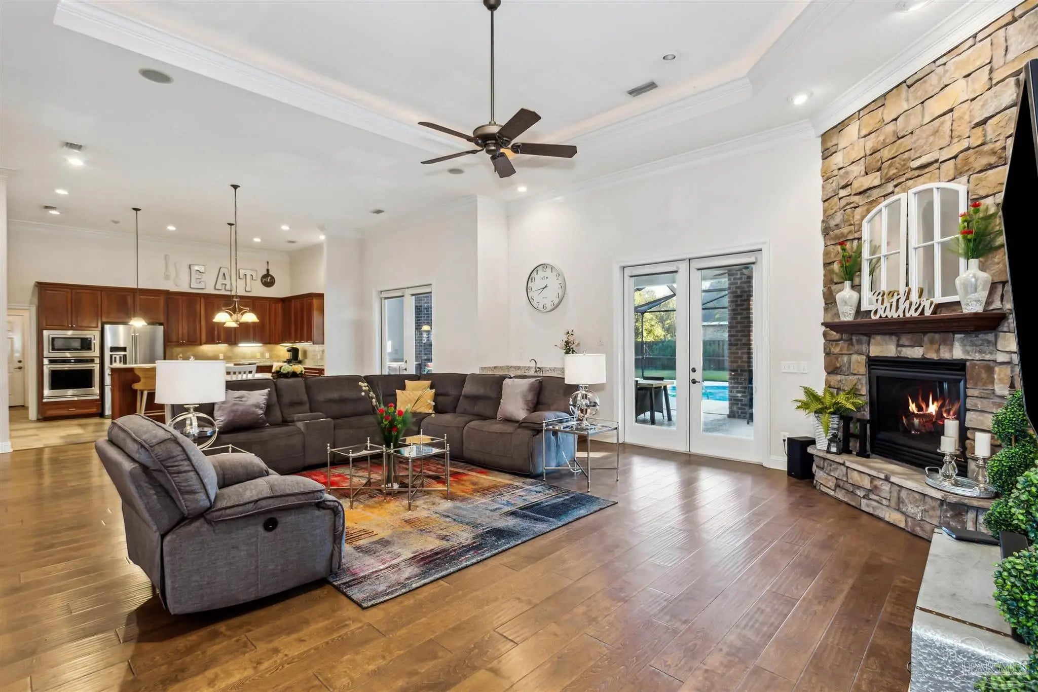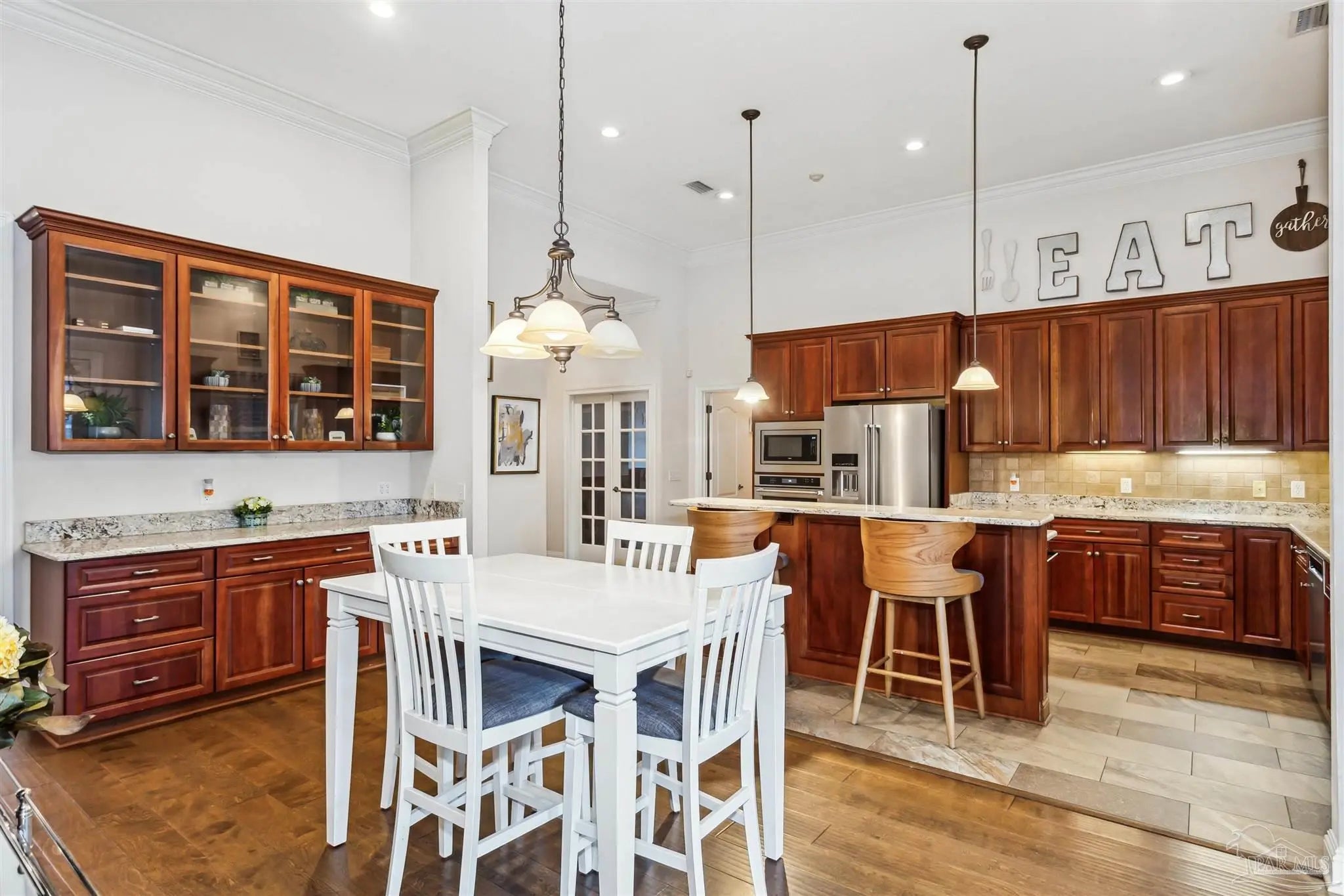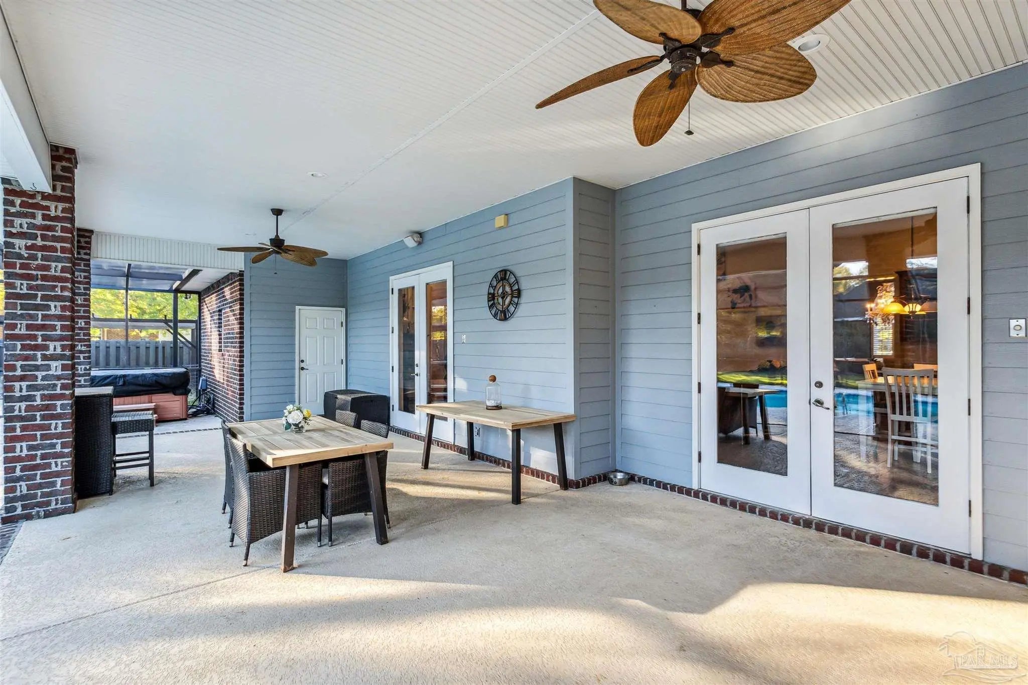Beautiful custom-built home with lots of details, in a private gated community. In-ground swimming pool with enclosure, covered lanai, hot tub, outside kitchen with a wood burning fireplace. Great curb appeal with pavers welcoming you to the front door. This all-brick home has a 3-car side entry garage with additional workspace on an oversized corner lot overlooking landscaped common areas offering additional privacy. This neighborhood has matured landscaping with sidewalks and street lights. Upon entering this home, you will be amazed at the inviting foyer, high ceilings, ached entryways with columns, with open design and beautiful wood floors. The kitchen has plenty of cabinet space, granite countertops, gas Jenn-Air cooktop, a HUGE pantry and small desk area. Large family room with gas fireplace, wet bar, and double crown molding with beautiful ceiling details. Formal dining room with wainscoting, a large beautiful crystal chandelier, and crown molding. Huge master bedroom and lovely bath suite and huge closets. All bedrooms are very spacious, 4 bedrooms, 3.5 baths. The exterior features beautiful Crepe Myrtles and season changing Maple trees, a well and sprinkler, an outdoor gas fireplace, additional pad with access to the exterior storage, Generac generator. HVAC 2019 - Gas Furnace and 20 Seer 5-ton Rheem AC, heat pump, roof 2021. Home is close to Navy Federal and Interstate 10 from 2 Exits, for easy travel and convenience to and from, and to Beautiful Pensacola Beach!