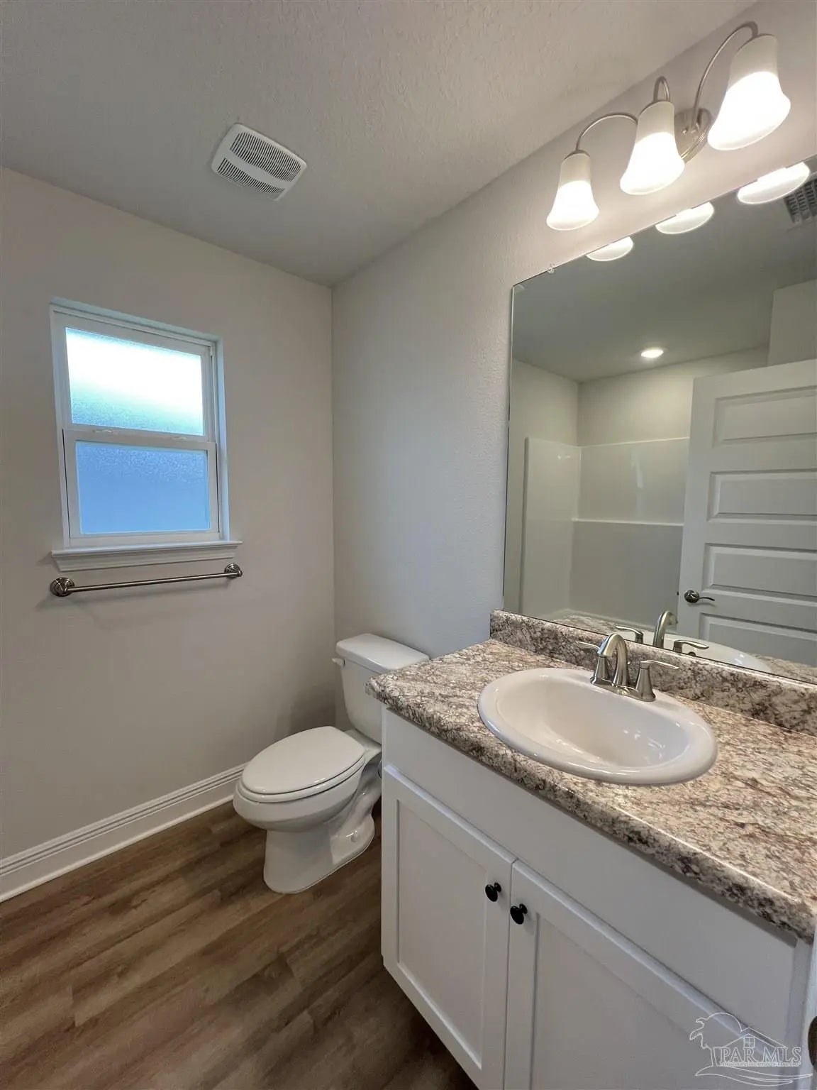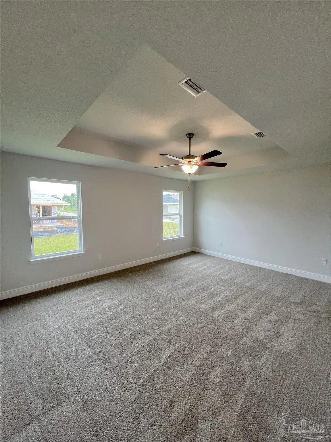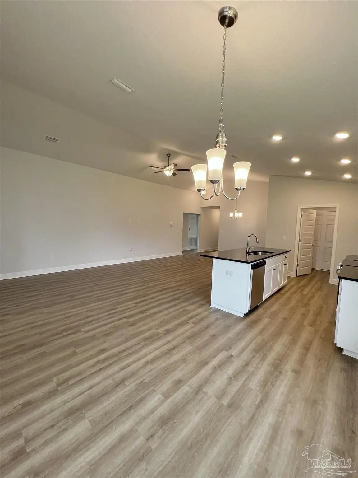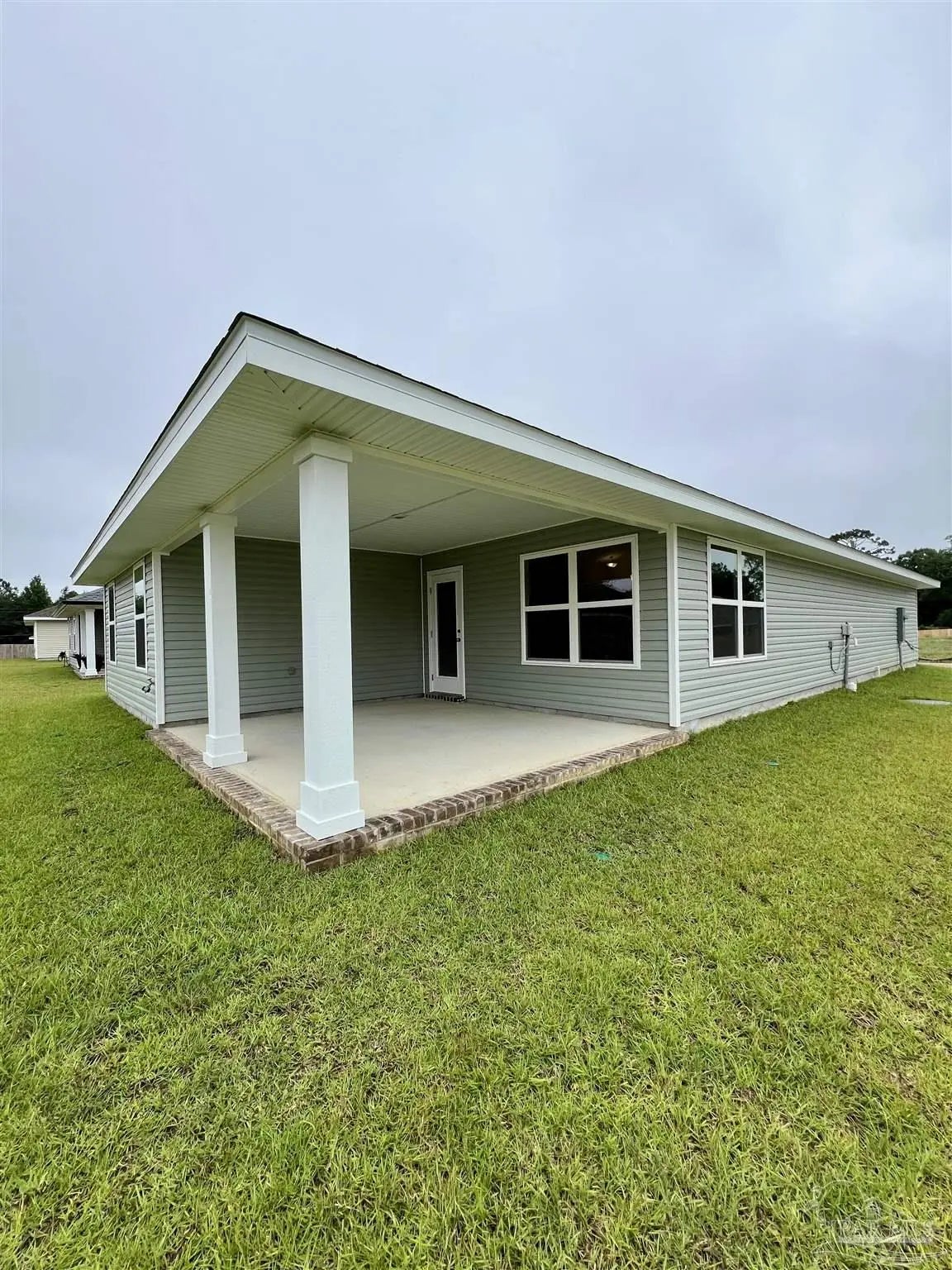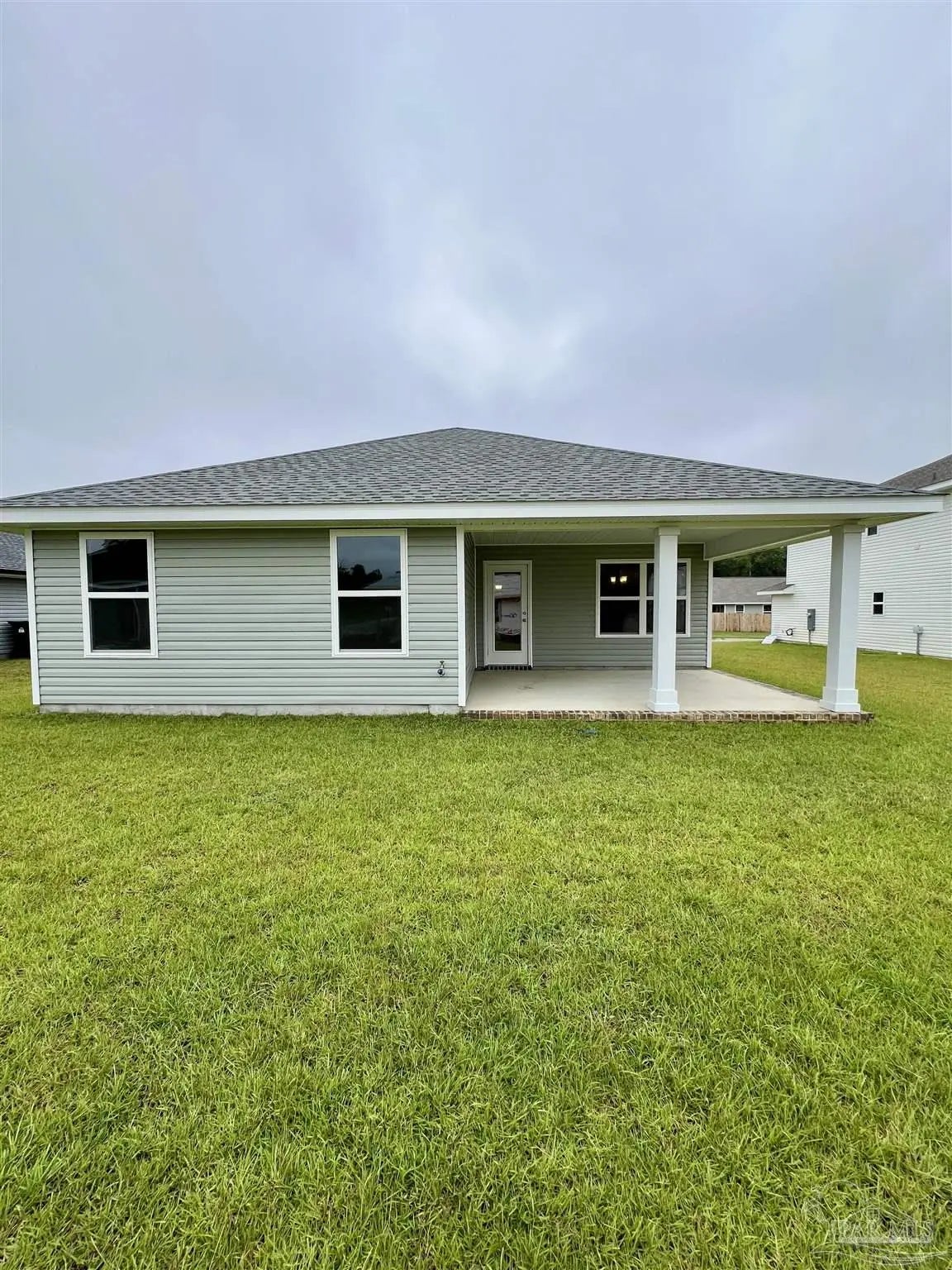 Move in ready!! CONVENIENTLY LOCATED NEAR NAVY FEDERAL AND UWF AND SHOPPING. THIS 1425 SF Home features 3 beds and 2 baths with brick front and 3 sides of vinyl outside. One enters through foyer and into open floor plan great room with kitchen and vaulted ceilings. The kitchen contains stainless steel appliances and a large island along with a pantry in the laundry room which is off the kitchen. Kitchen has all wood cabinets, cabinet hardware and crown molding trim. There is an eat in kitchen area and dining room area in this open room. 2 bedrooms are off a small hall way at the front of the house along with a bathroom with single sink and laminate countertops. The primary bedroom is toward the back of the home with a tray ceiling, ceiling fan, and primary bath. Primary bath has double sink vanity. There is also a large covered patio in the back and there is a 2 car garage.