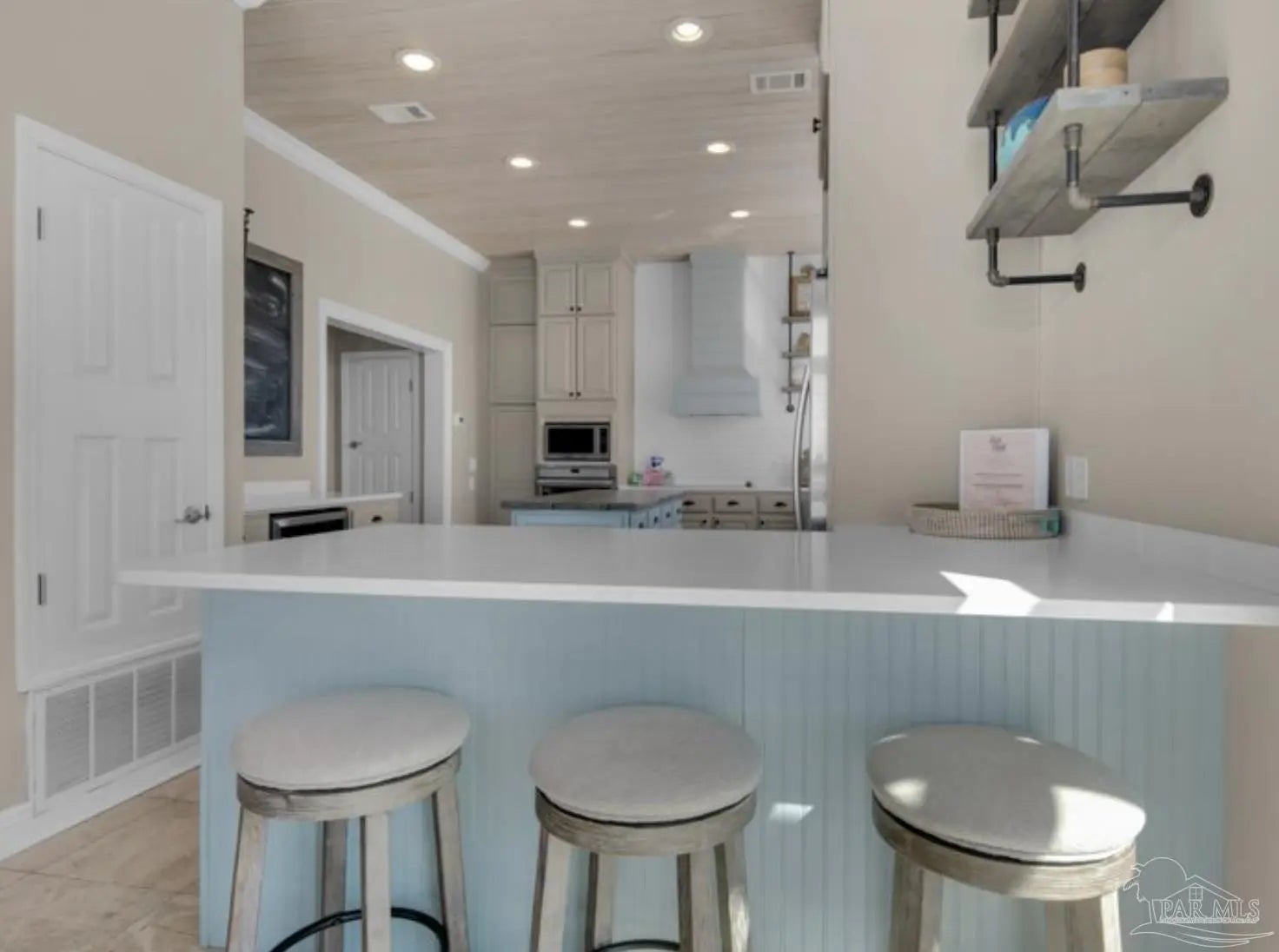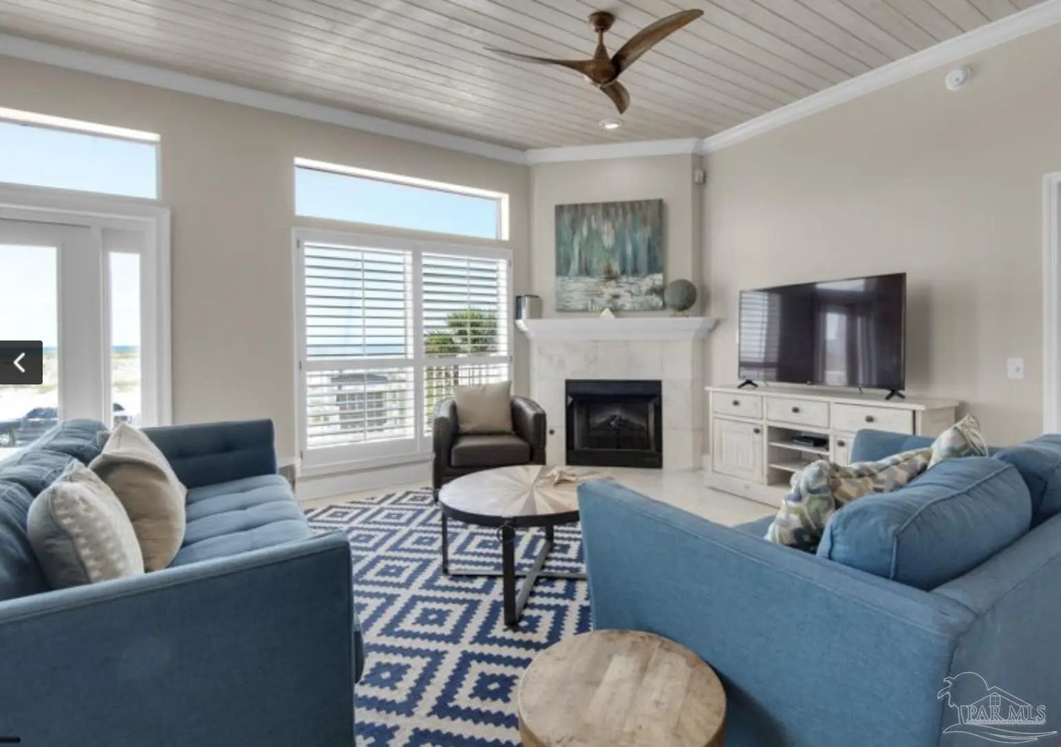 This is a beautiful updated Ariola Drive house with unrestricted gulf views and beach access just steps from the driveway. Very well suited for large groups! This home has a gorgeous living, dining and kitchen area decorated in traditional coastal colors. The blues and greens of the gulf run throughout the entire space. The kitchen is a dream, with custom cabinets, counters, and appliances. The kitchen opens to a spacious dining area and a breakfast bar. You can also enjoy the large outdoor deck. The gulf side living room has a lovely fireplace.