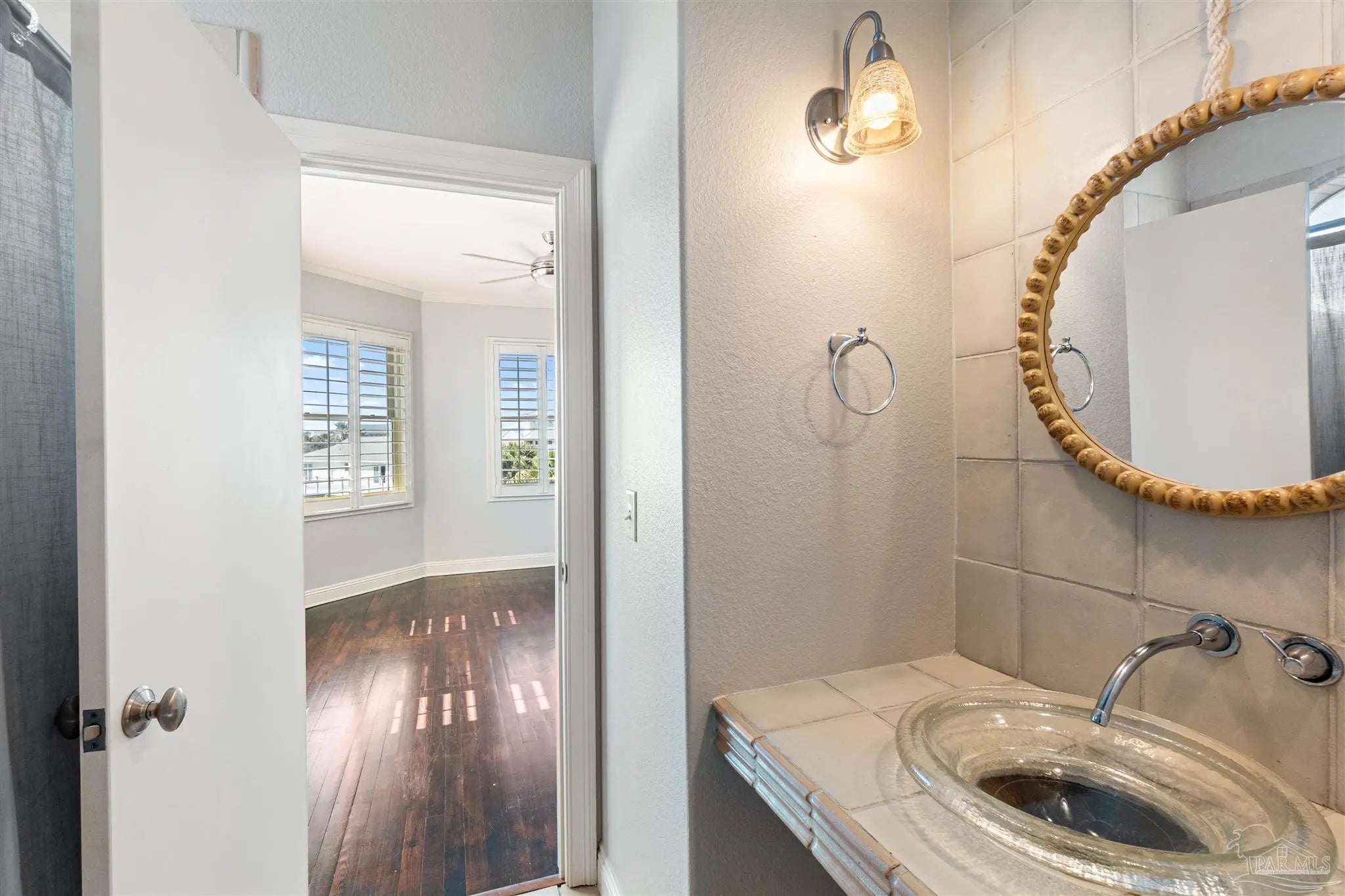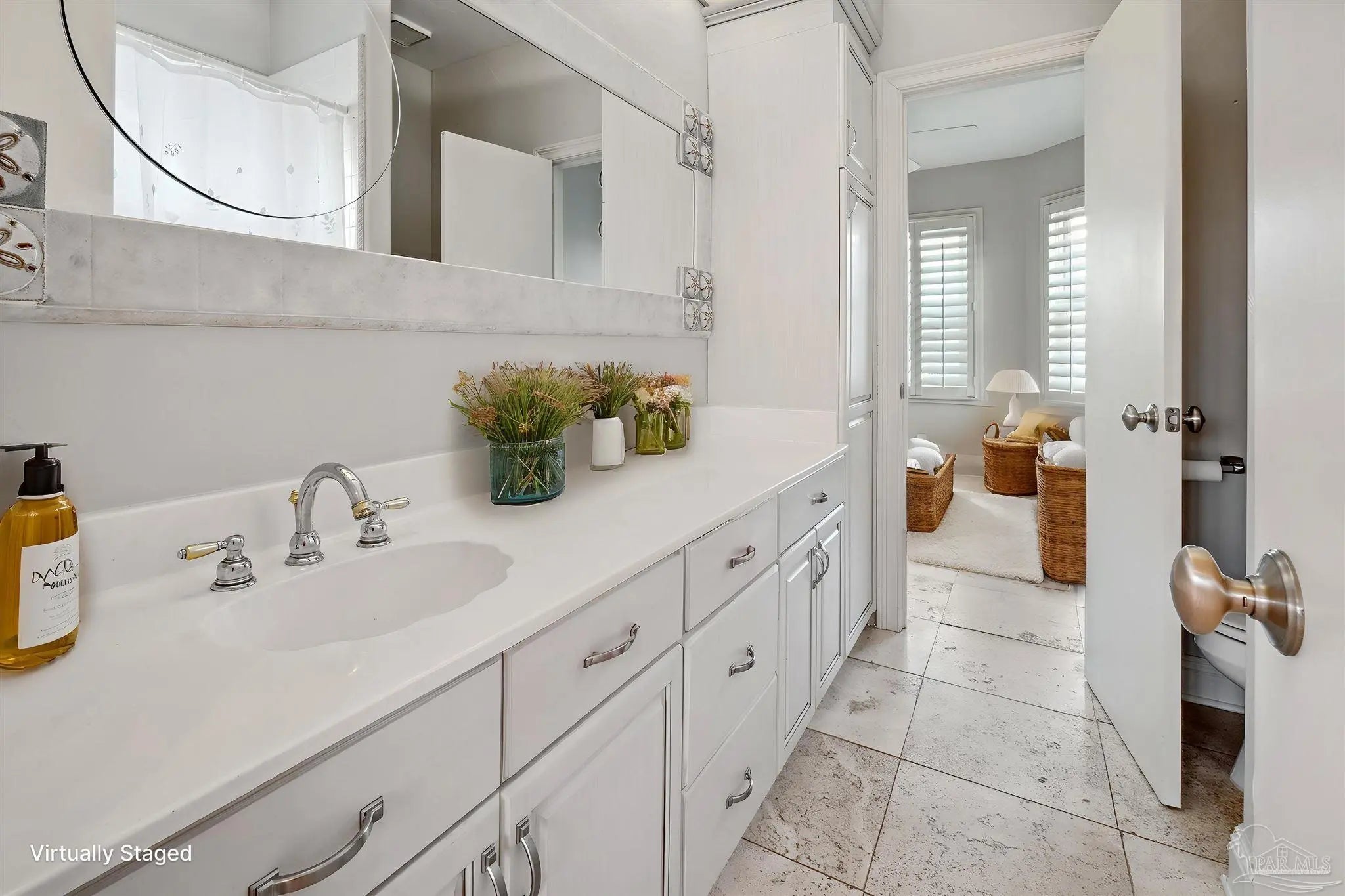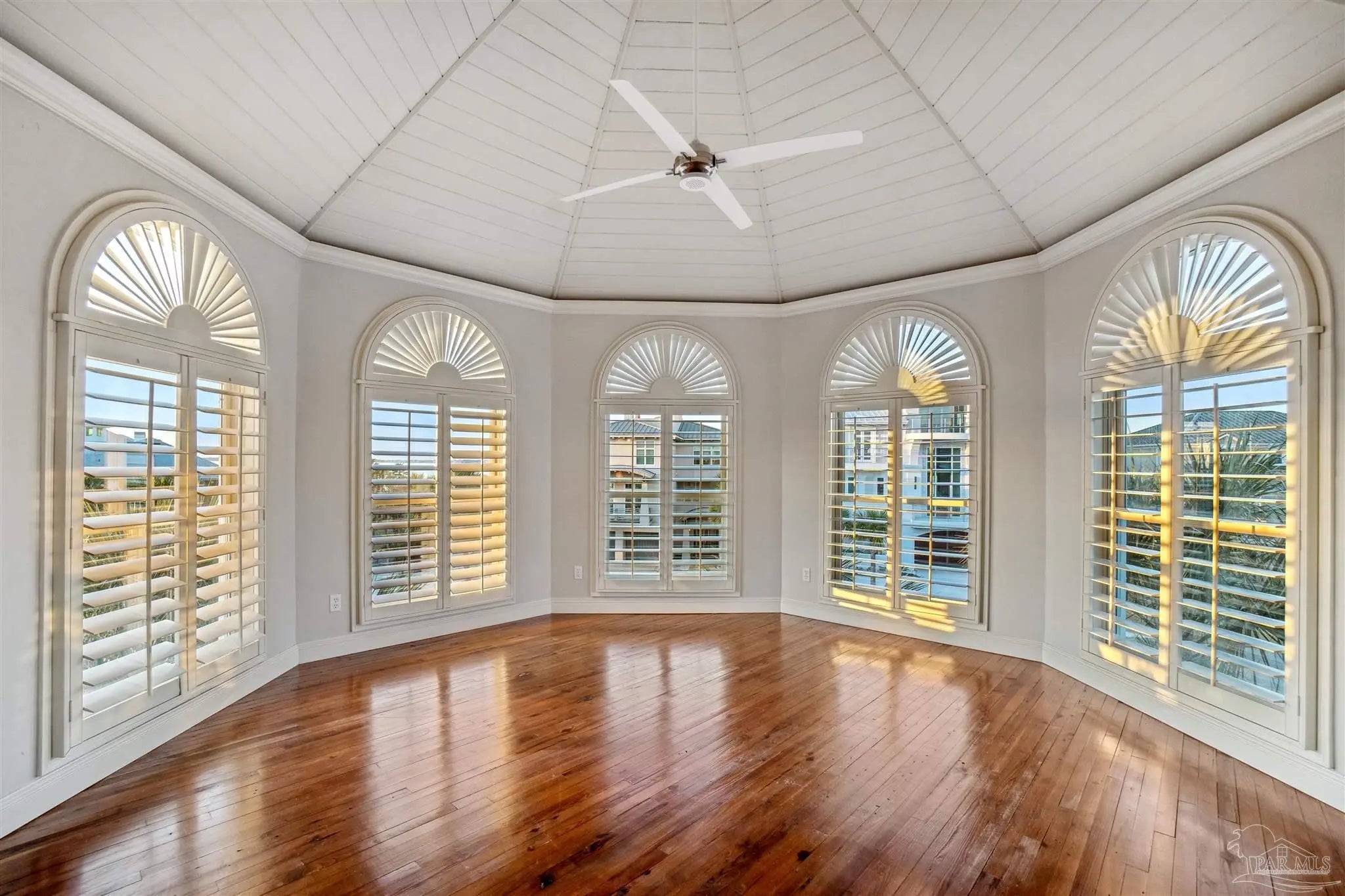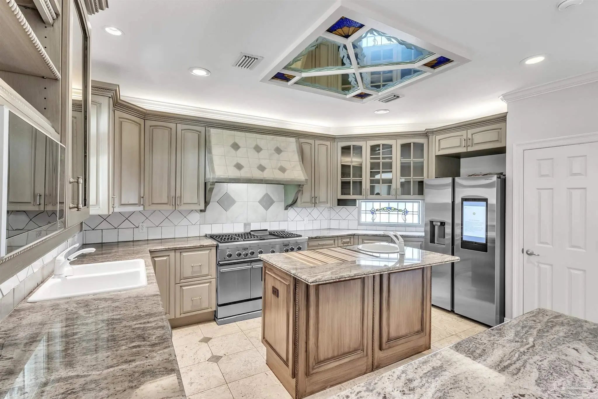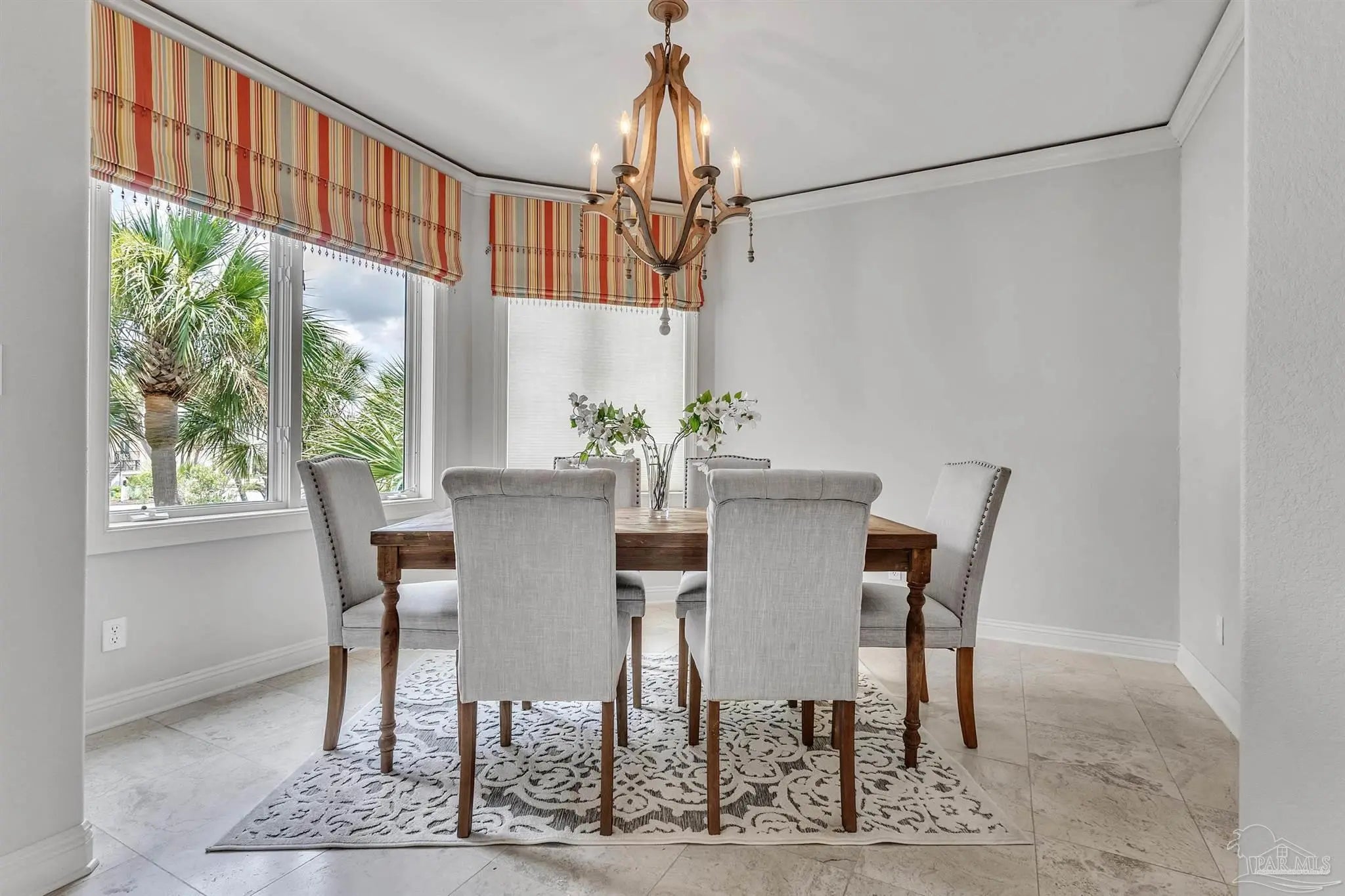 Thoughtfully situated in the charming Seashore Village community, this custom-built 3,500 sq. ft. island retreat offers beautiful views of the Santa Rosa Sound from one of the largest lots in the neighborhood. Designed for both elegance and comfort, this five-bedroom, three-and-a-half-bathroom home is a true coastal masterpiece.Step inside to a spacious and inviting living area, where travertine flooring, high ceilings, and abundant natural light welcome you. The gourmet kitchen is a chef’s dream, boasting granite countertops, custom cabinetry, and top-of-the-line appliances, making it perfect for entertaining. Unique artistic touches throughout the home add character. Elegant plantation shutters further enhance the coastal charm.The expansive master suite is a private oasis, featuring antique heart pine wood flooring, a custom entryway, and a home office with built-in cabinetry and vintage stained glass windows. A breathtaking rotunda off the master bedroom provides a cozy retreat with stunning water views. The suite also boasts two large walk-in closets, home office with custom cabinetry and a renovated spa-like master bath, designed for ultimate relaxation.This home is move-in ready with major recent upgrades, including a newer metal roof (2021), a newer hot water heater, and two newer HVAC units for energy-efficient comfort year-round. Outside, the large covered water view deck and multiple sitting areas offer the perfect setting for entertaining or unwinding in the coastal breeze. The spacious three-car garage provides ample storage for vehicles, beach gear, and more. With exclusive access to a community dock just steps away and the Gulf of Mexico within a short walk, this home offers the opportunity to, “Own the Lifestyle.”