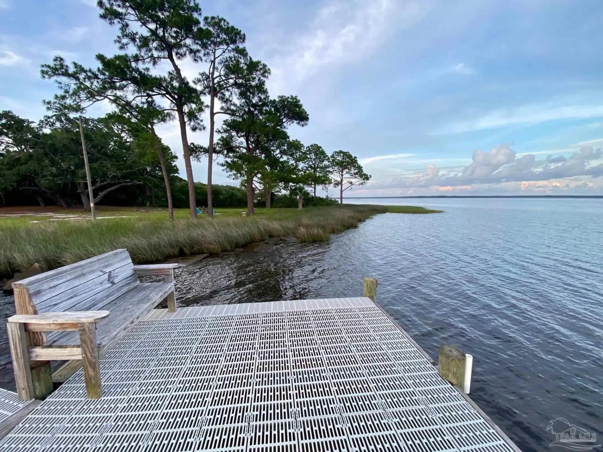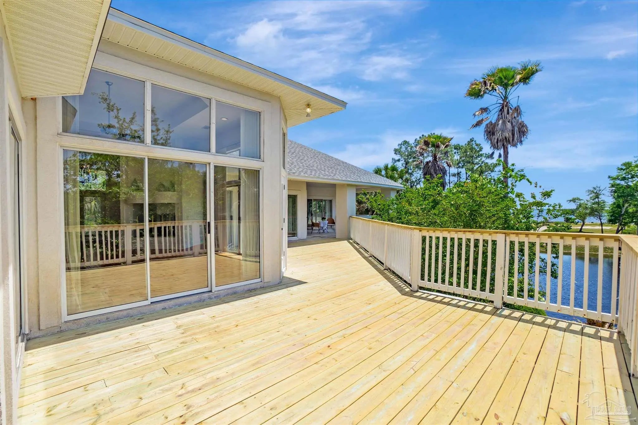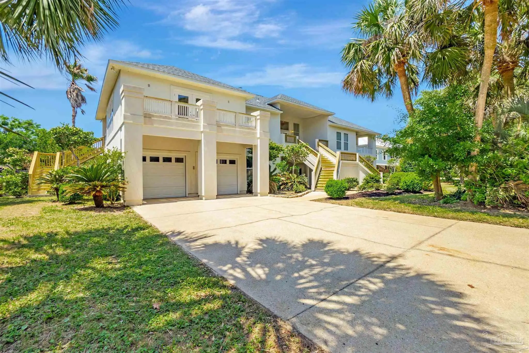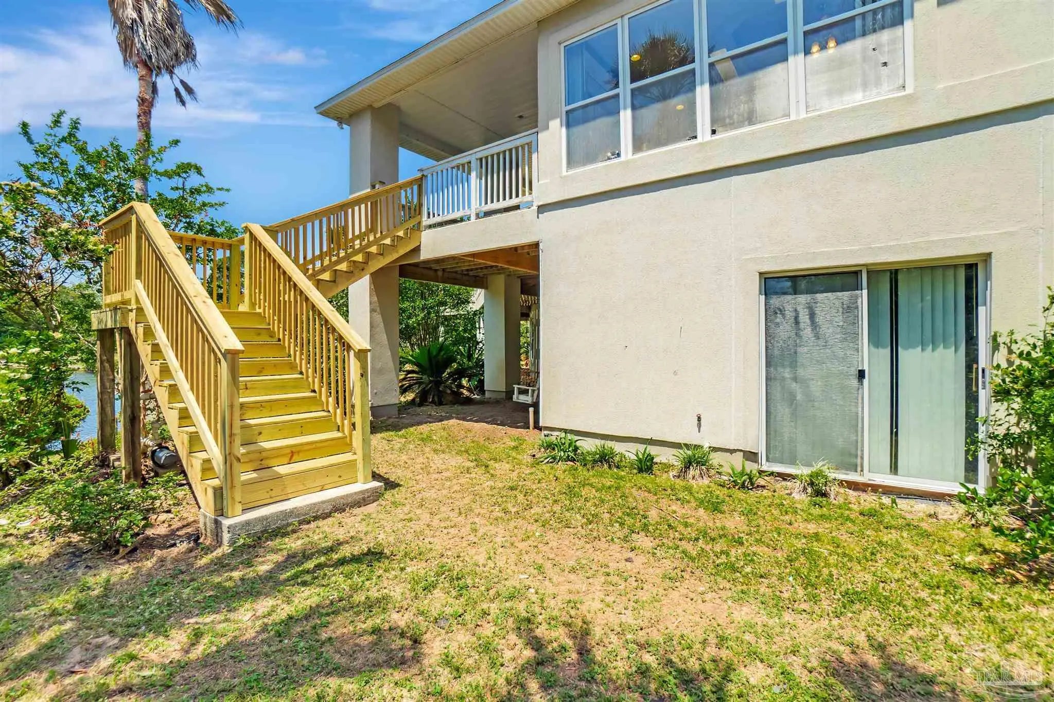 LAKESIDE WITH BAY VIEWS! Welcome to this Mediterranean style meets NWFL grand home with bay views, large decks, and 185 feet of lakefront. Easy access to East Bay at neighborhood park with a fishing dock and boat ramp! Enter the home from an impressive double staircase and wide front porch. Enormous windows and glass sliding doors allow for plenty of natural light in these spacious rooms: living room, dining room, kitchen and owner's suite. The living room has 13-foot ceilings in the tray, the foyer has 12-foot ceilings, and the dining room has 9-foot ceilings. The home features hardwood and tile floors, two see through fireplaces, granite countertops, two stoves in the kitchen, a tray ceiling, a double pantry, a built-in wet-bar that could easily be converted into a library or office, and so much more. An inside spiral staircase leads you to the extra unfinished 3,000+ square feet on the ground floor. The house is built on pilings for storm safety, but the ground floor is enclosed with outer walls, doors, windows and so much potential. New roof and new AC in 2024. New stairs and deck work in 2025. This home is an entertainer's dream, but if you just want to sip coffee on your deck and watch the bay, you can do that too!