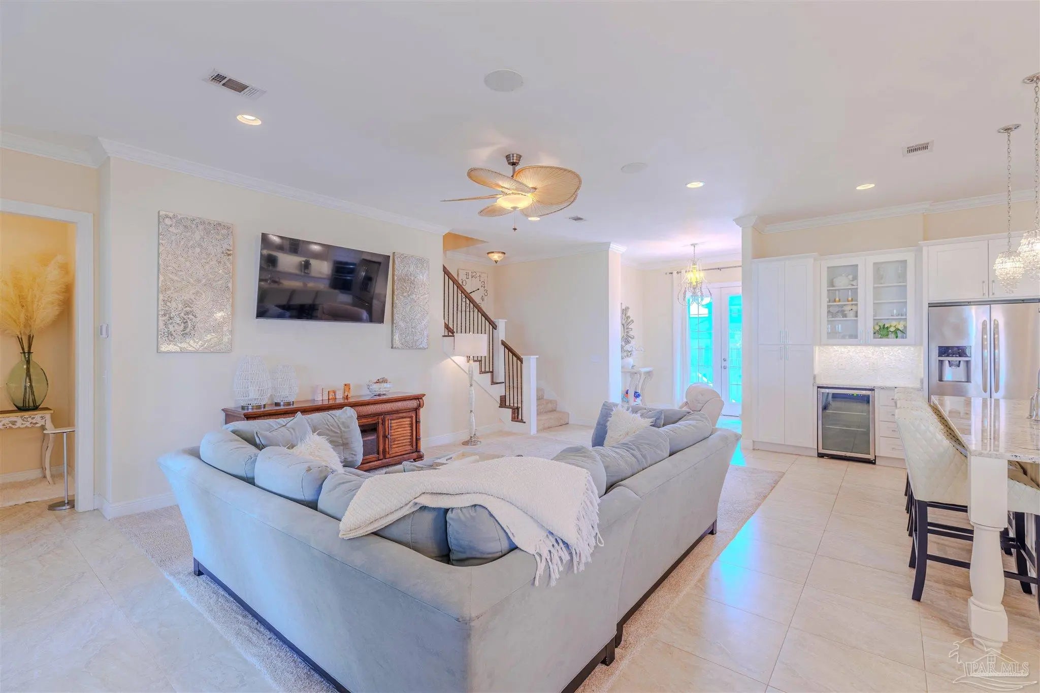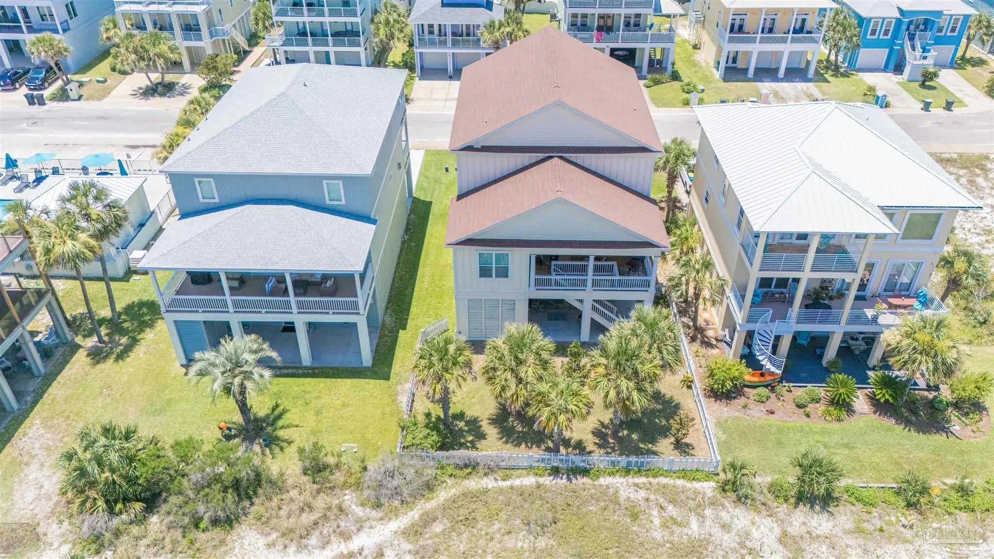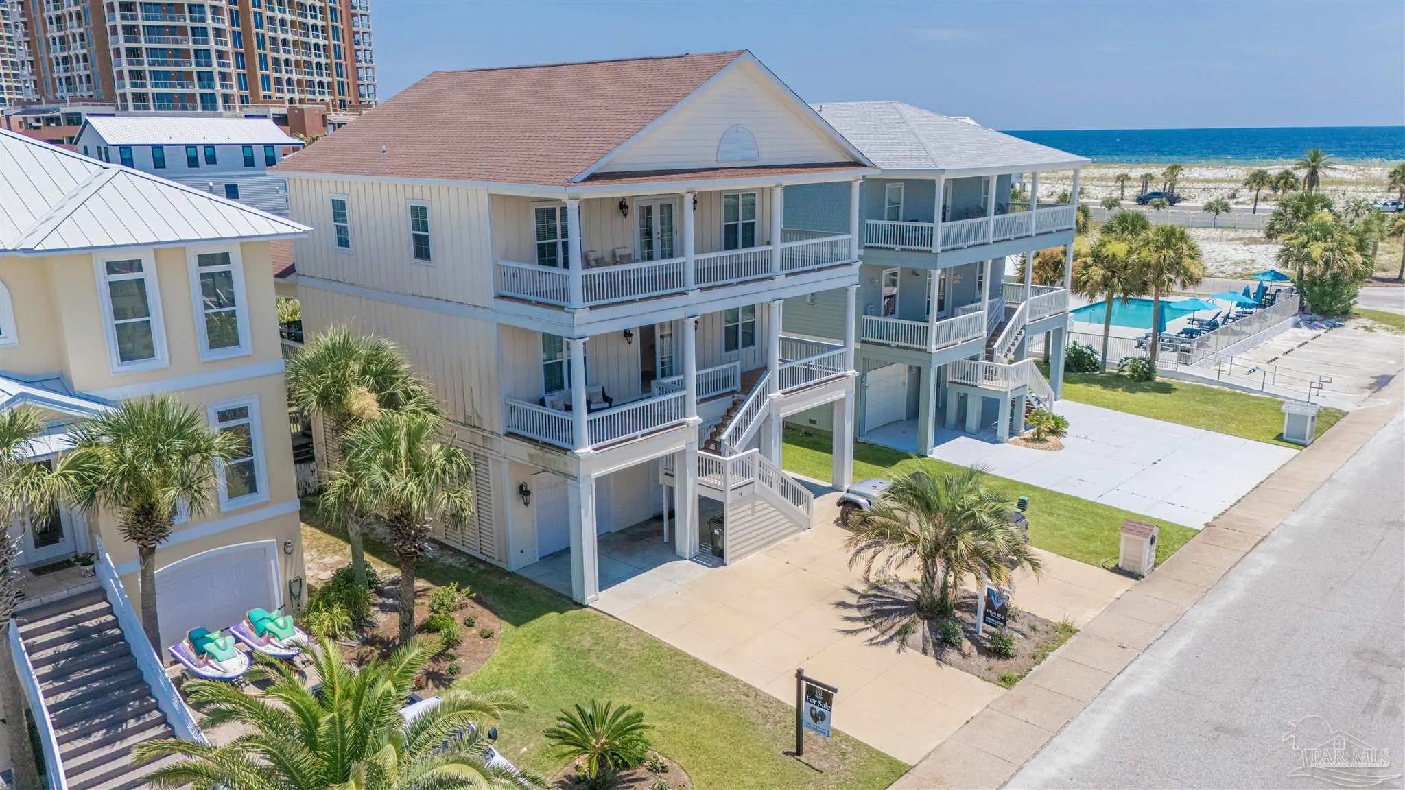 Built in 2016 and perfectly situated in the exclusive gated community of Santa Rosa Villas Estates just steps from the beach, this stunning home offers tasteful coastal interior design with a custom kitchen and an open floorplan making it a wonderful space to entertain friends and family. With over 1400 square feet of covered outdoor living space you can enjoy Gulf and Sound views with the entire family. This community offers deeded Sound access, dock, private beach, new reconstructed pool and is less than a minute walk to the Whitest Beaches the world has to offer! The gorgeous kitchen comes equipped with ample cabinet storage with soft close features, 5 burner cooktop, lighted cabinetry, large island, wall oven and a wine fridge. Other mentionable features are additional living space on the third floor, massive walk-in closet in the primary bedroom, bonus climate controlled storage room, beautiful Mother Of Pearl tile accents throughout, outdoor shower, walk-in attic, ample storage space, over-sized garage suitable for 5 vehicles or boat/jet ski storage. This home is currently being operated as a vacation rental and is being sold fully furnished and is also suitable for full time living. Come and enjoy all Pensacola Beach has to offer with a trolley stop nearby and a wonderful walking/bike path that spans the entire beach.