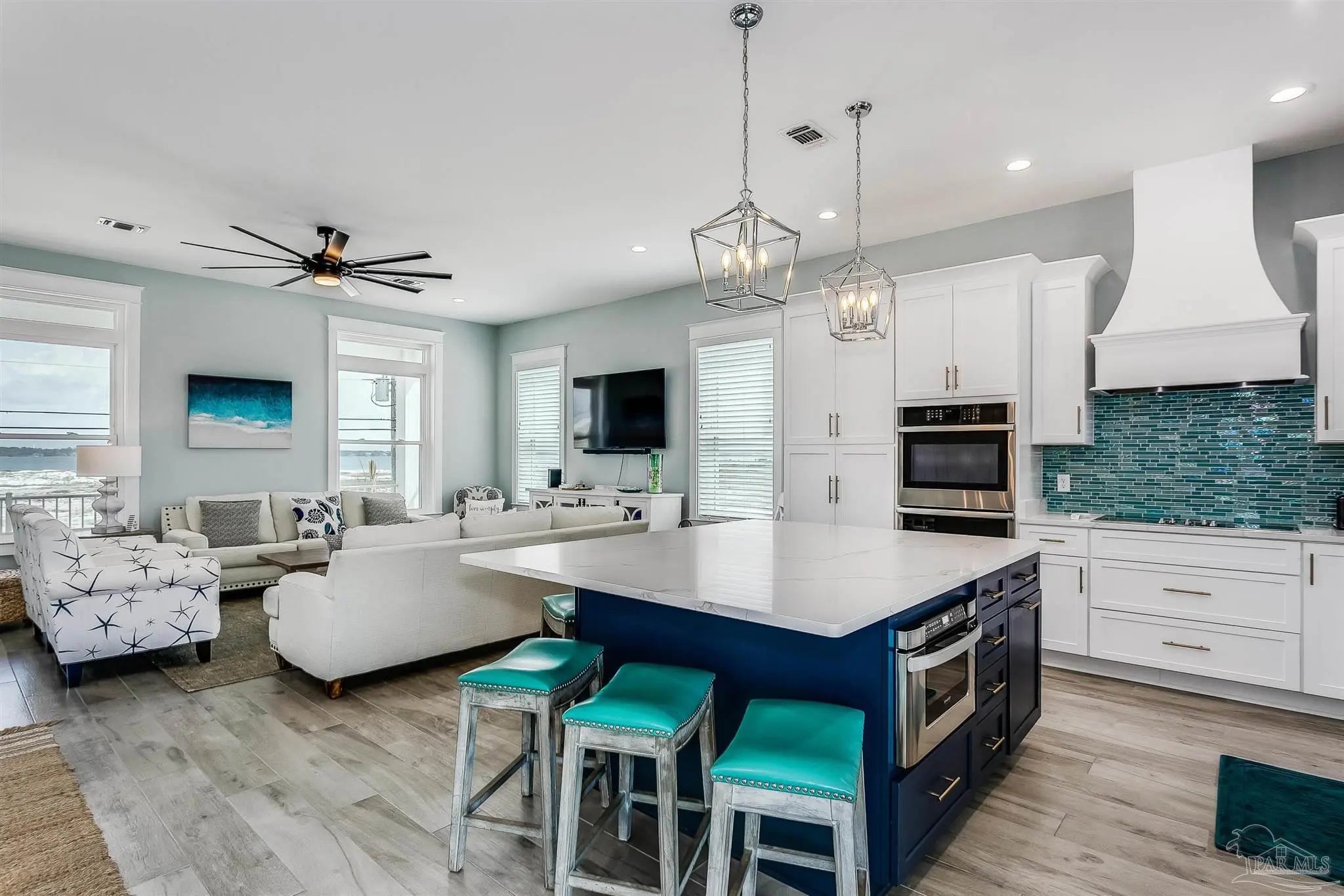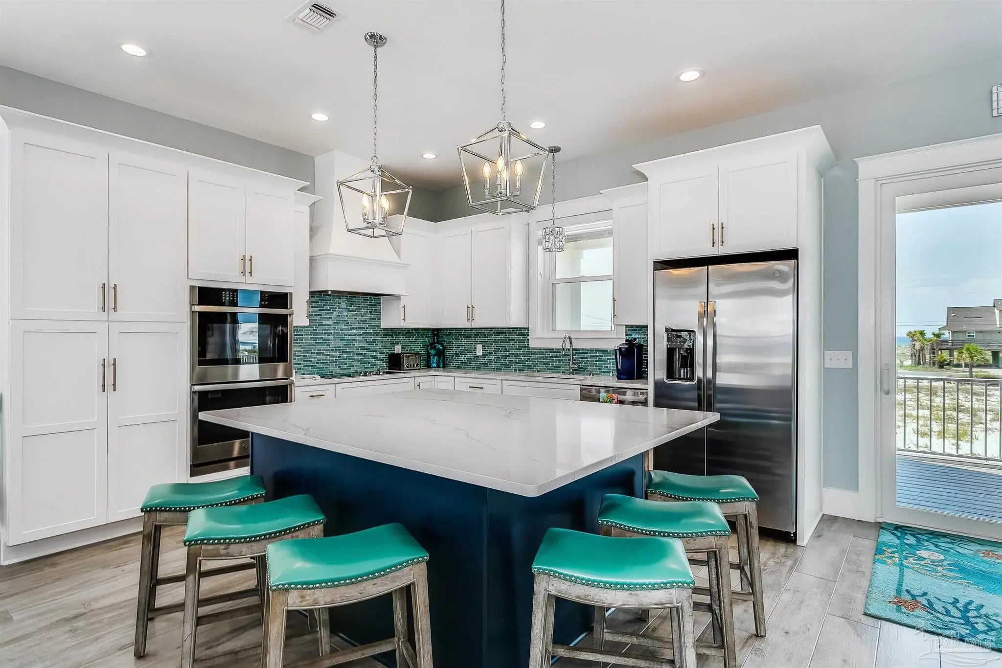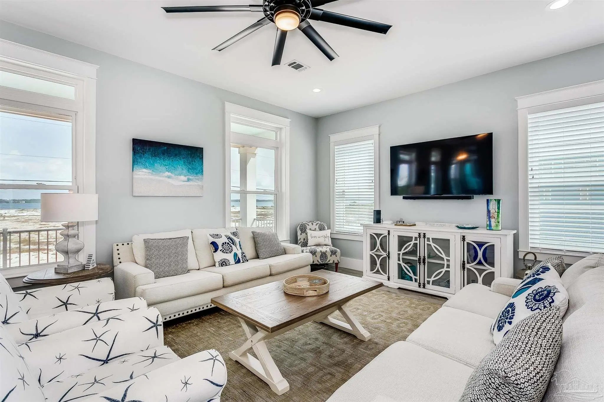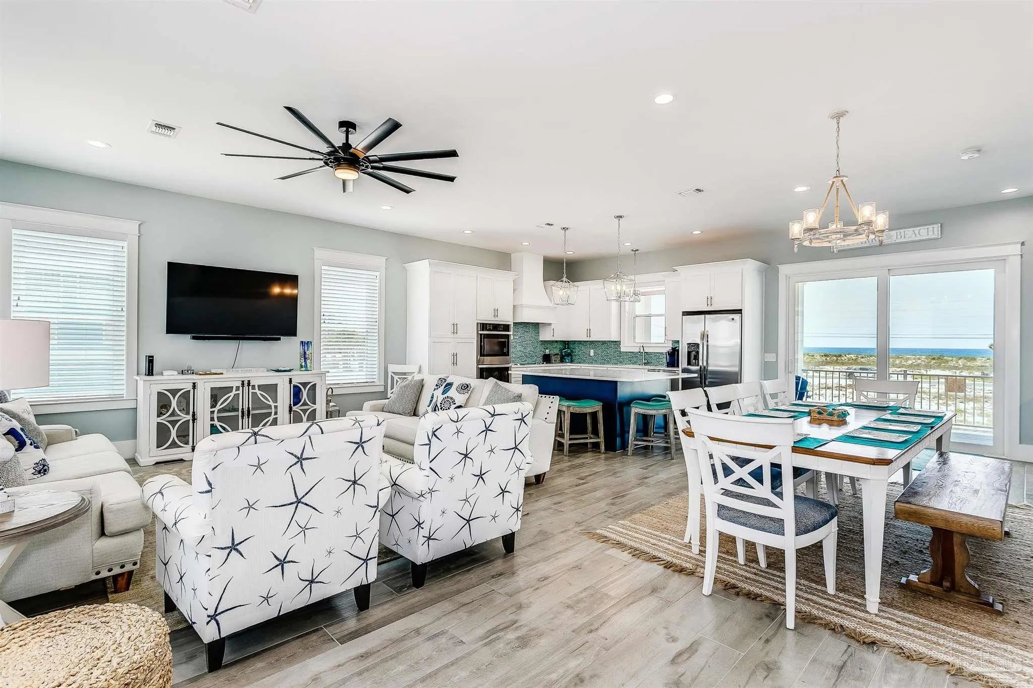 Enjoy unobstructed views of the Sound and Gulf from the oversized balconies. 5 bedrooms plus bunk bedroom, 5.5 baths. fully furnished home with Elevator, private Pool, and a 6-seater golf cart. The beach is a short walk or golf cart ride away. Upgraded Open Floor Plan with many upgraded custom designer finishes that include square edge custom cottage trim, high ceilings, tall 8-ft doors, and porcelain plank tile throughout. The Chef’s kitchen has water views in every direction, high end appliances, expansive breakfast bar, quartz counter tops, double ovens, under counter microwave and wine cooler. Two guest bedrooms on the first living level each with their own bath. Two other guest bedrooms each with their own bath, bunk room and Master suite are on the second living level. Half bath is next to the bunk room and a laundry room. The Master suite overlooks the Gulf of Mexico, has king bed, twin pull out sofa, master bath with large walk-in shower, soaking tub, double vanity with Quartz countertop, and motorized privacy roller shade. The garage adjoins the pool deck and has storage areas for swim and beach toys, 10 bikes and second refrigerator for easy access to drinks and cool treats. Large garage area has plenty of space for vehicles and golf cart. Located a short distance from the National Seashore and walk-over to the Gulf and minutes away from local attractions, shopping and restaurants. Opportunity for Vacation Home or Vacation Rental Investment “Peachy Queen” has dual Masters and sleeps up to 20 people. Begin to experience Coastal Beach Life!