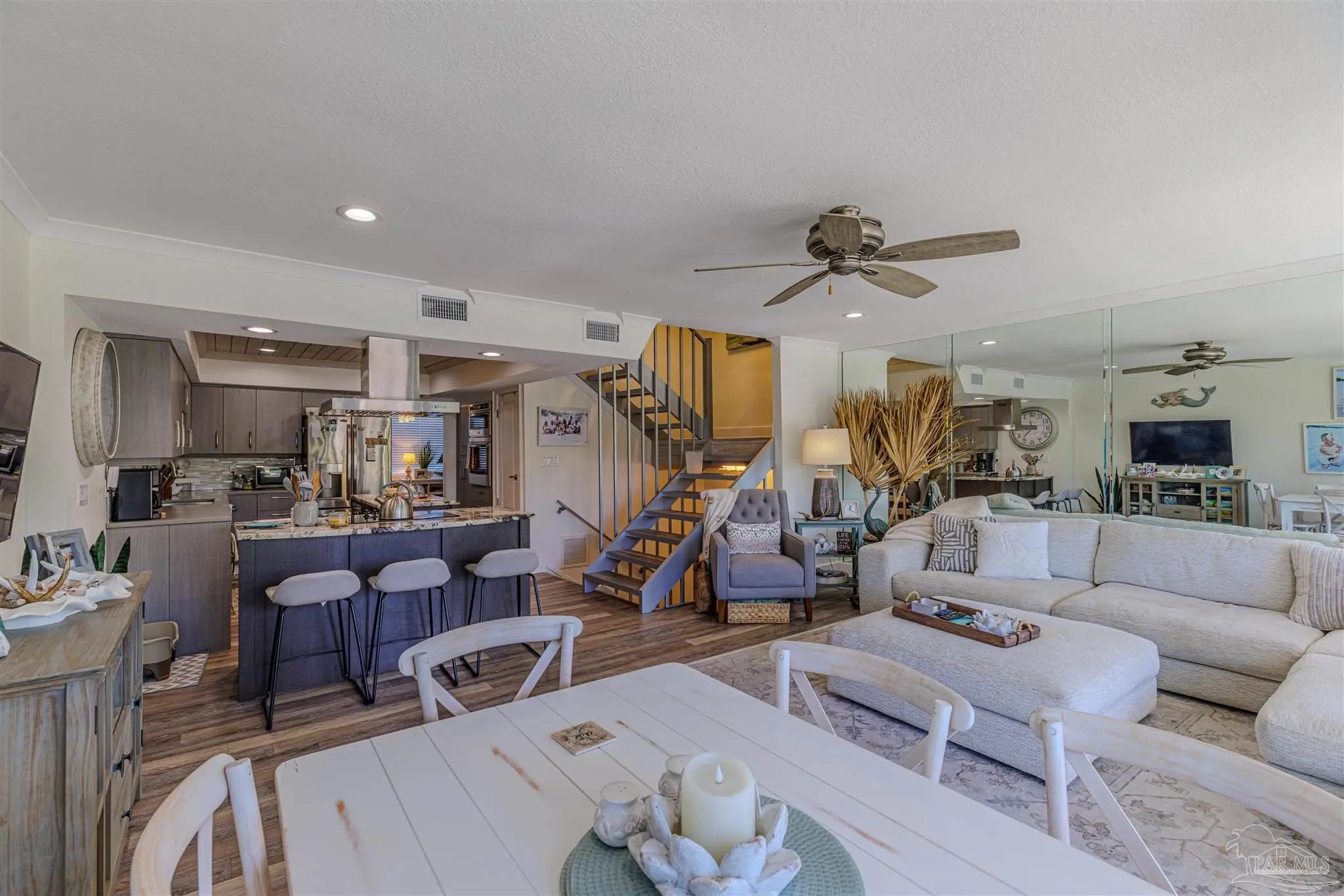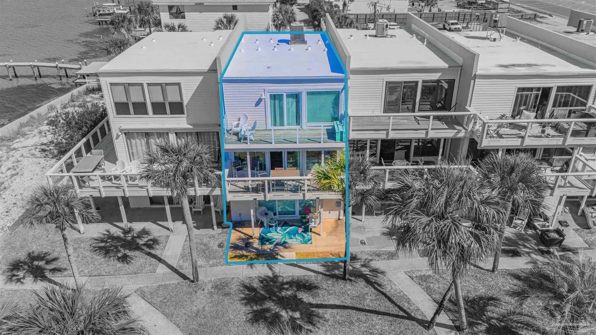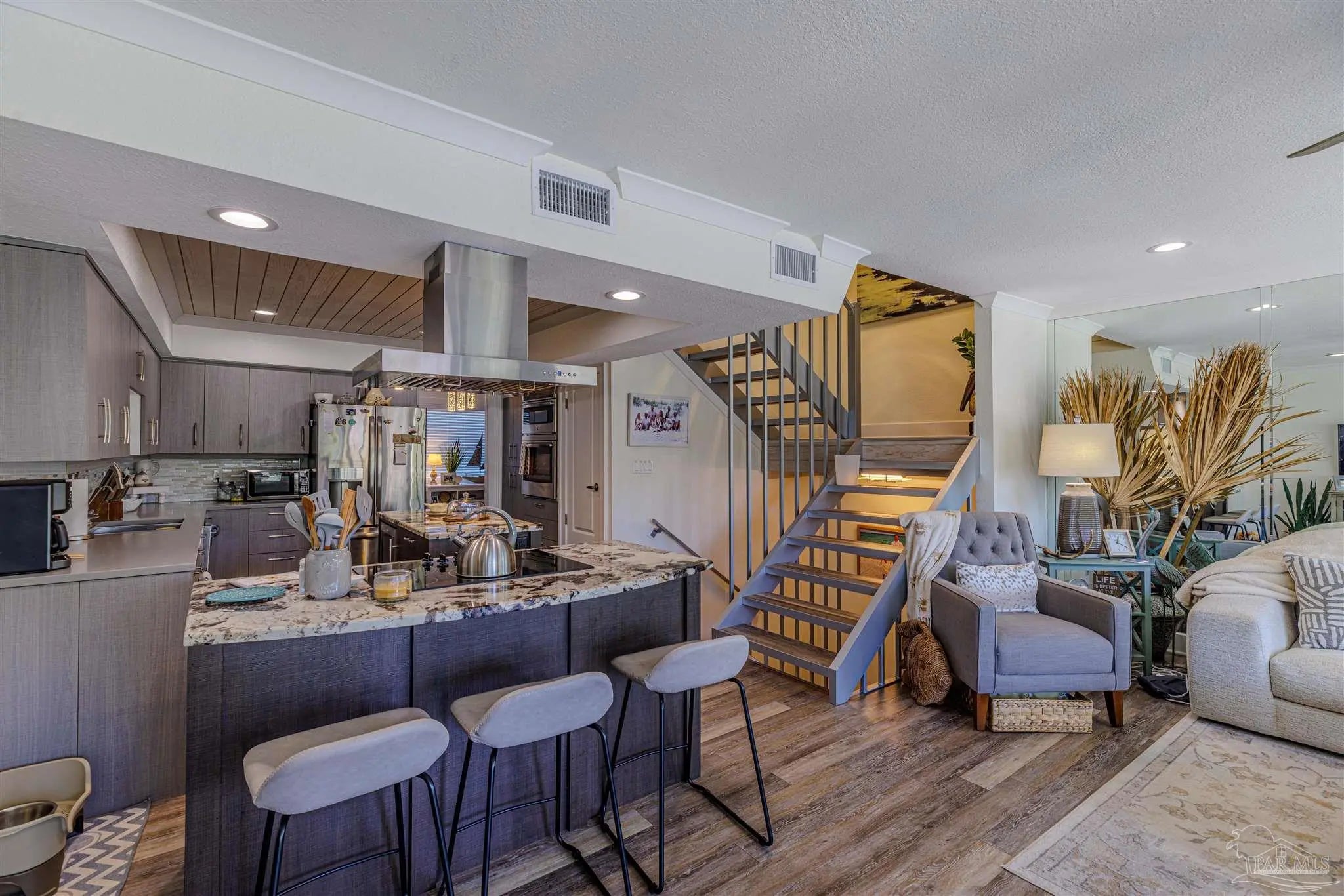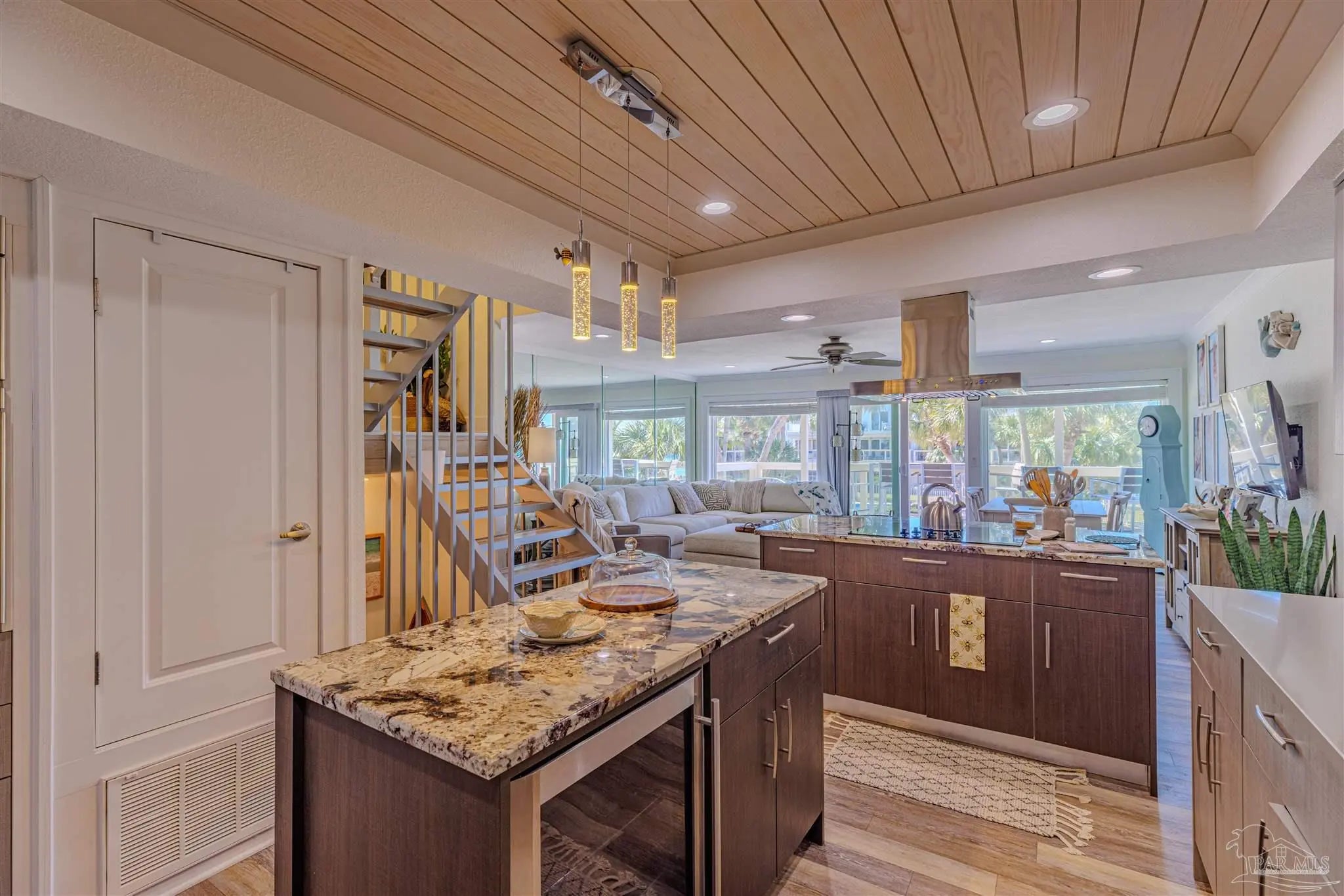 Step into luxury & comfort with this beautifully remodeled contemporary home, where every detail has been thoughtfully designed. With high-end finishes throughout, this home offers a perfect blend of modern elegance & functionality. From the custom-built central staircase to the detailed crown molding, wide baseboards, & stylish lighting fixtures, no detail has been overlooked. Featuring three bedrooms, three and a half bathrooms - this home is designed for both entertaining & everyday living. The chef’s kitchen is a standout, boasting two spacious islands, quartz countertops, a built-in beverage & wine cooler, stainless steel appliances, a wall oven & microwave, & soft-close cabinetry. The open-concept living space extends to a covered deck, an ideal spot to relax or entertain while taking in the sunset. Upstairs, the primary suite is a true retreat, complete with a private deck overlooking the Sound, a double vanity, walk-in shower, & spacious walk-in closet. Two additional bedrooms each feature their own en suite bathrooms, ensuring privacy & comfort for family or guests. A bonus room on the first level adds versatility to this nearly 1,900-square-foot home. Outside, enjoy a ground-level patio leading to the community pool, beautifully landscaped with palm trees, & a sidewalk that takes you directly to the pier. The two-car garage offers plenty of storage for vehicles & beach gear. Situated in the exclusive Bahia Paz community, this home offers a peaceful, private setting with rentals allowed for six months or longer—no short-term rentals permitted. Completely gutted and remodeled in 2017, this home features new HVAC, roof, flashings, gutters, hot water heater, impact windows and doors, updated flooring, lighting, custom staircase, kitchen islands, and glass deck railings. Every upgrade was designed to enhance both style and functionality, creating a home that is as stunning as it is livable.
