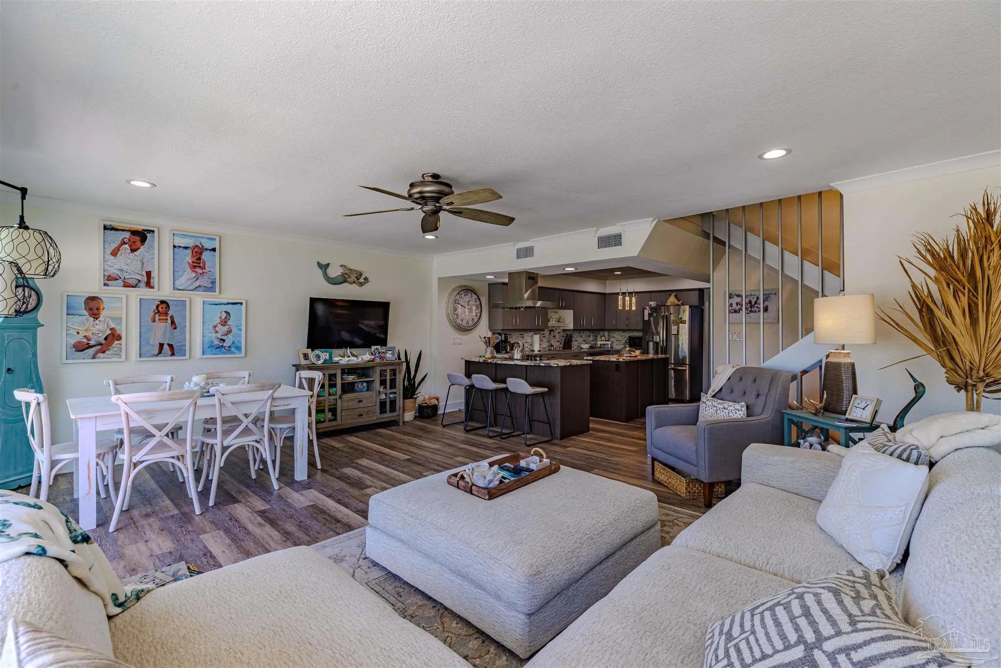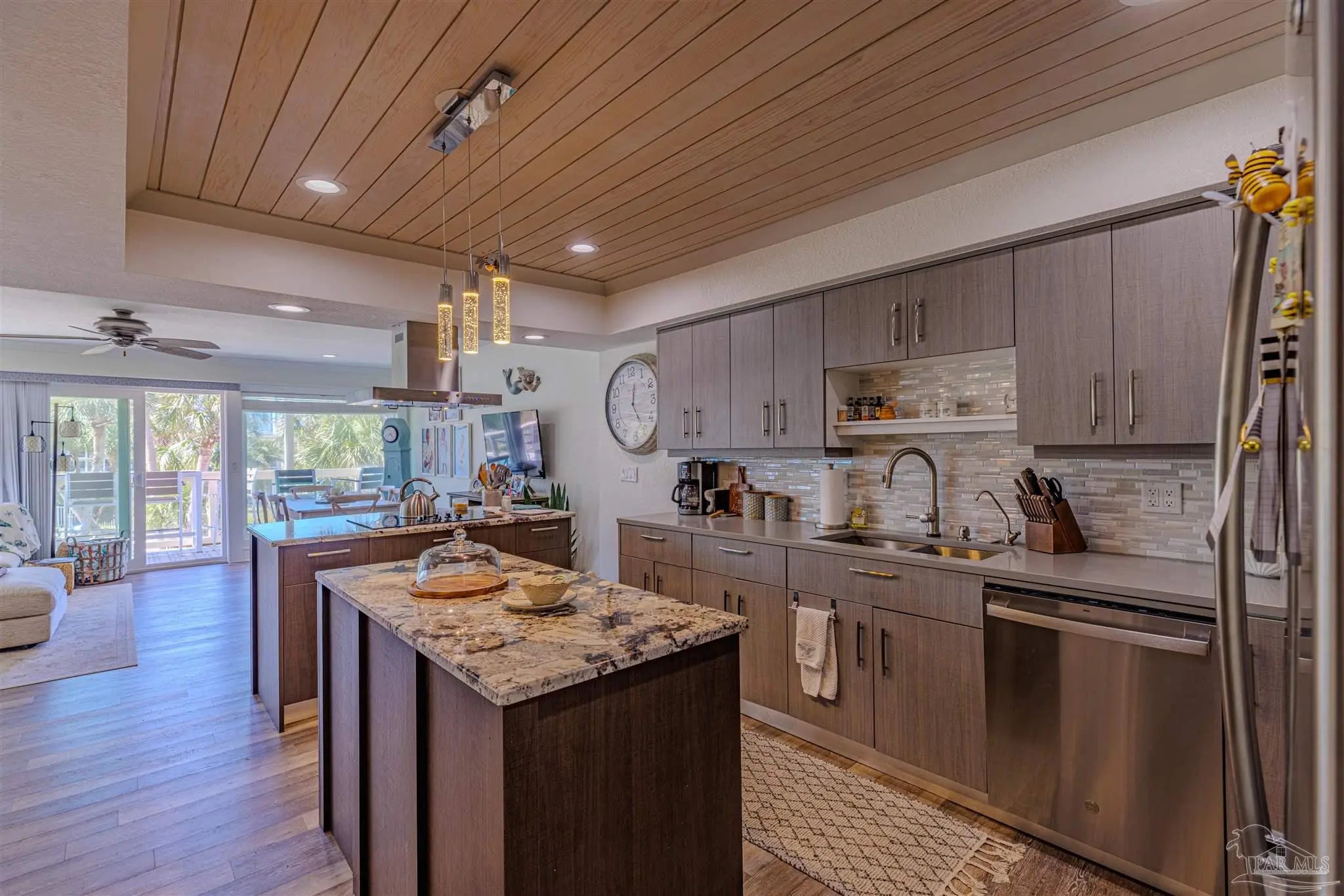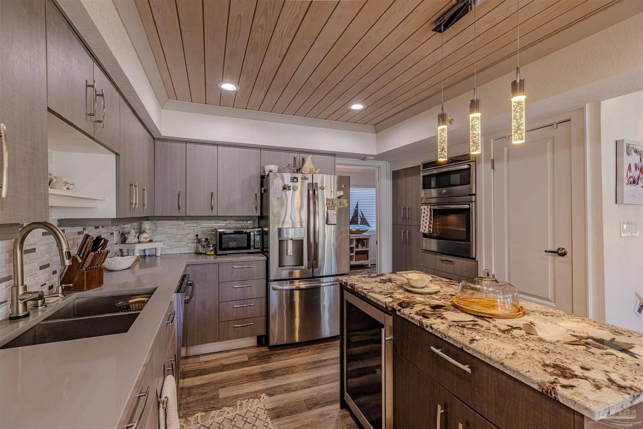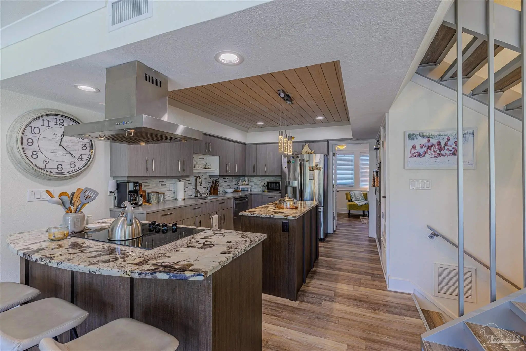 Step into luxury & comfort with this beautifully remodeled contemporary home, where every detail has been thoughtfully designed. With high-end finishes throughout, this home offers a perfect blend of modern elegance & functionality. From the custom-built central staircase to the detailed crown molding, wide baseboards, & stylish lighting fixtures, no detail has been overlooked. Featuring three bedrooms, three and a half bathrooms - this home is designed for both entertaining & everyday living. The chef’s kitchen is a standout, boasting two spacious islands, quartz countertops, a built-in beverage & wine cooler, stainless steel appliances, a wall oven & microwave, & soft-close cabinetry. The open-concept living space extends to a covered deck, an ideal spot to relax or entertain while taking in the sunset. Upstairs, the primary suite is a true retreat, complete with a private deck overlooking the Sound, a double vanity, walk-in shower, & spacious walk-in closet. Two additional bedrooms each feature their own en suite bathrooms, ensuring privacy & comfort for family or guests. A bonus room on the first level adds versatility to this nearly 1,900-square-foot home. Outside, enjoy a ground-level patio leading to the community pool, beautifully landscaped with palm trees, & a sidewalk that takes you directly to the pier. The two-car garage offers plenty of storage for vehicles & beach gear. Situated in the exclusive Bahia Paz community, this home offers a peaceful, private setting with rentals allowed for six months or longer—no short-term rentals permitted. Completely gutted and remodeled in 2017, this home features new HVAC, roof, flashings, gutters, hot water heater, impact windows and doors, updated flooring, lighting, custom staircase, kitchen islands, and glass deck railings. Every upgrade was designed to enhance both style and functionality, creating a home that is as stunning as it is livable.
