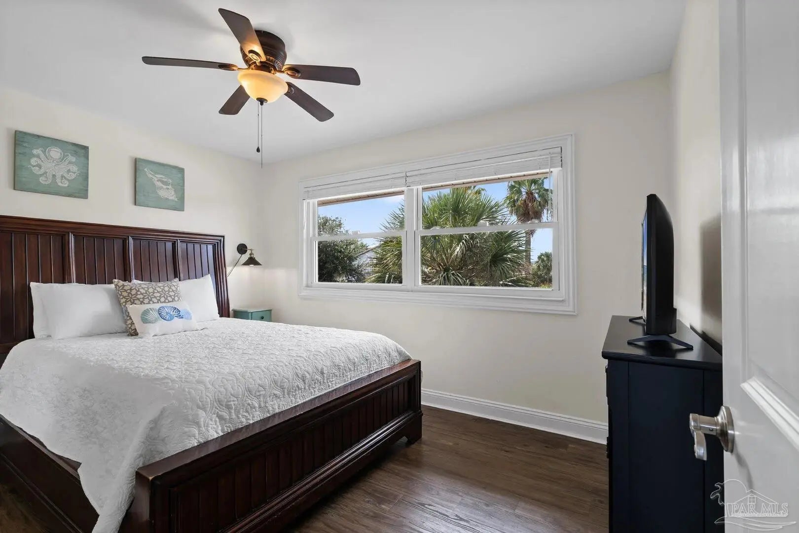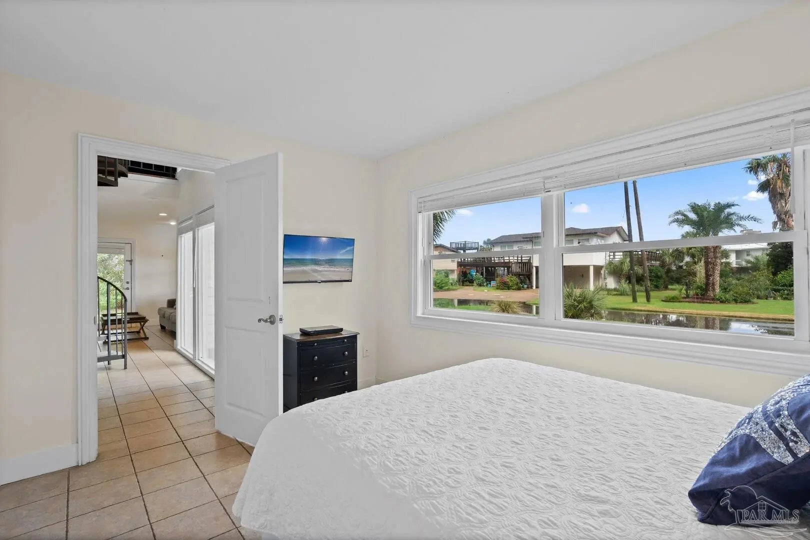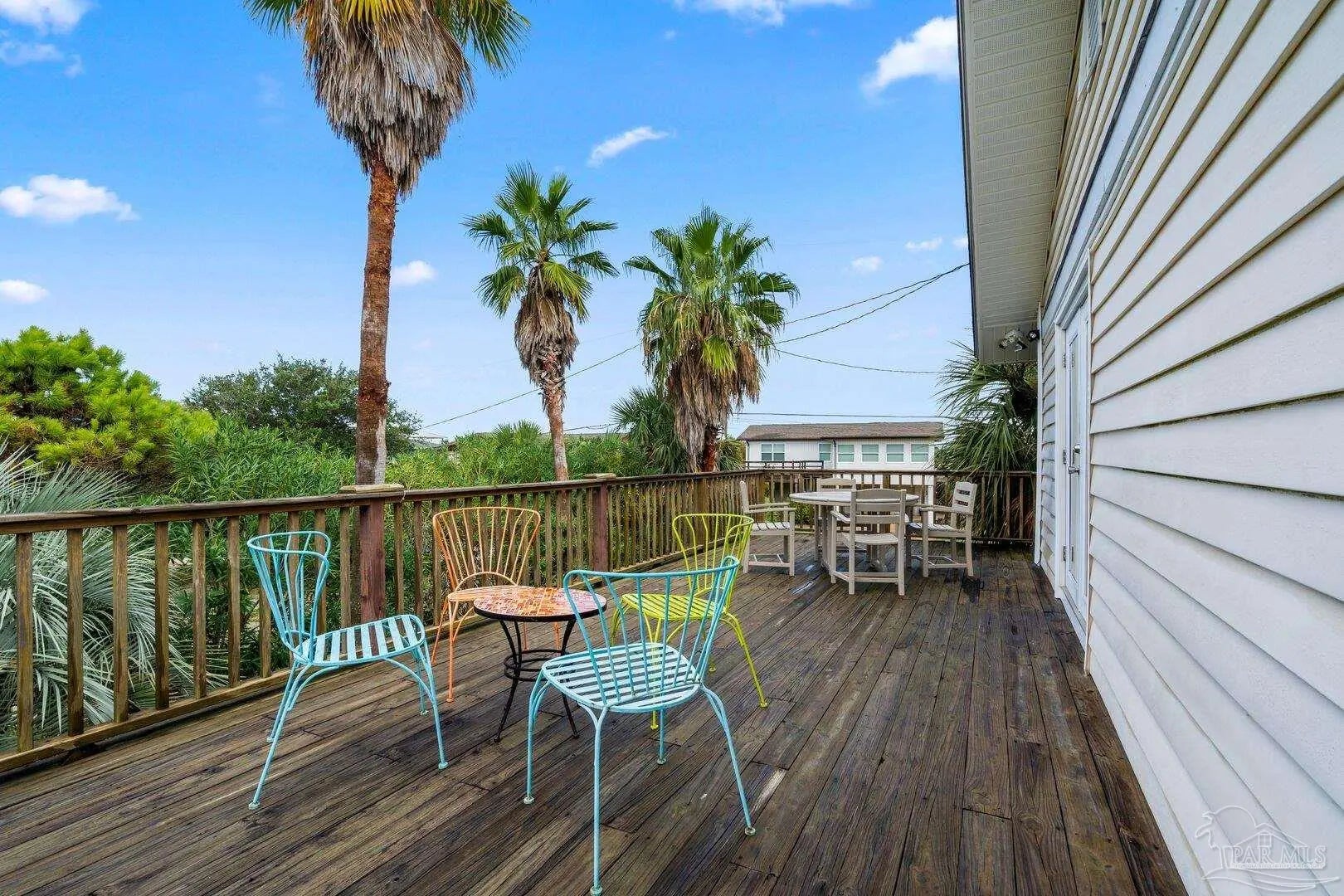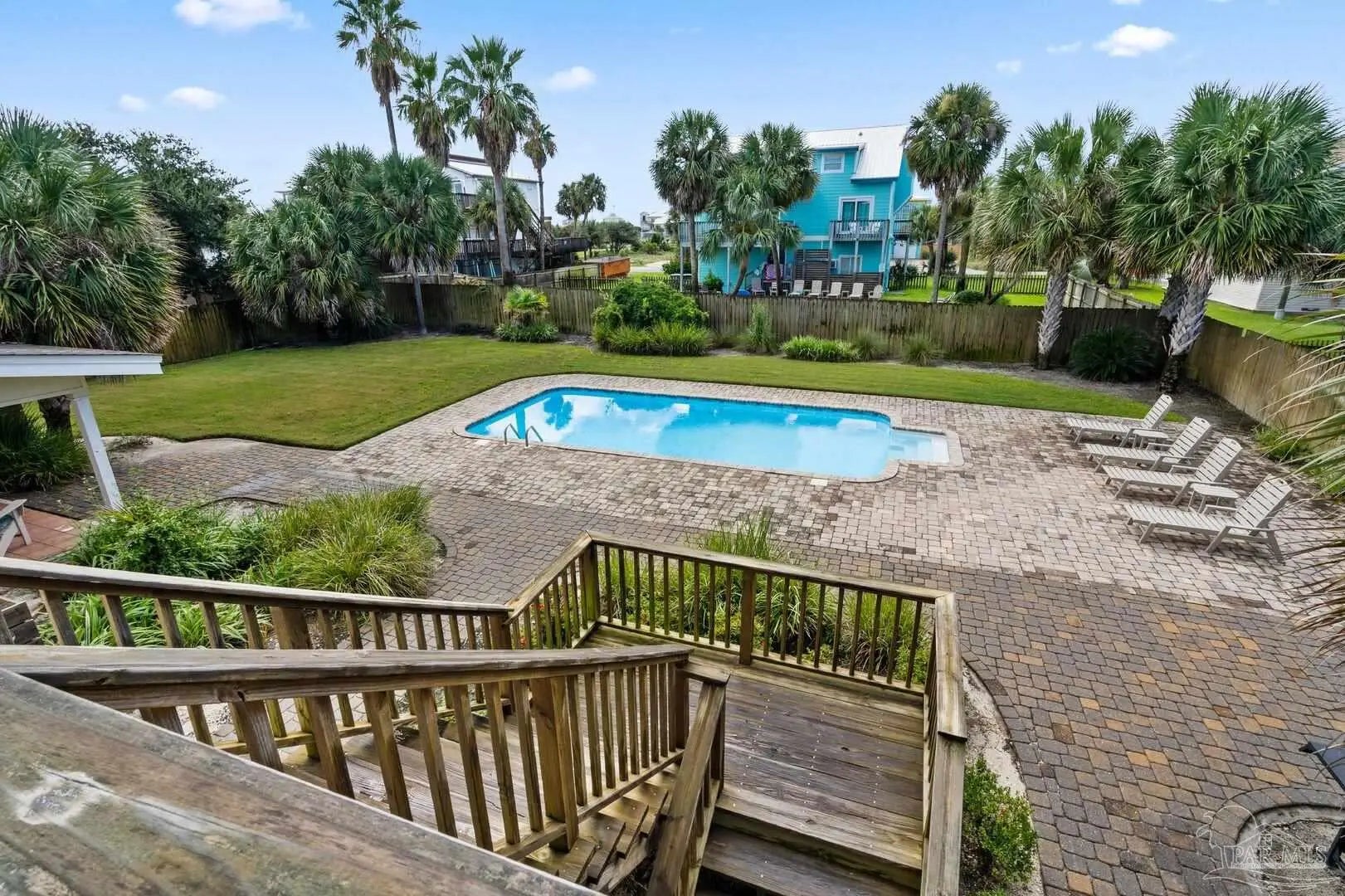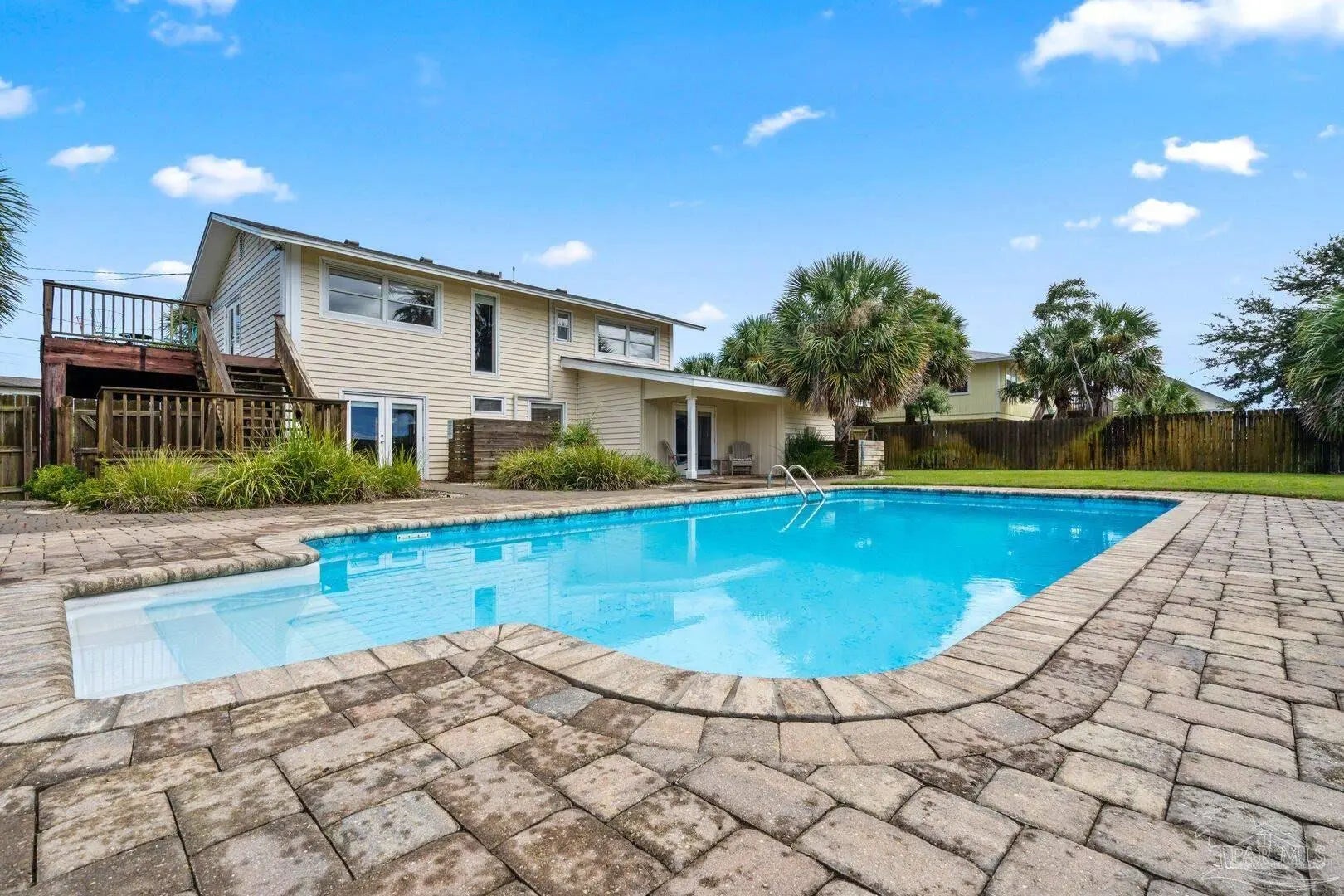 A few hundred feet from the beautiful Public beach "Baby Beach" on Pensacola Sound with water views from the decks. Walk into the seperated ground level of the home with two bedrooms, A Master with french doors and private covered patio and a beautifully remodeled Master bath. A large living area with French doors that leading out to the huge fenced in pool area! Upstairs you'll find a large updated spacious kitchen with granite counter tops and upgraded appliances open to a formal dining area. This floor also has two bedrooms, and shared bath.The large decks off the dining/Kit area boast views of the sound. So many unique features give this home tons of charachter too miss out on including a spiral staircase connecting the down and upstairs. Tons of closet and storage space. Decking and huge lot is primed for a Blue Angel show to enjoy!