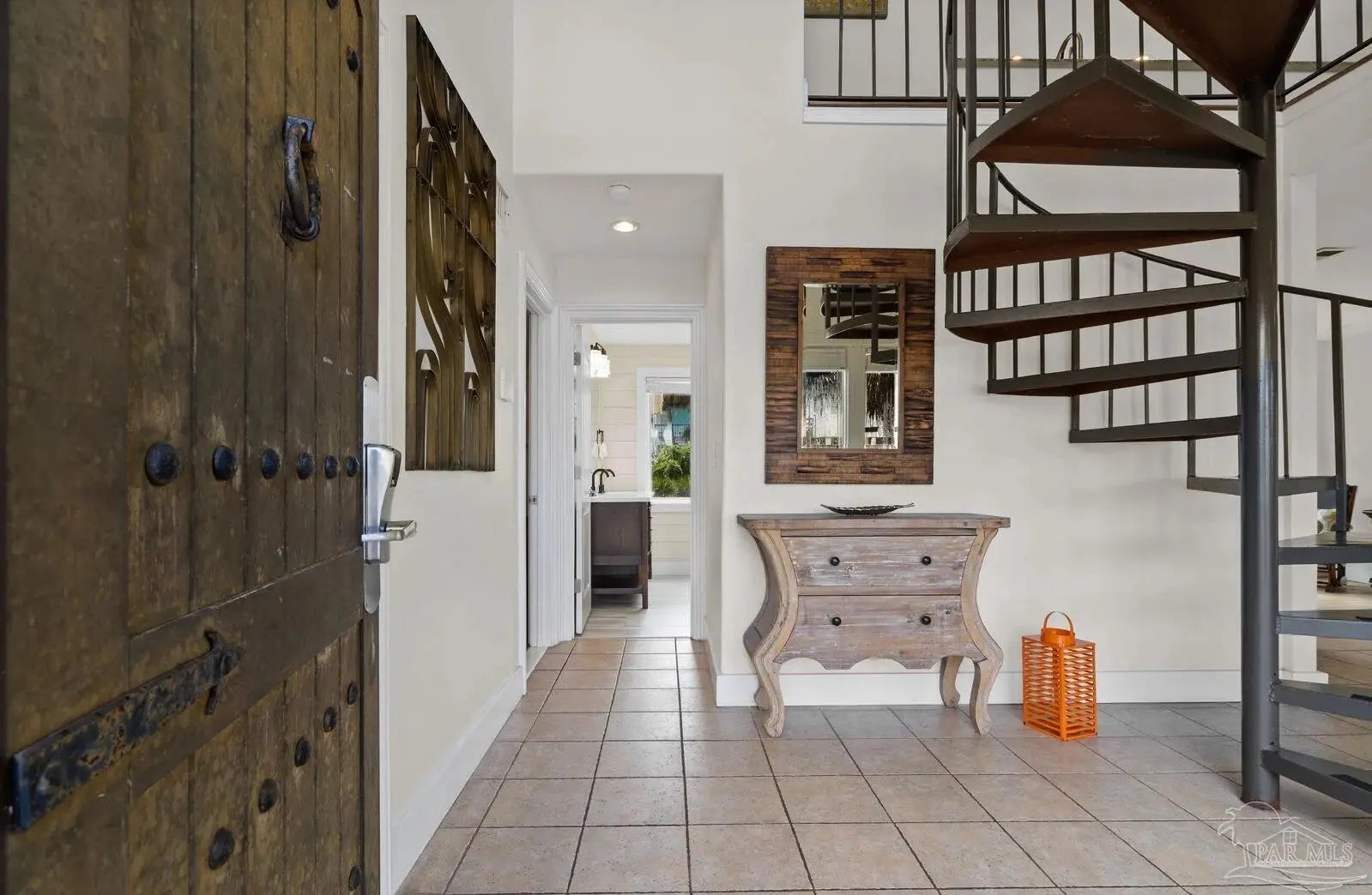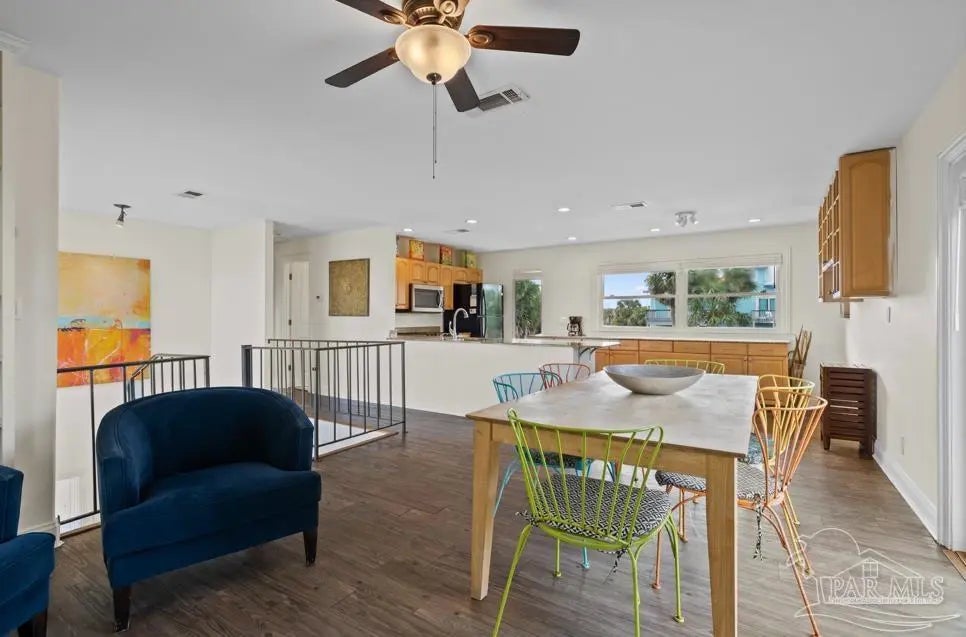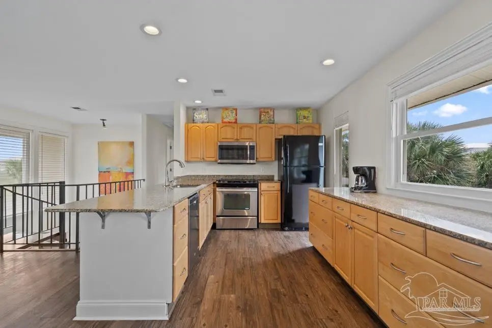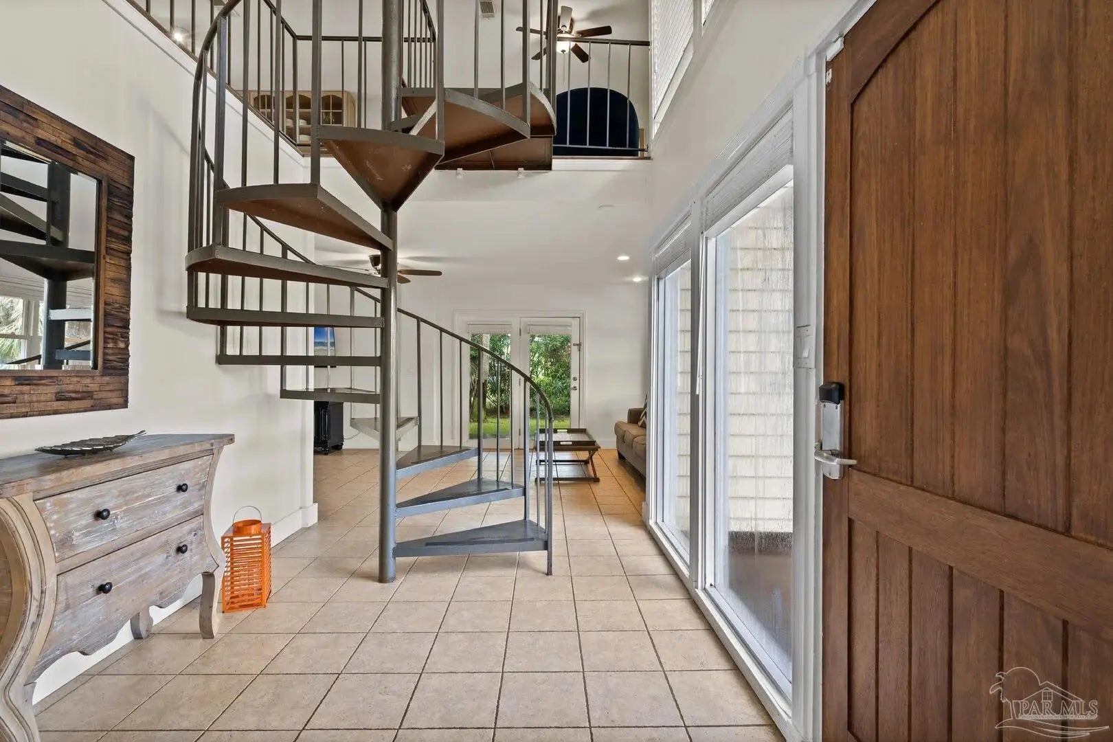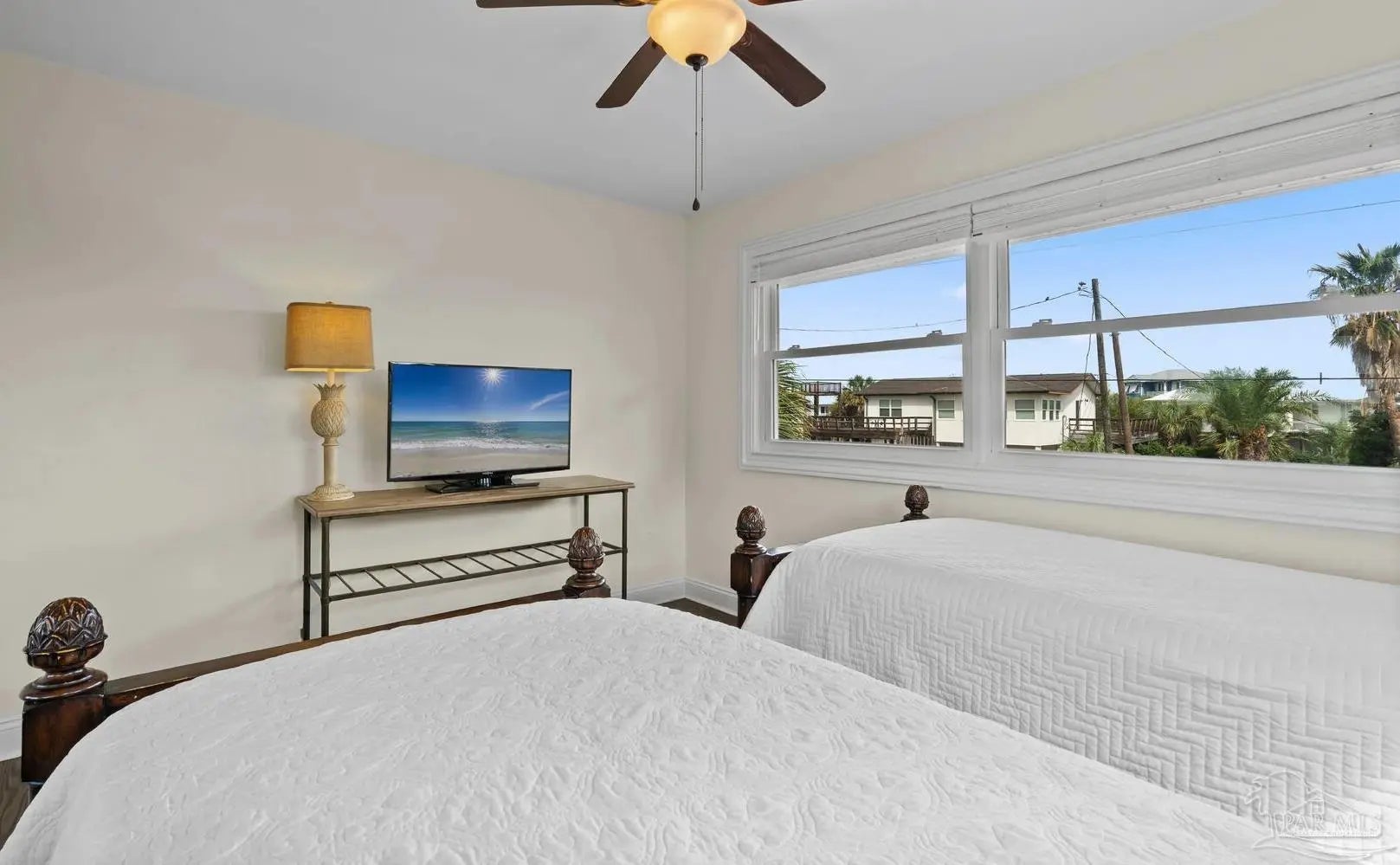 A few hundred feet from the beautiful Public beach "Baby Beach" on Pensacola Sound with water views from the decks. Walk into the seperated ground level of the home with two bedrooms, A Master with french doors and private covered patio and a beautifully remodeled Master bath. A large living area with French doors that leading out to the huge fenced in pool area! Upstairs you'll find a large updated spacious kitchen with granite counter tops and upgraded appliances open to a formal dining area. This floor also has two bedrooms, and shared bath.The large decks off the dining/Kit area boast views of the sound. So many unique features give this home tons of charachter too miss out on including a spiral staircase connecting the down and upstairs. Tons of closet and storage space. Decking and huge lot is primed for a Blue Angel show to enjoy!