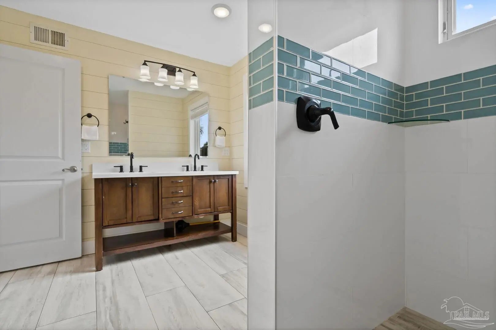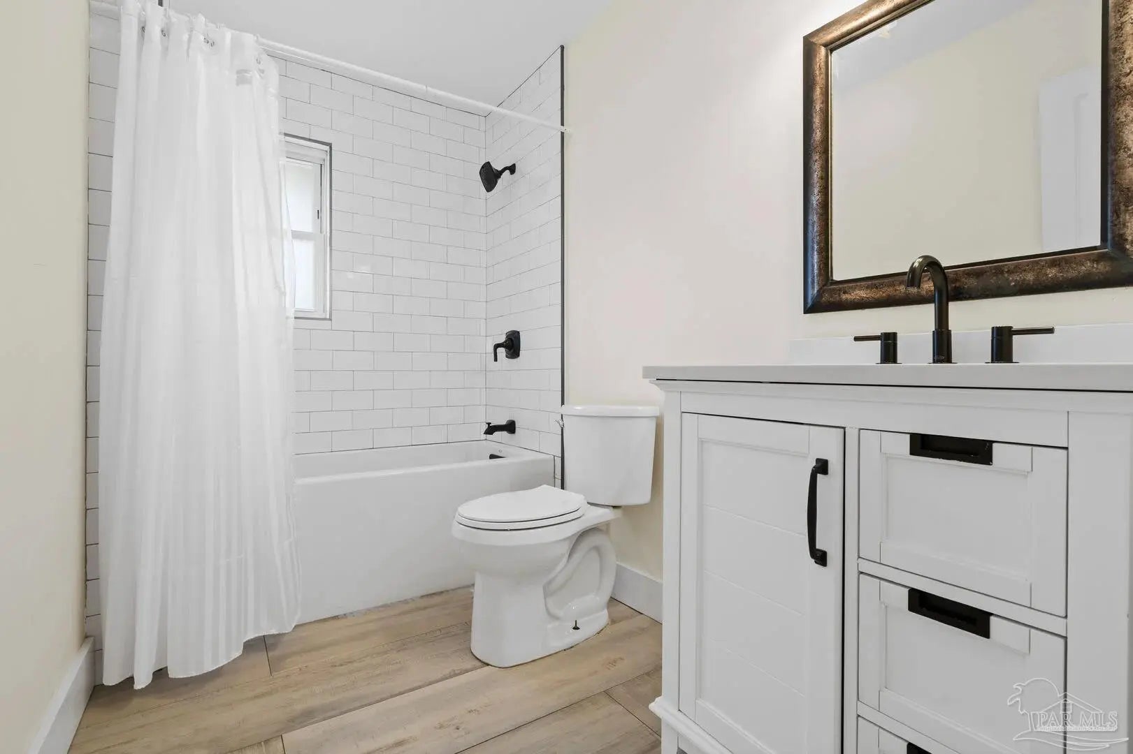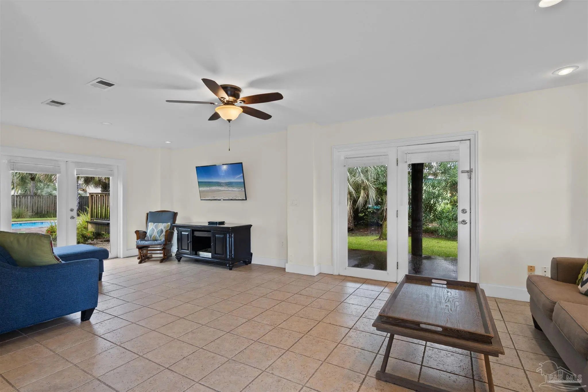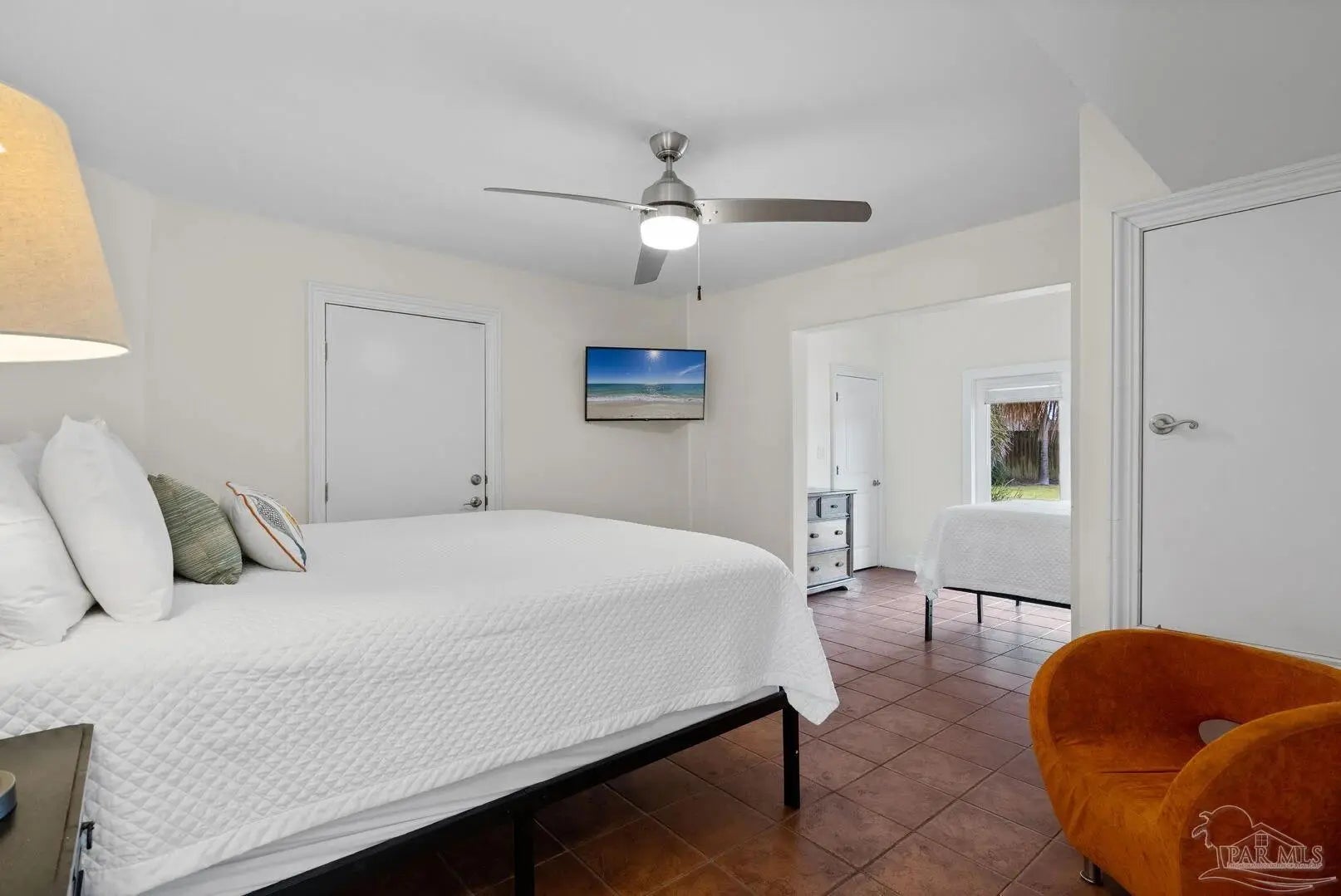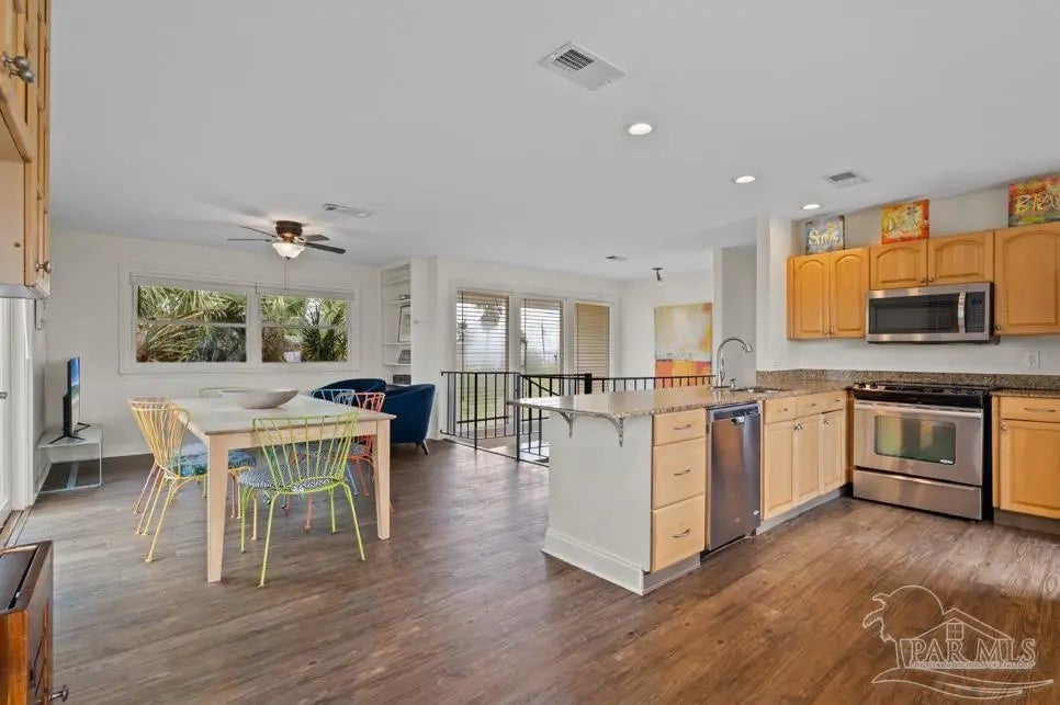 A few hundred feet from the beautiful Public beach "Baby Beach" on Pensacola Sound with water views from the decks. Walk into the seperated ground level of the home with two bedrooms, A Master with french doors and private covered patio and a beautifully remodeled Master bath. A large living area with French doors that leading out to the huge fenced in pool area! Upstairs you'll find a large updated spacious kitchen with granite counter tops and upgraded appliances open to a formal dining area. This floor also has two bedrooms, and shared bath.The large decks off the dining/Kit area boast views of the sound. So many unique features give this home tons of charachter too miss out on including a spiral staircase connecting the down and upstairs. Tons of closet and storage space. Decking and huge lot is primed for a Blue Angel show to enjoy!