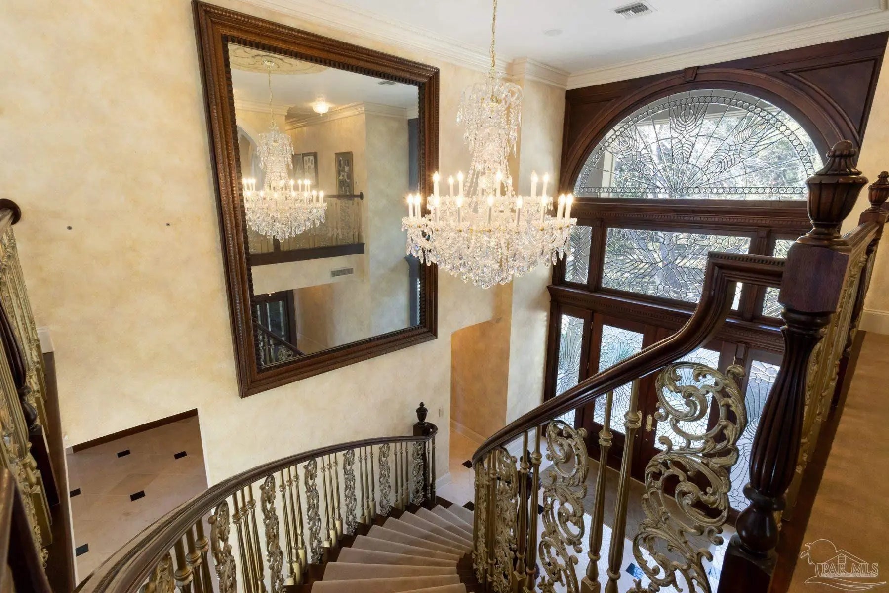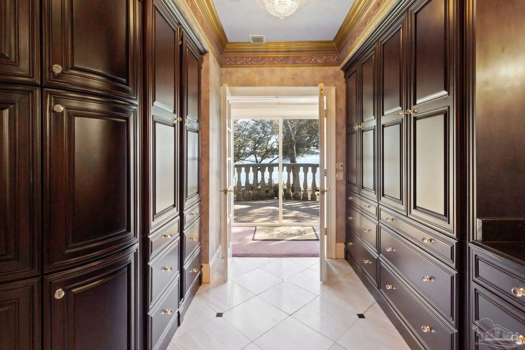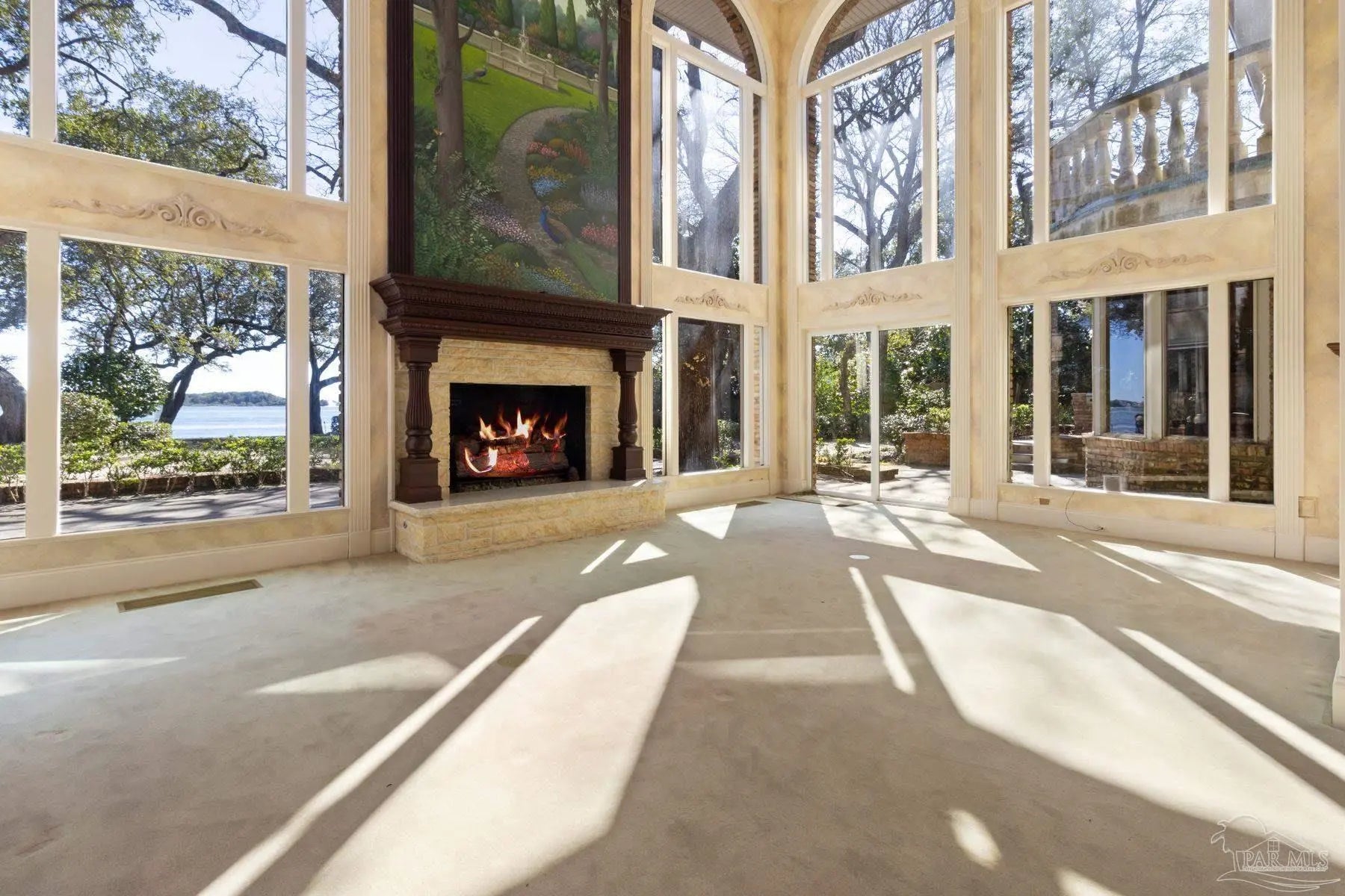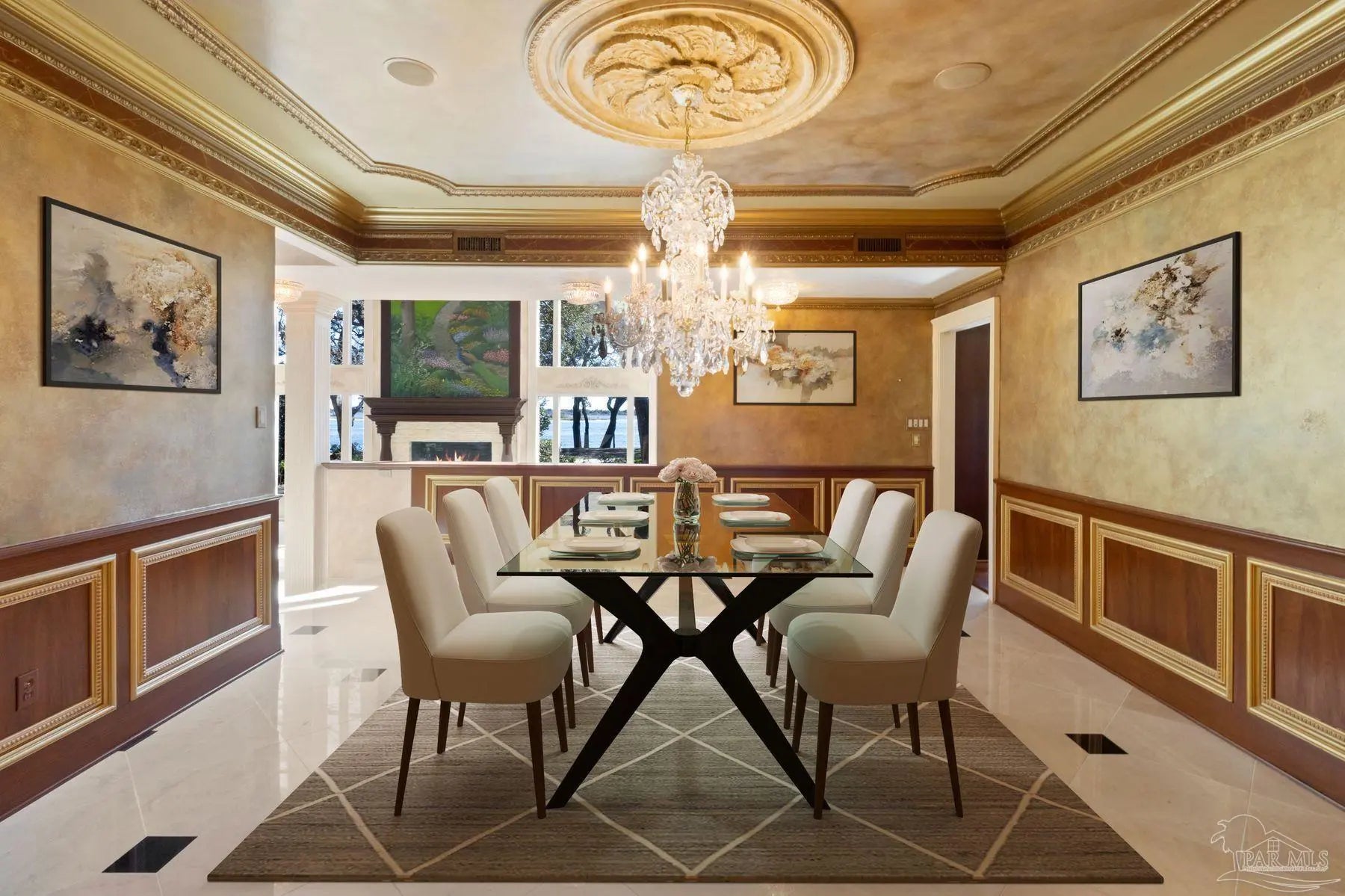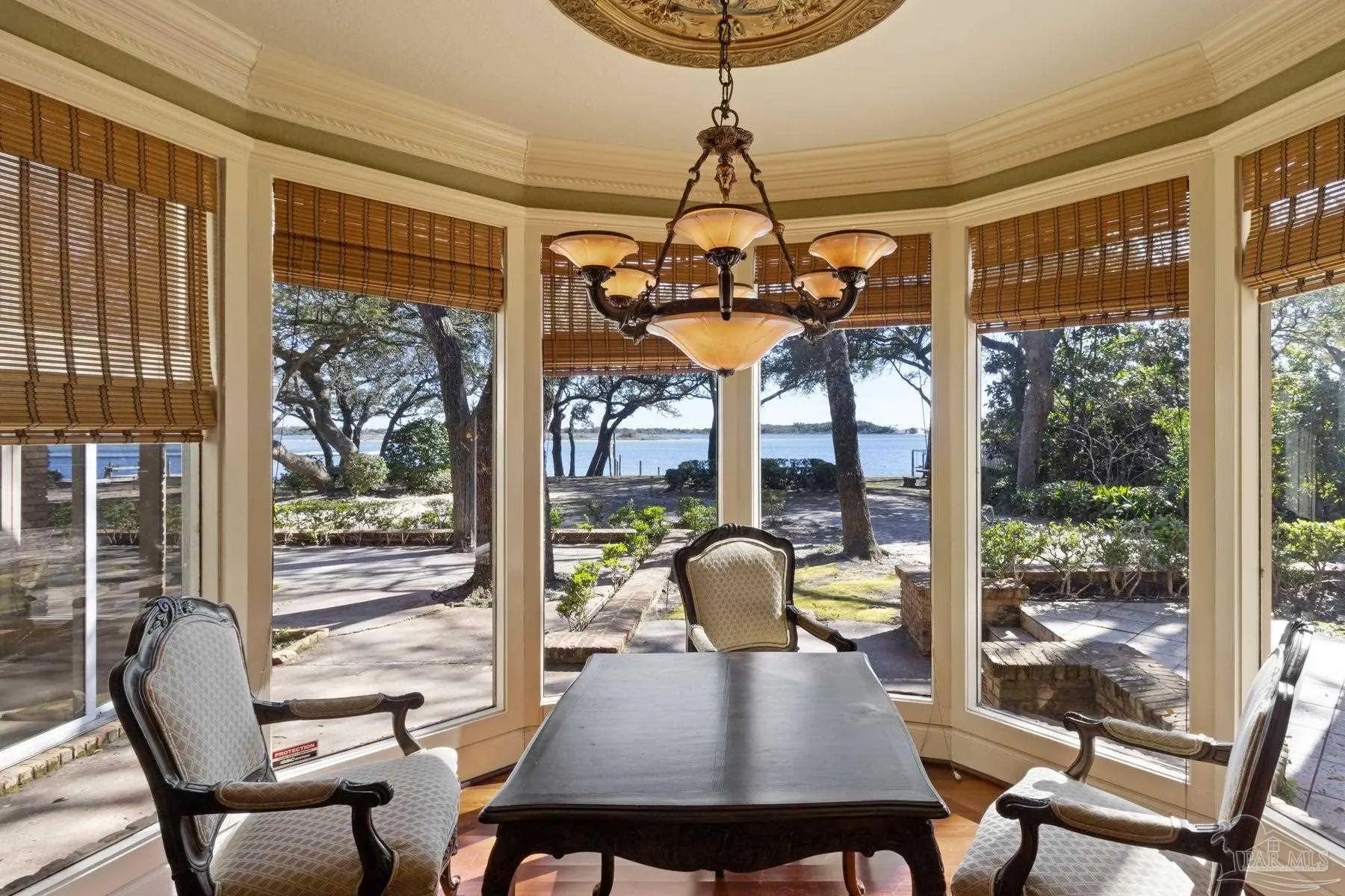 Tucked away on 2.75 acres along the Santa Rosa Sound, this stately waterfront estate offers an extraordinary combination of privacy, deep water access and breathtaking views of the barrier islands and the gulf. A 600-foot oak-lined driveway leads to this impressive 5,120-square-foot Old Chicago brick home, where timeless elegance meets the beauty of the Intracoastal Waterway. With 150 feet of private sandy beach and deep water frontage, this property provides unparalleled access to the water. Whether launching a kayak, paddleboard or jet ski right from your backyard or simply enjoying the serenity of the water from the verandas, this is a retreat like no other. Inside, architectural details abound. Crystal chandeliers, imported mahogany millwork, and soaring 25-ft. ceilings frame a home built for both grandeur and comfort. A wall of windows in the main living area captures stunning water views, while three fireplaces add warmth and charm. The primary suite is a private sanctuary, complete with a fireplace, balcony and an opulent dressing area. A library with a wet bar offers a quiet escape, and the kitchen is equipped with designer Sub-Zero and Thermador appliances, including warming and refrigeration drawers. Outdoor living is equally remarkable with covered porches, open patios and a separate artist studio, all set against the backdrop of sweeping waterfront vistas. The gated entrance and long paver driveway enhance the estate’s exclusivity. For those seeking a private deepwater retreat, this property offers an unparalleled lifestyle. Alternatively, its expansive acreage presents an exceptional development opportunity, with potential for multiple waterfront homesites and additional residences with water access. Whether as a grand estate or an exclusive residential enclave, this Mary Esther property is a rare and remarkable find.