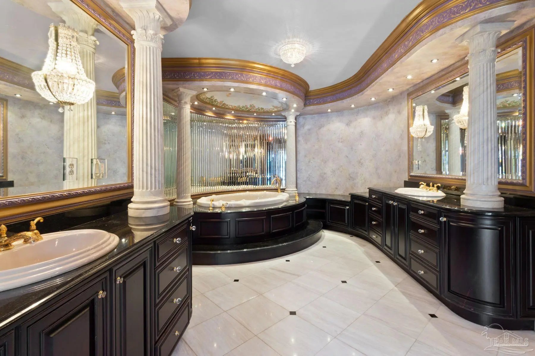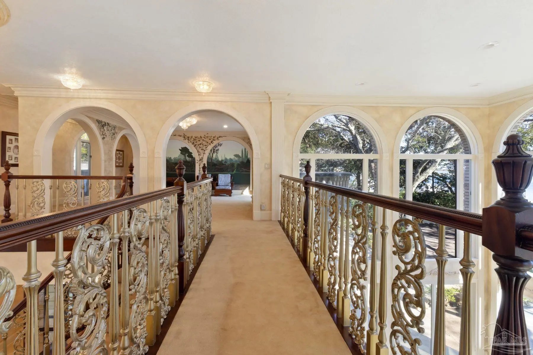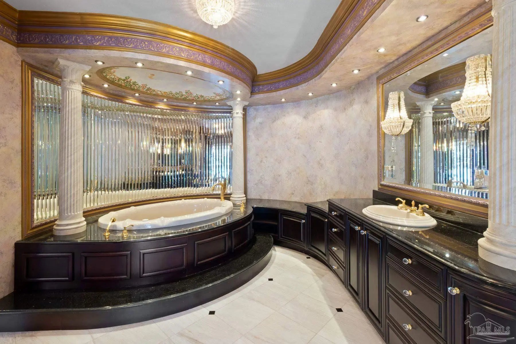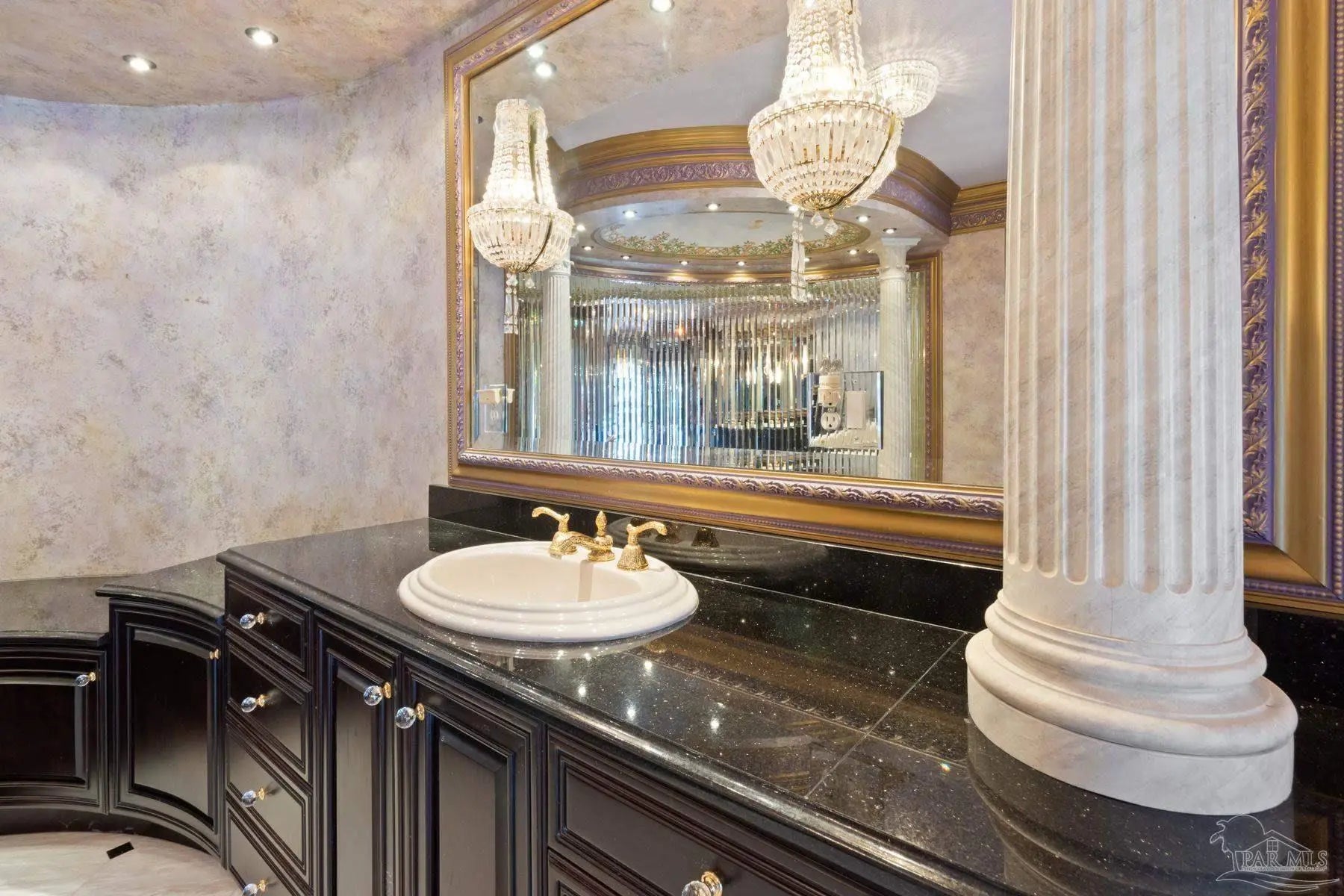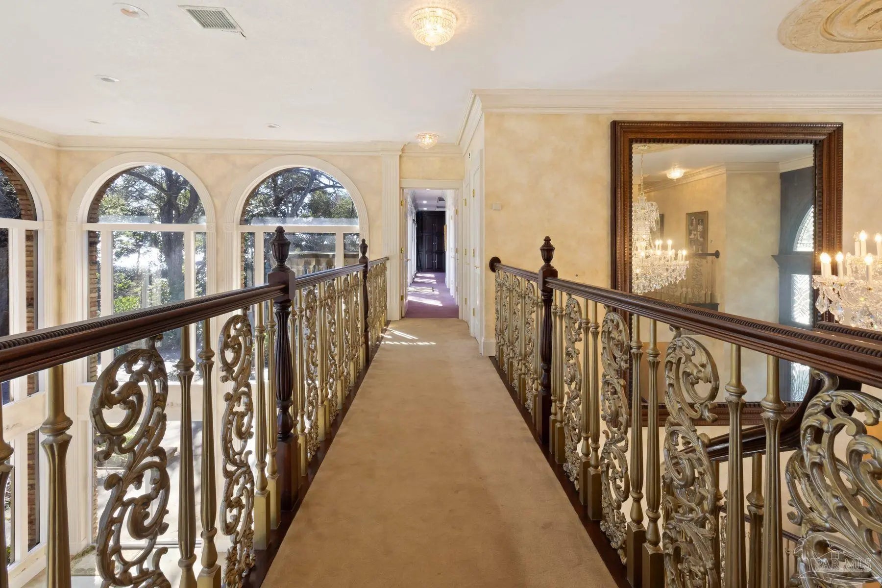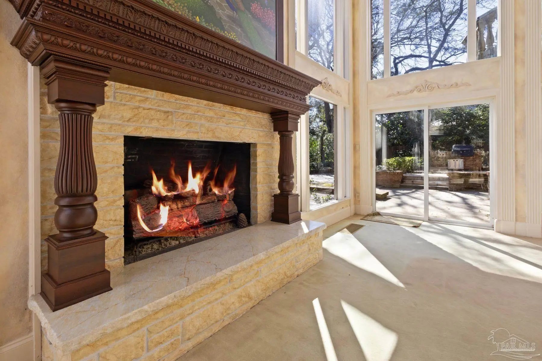 Tucked away on 2.75 acres along the Santa Rosa Sound, this stately waterfront estate offers an extraordinary combination of privacy, deep water access and breathtaking views of the barrier islands and the gulf. A 600-foot oak-lined driveway leads to this impressive 5,120-square-foot Old Chicago brick home, where timeless elegance meets the beauty of the Intracoastal Waterway. With 150 feet of private sandy beach and deep water frontage, this property provides unparalleled access to the water. Whether launching a kayak, paddleboard or jet ski right from your backyard or simply enjoying the serenity of the water from the verandas, this is a retreat like no other. Inside, architectural details abound. Crystal chandeliers, imported mahogany millwork, and soaring 25-ft. ceilings frame a home built for both grandeur and comfort. A wall of windows in the main living area captures stunning water views, while three fireplaces add warmth and charm. The primary suite is a private sanctuary, complete with a fireplace, balcony and an opulent dressing area. A library with a wet bar offers a quiet escape, and the kitchen is equipped with designer Sub-Zero and Thermador appliances, including warming and refrigeration drawers. Outdoor living is equally remarkable with covered porches, open patios and a separate artist studio, all set against the backdrop of sweeping waterfront vistas. The gated entrance and long paver driveway enhance the estate’s exclusivity. For those seeking a private deepwater retreat, this property offers an unparalleled lifestyle. Alternatively, its expansive acreage presents an exceptional development opportunity, with potential for multiple waterfront homesites and additional residences with water access. Whether as a grand estate or an exclusive residential enclave, this Mary Esther property is a rare and remarkable find.