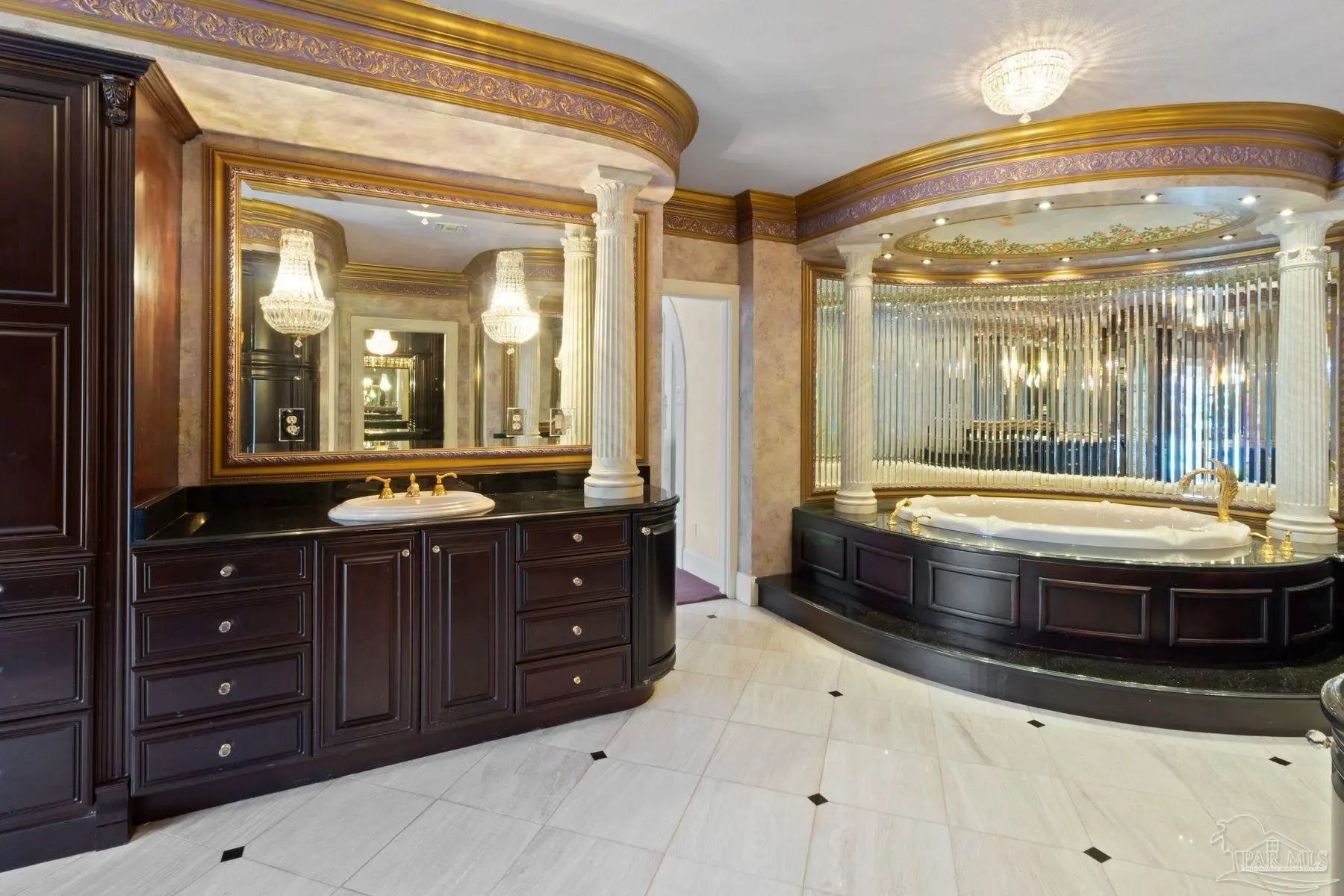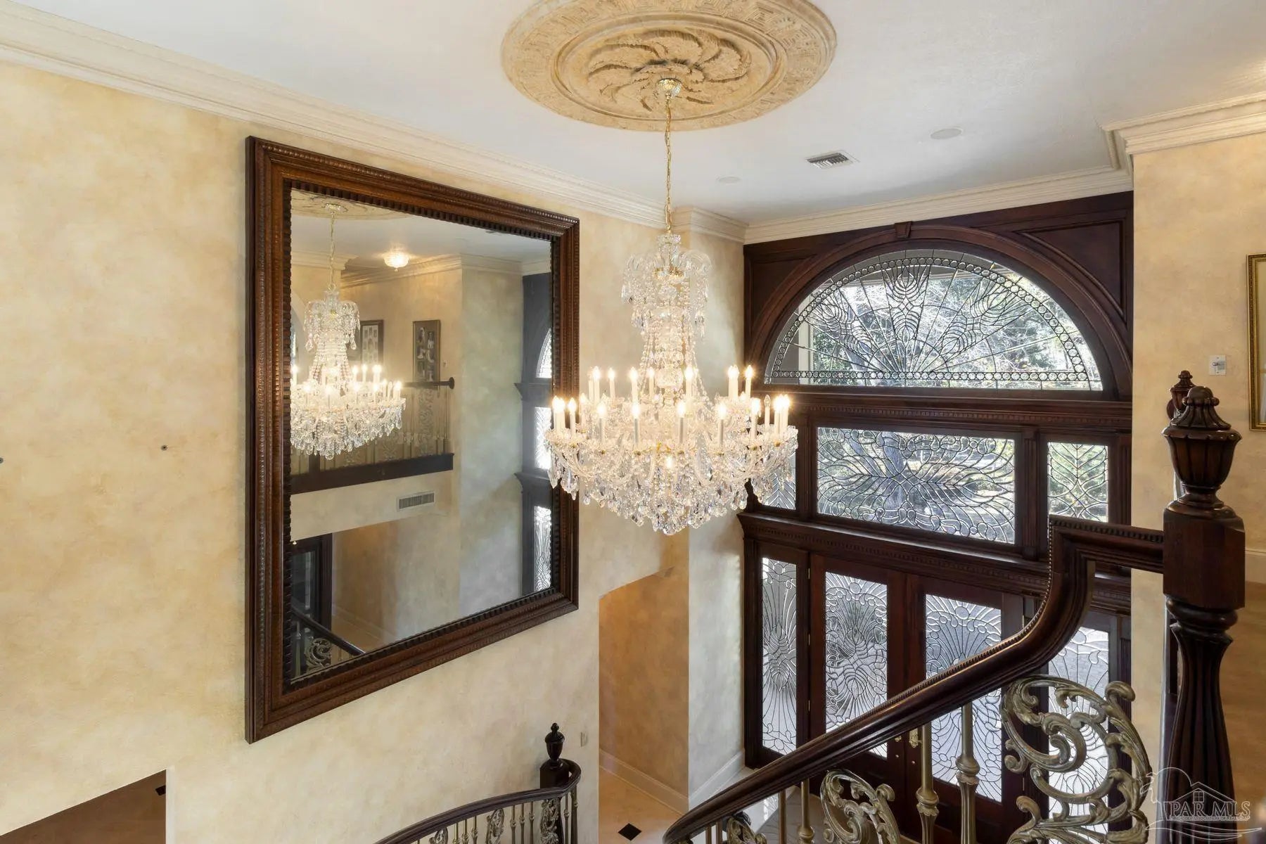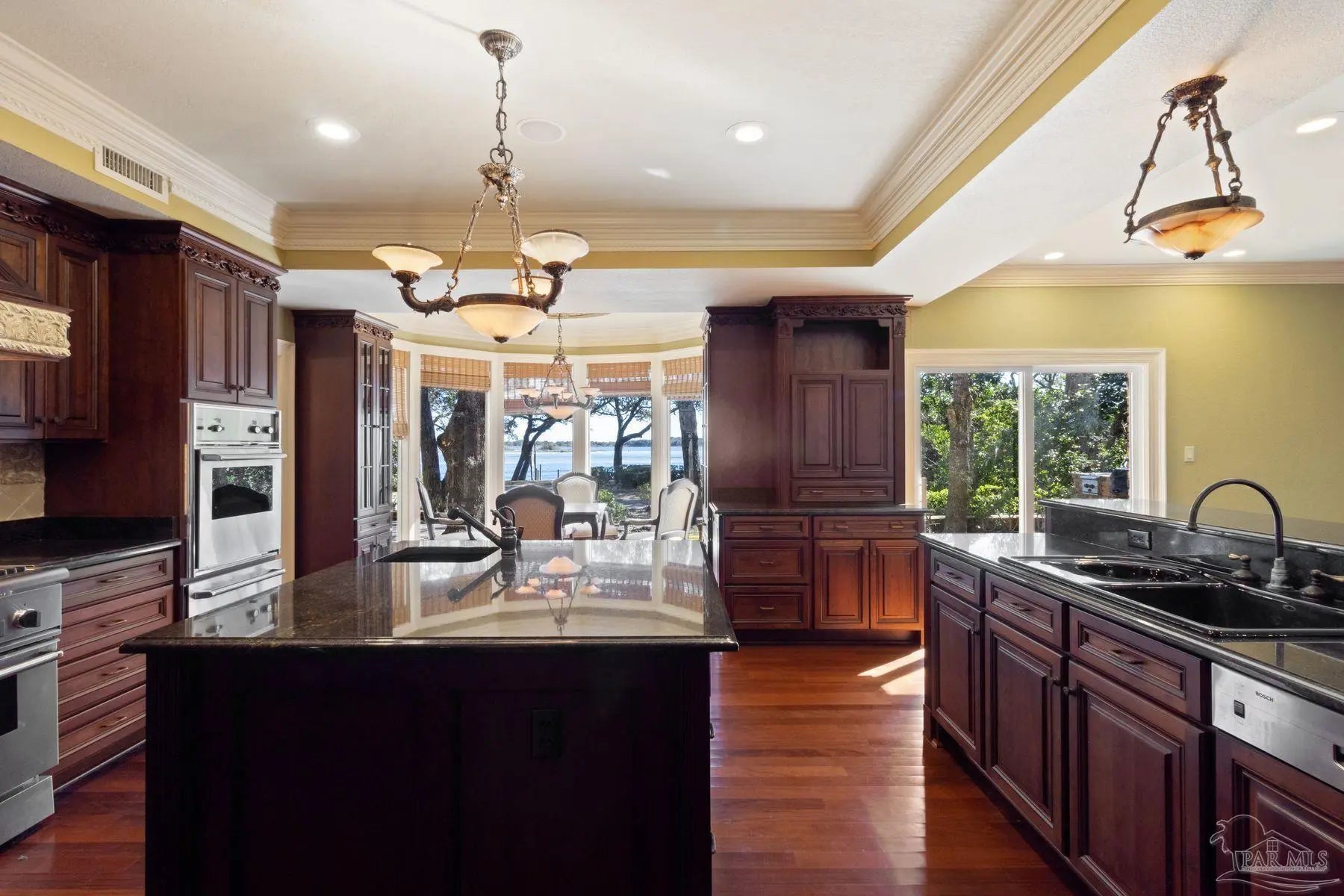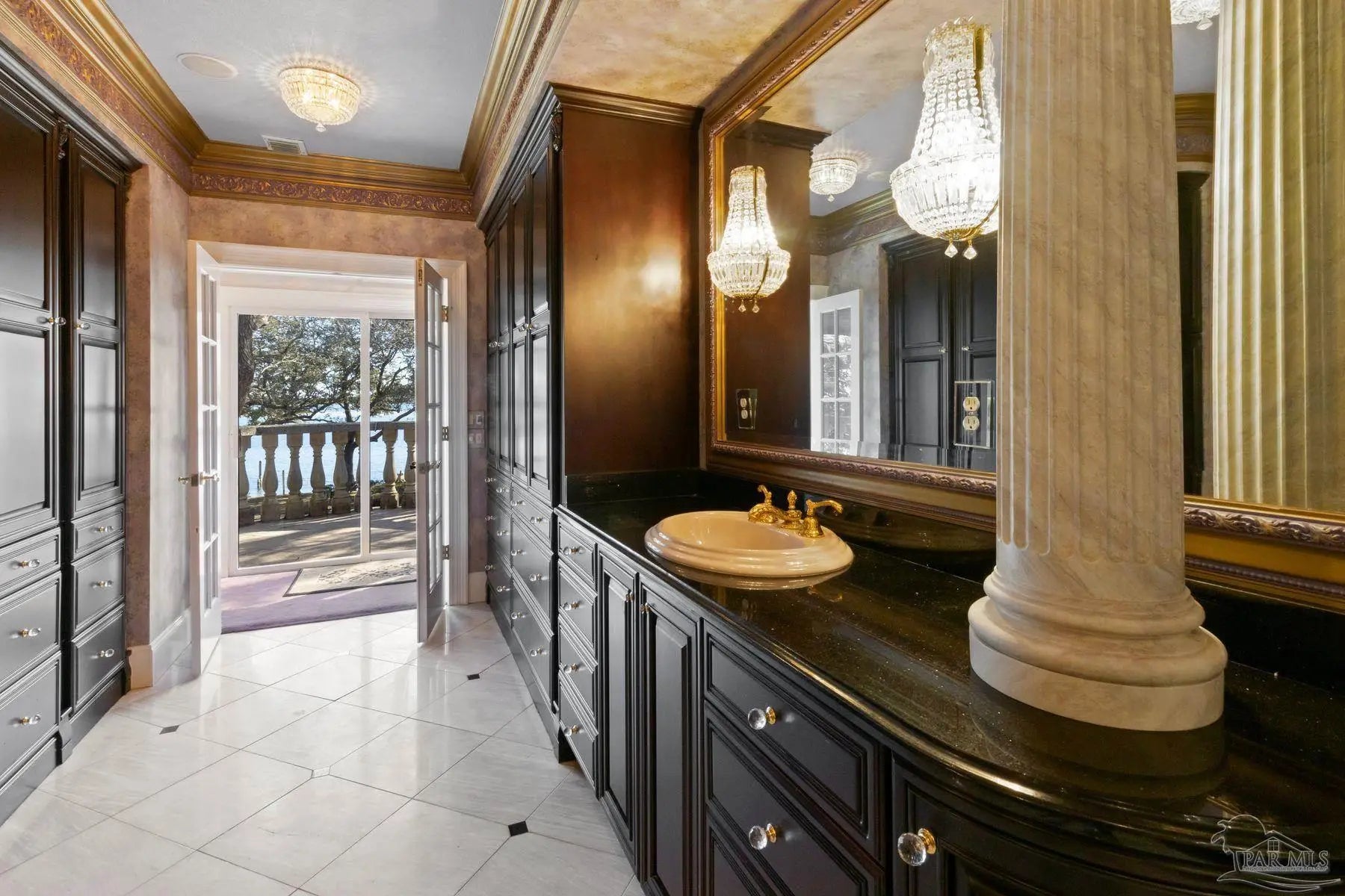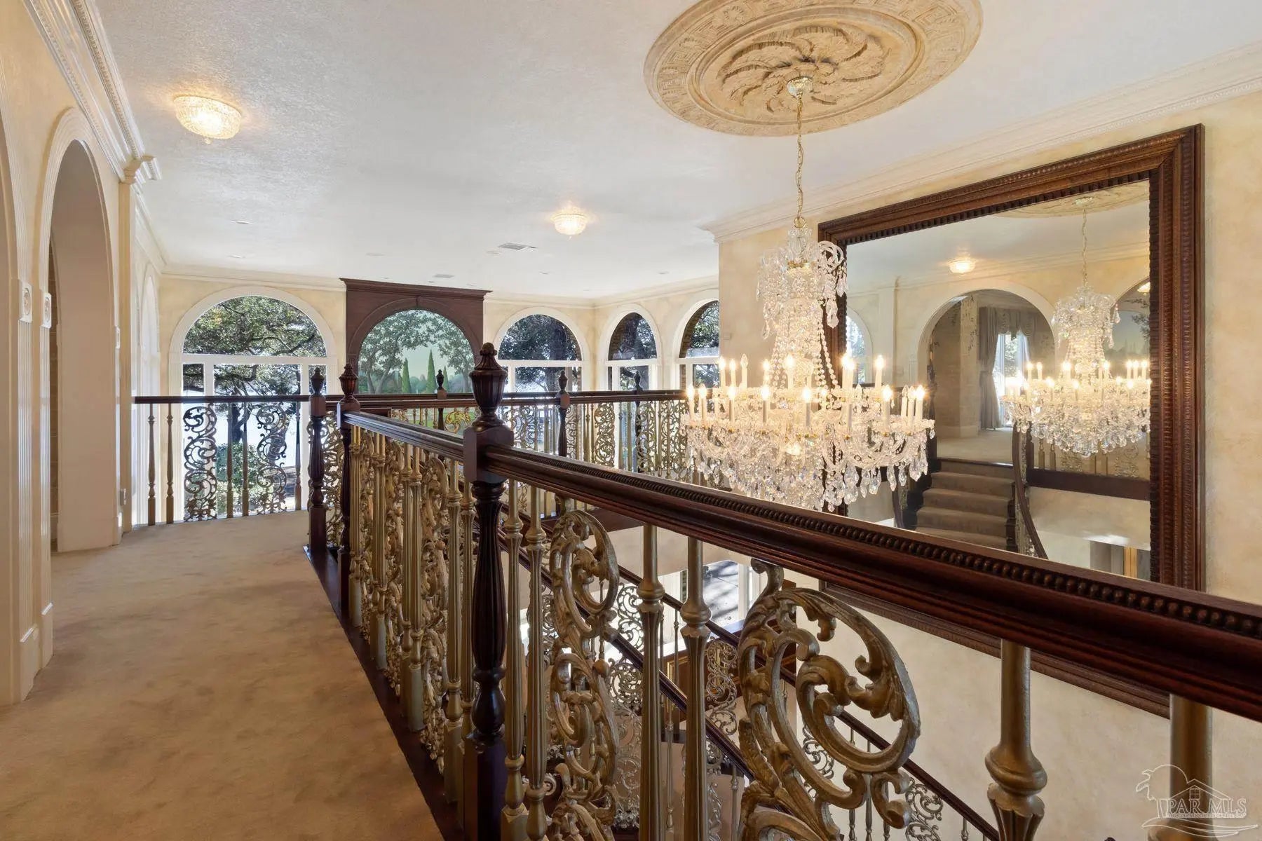 Tucked away on 2.75 acres along the Santa Rosa Sound, this stately waterfront estate offers an extraordinary combination of privacy, deep water access and breathtaking views of the barrier islands and the gulf. A 600-foot oak-lined driveway leads to this impressive 5,120-square-foot Old Chicago brick home, where timeless elegance meets the beauty of the Intracoastal Waterway. With 150 feet of private sandy beach and deep water frontage, this property provides unparalleled access to the water. Whether launching a kayak, paddleboard or jet ski right from your backyard or simply enjoying the serenity of the water from the verandas, this is a retreat like no other. Inside, architectural details abound. Crystal chandeliers, imported mahogany millwork, and soaring 25-ft. ceilings frame a home built for both grandeur and comfort. A wall of windows in the main living area captures stunning water views, while three fireplaces add warmth and charm. The primary suite is a private sanctuary, complete with a fireplace, balcony and an opulent dressing area. A library with a wet bar offers a quiet escape, and the kitchen is equipped with designer Sub-Zero and Thermador appliances, including warming and refrigeration drawers. Outdoor living is equally remarkable with covered porches, open patios and a separate artist studio, all set against the backdrop of sweeping waterfront vistas. The gated entrance and long paver driveway enhance the estate’s exclusivity. For those seeking a private deepwater retreat, this property offers an unparalleled lifestyle. Alternatively, its expansive acreage presents an exceptional development opportunity, with potential for multiple waterfront homesites and additional residences with water access. Whether as a grand estate or an exclusive residential enclave, this Mary Esther property is a rare and remarkable find.