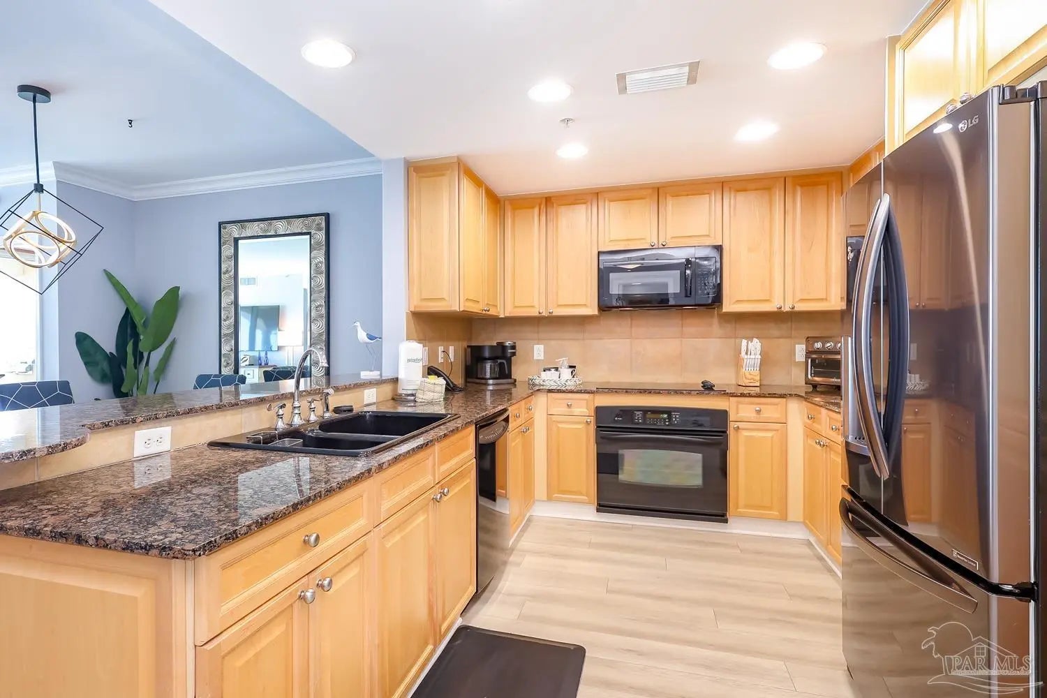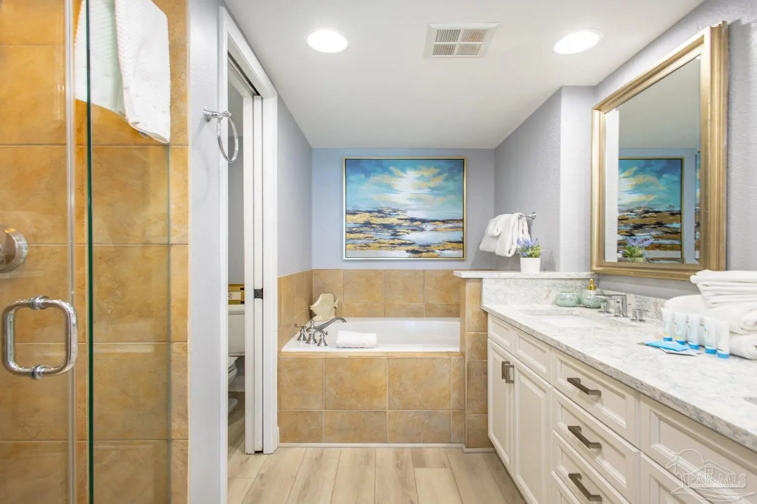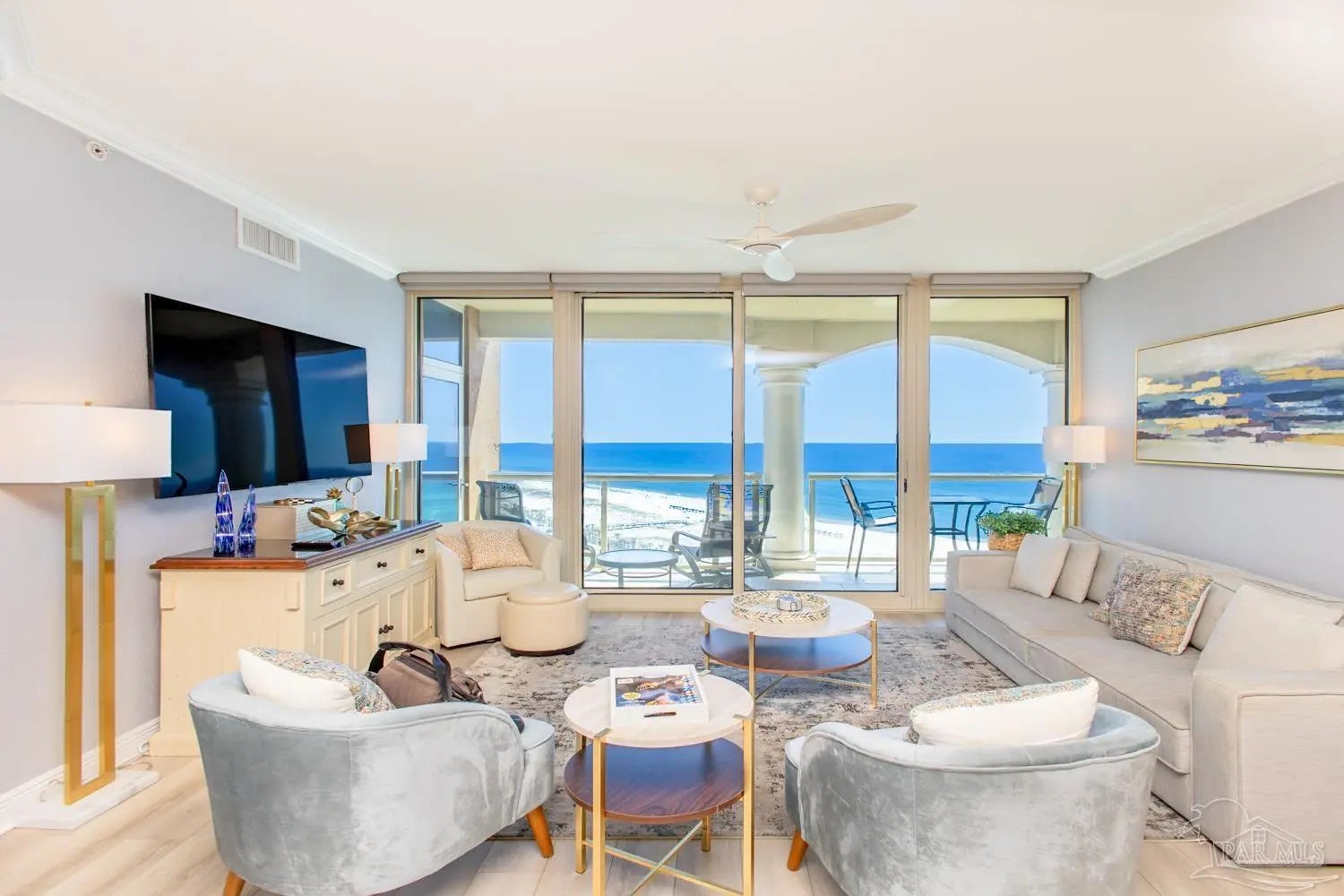 This beautifully remodeled and fully furnished condo offers breathtaking Gulf views from every room. Thoughtfully designed, blending contemporary elegance with coastal charm. Expansive windows frame stunning Gulf views, while the open-concept living, dining, and kitchen areas are bathed in natural light. Whether you're looking for a primary residence, second home, or a lucrative vacation rental, this unit exceeds expectations. Designed with hosting in mind, the unit boasts Luxury Vinyl Plank flooring throughout, trey ceiling with crown molding, and an abundance of storage. The seamless flow from the main living area to the spacious covered deck with a built-in grille provides the perfect indoor-outdoor living experience. The kitchen is a standout, featuring shaker-style light oak cabinetry, stainless steel appliances, Granite countertops, recessed lighting, and a split-level breakfast bar with ample seating. The primary suite with serene views and multiple closets leads into a spa-like en-suite bath with a walk-in shower, frameless glass door, Jacuzzi tub, and coastal double vanity with Quartz countertops and beautiful framed mirrors. An additional bedroom with en-suite baths echoes the same high-end finishes, ensuring privacy and comfort. This unit also features a new HVAC system. Located in Tower 5, the newest and most private tower, residents enjoy access to their own heated pool and spa. Beyond the tower, the 21,000-square-foot Lifestyle Center offers world-class amenities, including a European spa, two lagoon-style infinity pools, an indoor Olympic-size lap pool, a fitness center, five Rubico tennis courts, poolside dining, and an on-site coastal restaurant. In the summer, activities are available for children, while adults can rent jet skis, paddleboards, and kayaks. This is more than a condo—it’s a true destination resort.