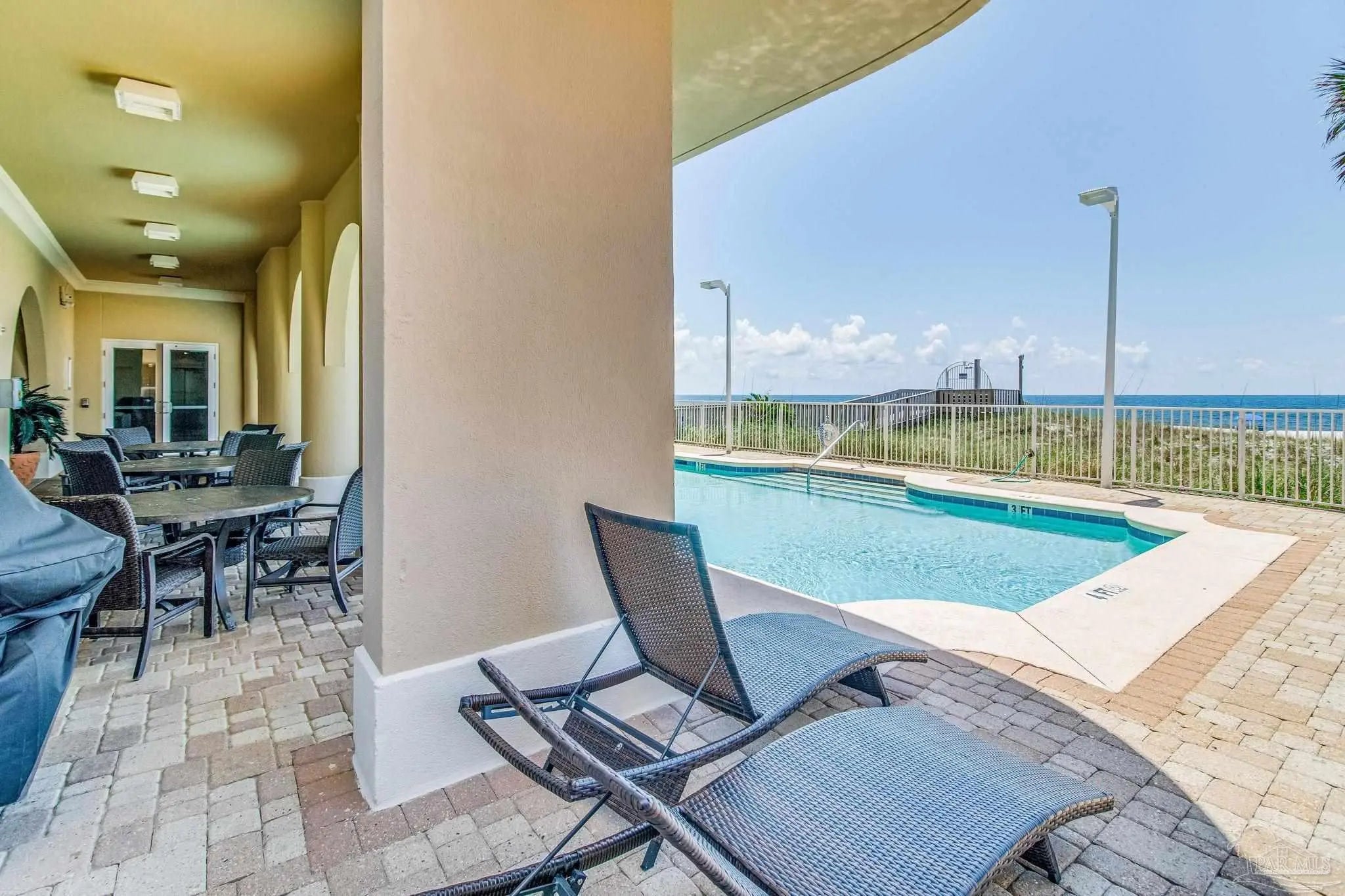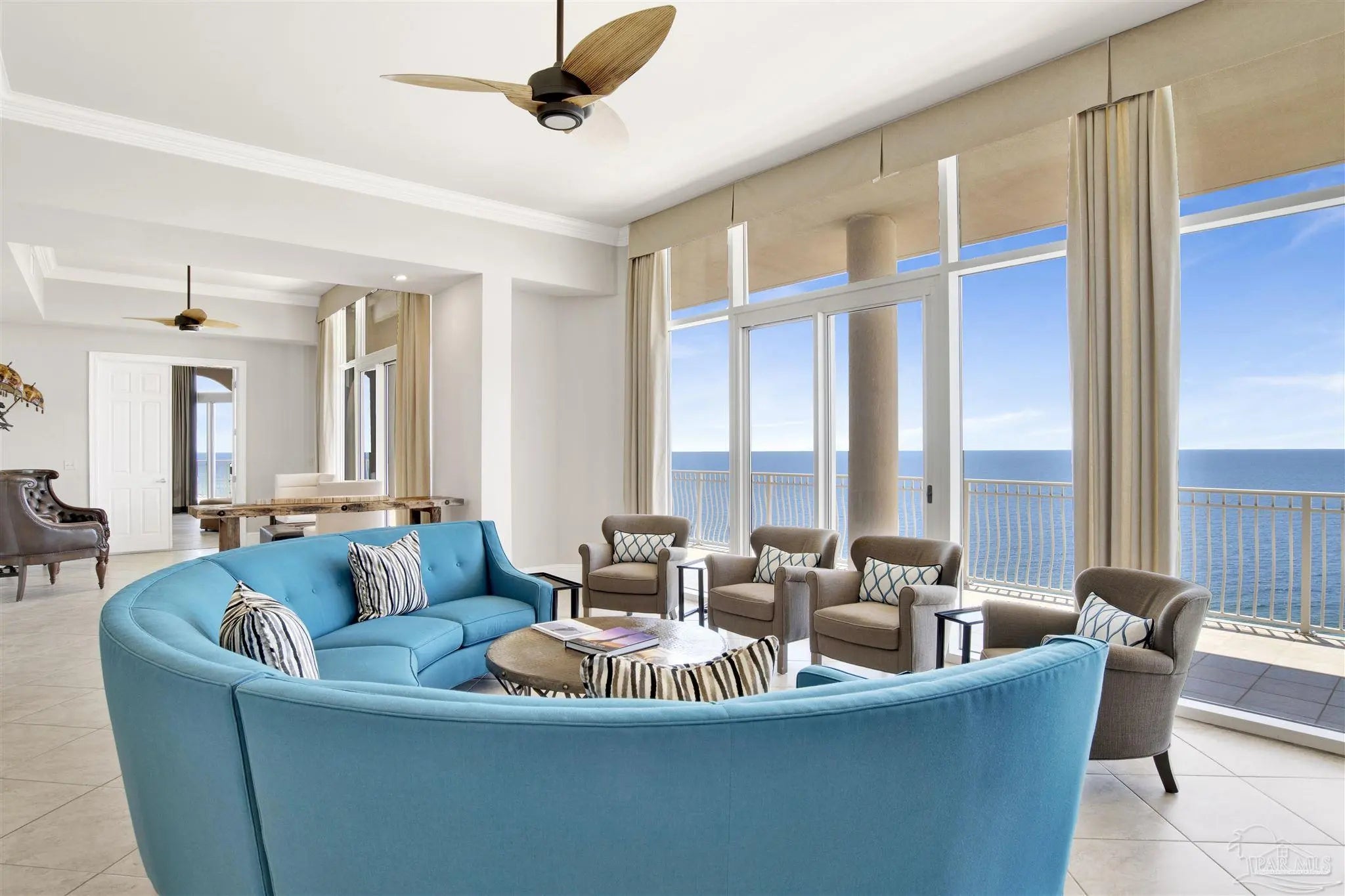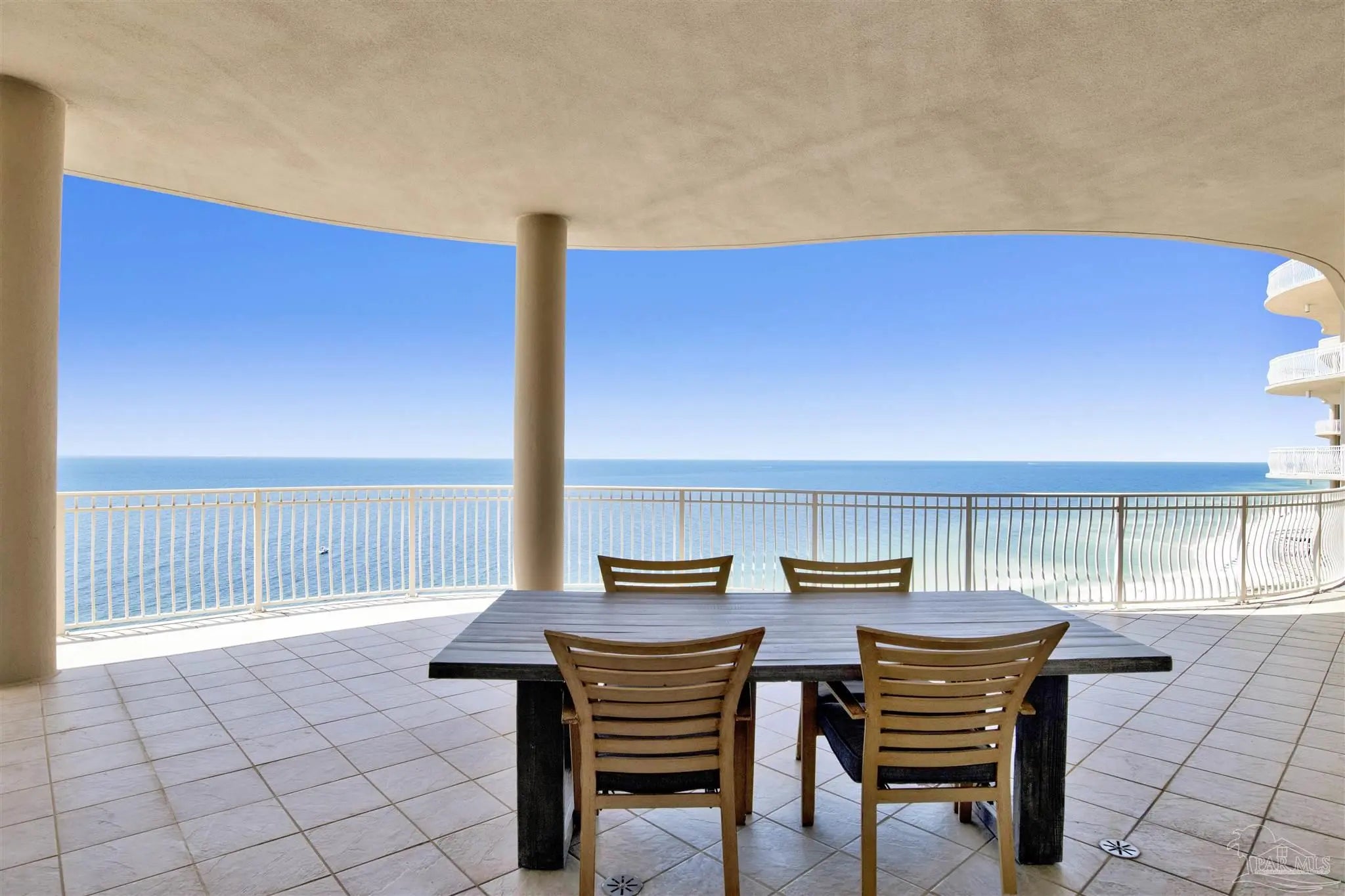 EXPERIENCE THE PINNACLE OF LUXURY IN THIS STUNNING PENTHOUSE OCCUPYING THE ENTIRE 14TH FLOOR OF LA RIVA EAST. BOASTING 4,868 SQ FT OF EXQUISITE LIVING SPACE AND AN EXPANSIVE 2,982 SQ FT BALCONY, THIS RESIDENCE OFFERS BREATHTAKING PANORAMIC VIEWS OF THE GULF AND PERDIDO KEY. This exceptional home features 5 spacious bedrooms, including both Primary and Secondary Gulf-front suites, situated at opposite ends of the residence to ensure ultimate privacy. Enjoy the convenience of a private elevator lobby, abundant storage space, and PREMIUM DEEDED GARAGE PARKING DIRECTLY IN FRONT OF THE BUILDING AND UNDER THE PORTICO. A double garage with storage is also available for purchase across the street (ask for details). Inside, discover a gourmet chef's kitchen with island and large breakfast bar, a fabulous separate wet bar, a large utility room, and spacious living and dining areas with floor-to-ceiling glass with motorized window coverings. Retreat to the Primary Bedroom Suite with its stunning sunrise views, dual walk-in closets, and a spa-like bathroom featuring a luxurious jetted tub and separate tiled shower. All three additional guest bedrooms are spacious with two enjoying lovely panoramic island views, one with private balcony, and the third with two sets of custom bunk beds. La Riva owners enjoy privacy & uncrowded beaches with only 66 rent-restricted units (1-year minimum lease) and 520' of sugar white sands. La Riva EAST is the only La Riva building with a theater room! La Riva owners and guests enjoy the best of amenities including a gulf-front heated indoor pool, outdoor pool and hot tub, and well-equipped fitness center with steam and sauna overlooking the beach. THE VIEWS FROM THIS PENTHOUSE RESIDENCE ARE TRULY A MUST SEE!