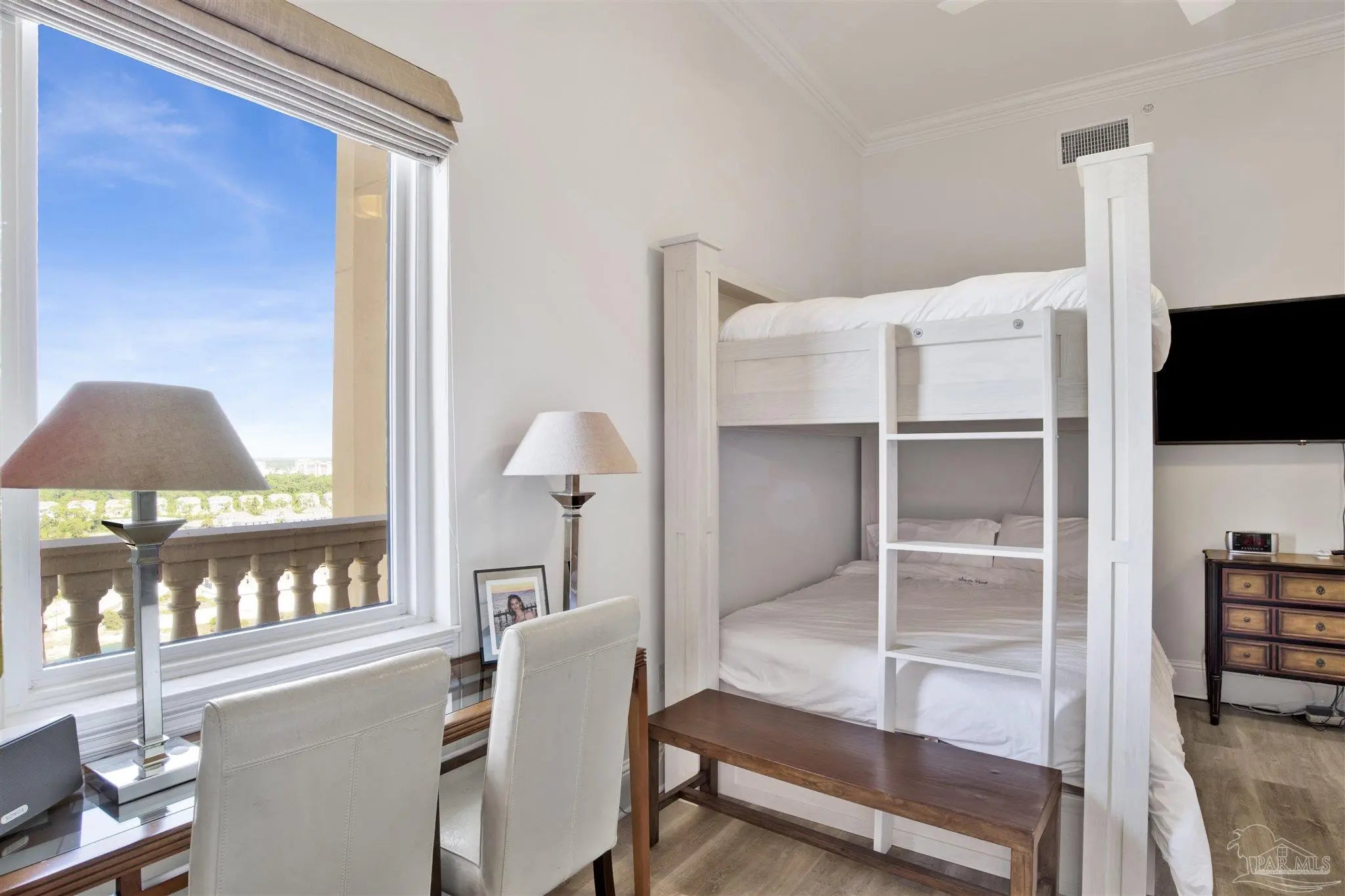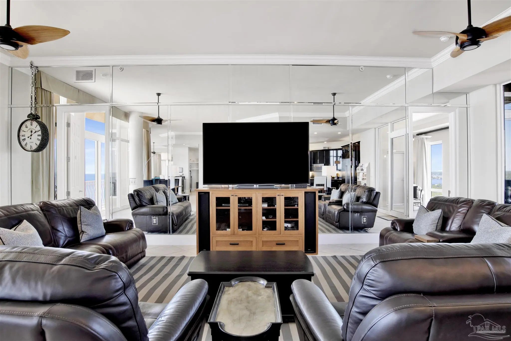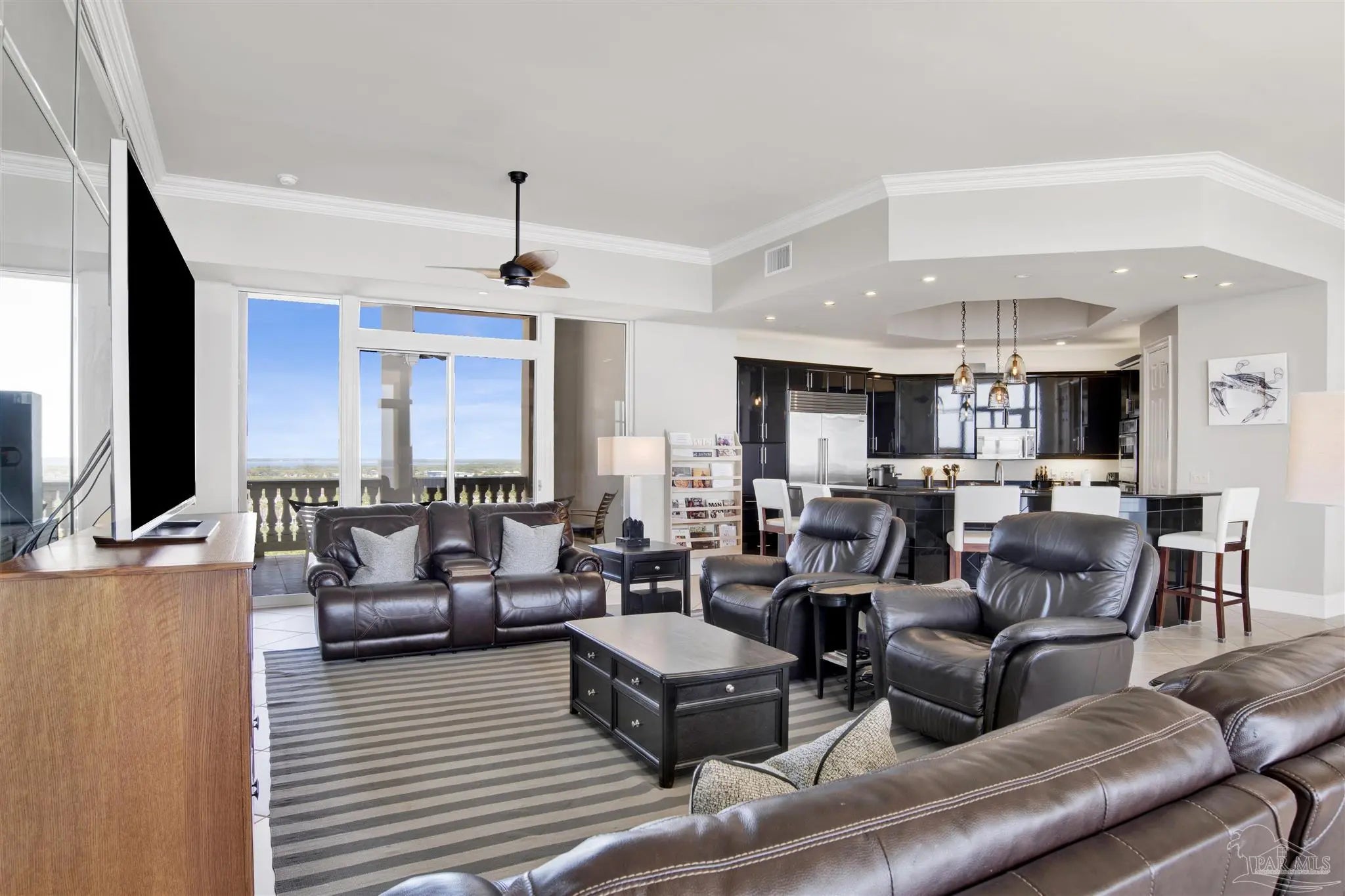 EXPERIENCE THE PINNACLE OF LUXURY IN THIS STUNNING PENTHOUSE OCCUPYING THE ENTIRE 14TH FLOOR OF LA RIVA EAST. BOASTING 4,868 SQ FT OF EXQUISITE LIVING SPACE AND AN EXPANSIVE 2,982 SQ FT BALCONY, THIS RESIDENCE OFFERS BREATHTAKING PANORAMIC VIEWS OF THE GULF AND PERDIDO KEY. This exceptional home features 5 spacious bedrooms, including both Primary and Secondary Gulf-front suites, situated at opposite ends of the residence to ensure ultimate privacy. Enjoy the convenience of a private elevator lobby, abundant storage space, and PREMIUM DEEDED GARAGE PARKING DIRECTLY IN FRONT OF THE BUILDING AND UNDER THE PORTICO. A double garage with storage is also available for purchase across the street (ask for details). Inside, discover a gourmet chef's kitchen with island and large breakfast bar, a fabulous separate wet bar, a large utility room, and spacious living and dining areas with floor-to-ceiling glass with motorized window coverings. Retreat to the Primary Bedroom Suite with its stunning sunrise views, dual walk-in closets, and a spa-like bathroom featuring a luxurious jetted tub and separate tiled shower. All three additional guest bedrooms are spacious with two enjoying lovely panoramic island views, one with private balcony, and the third with two sets of custom bunk beds. La Riva owners enjoy privacy & uncrowded beaches with only 66 rent-restricted units (1-year minimum lease) and 520' of sugar white sands. La Riva EAST is the only La Riva building with a theater room! La Riva owners and guests enjoy the best of amenities including a gulf-front heated indoor pool, outdoor pool and hot tub, and well-equipped fitness center with steam and sauna overlooking the beach. THE VIEWS FROM THIS PENTHOUSE RESIDENCE ARE TRULY A MUST SEE!