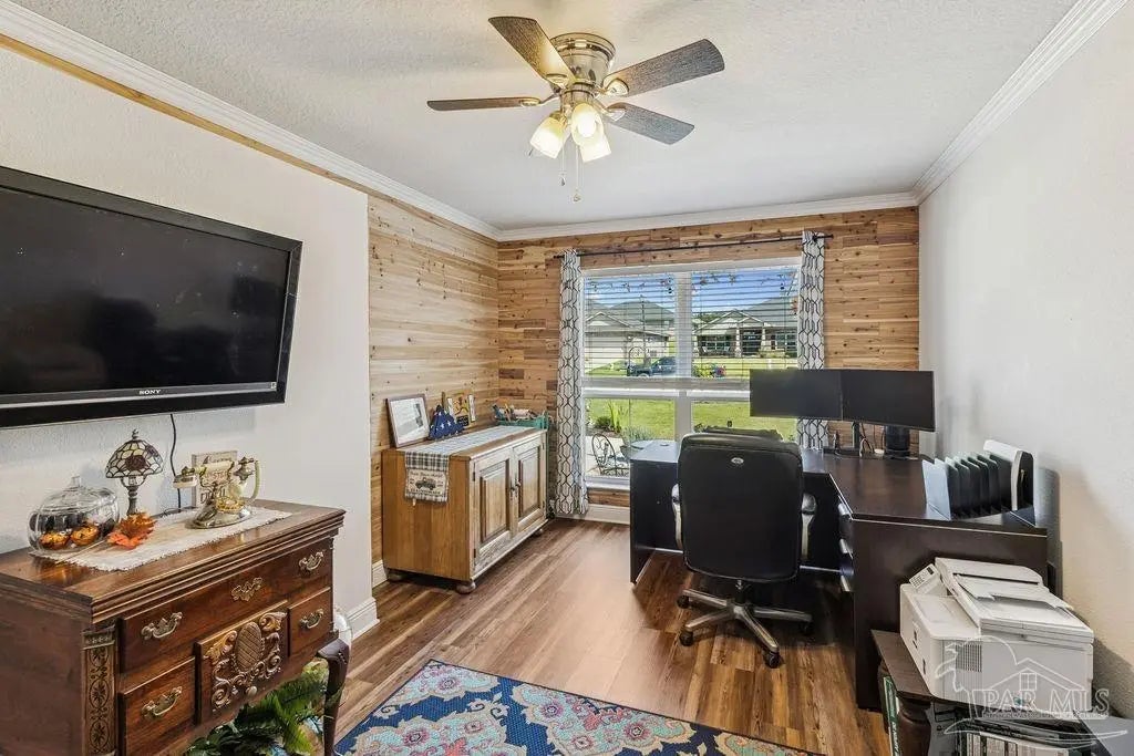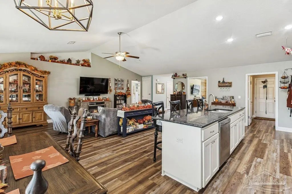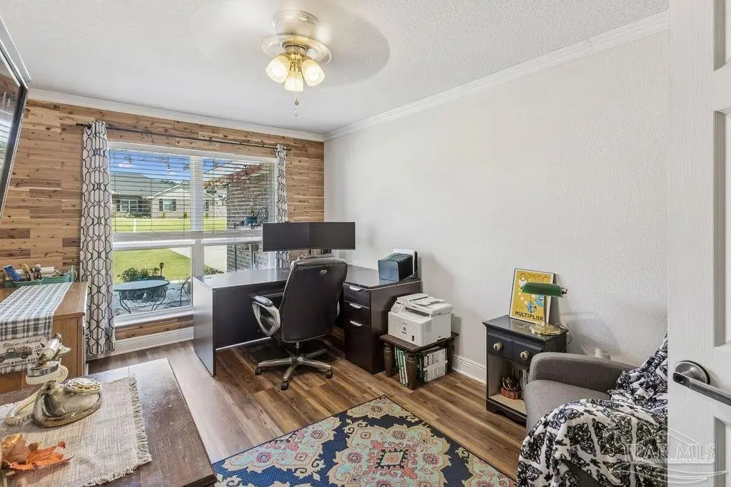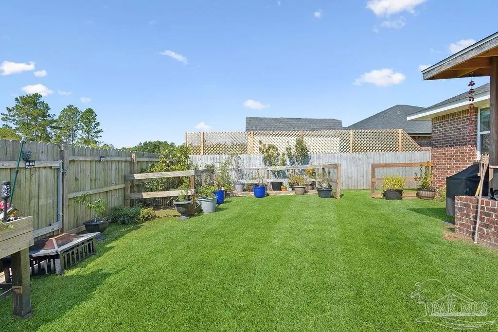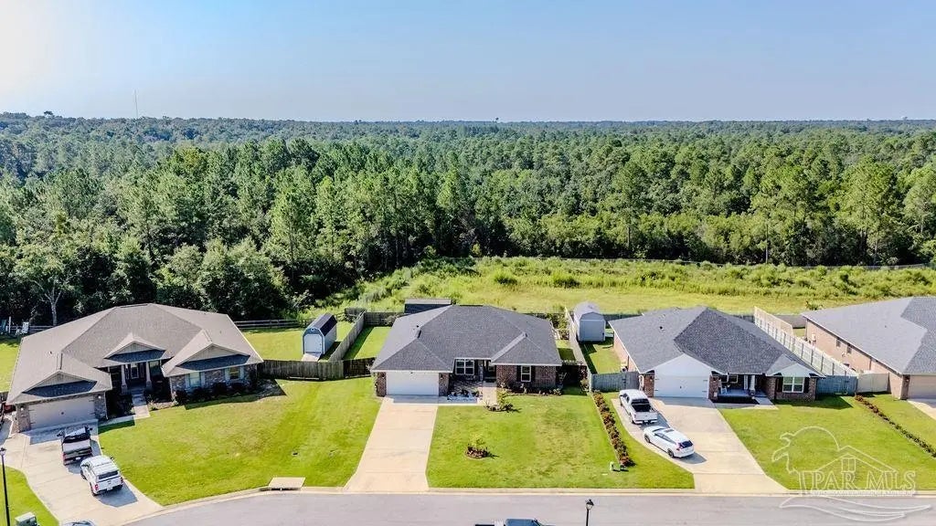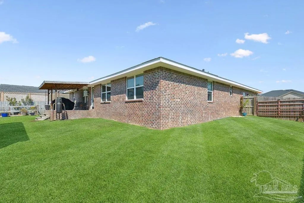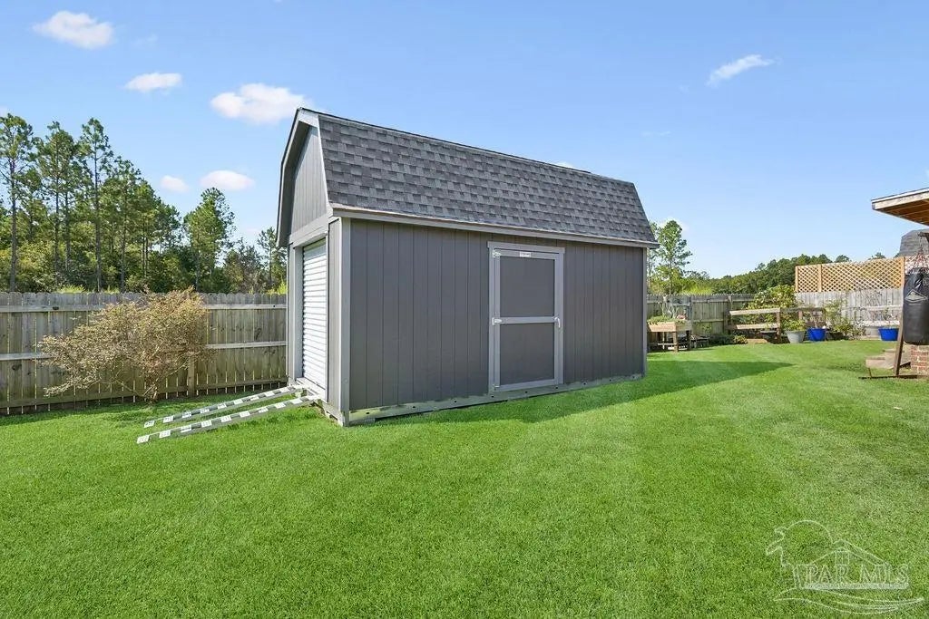 Welcome to this spacious 4BR/3BA home with an additional office/bonus room, located in a quiet one-way-in, one-way-out neighborhood that’s perfect for families. This well-loved community is close to town and shopping, and its layout makes it ideal for walking, bike riding, and giving kids a little extra room to roam. The kitchen features granite countertops, a large island with breakfast bar, a roomy breakfast nook, nice pantry, and an additional buffet with cabinets and counter space. The split bedroom layout includes an oversized primary suite with a large shower, double vanities, a private water closet, and a generous walk-in closet. Bedrooms 3 and 4 share a convenient Jack-and-Jill bath, while Bedroom 2 has its own full hall bath nearby. A separate bonus room provides excellent flexibility for a home office, playroom, studio, or hobby space. This room is fully insulated with interior access and secure electronic entry for added convenience. New luxury vinyl plank flooring flows throughout the main living areas, offering a modern, durable, and low-maintenance finish. Step outside to enjoy the open patio, fenced backyard with double gate, and a custom-built storage building—perfect for a workshop, man cave, or she shed. Additional features include a full-yard sprinkler system on city water for easy lawn care and an annual termite bond that will transfer at closing. Centrally located near I-10, shopping, Whiting Field, NAS Pensacola, and top-rated schools—plus just a quick 30-minute ride to the beach!