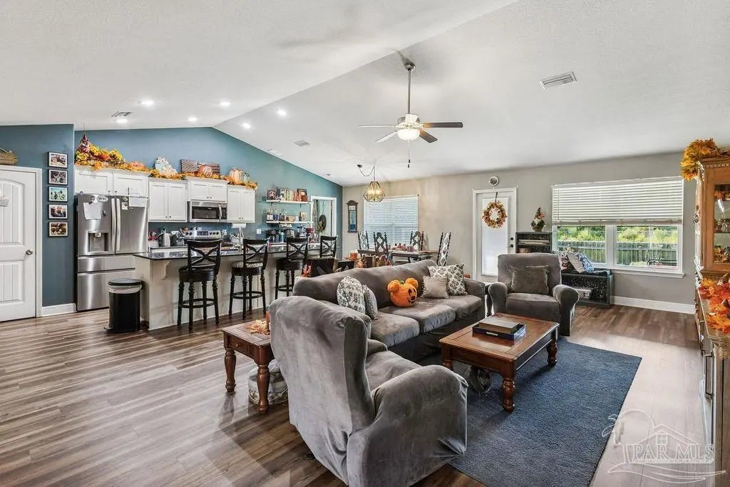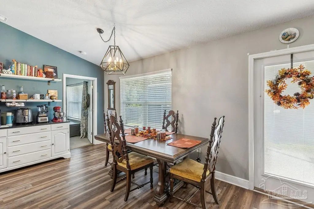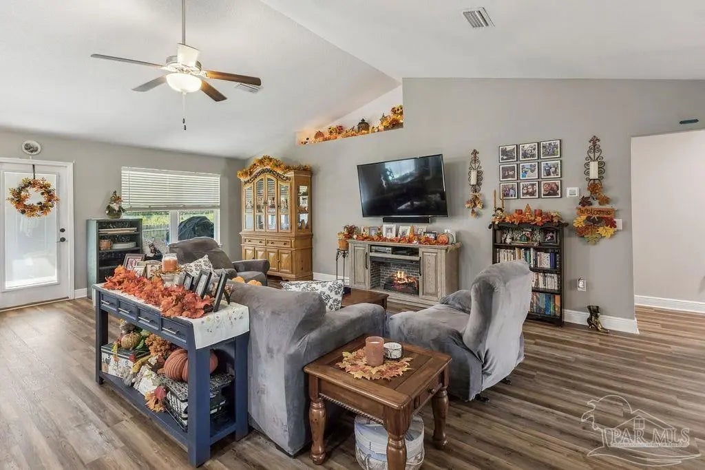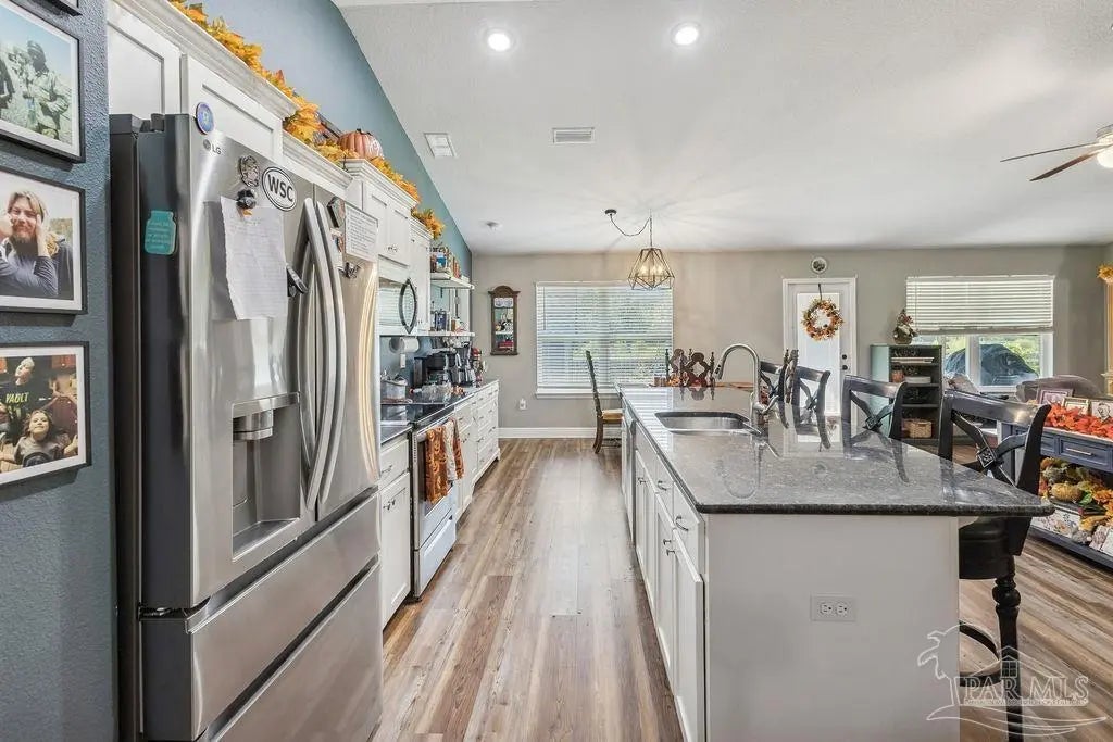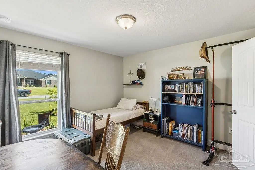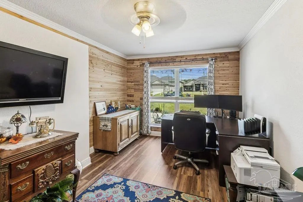 Welcome to this spacious 4BR/3BA home with an additional office/bonus room, located in a quiet one-way-in, one-way-out neighborhood that’s perfect for families. This well-loved community is close to town and shopping, and its layout makes it ideal for walking, bike riding, and giving kids a little extra room to roam. The kitchen features granite countertops, a large island with breakfast bar, a roomy breakfast nook, nice pantry, and an additional buffet with cabinets and counter space. The split bedroom layout includes an oversized primary suite with a large shower, double vanities, a private water closet, and a generous walk-in closet. Bedrooms 3 and 4 share a convenient Jack-and-Jill bath, while Bedroom 2 has its own full hall bath nearby. A separate bonus room provides excellent flexibility for a home office, playroom, studio, or hobby space. This room is fully insulated with interior access and secure electronic entry for added convenience. New luxury vinyl plank flooring flows throughout the main living areas, offering a modern, durable, and low-maintenance finish. Step outside to enjoy the open patio, fenced backyard with double gate, and a custom-built storage building—perfect for a workshop, man cave, or she shed. Additional features include a full-yard sprinkler system on city water for easy lawn care and an annual termite bond that will transfer at closing. Centrally located near I-10, shopping, Whiting Field, NAS Pensacola, and top-rated schools—plus just a quick 30-minute ride to the beach!