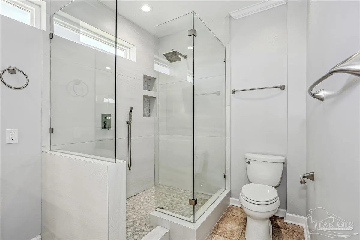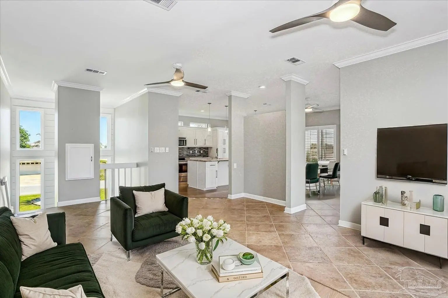 Back on the market—prior contract fell through due to the buyer’s home not selling within the contingency timeframe. LENDER CREDIT AVAILABLE with acceptable offer. This fully updated, custom Jim Bozeman–designed coastal home is immaculately maintained and built to last with 2x6 framing and all plywood sheathing for exceptional strength and quality. The thoughtfully designed floor plan offers versatility and comfort throughout. On the main level, you’ll find two spacious bedrooms, a large hall bath, under-stair storage, and a well-appointed laundry room featuring a granite folding table. The oversized 22x24 side-entry garage provides ample room for parking and additional storage. A striking wall of full-view windows brightens the stairway and leads to the stunning open-concept upper level, where natural light fills the living, dining, and kitchen areas. Elegant finishes such as crown molding, plantation shutters, Minke Aire ceiling fans, and a gas fireplace create a warm and welcoming atmosphere. The redesigned kitchen, completed in 2015, is a chef’s delight with custom cabinetry, Bosch stainless steel appliances, under-cabinet lighting, a large island with deep stainless sink, Fantasy Brown leathered granite countertops, and high-end pendant lighting that perfectly complements the space. Also located upstairs is the spacious primary suite and a convenient half bath for guests. The luxurious primary bathroom features a massive L-shaped double vanity and a new walk-in shower with 3x6-foot tile, a glass tile floor, and a frameless glass door, creating a spa-like retreat. From the upper level, step out onto the full-length covered deck overlooking a peaceful lake surrounded by lush landscaping, paver walkways, and mature palms—an ideal space for relaxing or entertaining. Additional home features include new impact windows and doors on the front and north side, Bahama shutters on the south side, a 24-gauge standing seam metal roof with peel-and-stick underlayment,