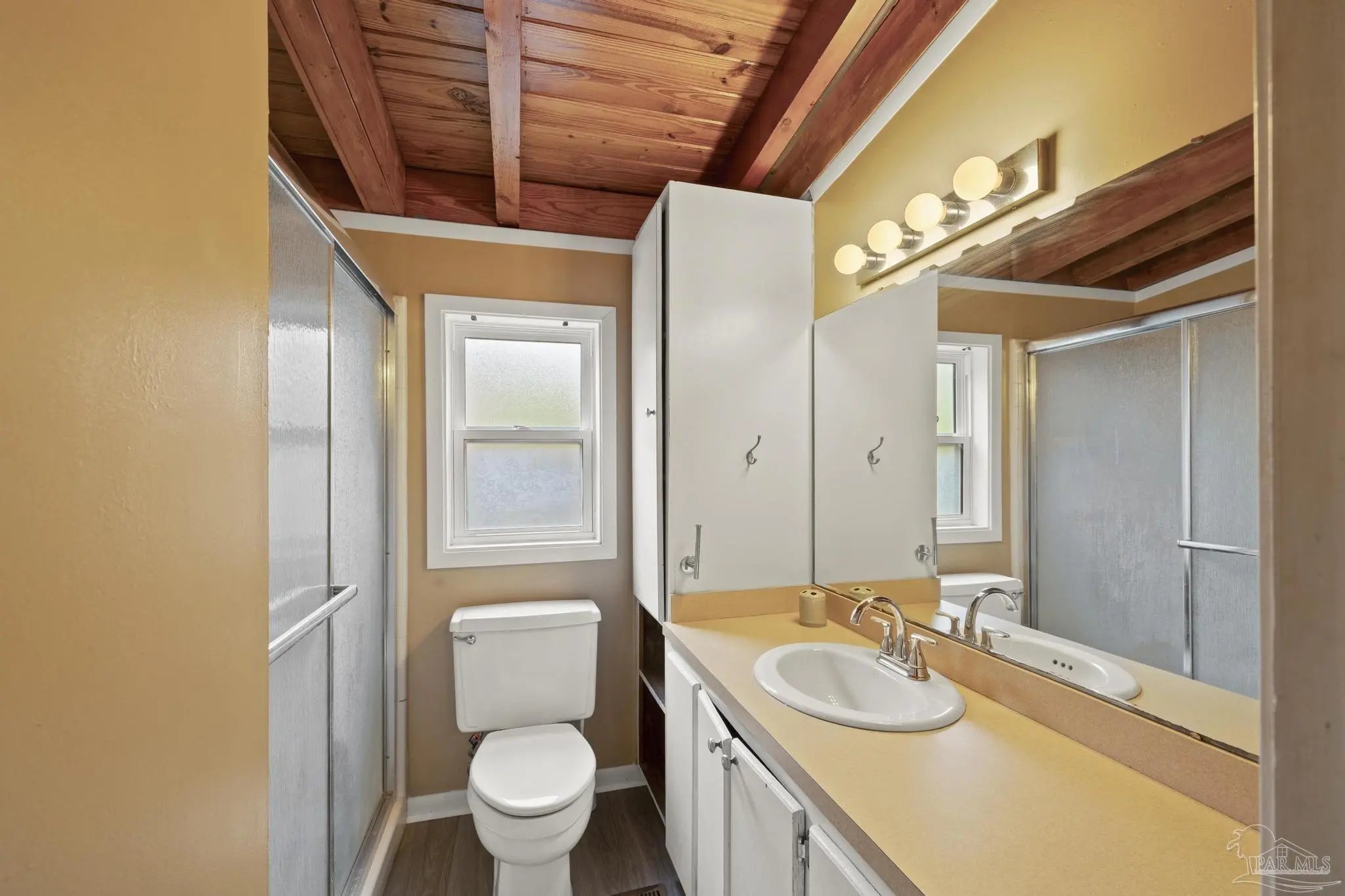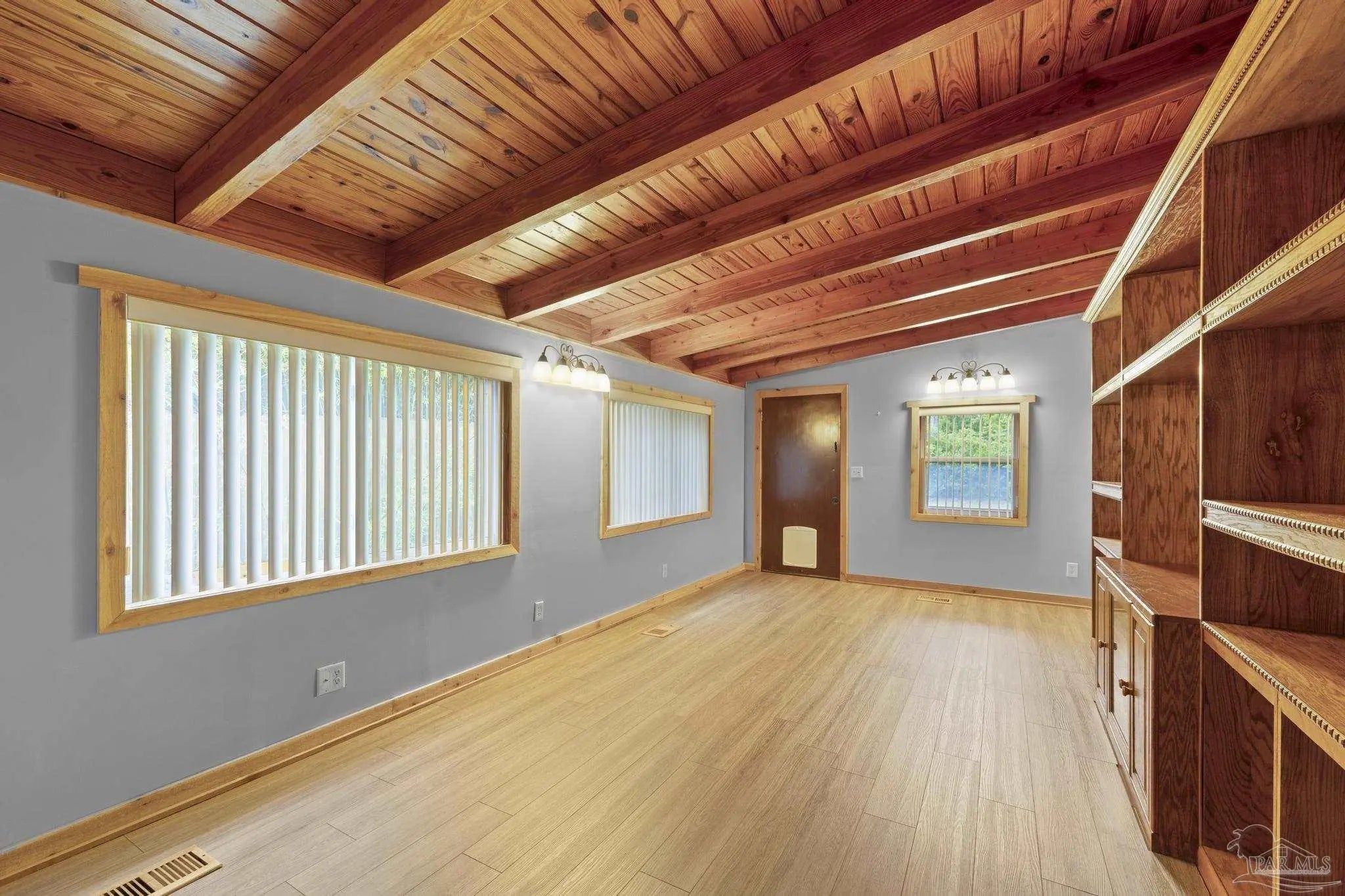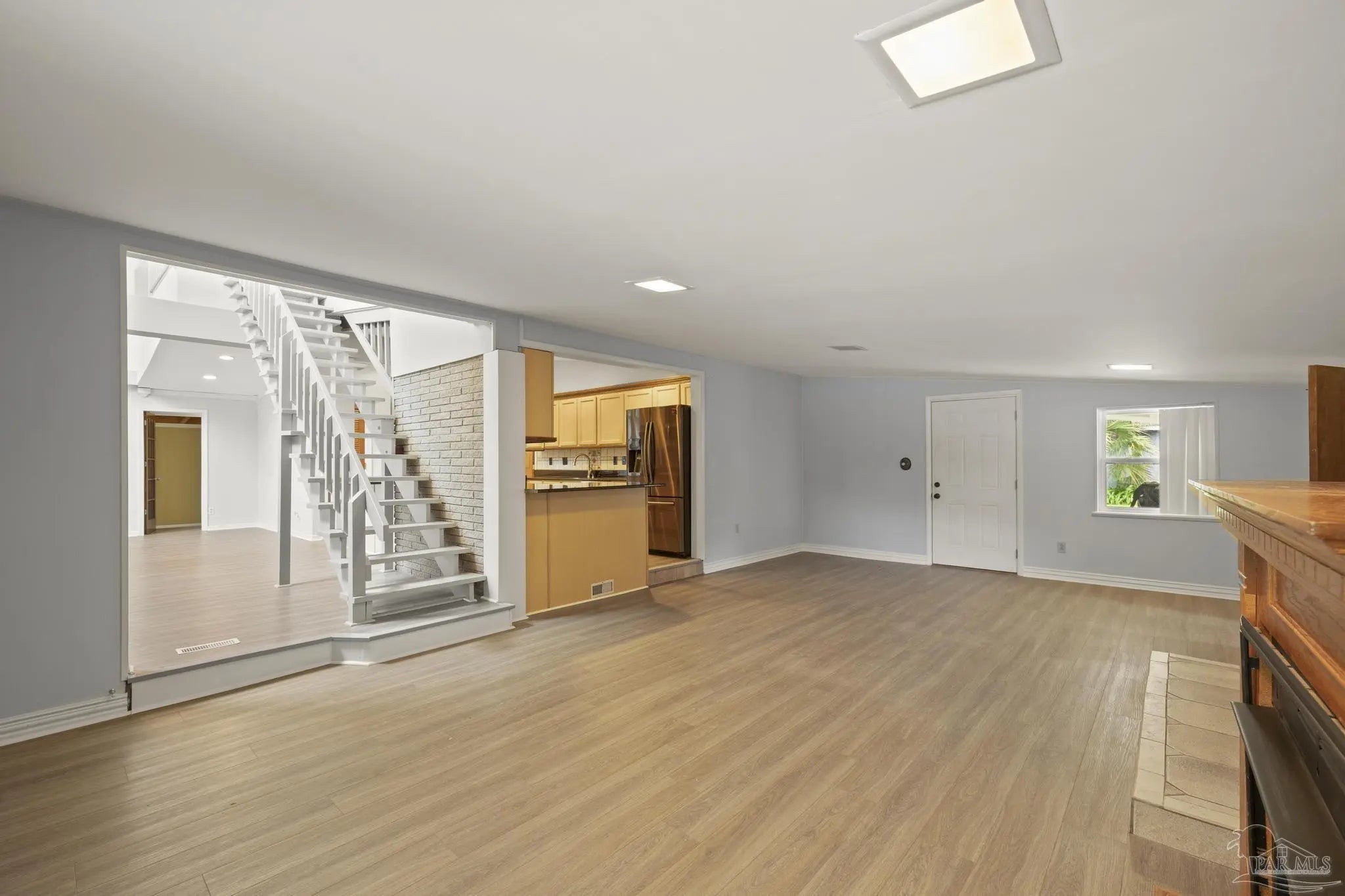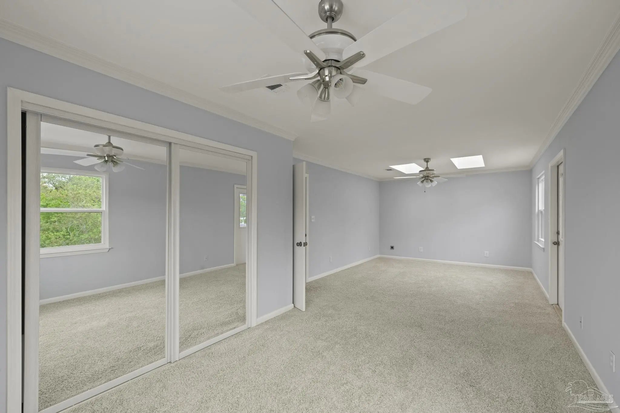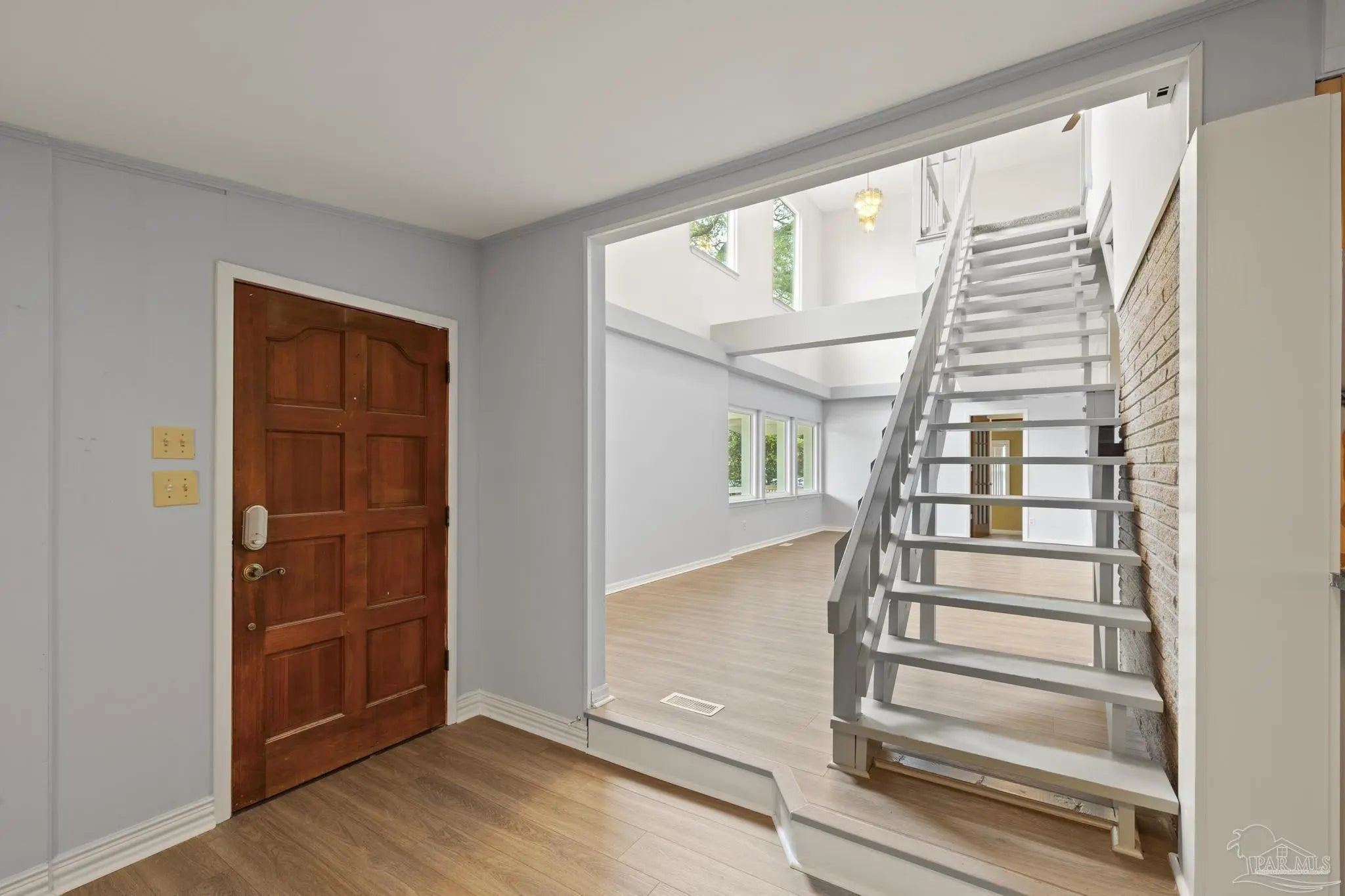 Unique 5 bedroom house in Gulf Breeze Proper. Spacious with open interior areas, covered porches front and back, and large windows for plenty of natural light. The large yard is fenced, level and has old growth trees. Location! Location! Location! Gulf Breeze Proper – 10 minutes to beach, award winning schools - sought after location. Quiet neighborhood near schools, parks, and the Gulf Breeze Rec Center. With over 3000 sq ft of living space, large family home in the heart of Gulf Breeze Proper is a find. Wide welcoming covered front porch opens into spacious family room with gas fireplace. Main floor has a large master suite complete with a dressing area and walk in closet. There are two more bedrooms downstairs. Windows replaced in 2018. When you step into the foyer and look up, you see the cathedral ceiling and the large, high windows for lots of natural light. There are two living areas, one is lined with built in shelving. The rear living area would be perfect for a "man cave" or a room for the children to watch television or play games. The kitchen has lots of storage and granite countertops. Fenced back yard with a covered porch for get togethers. Roof is 5-6 years old and water heater is 4 years old. There are two A/C units. One is new with a ten year warranty. The second one is 2 years old. Upstairs is a loft, another master bedroom and a guest bedroom. Skylights bring in lots of natural light. Large indoor laundry with extra storage and a 1 car garage. Located just steps from Sunset Part and the Gulf Breeze Rec Center. ALSO, home is one mile from Shoreline boat launch ramp for which you get free use if you live in Gulf Breeze Proper. Effective year built 1989.