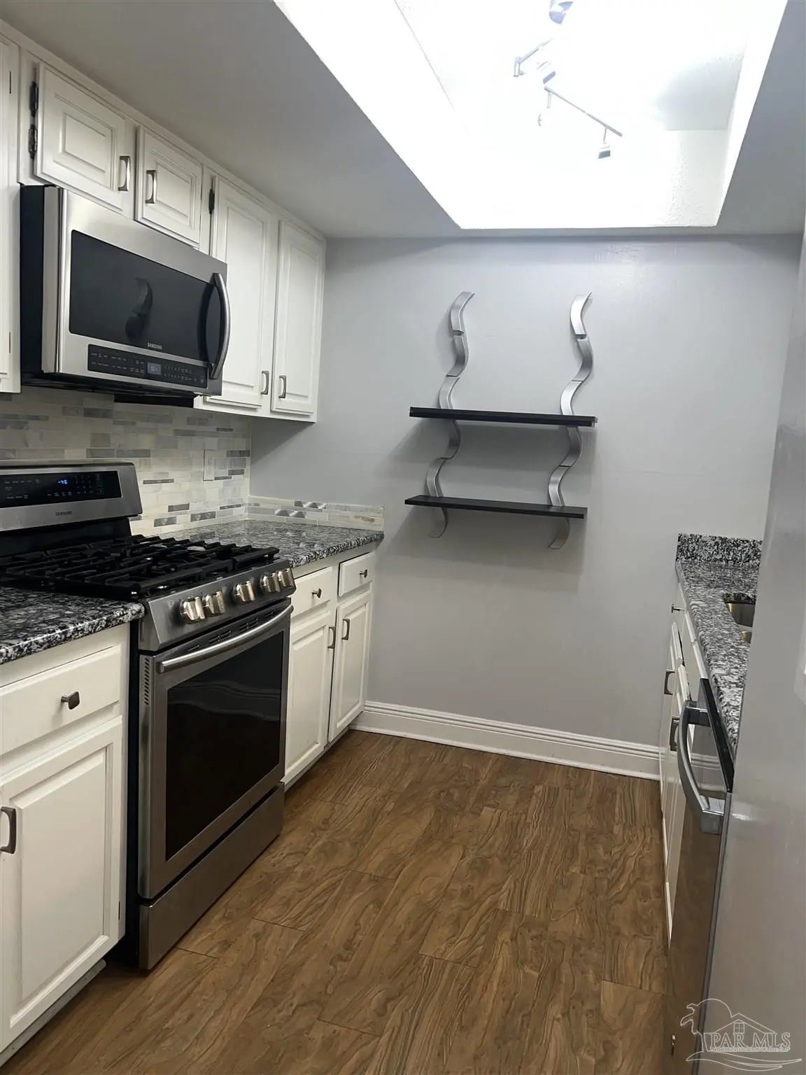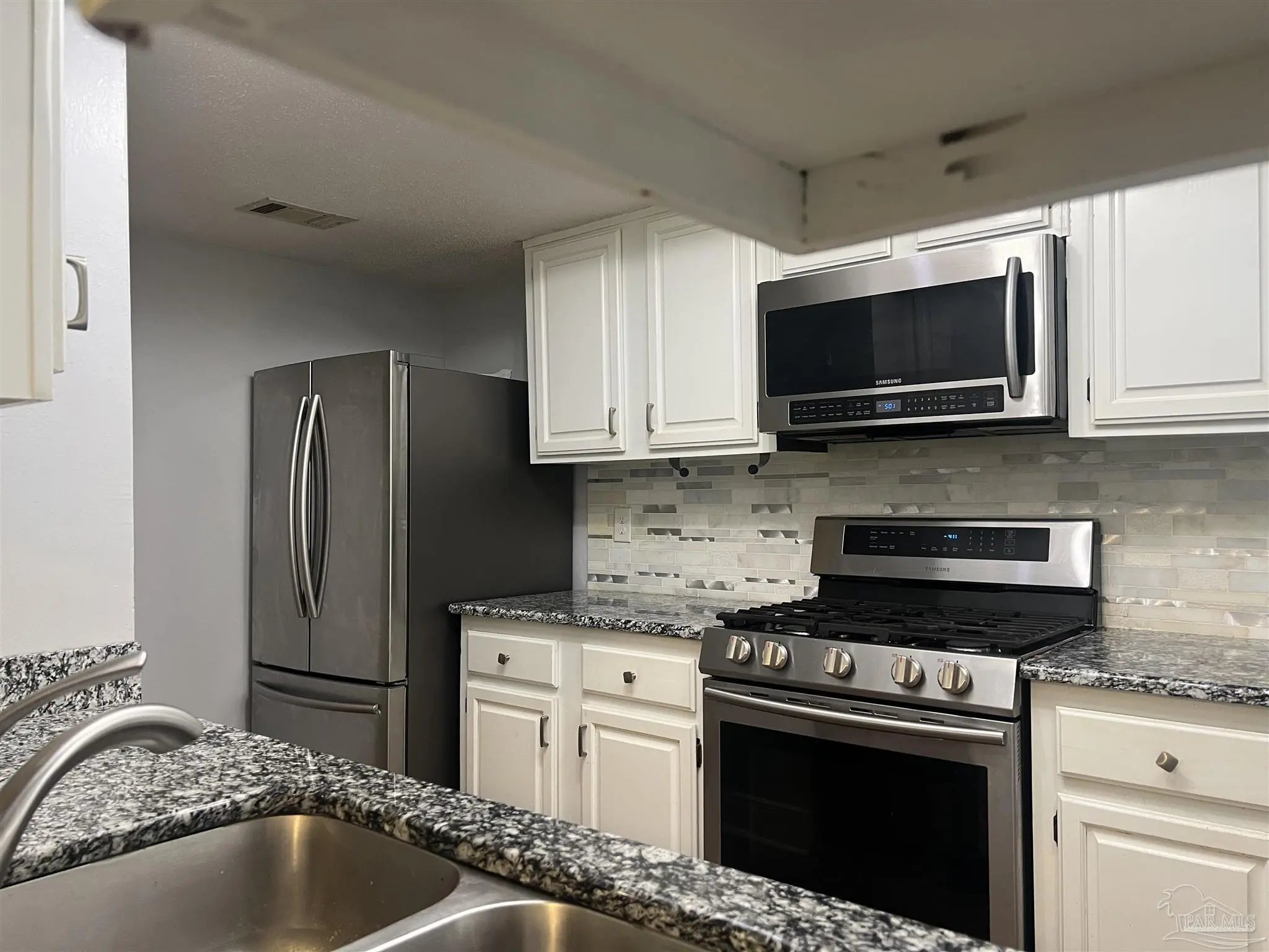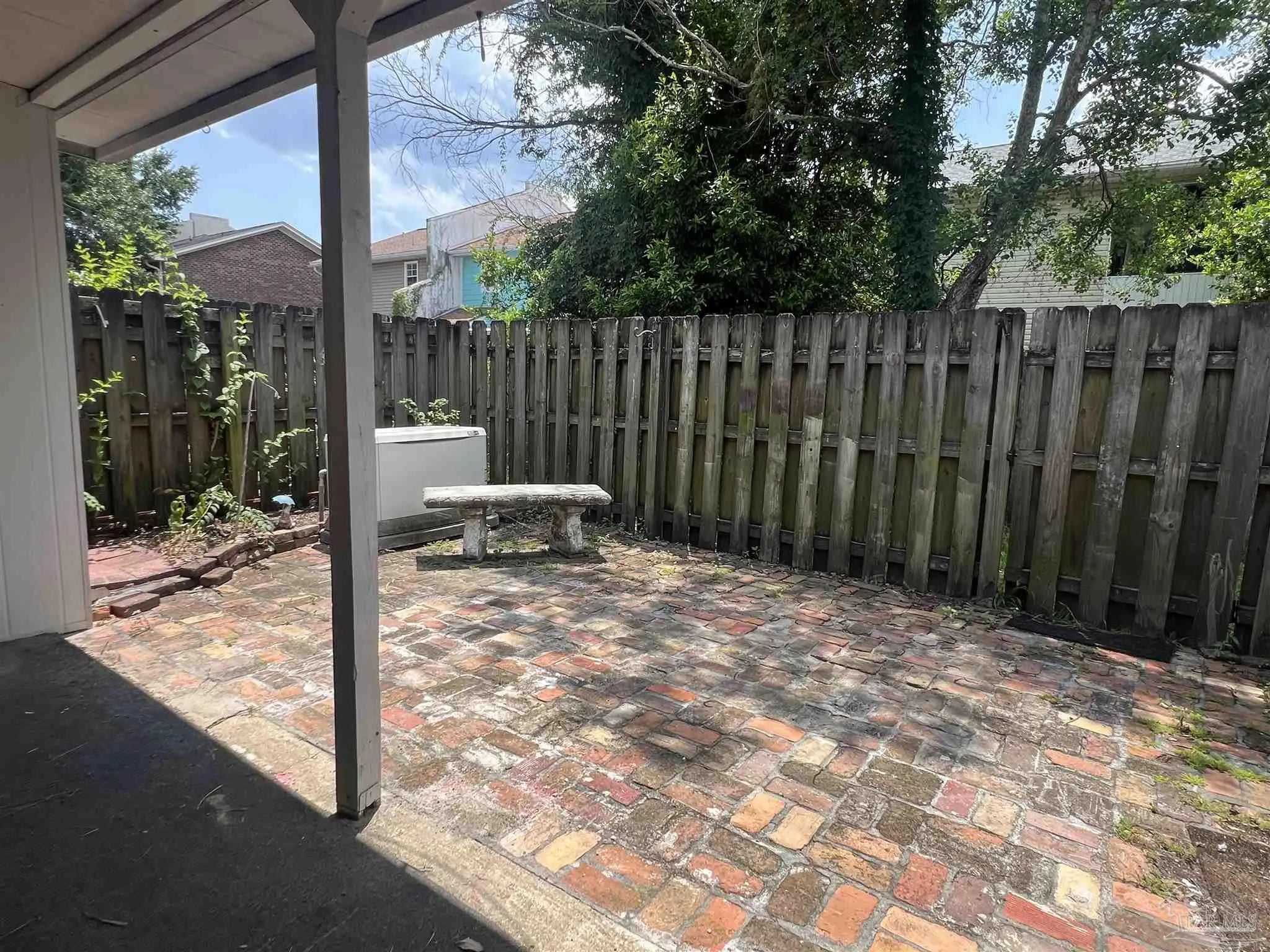 Check out this updated end-unit townhome in NE Pensacola! Convenient to schools, shopping & interstate. Formal living and separate family/dining rooms with wood-like plank flooring. Granite kitchen w/ 5-burner gas range, built-in microwave, ultra-quiet dishwasher, pantry, & fridge with bottom freezer. Powder room/half bath conveniently located downstairs. Large rear family room opens to inside laundry & covered back patio and yard. Upstairs main bedroom has 2 closets & private bath with tile, dual shower heads, glass doors, cultured marble top, & furniture-grade vanity. Two guest BRs with wood-like plank flooring, ceiling fans, & ample closets. Full hall bath with tile & tub/shower combo with easy access to both additional bedrooms. These final amenities round out this home making it a move-in-and-live scenario: Storm door, blackout blinds, double-pane tilt-sash windows, tankless water heater, whole-house Generac generator, covered patio and Chicago brick open patio, privacy-fenced yard, back yard storage building and large gated side yard!