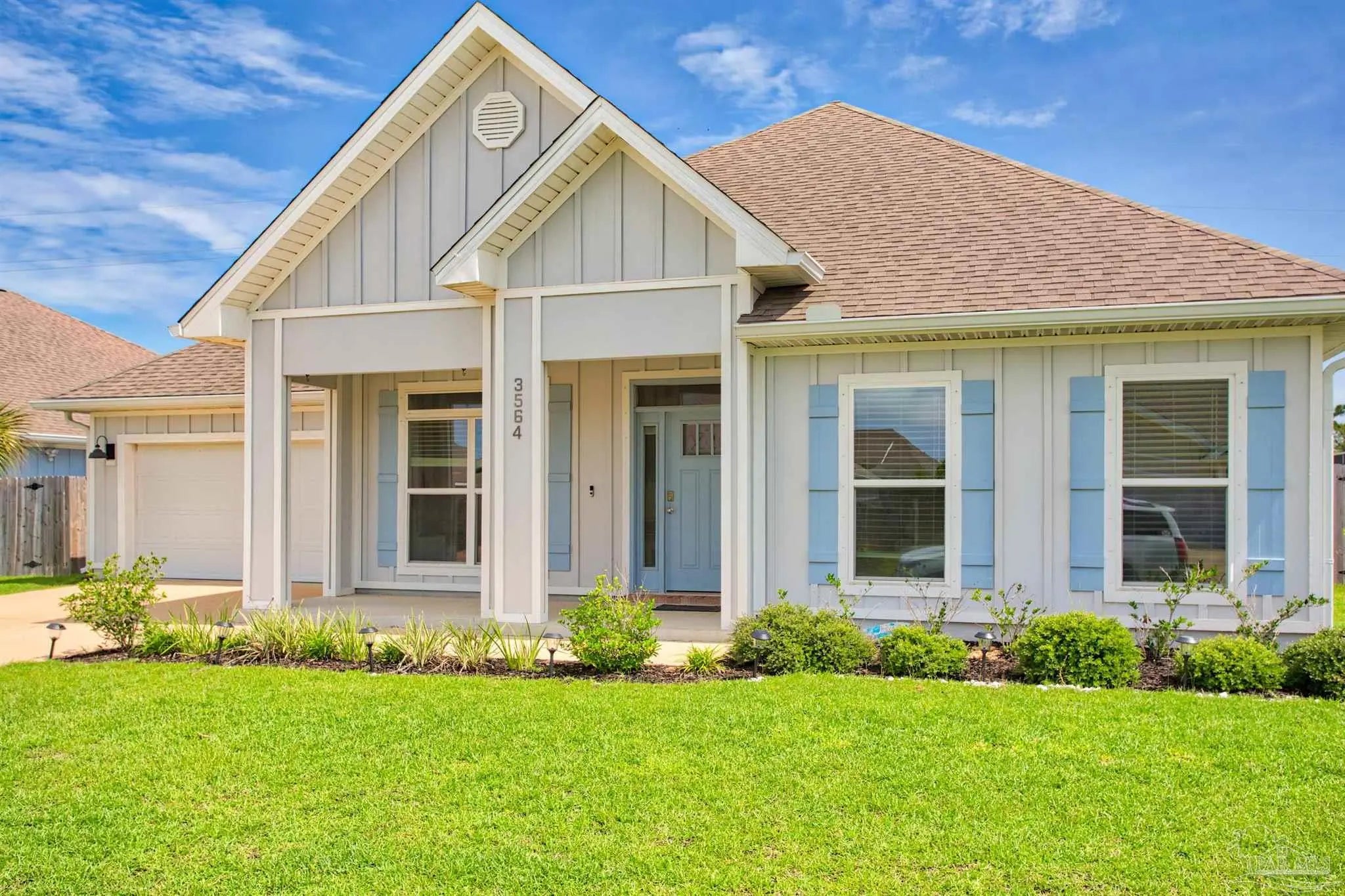 Discover this meticulously upgraded 6-bedroom, 3-bathroom single-story residence in the desirable Sailfish Pointe community. Built in 2021, this home offers over 3,000sqft of living space on a spacious 0.26-acre lot. Situated just minutes from the pristine sands of Pensacola Beach, it combines modern elegance with coastal convenience. Beautifully designed kitchen equipped with granite countertops, a large island, custom tile backsplash, and stainless steel appliances. The open floor plan features high ceilings, recessed lighting, crown molding, and tray ceilings, enhancing the home's airy ambiance. The primary room offers a walk-in closet, double vanity, soaking tub, separate shower, and granite counters. Exterior features include a covered patio-ideal for outdoor dining and entertaining. Fully Fenced Yard: Ensures privacy. Top-Rated Schools-located within the Gulf Breeze school district. Minutes from local shopping centers, dining options, and the public beach. This home seamlessly blends style, comfort, and functionality, making it a perfect choice for those seeking a coastal lifestyle with modern amenities.