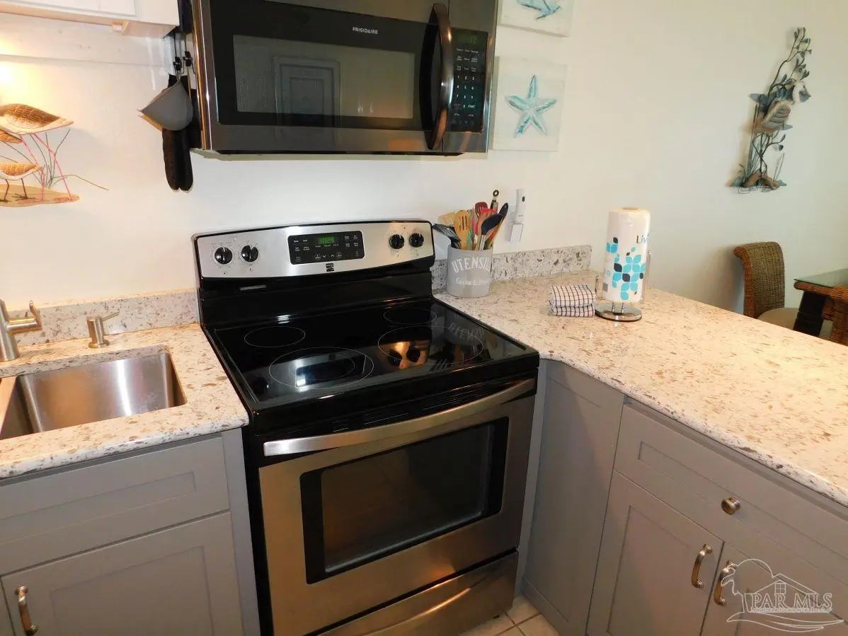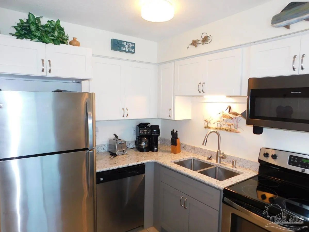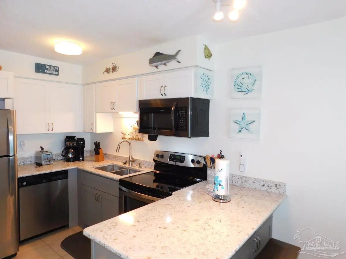 Welcome to this lovely, GULF FRONT condo, with a fantastic view of one of Florida's most gorgeous beaches! Located on beautiful Perdido Key, this tastefully decorated beach hideaway comes completely furnished, and has accommodations for a family of 6! Whether you're looking for a personal retreat to relax and unwind, or an income generating investment property, this one has it all. TURN KEY and ready for you to enjoy, this unit features a new king size bed with nightstands in the master bedroom (2024), bunk beds in the hall (mattresses replaced 2022), new living room furniture, including TV and a double bed sleeper couch (replaced 2022), and a washer & dryer. Plus... a remodeled kitchen, with all new SS appliances, new kitchen cabinets, new granite countertops and new hardware (2021-2022). The private balcony is the perfect spot to sit back with a glass of wine, breathe in the salt air, and enjoy the sweeping view of the sugary sand beach and shimmering waves as they roll into shore. There is so much to love here, with community amenities like a gulf front, heated swimming pool, a private beach walkway with outdoor shower, a fitness room and a community room. And it's conveniently located right across the street from the Villagio Centre, with its popular restaurants and shops. Additional recent upgrades include, new front door and door frame, new windows and slider, new roof, and new pool deck coating. Plus the building exterior has been resurfaced, painted and sealed.