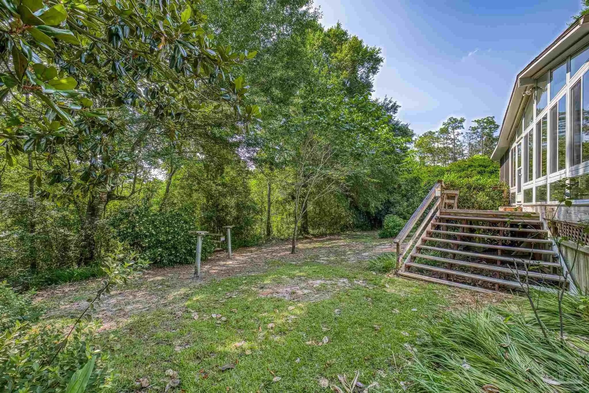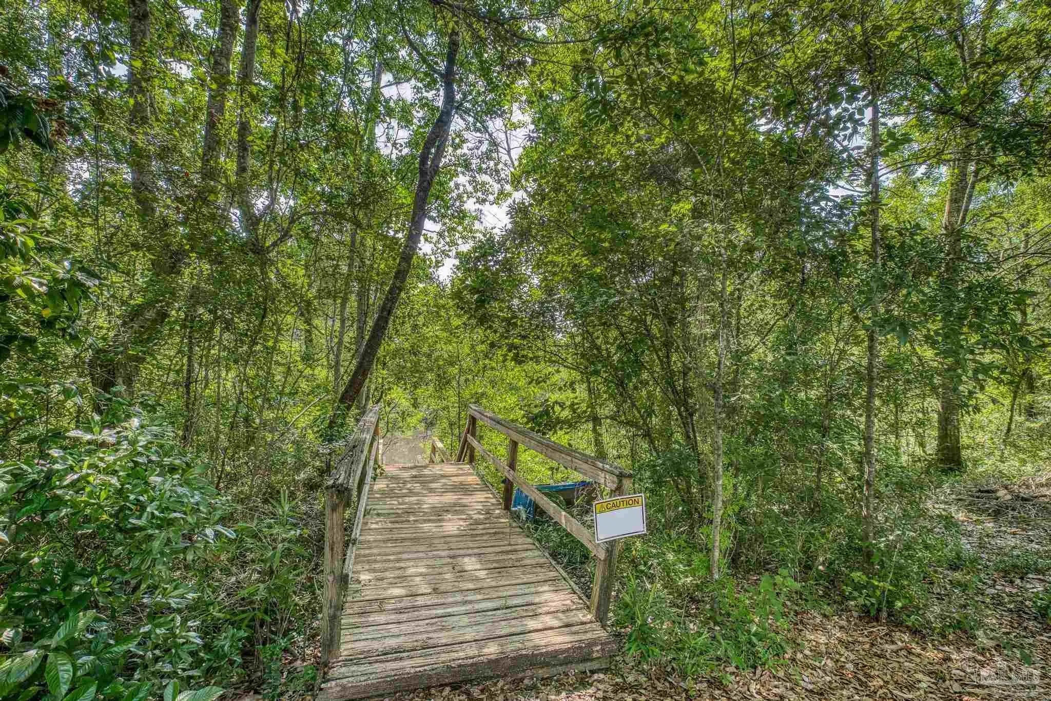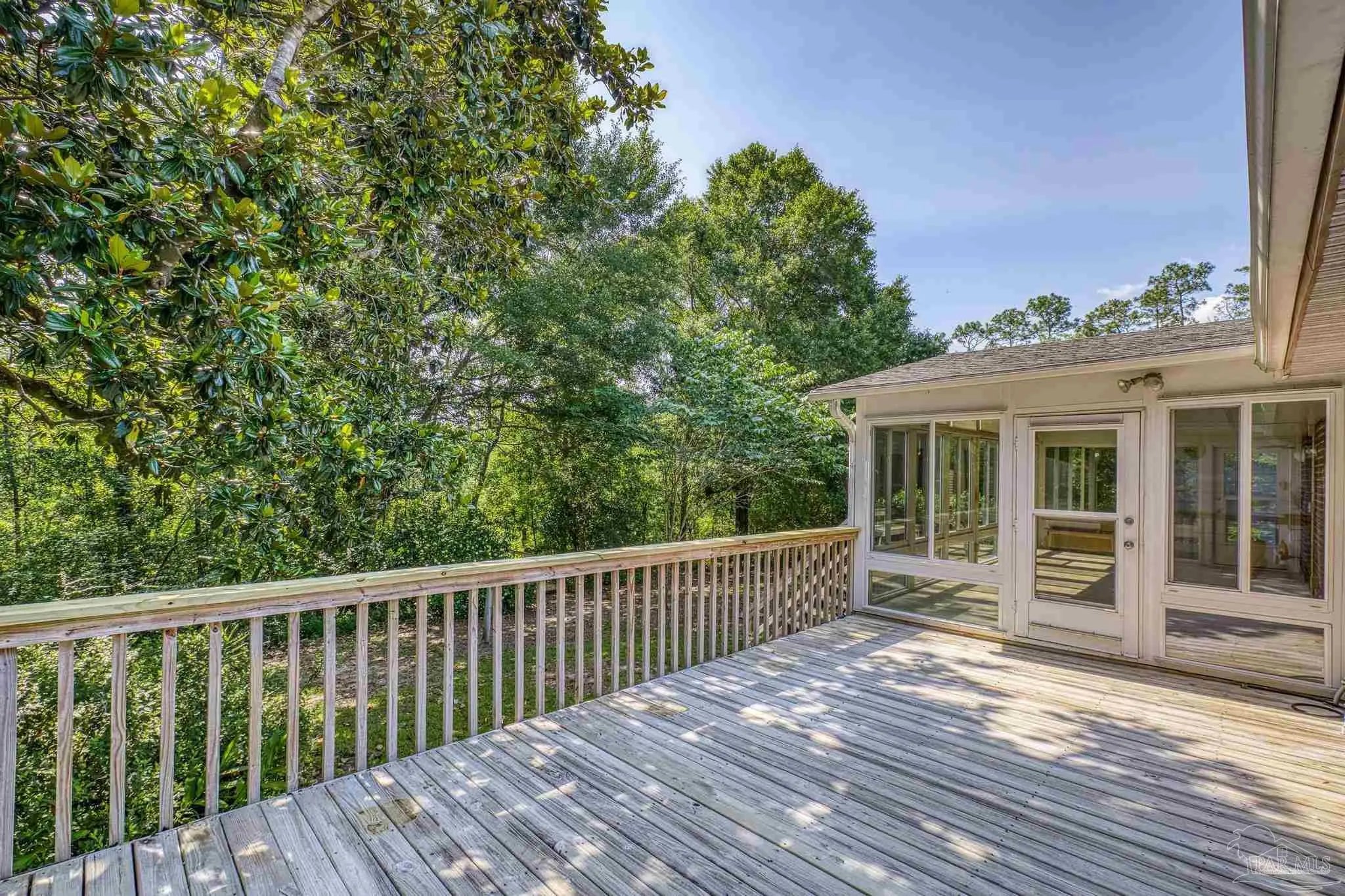 Set on just over an acre of peaceful, tree-lined land, this well-maintained 3-bedroom, 2-bathroom home offers space, privacy, and a functional layout. The split floor plan places the primary suite in its own wing off the kitchen, featuring a large ensuite with double vanities, a standing shower, custom-shelved walk-in closet, and sliding glass doors that open to a wooden deck overlooking the trees—fantastic for bird watching. Two additional bedrooms on the opposite side of the home share a full jack-and-jill bath and offer large closets. The semi-open kitchen includes a cozy breakfast nook with a wet bar and connects to a spacious living area with high ceilings. Double doors lead to a bright sunroom with its own mini-split A/C, providing year-round comfort and backyard views. At the rear of the lot, a manmade pond with a wooden walkway and small deck creates a tranquil spot for nature watching. A sprinkler system pulls from the pond to keep the landscape lush. The home features an attached two-car garage plus a detached garage ideal as a workshop or studio. Additional highlights include a whole-home generator (recently serviced and covered through 2025), a new water heater installed in 2024, septic with lift station, functional kitchen appliances, and freshly deep-cleaned carpets. This property combines comfort, practicality, and serene outdoor living—all in a private, natural setting.