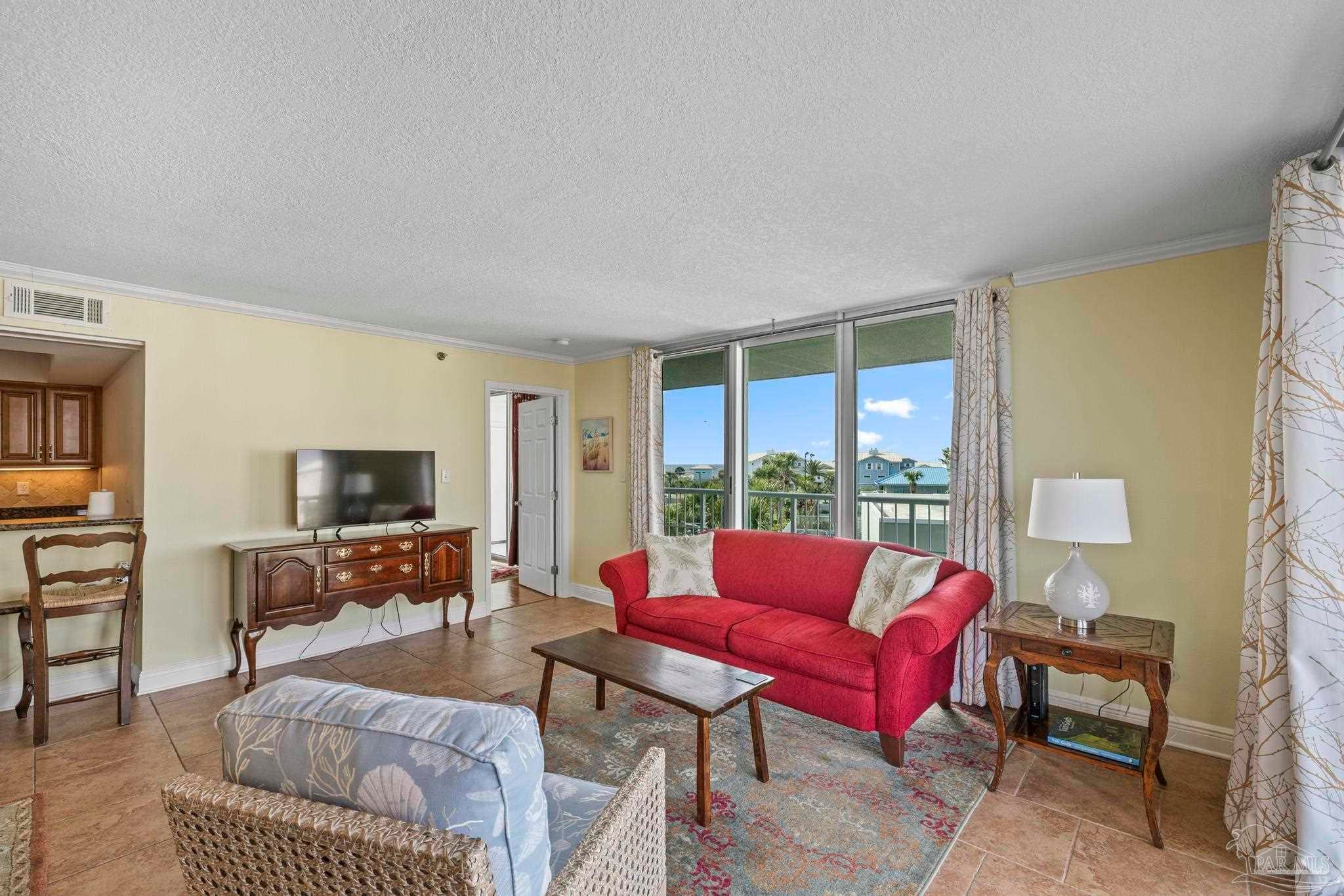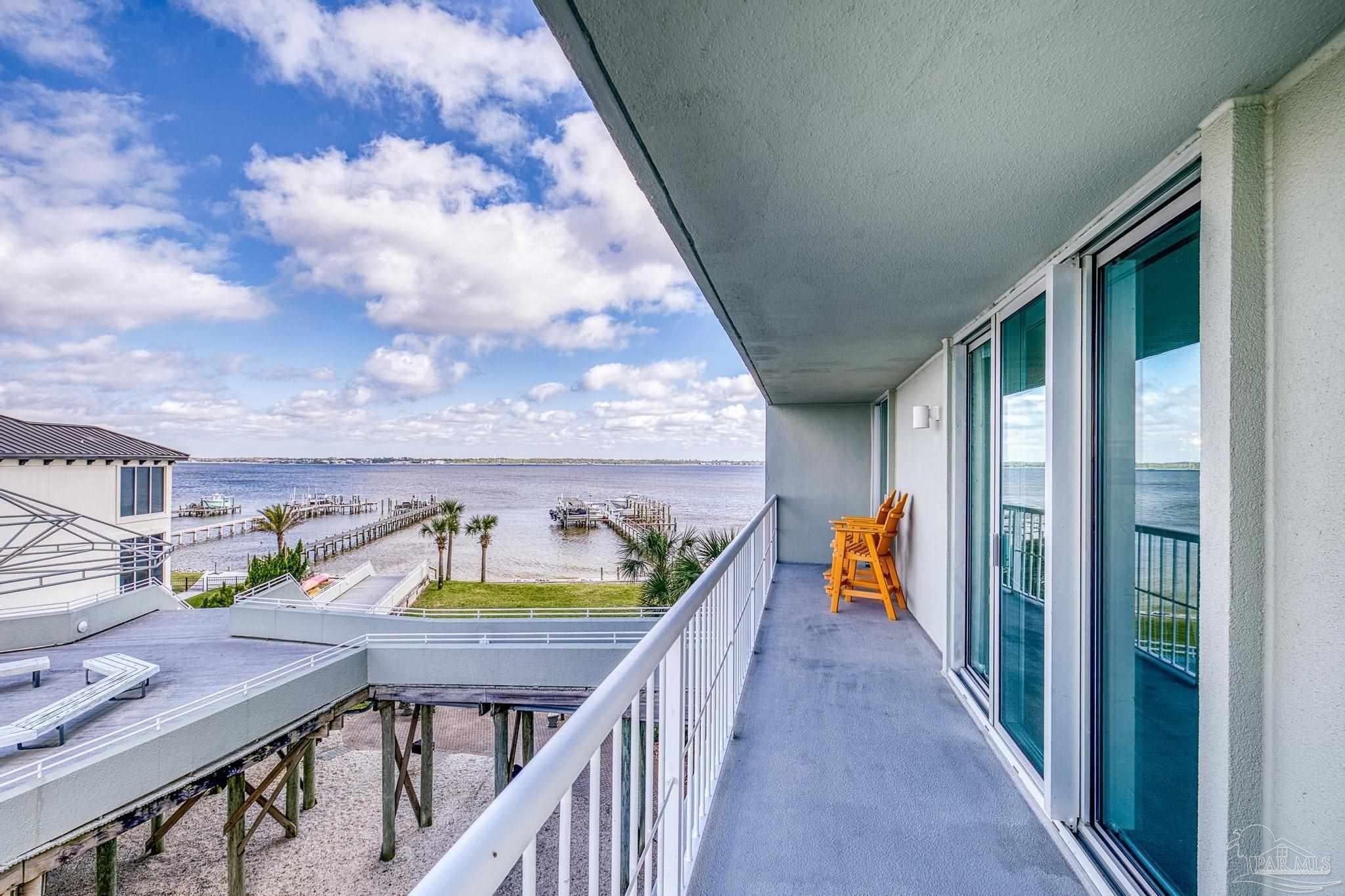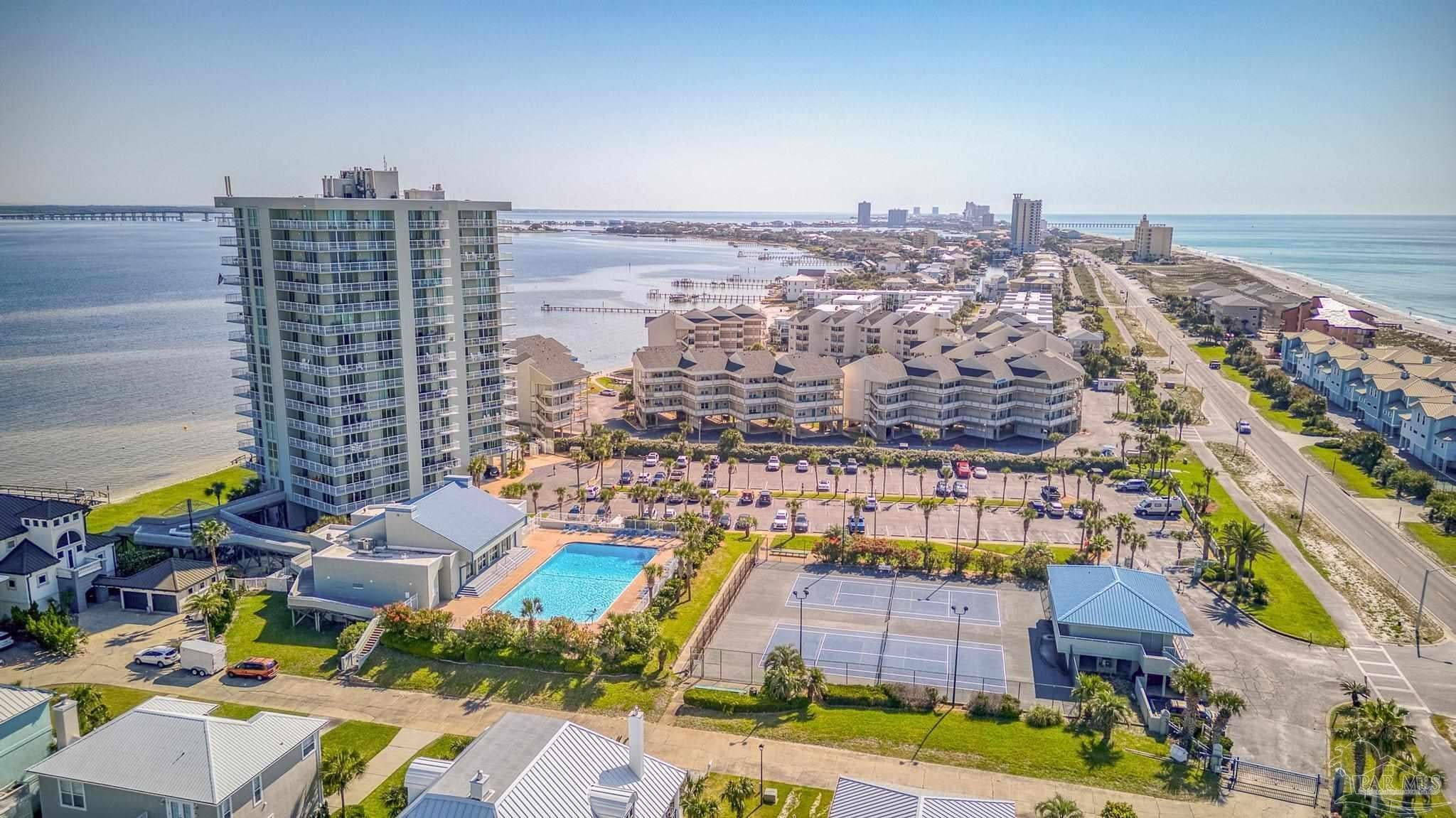 Experience the beauty of Pensacola Beach from this stunning 2-bedroom, 2-bath corner unit in the highly sought-after Tristan Towers. Located just steps from the sugar-white sands and calm waters of the Gulf, this beautifully renovated condo offers breathtaking views of Santa Rosa Sound and a glimpse of the Gulf of Mexico. Floor-to-ceiling sliding glass doors open to a spacious wrap-around balcony—perfect for enjoying coastal breezes and sunsets. This condo features a modern kitchen with granite countertops, ample cabinetry, and stainless steel appliances. The large master suite boasts bamboo wood flooring, balcony access with Gulf views, a walk-through closet with built-ins. HVAC system (2017), water heater, and in-unit washer/dryer (2019).Tristan Towers is a gated community offering exceptional amenities: a waterfront pool, tennis courts, fitness center, clubhouse, and a private fishing pier. Whether you're looking for a full-time residence, a vacation getaway, or a strong investment opportunity, this property checks all the boxes. Don’t miss your chance to own a slice of paradise on Pensacola Beach!