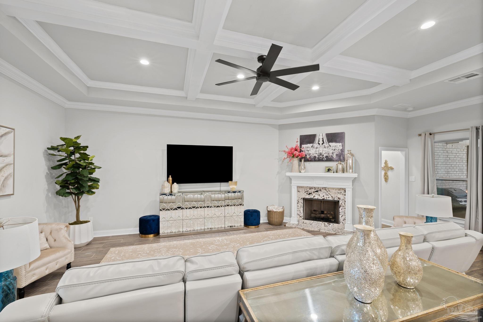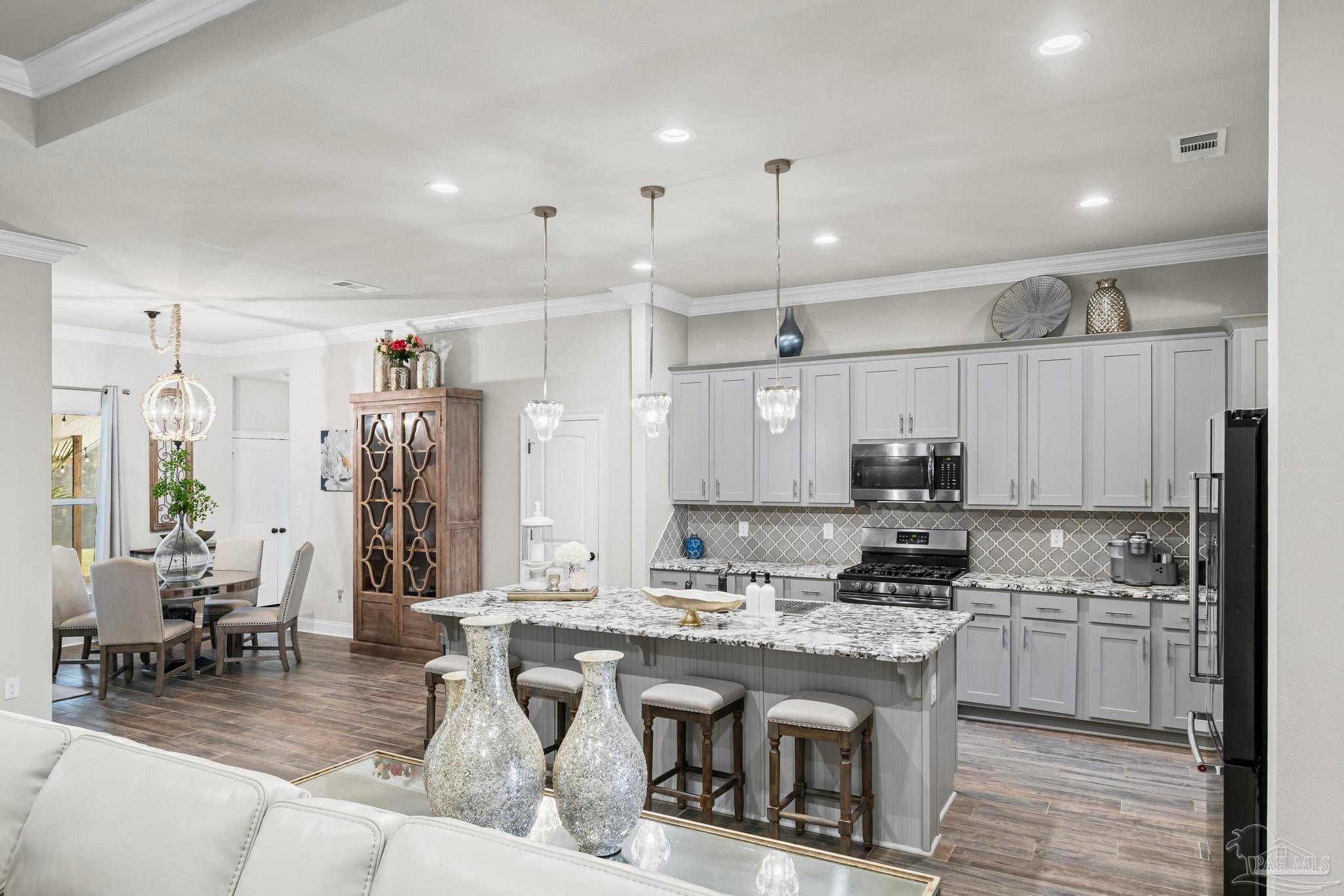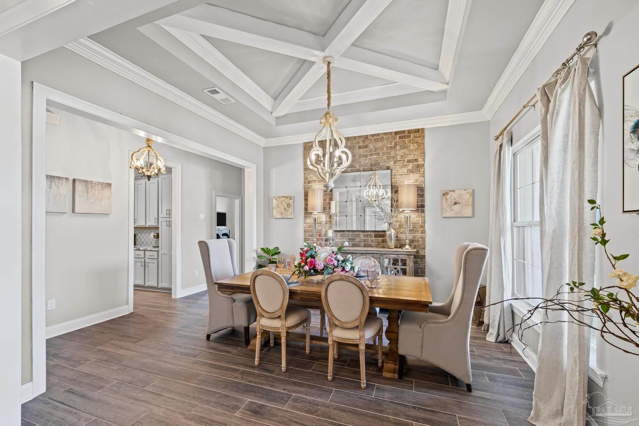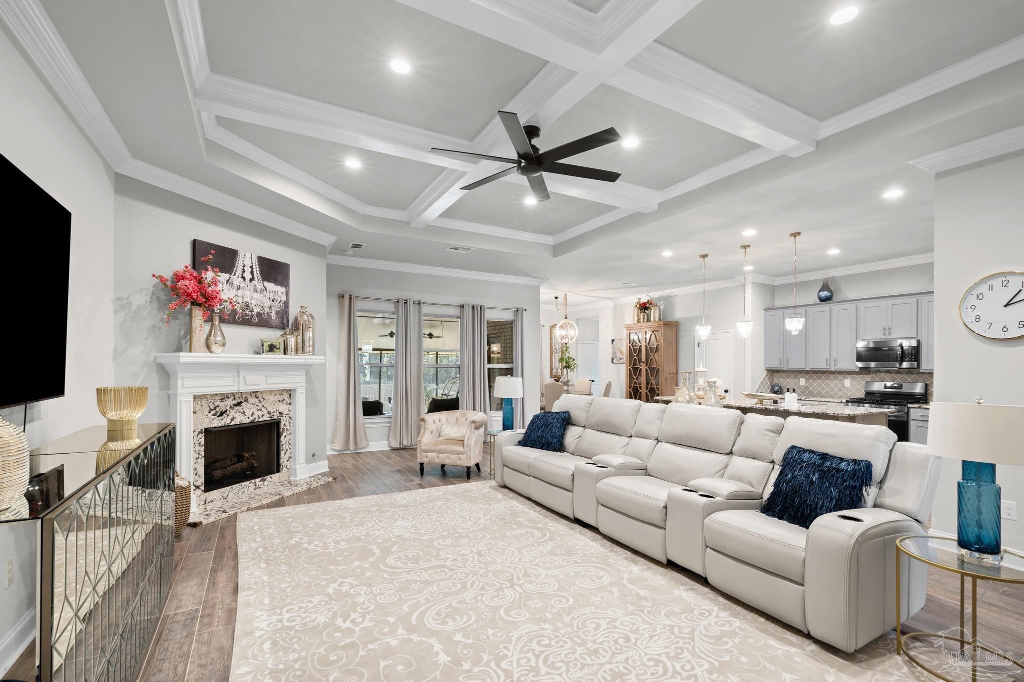 Discover this move-in ready home for sale in the sunny Panhandle of Florida, offering 4 bedrooms, 3 full bathrooms, and over 3,000 square feet of living space. Built in 2019, this modern home is located just 10 minutes from Navy Federal Credit Union's main campuses, and 5 minutes from 9 Mile Road where you can find an abundance of shopping, medical facilities and more. The exterior combines brick and stucco with seamless gutters and a $10,000 professional landscaping upgrade, creating excellent curb appeal. A covered front porch welcomes you inside, while the screened-in sunroom with wood accents, ceiling fans, and full electrical is perfect for entertaining, relaxing, or game day gatherings. Inside is donned with upscale finishes. The open-concept floor plan includes a formal dining room, a versatile flex room for a home office or gym, and a heated and air-conditioned oversized 2-car garage with painted floor—ideal for storage, a workshop, or year-round use. The kitchen is a chef’s dream with a granite island, bar seating, stainless steel appliances, soft-close cabinets, and a 5-burner gas range. Crown molding, tray ceilings, and recessed lighting add elegance throughout. The split layout offers three guest bedrooms and two full baths, including a Jack and Jill bathroom. The primary suite boasts a sitting area, walk-in closet with laundry access, and a spa-like bathroom with double vanities, soaking tub, and tiled walk-in shower. This luxurious 4-bedroom home for sale combines style, space, and modern upgrades—perfect for today’s lifestyle.