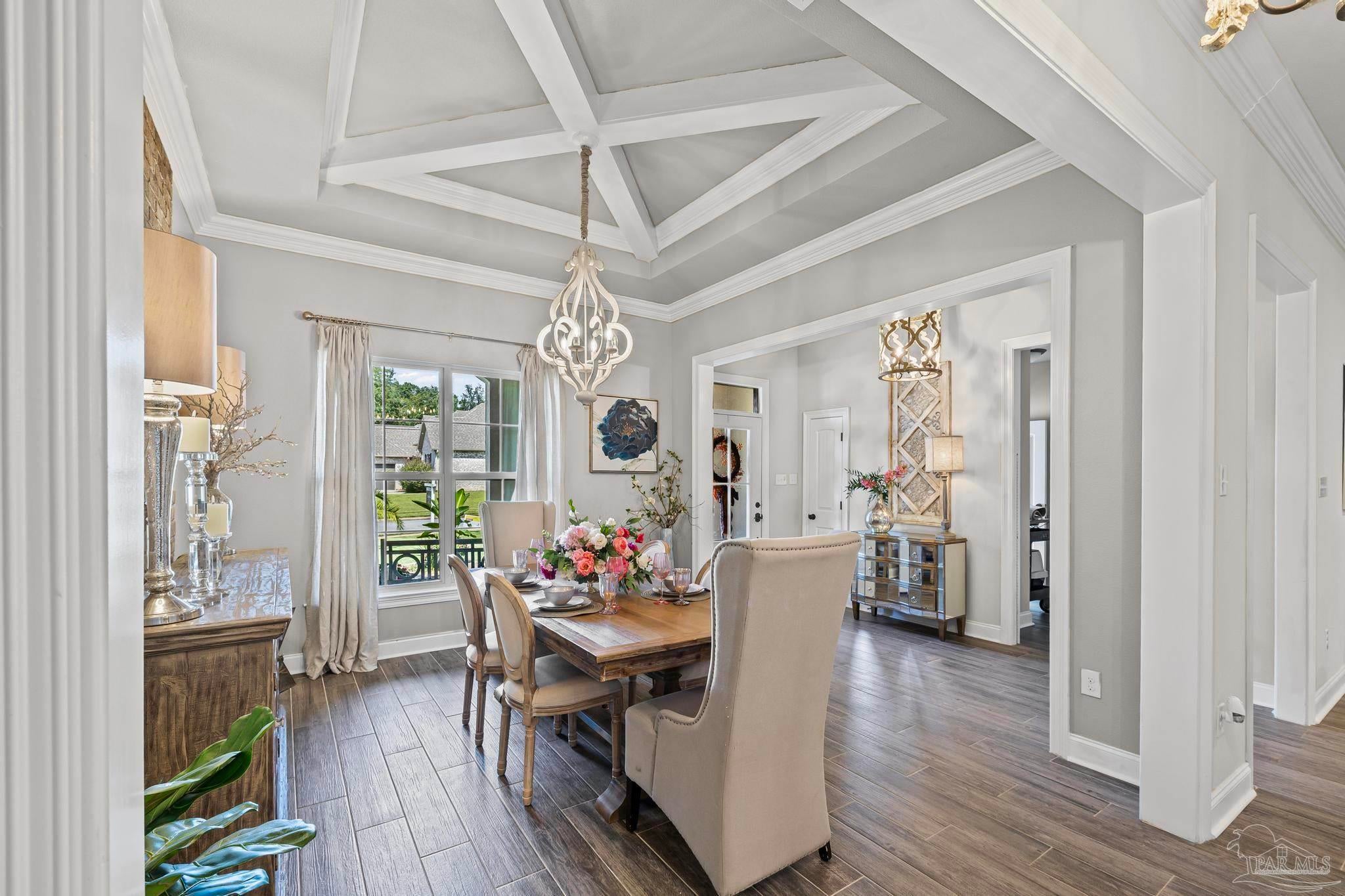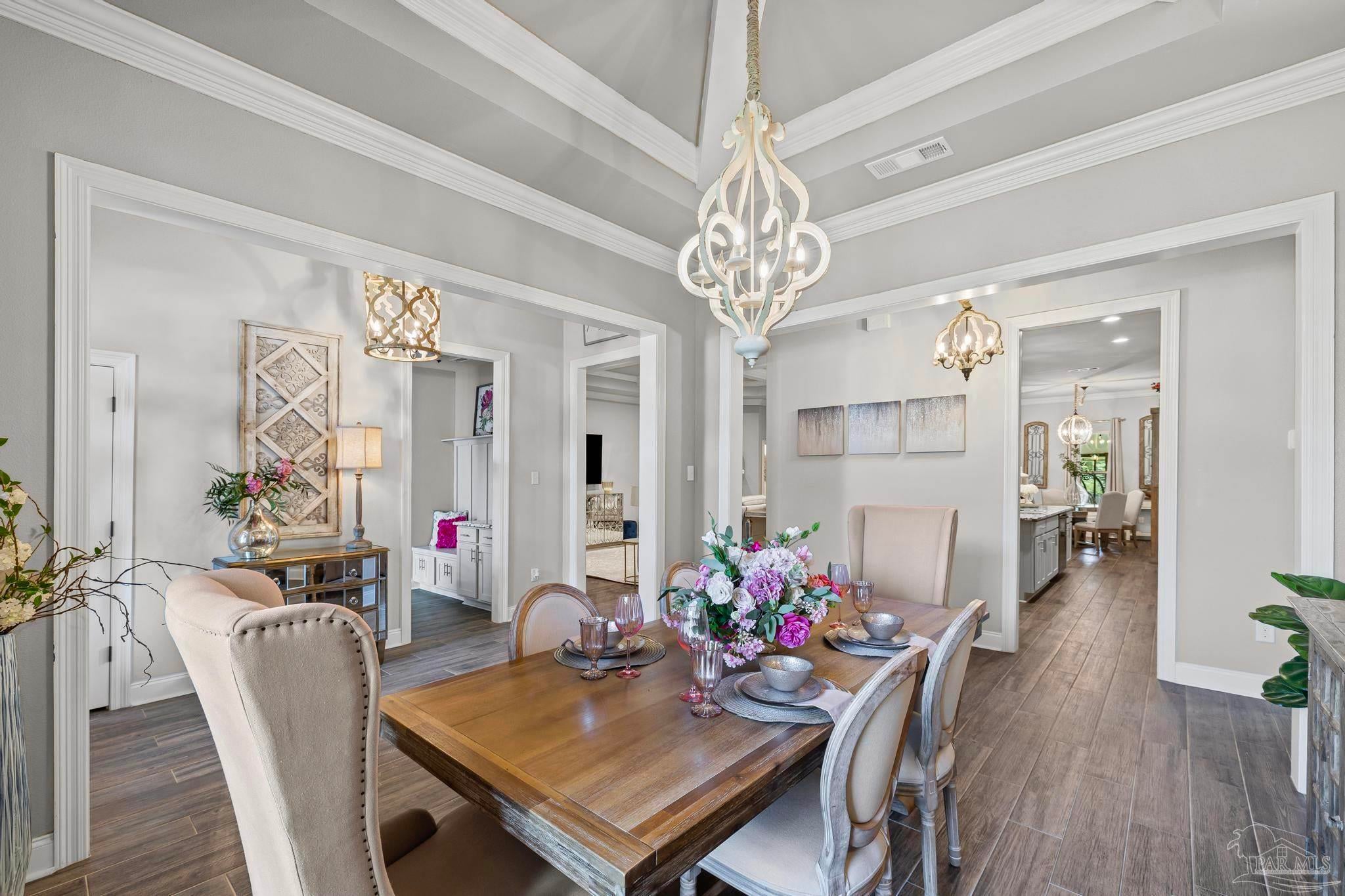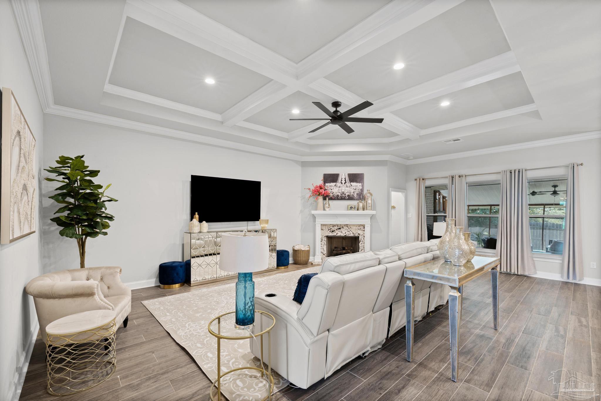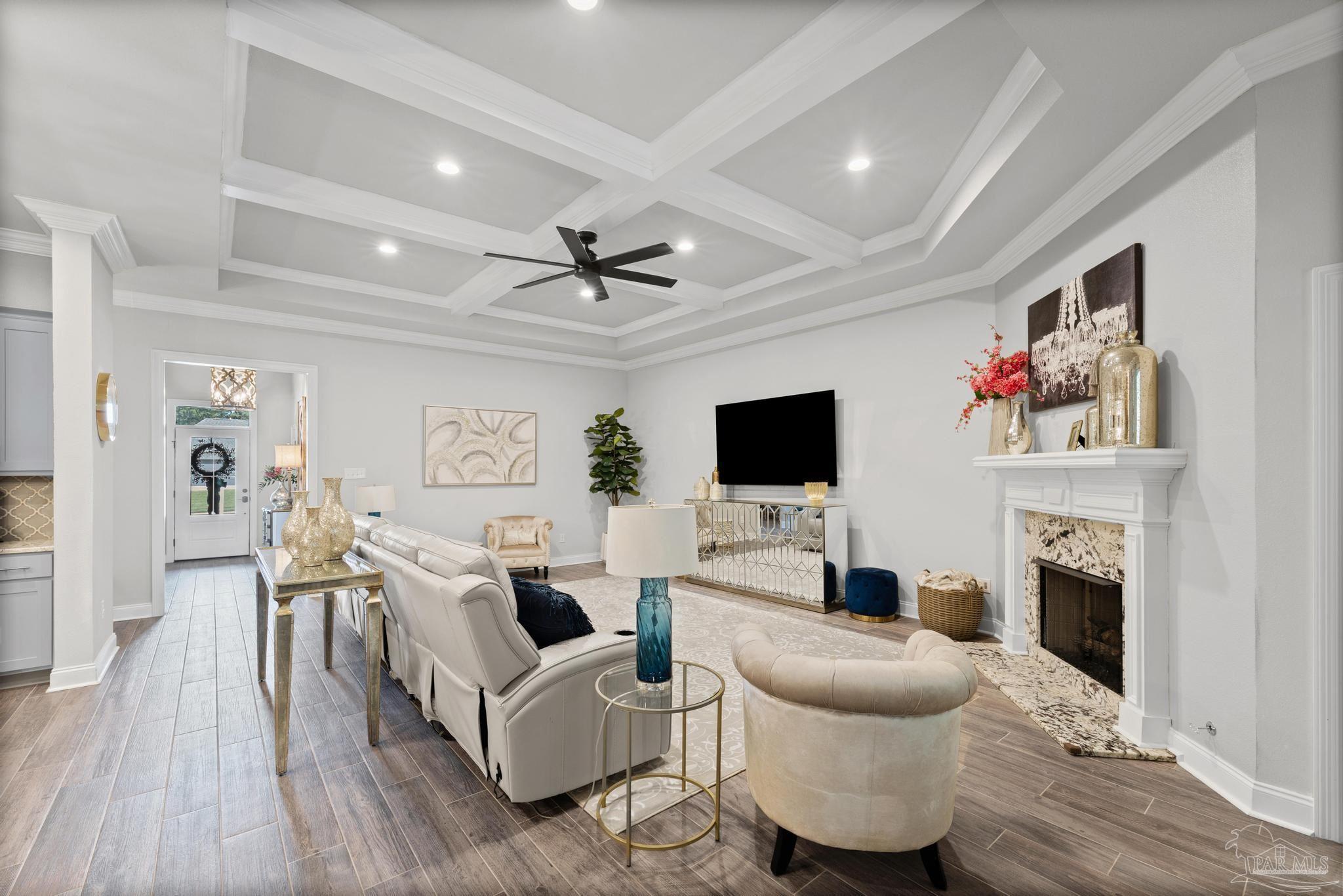 Discover this move-in ready home for sale in the sunny Panhandle of Florida, offering 4 bedrooms, 3 full bathrooms, and over 3,000 square feet of living space. Built in 2019, this modern home is located just 10 minutes from Navy Federal Credit Union's main campuses, and 5 minutes from 9 Mile Road where you can find an abundance of shopping, medical facilities and more. The exterior combines brick and stucco with seamless gutters and a $10,000 professional landscaping upgrade, creating excellent curb appeal. A covered front porch welcomes you inside, while the screened-in sunroom with wood accents, ceiling fans, and full electrical is perfect for entertaining, relaxing, or game day gatherings. Inside is donned with upscale finishes. The open-concept floor plan includes a formal dining room, a versatile flex room for a home office or gym, and a heated and air-conditioned oversized 2-car garage with painted floor—ideal for storage, a workshop, or year-round use. The kitchen is a chef’s dream with a granite island, bar seating, stainless steel appliances, soft-close cabinets, and a 5-burner gas range. Crown molding, tray ceilings, and recessed lighting add elegance throughout. The split layout offers three guest bedrooms and two full baths, including a Jack and Jill bathroom. The primary suite boasts a sitting area, walk-in closet with laundry access, and a spa-like bathroom with double vanities, soaking tub, and tiled walk-in shower. This luxurious 4-bedroom home for sale combines style, space, and modern upgrades—perfect for today’s lifestyle.