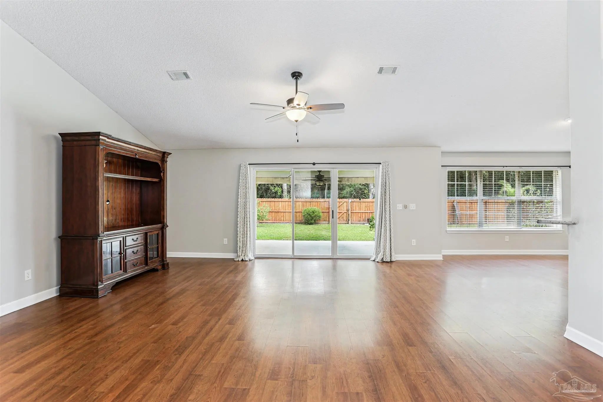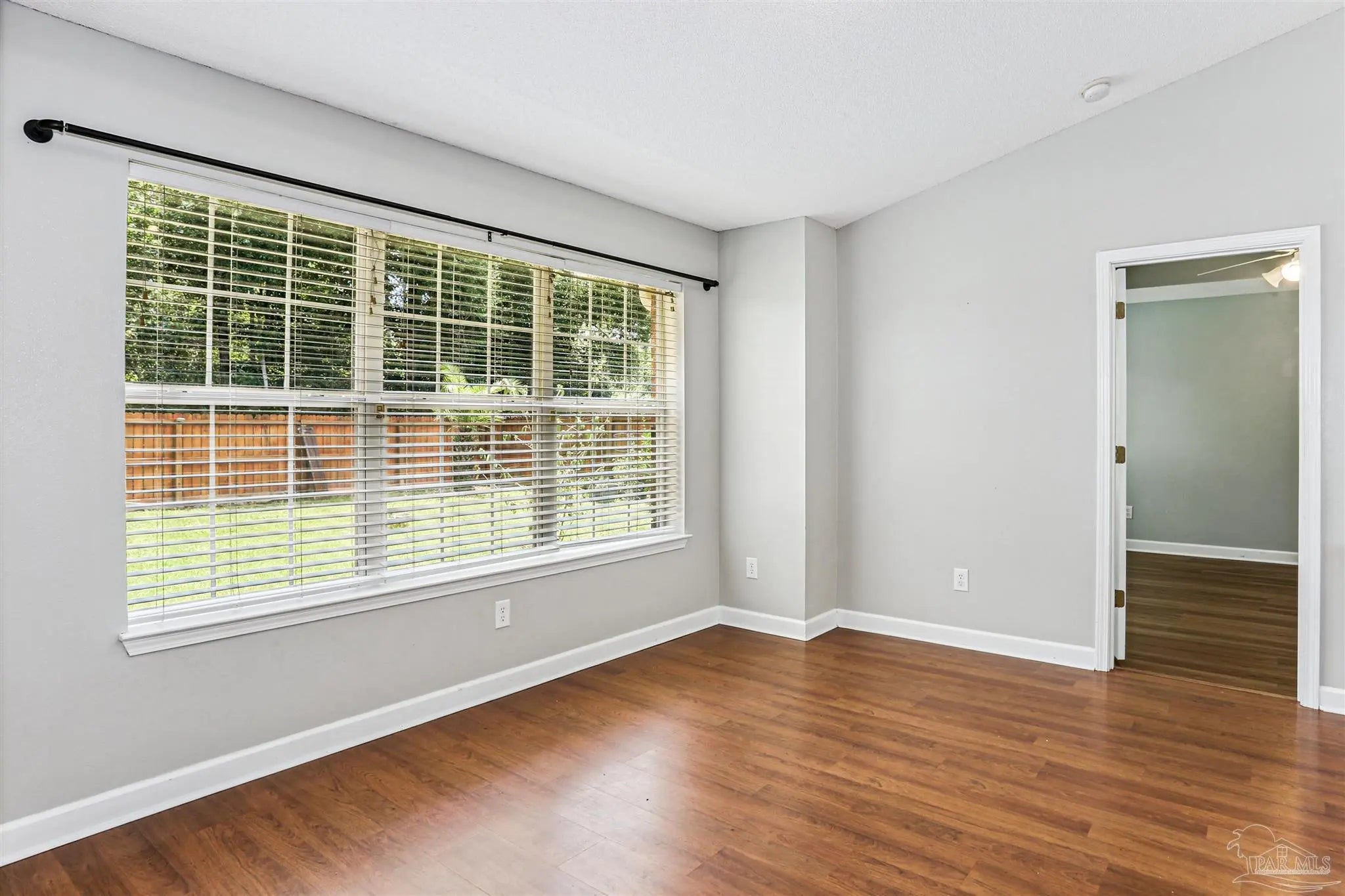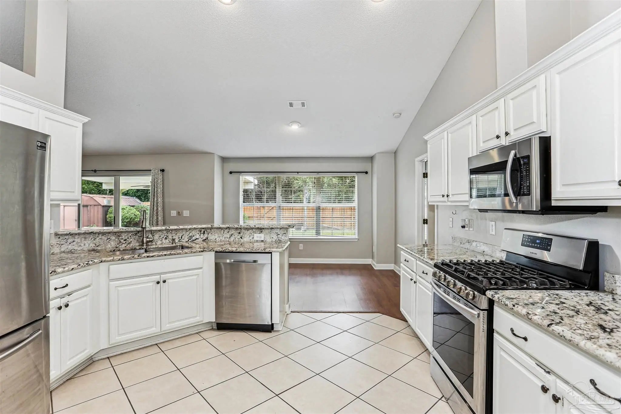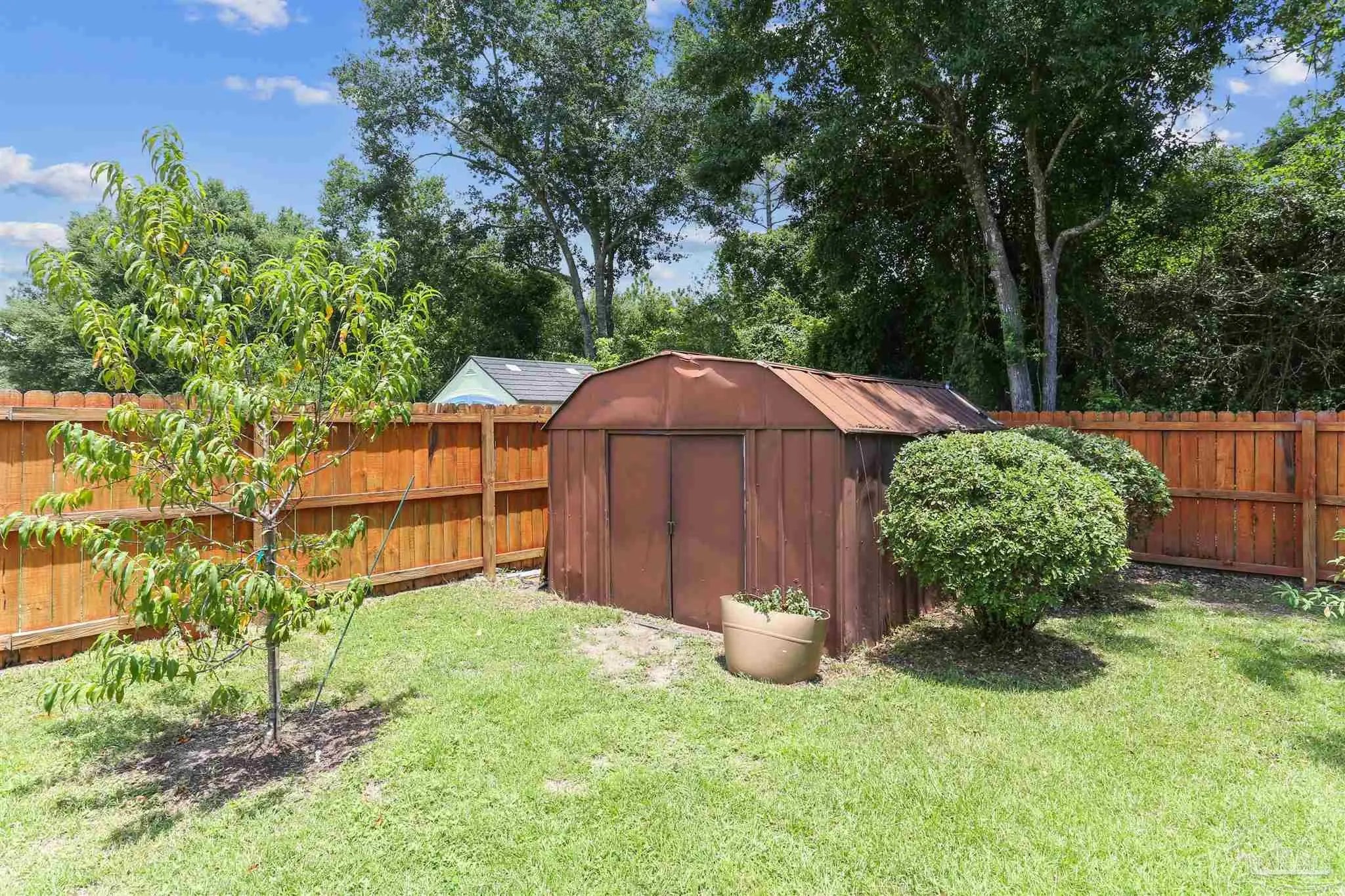 OPEN HOUSE SATURDAY DECEMBER 20, 1:00-3:00 PM This spacious 4-bedroom, 2-bathroom home is located in a highly desirable area on the west side of Pensacola, just minutes from the beaches, NAS Military Base, state parks, shopping, schools, and convenient boat launches at Perdido Bay and Lillian. With 2,100 square feet of living space on a .26-acre lot, this home features an open floor plan with soaring cathedral ceilings and a split-bedroom layout for added privacy. The formal dining room can easily be converted into a home office, while the eat-in kitchen offers a breakfast nook, breakfast bar, granite countertops, and white cabinetry. Flooring includes wood laminate throughout the main living areas, tile in the kitchen, laundry, and bathrooms, and brand-new luxury vinyl plank flooring in all bedrooms (2025), a $10,000 upgrade. Laundry Room inside Washer and Dryer Convey. Additional Refrigerator in Garage Conveys. The spacious master suite boasts high ceilings, two walk-in closets, a garden tub, separate shower, and a double vanity with elevated granite counters. Natural light pours in through sky tube lighting in both the kitchen and master bath. Enjoy outdoor living on the large covered patio overlooking a private, wooded backyard with no rear neighbors, a privacy fence and shed. Additional features include 2x6 exterior walls, gutters, ¾-inch plywood flooring in the attic for extra storage, and no HOA. Major updates include a 3.5-ton TRANE XR 16 SEER high-efficiency HVAC system installed in 2023 ($11,100), a WiFi-enabled garage door opener, and a freshly pressure-washed exterior (2025). Includes Fabric Shield storm protection product for all windows. With just a few cosmetic updates, this residence can truly shine as your next Home Sweet Home. This home offers comfort, convenience, and value in a fantastic location!