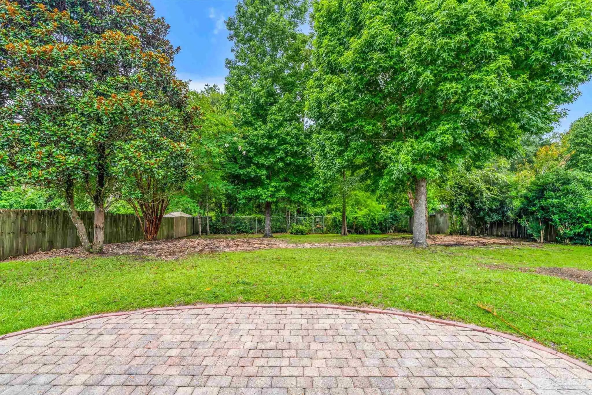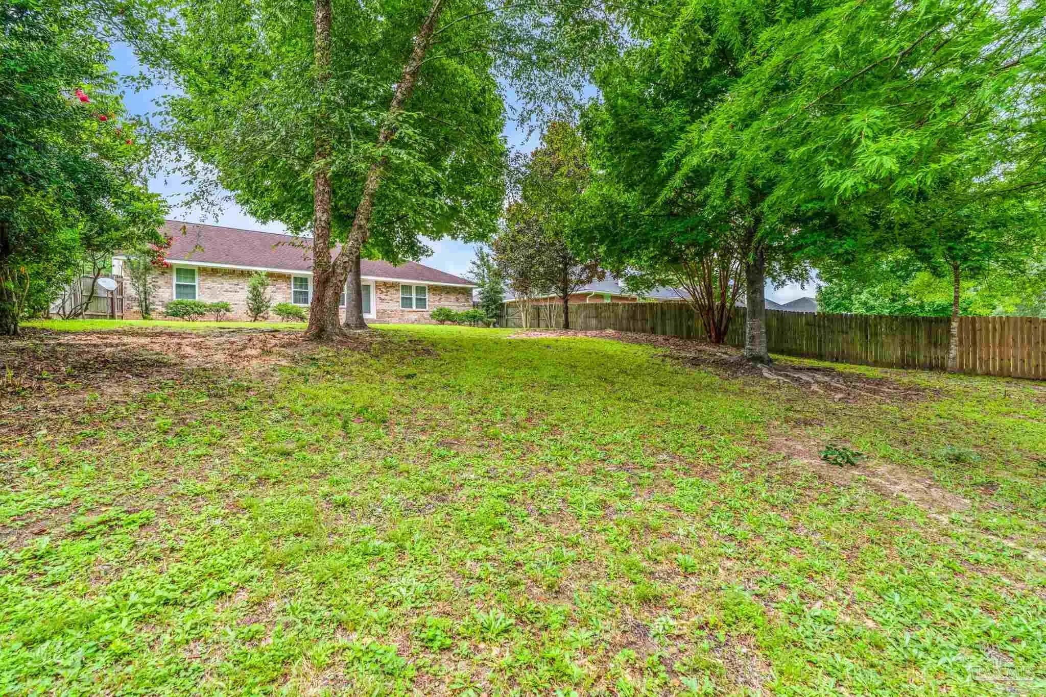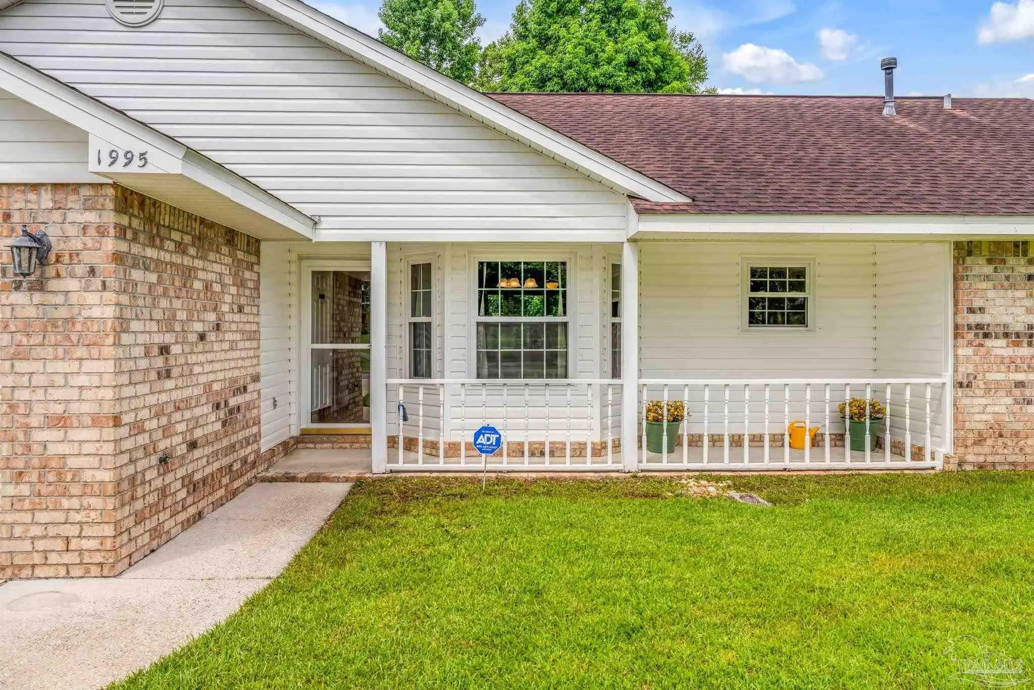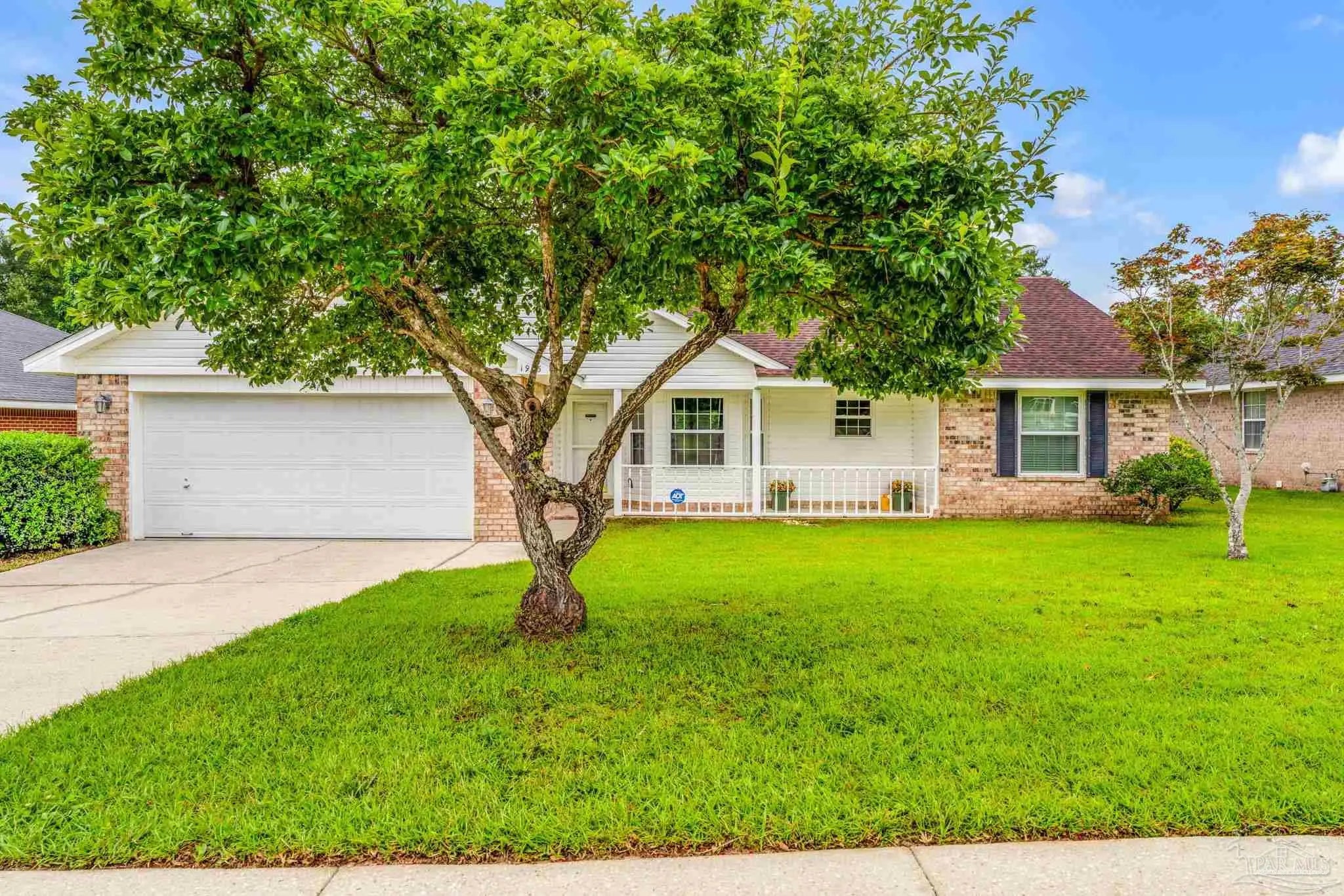 This well-maintained home is nestled in an established, quiet neighborhood in a popular and growing area known for its good schools and sense of community. Backing up to a peaceful greenbelt, this property offers privacy and a connection to nature while still being close to everyday conveniences. The inviting front porch gives this home a warm welcome. Inside, you’ll find a practical and open floor plan, newly painted and sparkling clean. The kitchen features crisp white cabinetry, a bay window breakfast nook, and a large breakfast bar that opens to the family room. Triple windows in the living area fill the space with natural light and create a cheerful atmosphere. The split bedroom layout offers privacy, with the primary suite on one side featuring a double vanity and spacious walk-in closet. Two additional bedrooms and a full guest bath are located on the opposite side of the home. Oversized ceramic tile runs throughout — no carpet — making it easy to maintain. Out back, enjoy the tranquil setting from your brick paver patio, overlooking the large yard and greenbelt. The lot has never flooded and offers plenty of room to relax or play. This charming, move-in-ready home is a great opportunity to own in a desirable location. Schedule your private showing today! 7 Min to NFCU campus. 23 min to downtown Pensacola. 26 to the PNS airport. 2024 double-pane windows (w/life-time warranty) with fabric shields from Window World. New garage door opener in 2025. New electrical panel in 2002. New Roof to be installed prior to closing. Buyer can choose the shingle color. HVAC 2017. Gas Water Heater 2002.