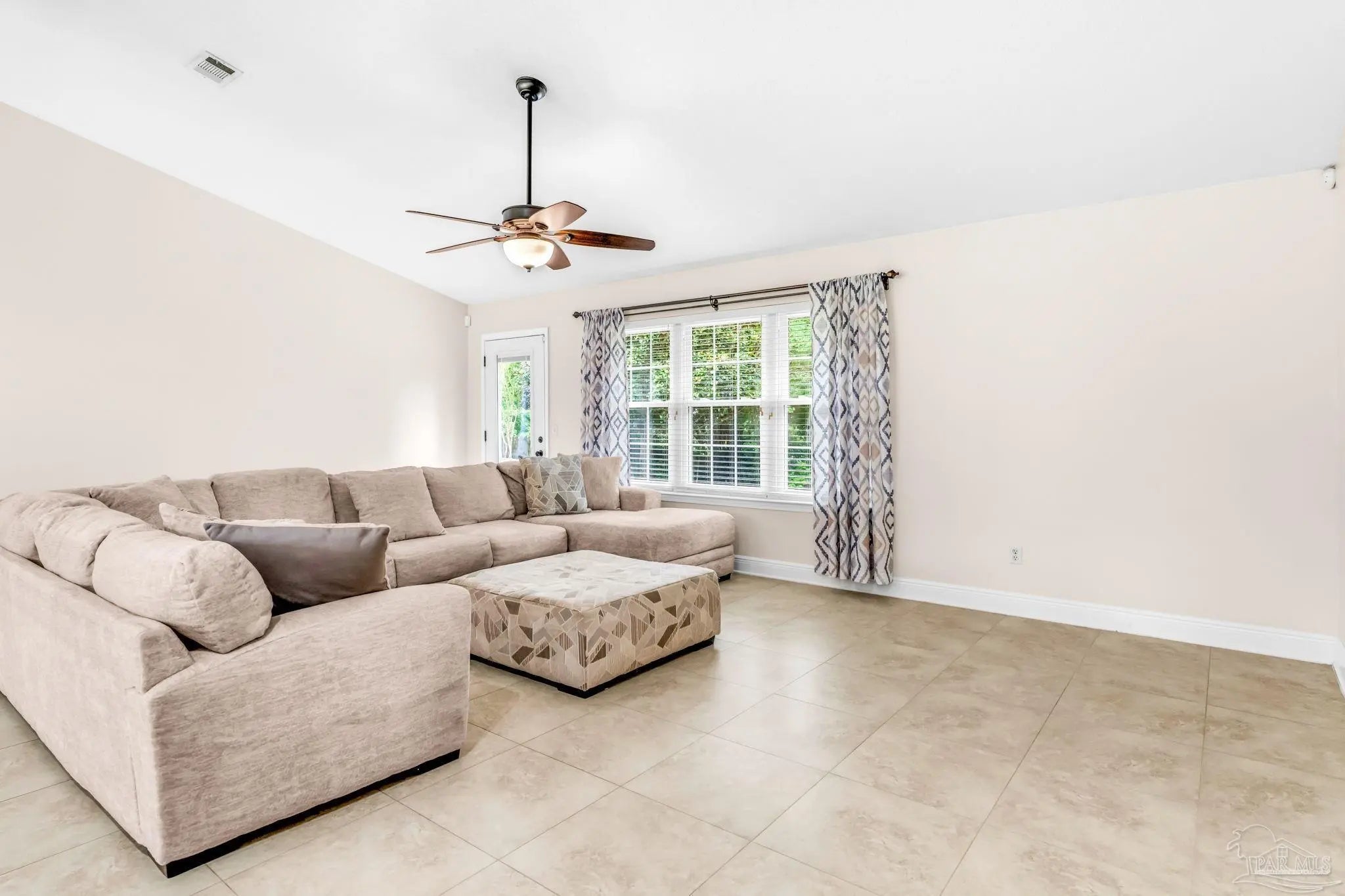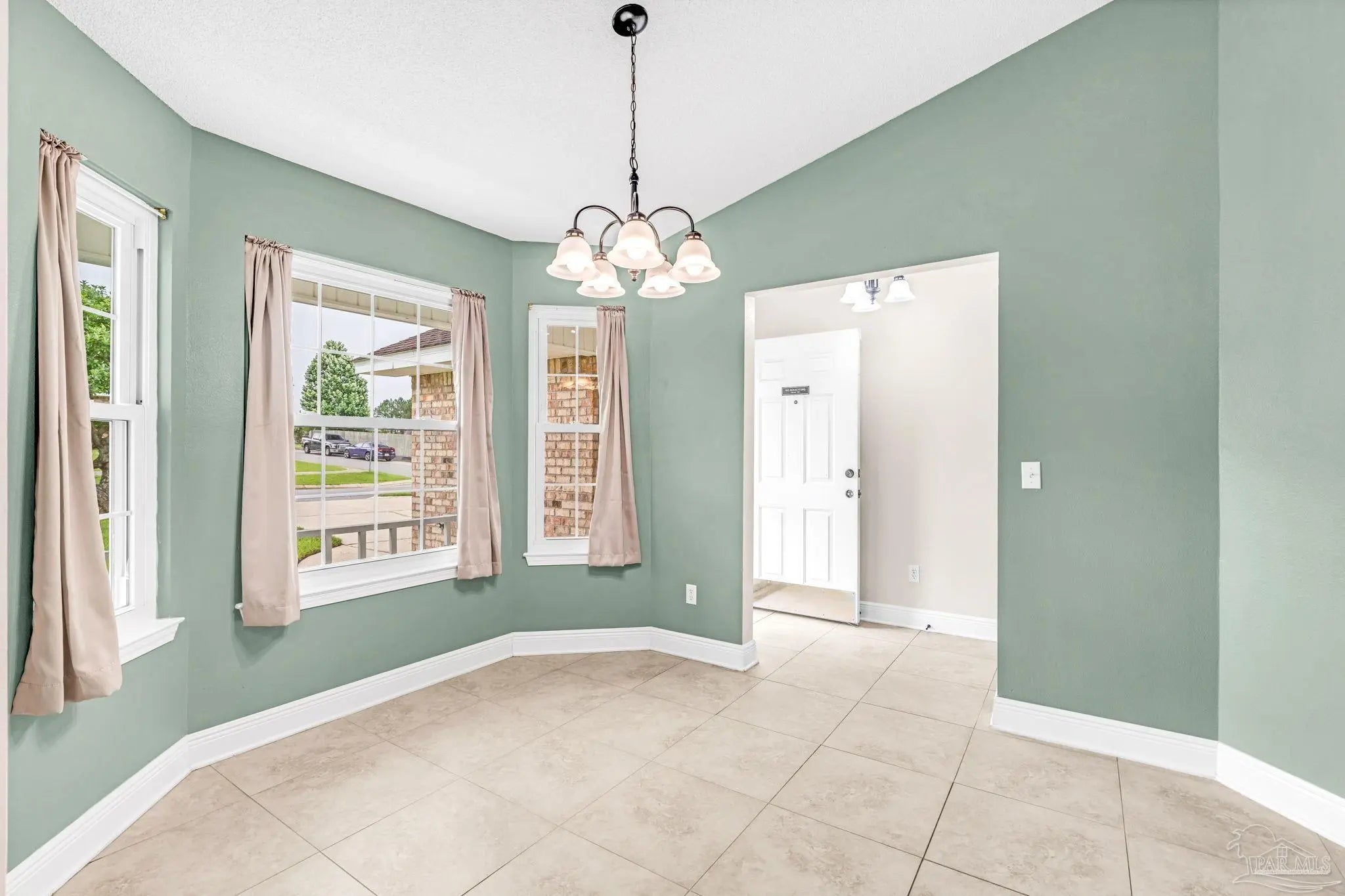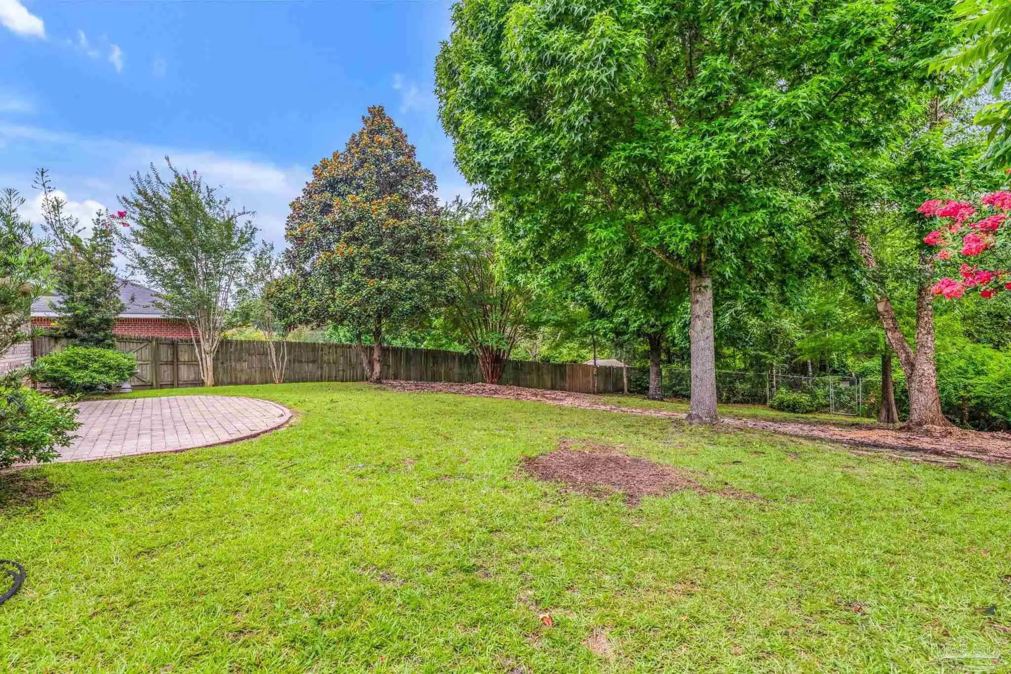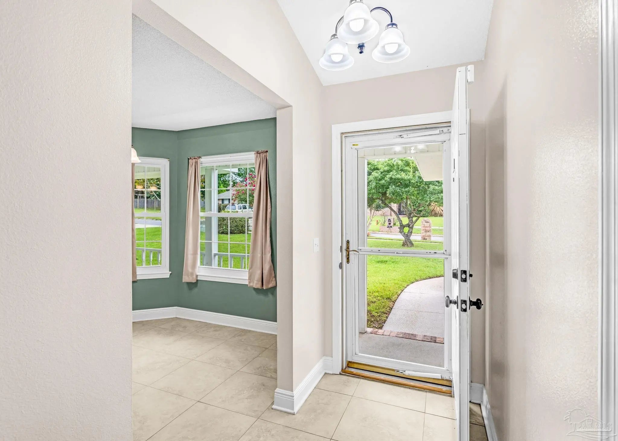 This well-maintained home is nestled in an established, quiet neighborhood in a popular and growing area known for its good schools and sense of community. Backing up to a peaceful greenbelt, this property offers privacy and a connection to nature while still being close to everyday conveniences. The inviting front porch gives this home a warm welcome. Inside, you’ll find a practical and open floor plan, newly painted and sparkling clean. The kitchen features crisp white cabinetry, a bay window breakfast nook, and a large breakfast bar that opens to the family room. Triple windows in the living area fill the space with natural light and create a cheerful atmosphere. The split bedroom layout offers privacy, with the primary suite on one side featuring a double vanity and spacious walk-in closet. Two additional bedrooms and a full guest bath are located on the opposite side of the home. Oversized ceramic tile runs throughout — no carpet — making it easy to maintain. Out back, enjoy the tranquil setting from your brick paver patio, overlooking the large yard and greenbelt. The lot has never flooded and offers plenty of room to relax or play. This charming, move-in-ready home is a great opportunity to own in a desirable location. Schedule your private showing today! 7 Min to NFCU campus. 23 min to downtown Pensacola. 26 to the PNS airport. 2024 double-pane windows (w/life-time warranty) with fabric shields from Window World. New garage door opener in 2025. New electrical panel in 2002. New Roof to be installed prior to closing. Buyer can choose the shingle color. HVAC 2017. Gas Water Heater 2002.