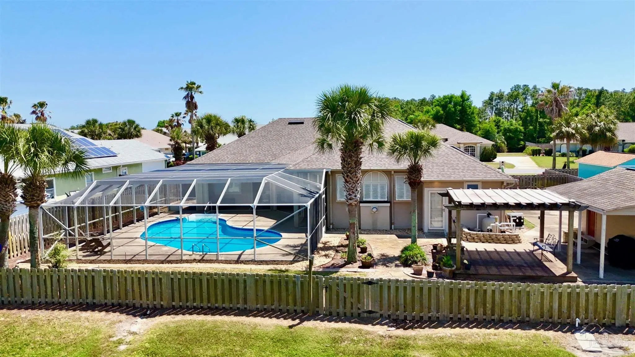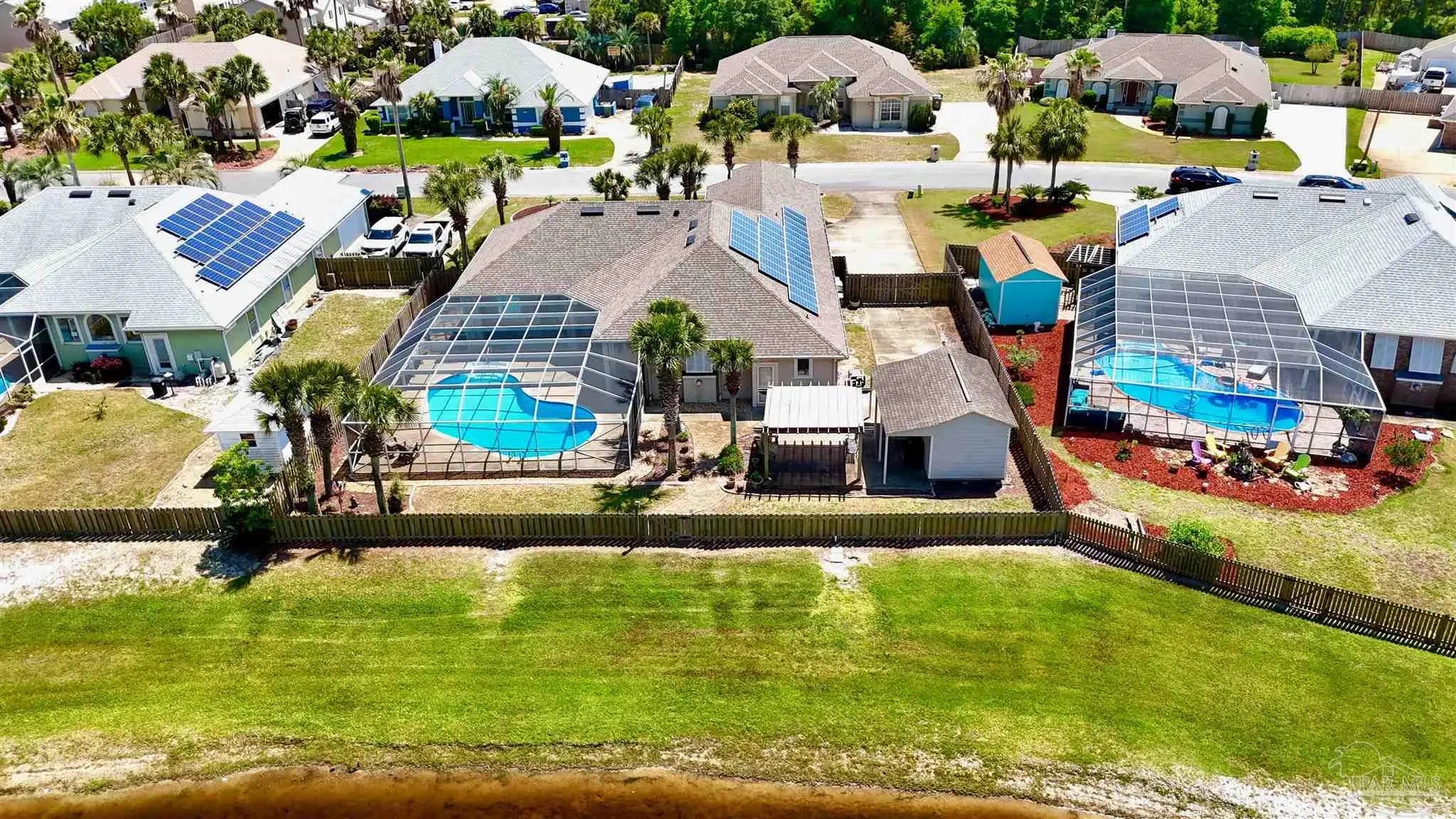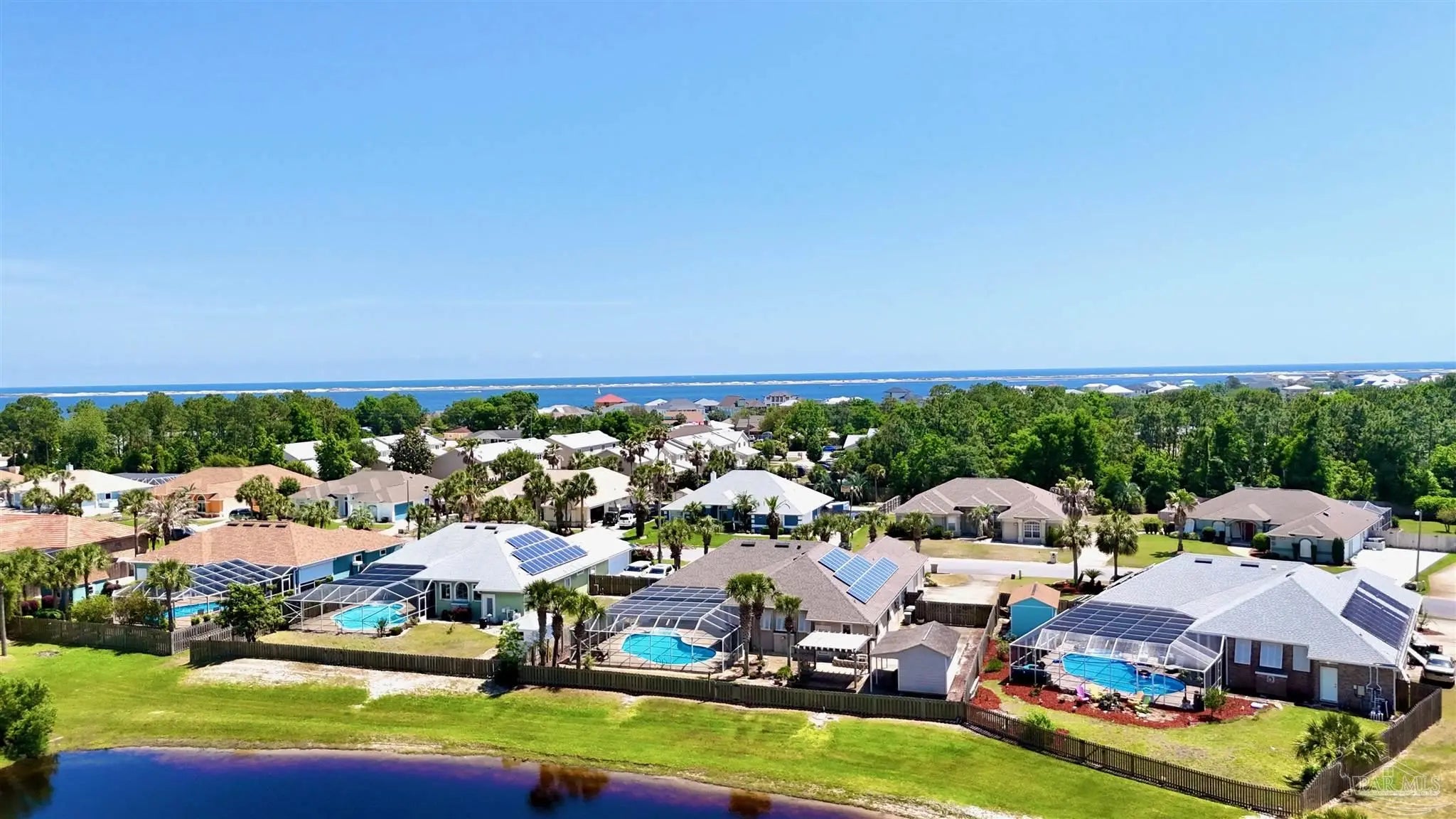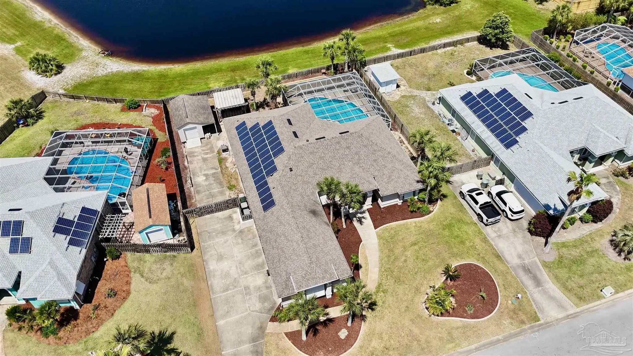 This beautifully maintained, one-owner home—originally new construction—blends elegance, comfort, and functionality. It features a spacious split-bedroom floor plan with a formal dining room, great room, and additional living area in an open concept. Natural light flows through transom windows. The large kitchen overlooks a screened-in freshwater pool, ideal for living and entertaining, with a cozy breakfast nook and formal dining for gatherings. The master suite is a retreat with tray ceilings, pool/patio access, and a luxurious bath including jetted garden tub, separate shower, dual vanities, and walk-in closet. New flooring throughout is beautiful and practical for beach life. Outside, a composite deck under a pergola overlooks a serene lake—perfect for relaxation. Upgrades: geothermal HVAC for efficiency, new roof (2020), rain gutters (2021), fence (2021), sprinkler/well pump (2020), pool liner (2020), new filter/pump with reworked plumbing and heater (up to 104°), solar panels (previously averaged $87/mo electric bill; verify via inspection). Near N.A.S. Pensacola, Perdido Key beaches, and downtown Pensacola, it offers peace and convenience. Homes here sell fast! Notes: HOA $374.69/year. Back on market (no seller fault). Solar panels grid-tied for savings (inspect to verify). Call 786-577-9334 or 504-301-7849 for showings.