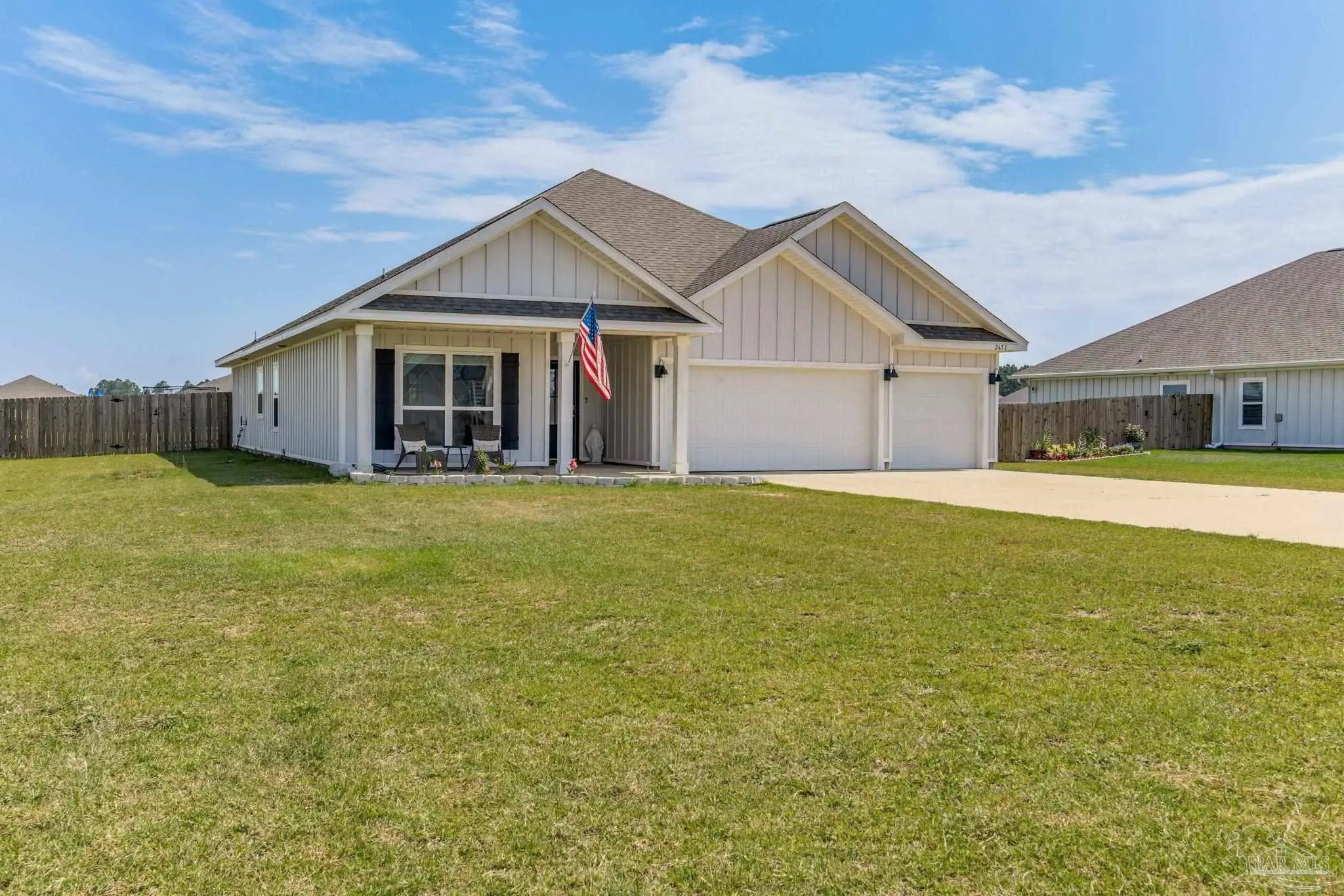Spilt Layout 4-Bed, 3-Bath Home Set on a Deep Lot. Move-in ready home with over 2,300 square feet of thoughtfully designed living space awaits you in the heart of Pace, Florida. Featuring 4 bedrooms and 3 full bathrooms, this single story home provides flexible options for both a formal dining room and a cozy breakfast nook. Your oversized three-car garage is ideal for storing vehicles, tools, water toys, or even setting up your own workshop. Outside, the covered patio overlooks a fully fenced acre lot that is ready for a custom pool, fire pit or play area. Currently there are blueberry bushes, elderberry bushes and beauty berry bushes in raised beds. On the interior you’ll notice generously sized closets, millwork accents and newly added built-in bench seating. Special features include a walk-in pantry, upgraded laundry room cabinetry, security system and convenient service road. This home sits in a neighborhood that is anything but cookie cutter. Pace has many new and exciting developments in the works with highly rated schools. We welcome you to tour this home that combines space, comfort, and community.