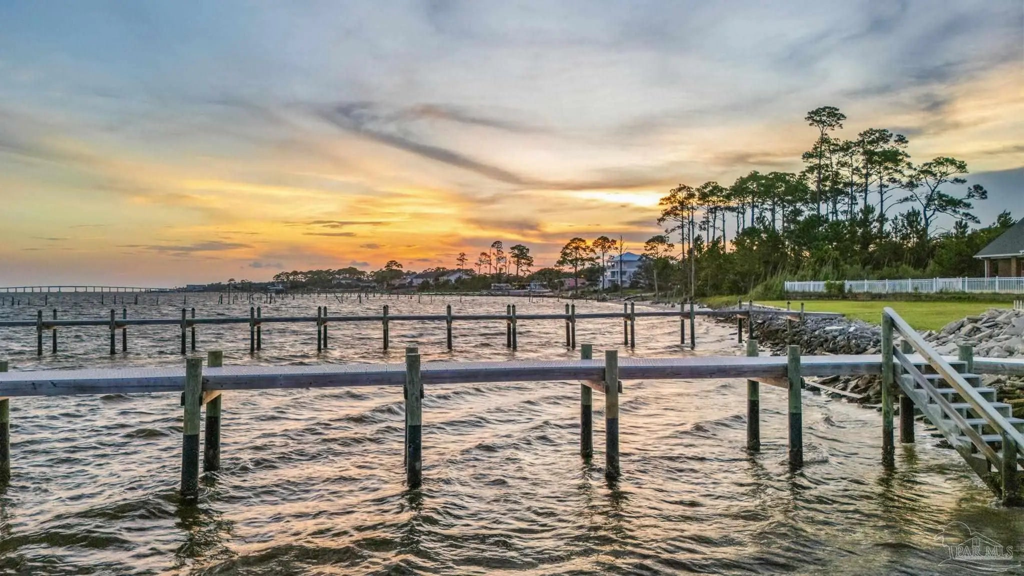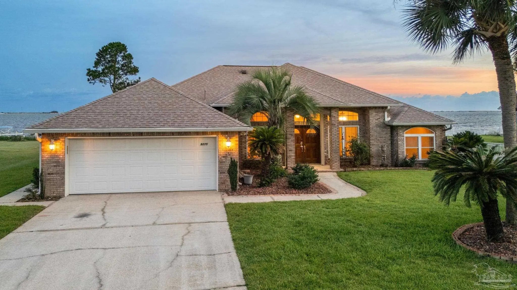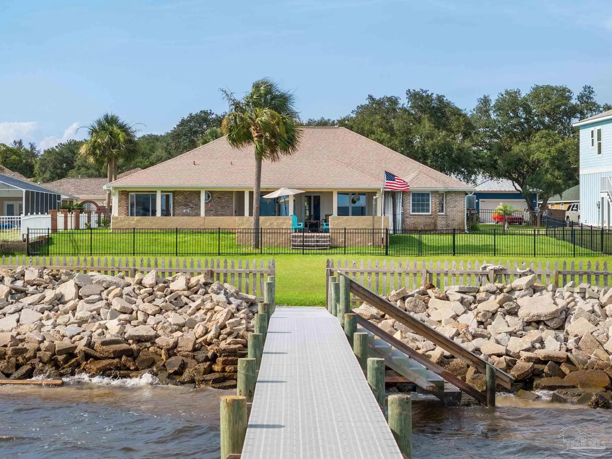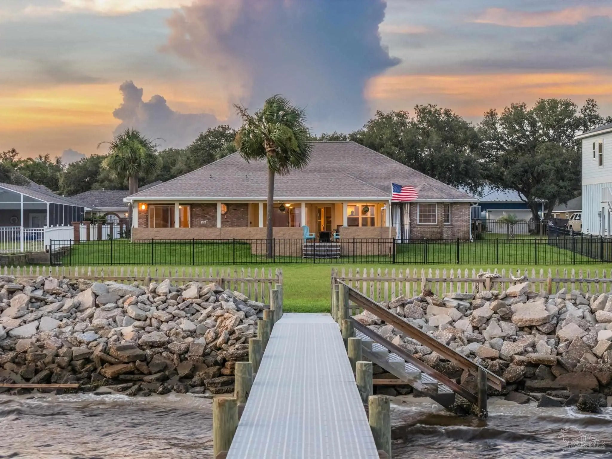 Beautiful waterfront home with 97 ft shoreline on a half-acre lot. Custom-built by the owner with a new private deep-water dock on navigable water, ideal for multiple large vessels. Many other unique features, including a guest suite with a handicap-accessible kitchenette, a safe room, and an 800 sqft patio ready to be enclosed. Tucked away on a quiet cul-de-sac, this 2,220 sq ft home captures both sunrise and sunset views. Inside, you’ll find 4 bedrooms and 2.5 bathrooms, an open floor plan with waterfront views throughout. The primary bedroom features double-door access to the sun deck/patio, high ceilings, new LVP flooring and a luxurious marble soaking tub. The home also includes a vent-free natural gas fireplace, recessed lighting, an outdoor hot/cold shower, a fenced in backyard, and a safe room for added peace of mind.The home is thoughtfully equipped with energy-efficient, cost-saving upgrades throughout. A high-efficiency natural gas HVAC system (2021) and a 50-gallon gas water heater help keep utilities low. The oversized 2-car garage features an 18-foot hurricane-rated door (vs. the standard 16 ft) and additional driveway parking for up to 6 vehicles. A 6,500-watt portable gas generator with a 30-ft cable is wired directly into the main electrical panel for easy backup power. Additional features include hurricane shutters on all windows, grand mahogany double entry doors, high ceilings with crown molding, and a fully hard-wired security system covering all doors, windows, smoke/fire alarms, and police/emergency panic buttons. Built with rock-solid construction, this property has withstood every major hurricane since 1995. Located in the Santa Rosa County school district, with convenient access to Hurlburt Field, Eglin Air Force Base, Navarre Beach, and the Gulf. The neighborhood features a private beach with a gazebo with a boardwalk nature trail.
