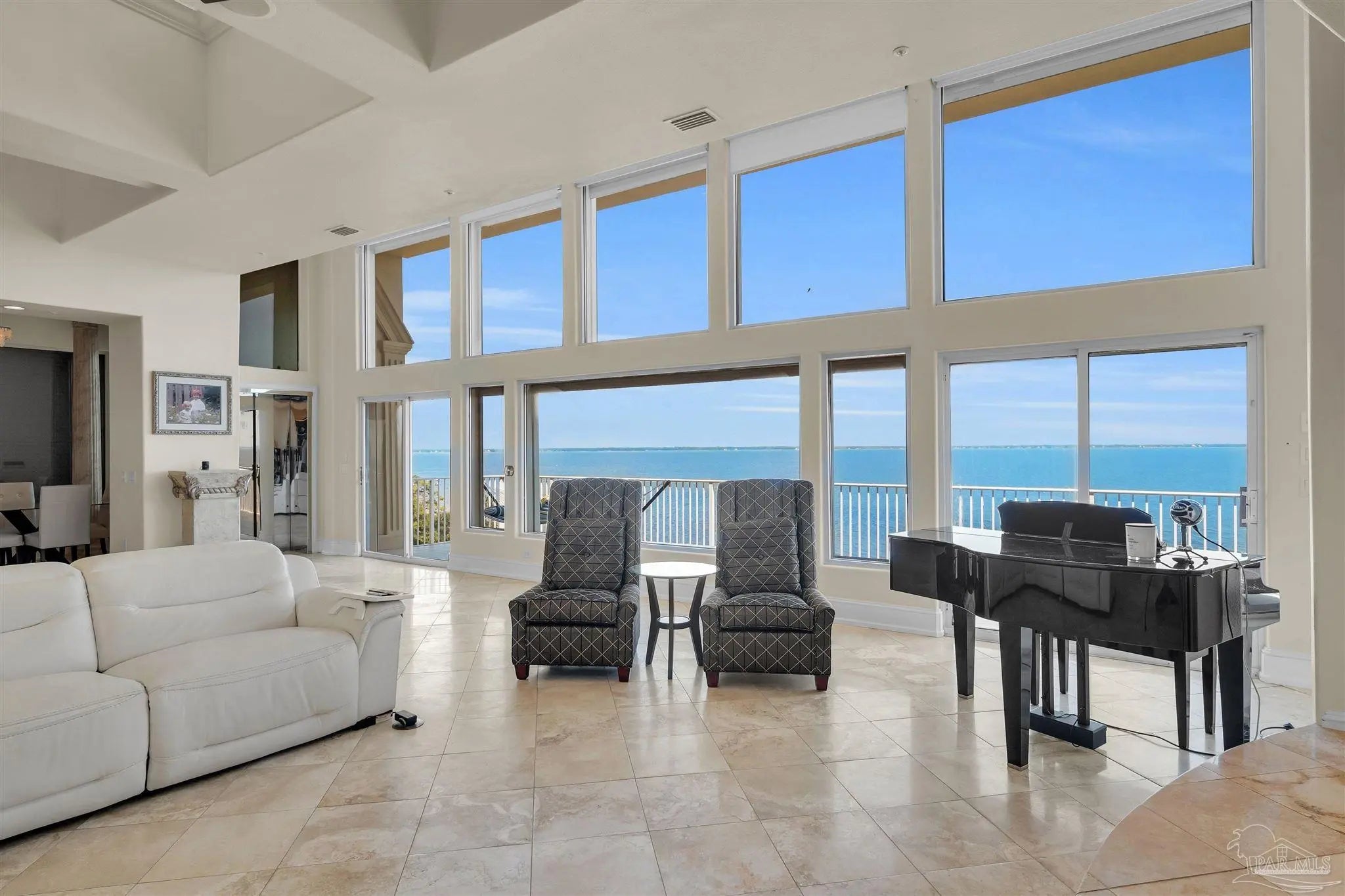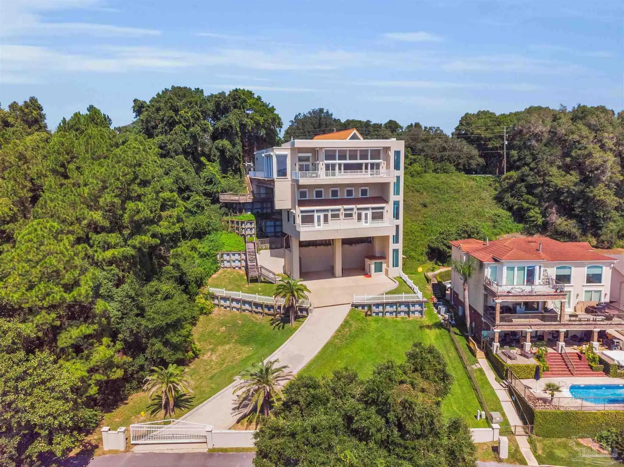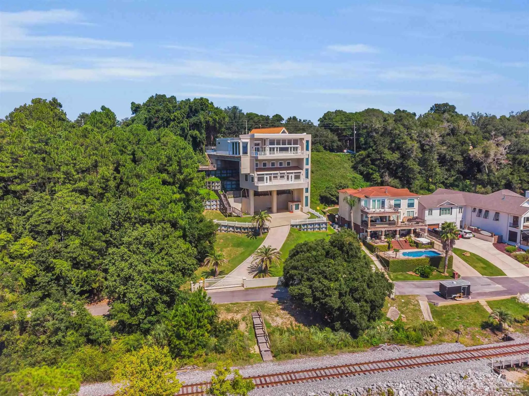 The "ONE & ONLY California Cliff Home" There is no house like this one in Pensacola or all of Northwest Florida. It is 5 minutes to the airport and 3 to Interstate 10, making easy access to the US or Southeast. It is the finest luxury located at the literal highest Florida coastal point; it has the best Pensacola Bay views. From Scenic Hwy, all that may be visible is the main floor. From the bay, one can see additional floors and the full 75 foot height of the building from foundation to roof. Architecturally, it has modern beauty and strength. It was constructed with 9 actual 90' Interstate 10 bridge beams anchored on one end at the level of Scenic Hwy and supported by massive columns on the bay side. With poured concrete outside walls and inside wall studs of steel, this home may be the most solid dwelling within hundreds of miles. An added bonus to the thick concrete walls and top of the line windows is this home is incredibly quiet and peaceful from outside noise. Metal hurricane shutters which can be lowered with the push of a button add to the security. The beauty of this home is evident both inside and out. Stepping onto the 14" polished travertine floors, one is impressed with an overwhelming sense of serenity. The open floor plan makes this house inviting no matter what room you are in... nearly every room in the house has immaculate views. The living room has ceiling to floor windows for penthouse bay views and windows built into the cathedral ceiling for extra lighting. It is decorated with a large tiled gas fireplace, recessed lighting, and a built in entertainment area. The kitchen is equipped with fade-on recessed lighting, all new kitchen-aid appliances, 2 Kohler deep sinks, an ice maker, recycling compactor, brushed steel range hood, custom granite bi-level counter tops and cabinetry. The master bedroom is enclosed by ceiling to floor glass on 2 sides offering unsurpassed sunrises. A commercial grade glass elevator runs from top to bottom.SEE BELOW: