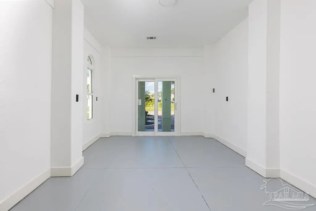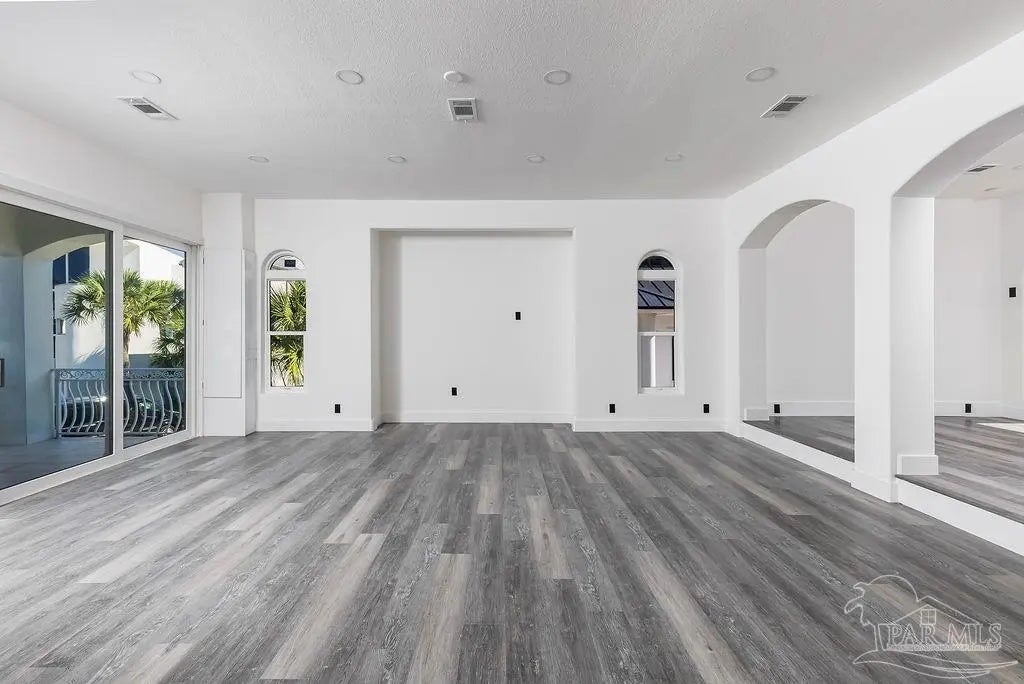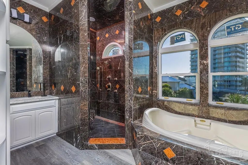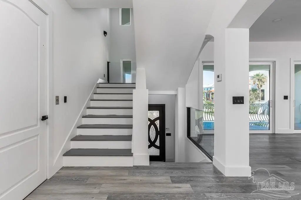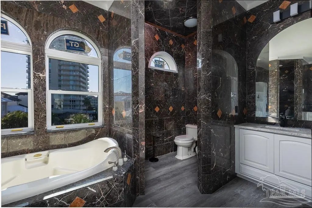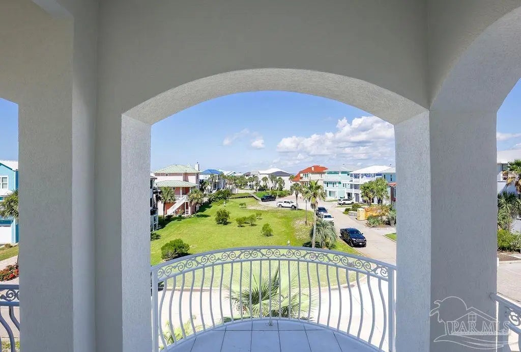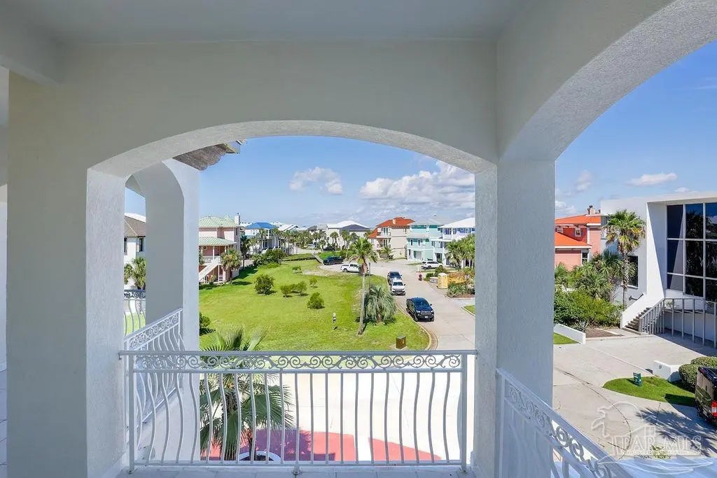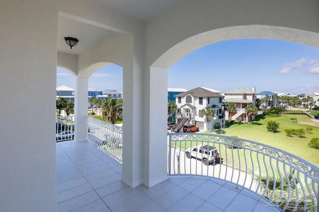 Newly renovated and over 5,000 square feet of total living space in the desired residential gated community of Deluna Point on Pensacola Beach. Direct access to Pensacola Bay and the Gulf of Mexico at the edge of preserved nature, the Gulf Islands National Seashore, make this a coveted location for those seeking the stillness life on an island brings. You've got 3,800 square feet, 6 balconies, 4 bedrooms, and 4.5 bathrooms above grade- plus a finished bottom floor giving you over 5,000 square feet of total living space, 2 extra bedrooms, and the possibility of 2 extra bathrooms. The 8 foot ornate French doors and the height of the entrance gives this home a stately posture. The formal entrance opens on a split level where there are two avenues of entering the main floor- the stairways, or the residential elevator that services all three floors. The main floor consists of the great room, formal dining room, the kitchen with eat-in-kitchen and breakfast bar utility, one bedroom with it's own full bathroom, a half bath for guests, three balconies, and a full service wet bar that holds the whole space together in the center. The kitchen features a large center island with granite counter tops perfect for meal preparation with its own basin sink, double ovens, an oversized sink for cleaning, and a stone finished backsplash for added texture. The full size wet bar is meant to service the kitchen, the formal dining room, and the great room- wherever you find yourself entertaining family and friends. The bedroom on the main floor features its own balcony making it a great use for an in-home office. On the third floor you'll find 3 additional bedrooms and bathrooms, including that of the master suite and ensuite. Just off the kitchenette on the landing of the third floor, the mast suite is exquisite with a built in entertainment space, fireplace, and six piece ensuite. Armani marble props the jacuzzi tub up in the spotlight and builds out the features of the entire ensuite.