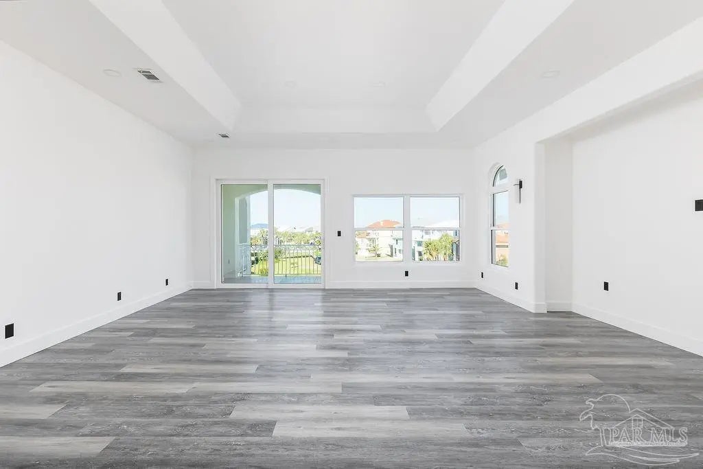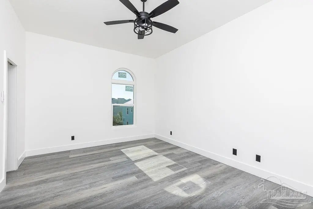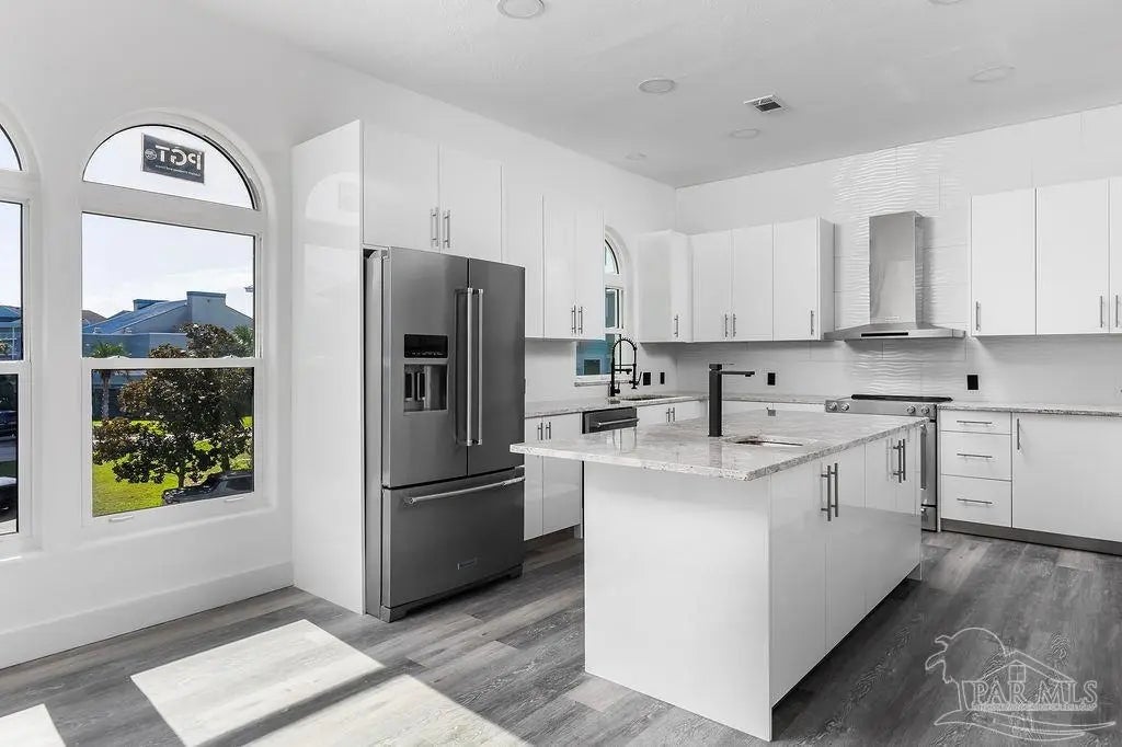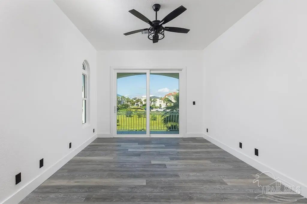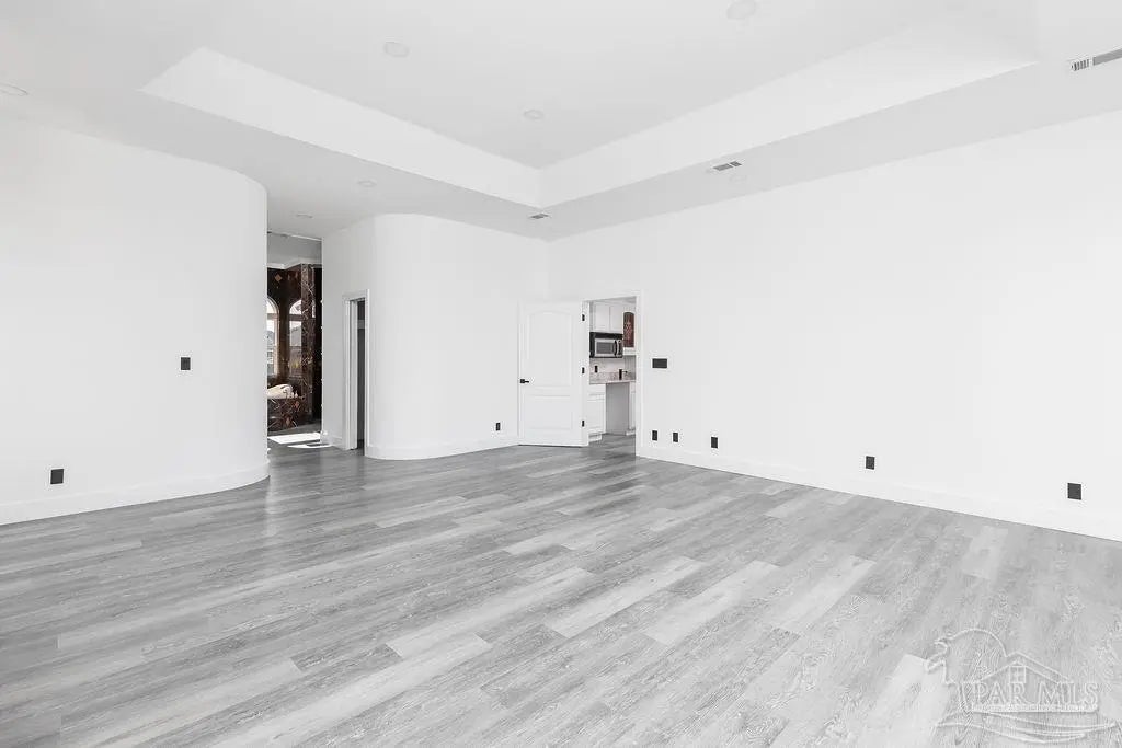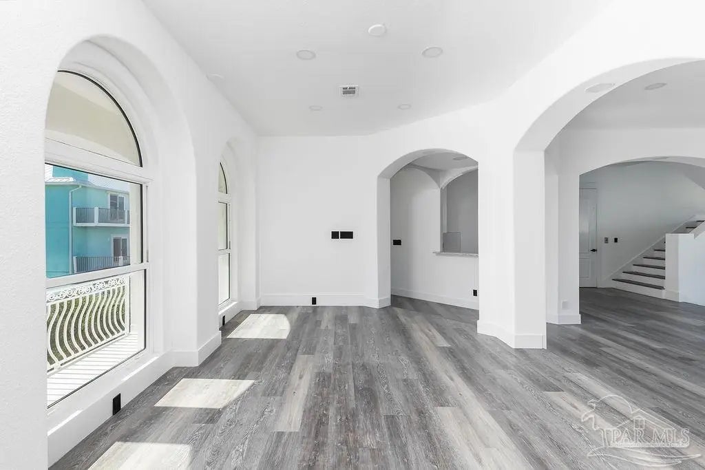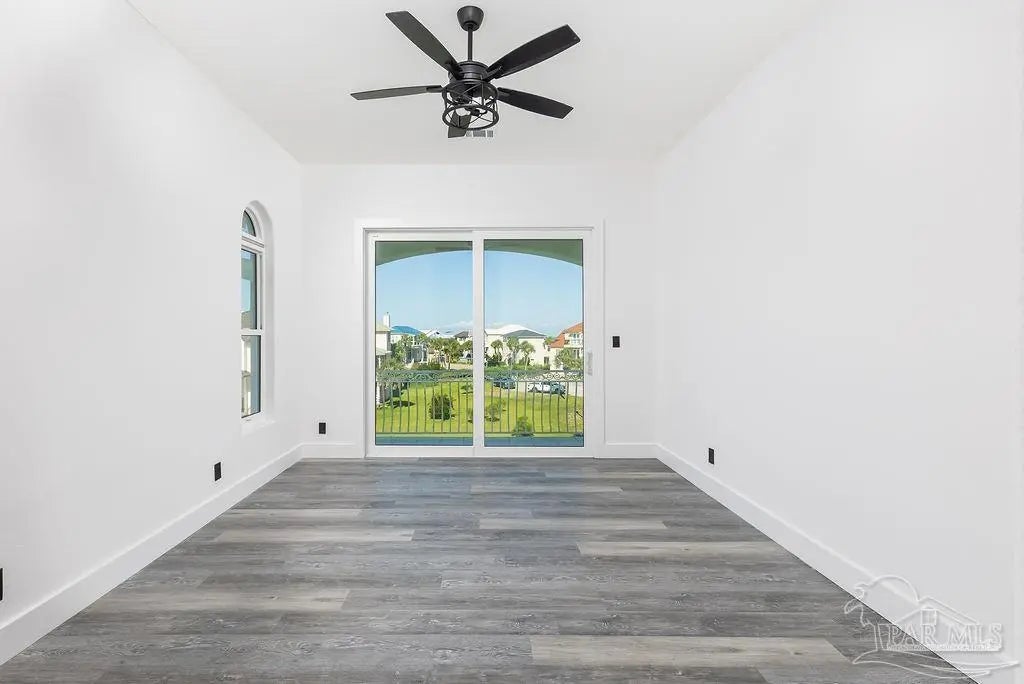 Newly renovated and over 5,000 square feet of total living space in the desired residential gated community of Deluna Point on Pensacola Beach. Direct access to Pensacola Bay and the Gulf of Mexico at the edge of preserved nature, the Gulf Islands National Seashore, make this a coveted location for those seeking the stillness life on an island brings. You've got 3,800 square feet, 6 balconies, 4 bedrooms, and 4.5 bathrooms above grade- plus a finished bottom floor giving you over 5,000 square feet of total living space, 2 extra bedrooms, and the possibility of 2 extra bathrooms. The 8 foot ornate French doors and the height of the entrance gives this home a stately posture. The formal entrance opens on a split level where there are two avenues of entering the main floor- the stairways, or the residential elevator that services all three floors. The main floor consists of the great room, formal dining room, the kitchen with eat-in-kitchen and breakfast bar utility, one bedroom with it's own full bathroom, a half bath for guests, three balconies, and a full service wet bar that holds the whole space together in the center. The kitchen features a large center island with granite counter tops perfect for meal preparation with its own basin sink, double ovens, an oversized sink for cleaning, and a stone finished backsplash for added texture. The full size wet bar is meant to service the kitchen, the formal dining room, and the great room- wherever you find yourself entertaining family and friends. The bedroom on the main floor features its own balcony making it a great use for an in-home office. On the third floor you'll find 3 additional bedrooms and bathrooms, including that of the master suite and ensuite. Just off the kitchenette on the landing of the third floor, the mast suite is exquisite with a built in entertainment space, fireplace, and six piece ensuite. Armani marble props the jacuzzi tub up in the spotlight and builds out the features of the entire ensuite.