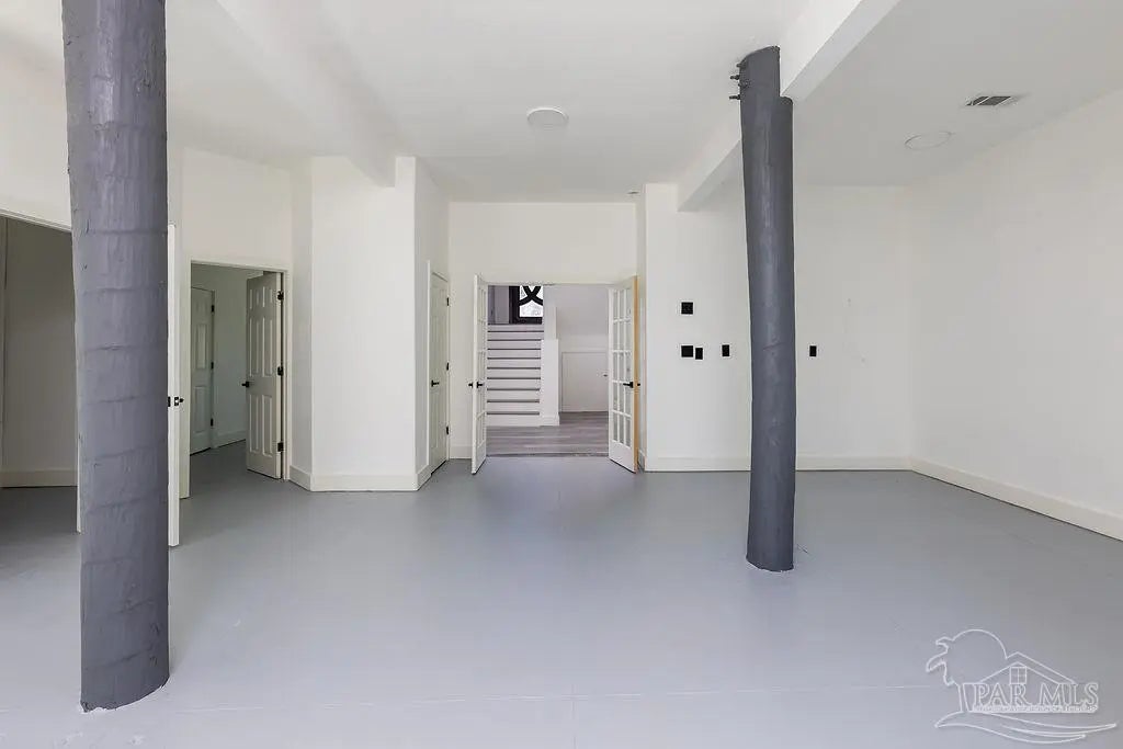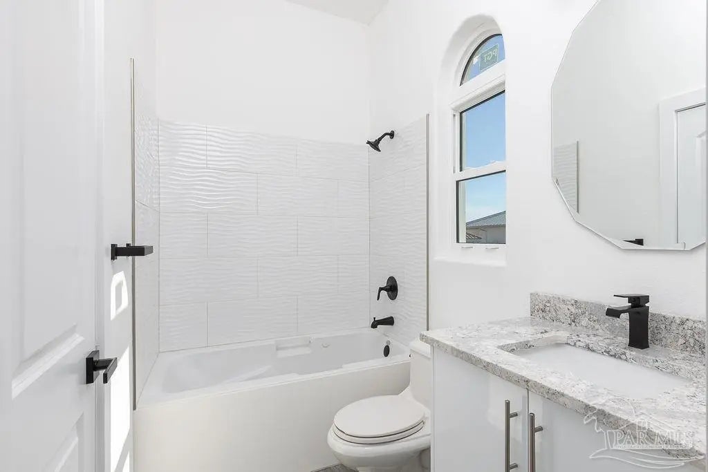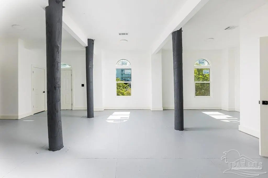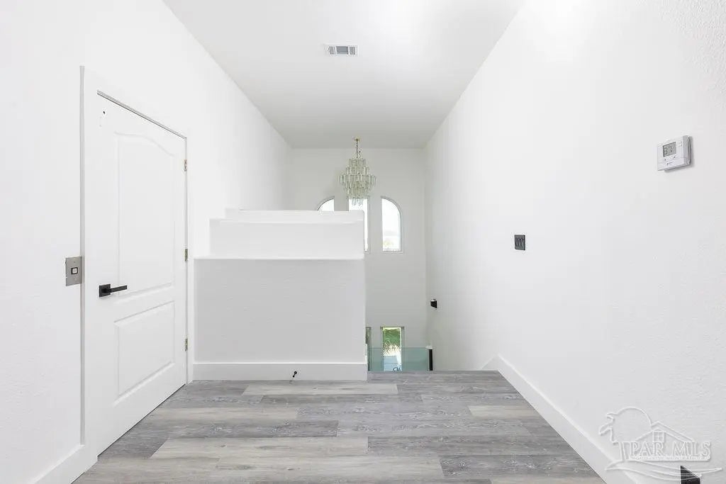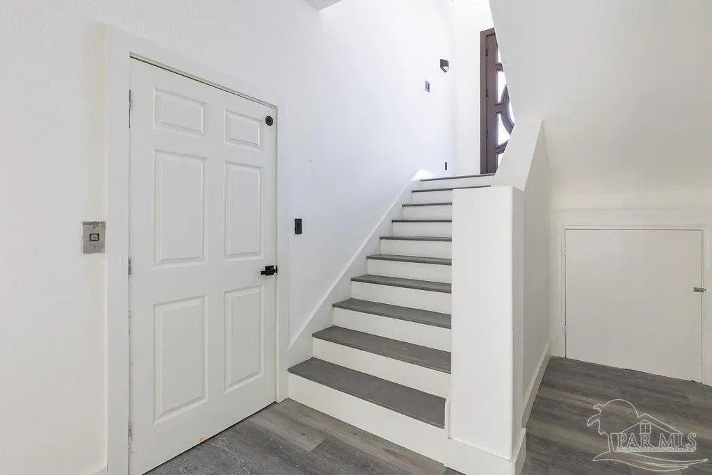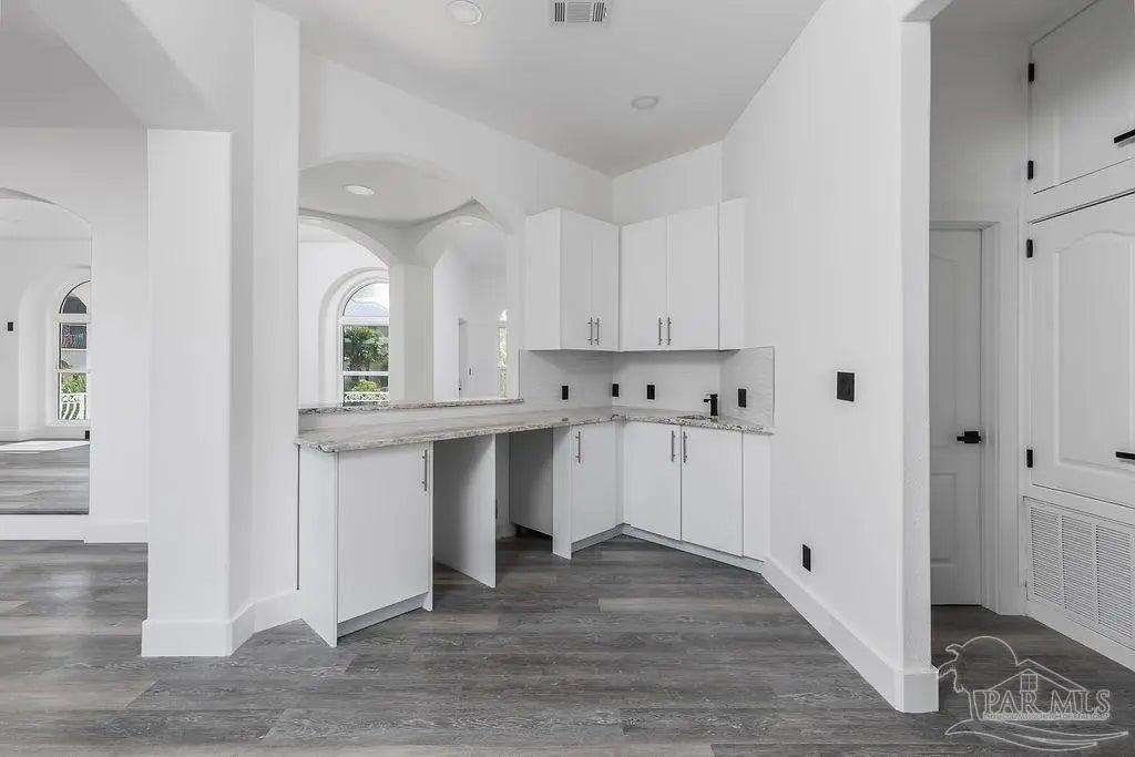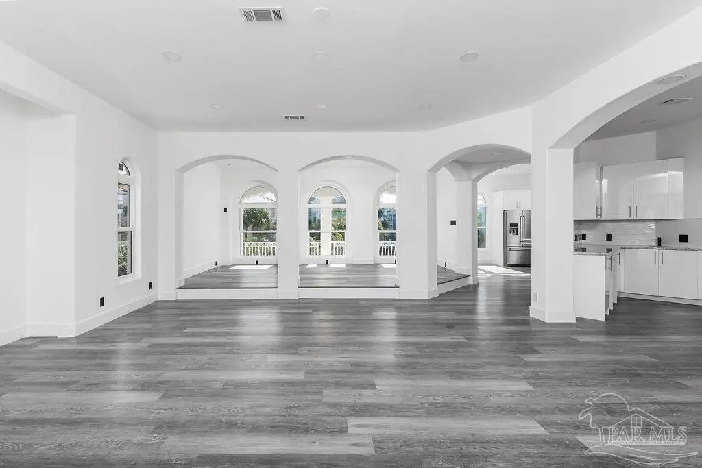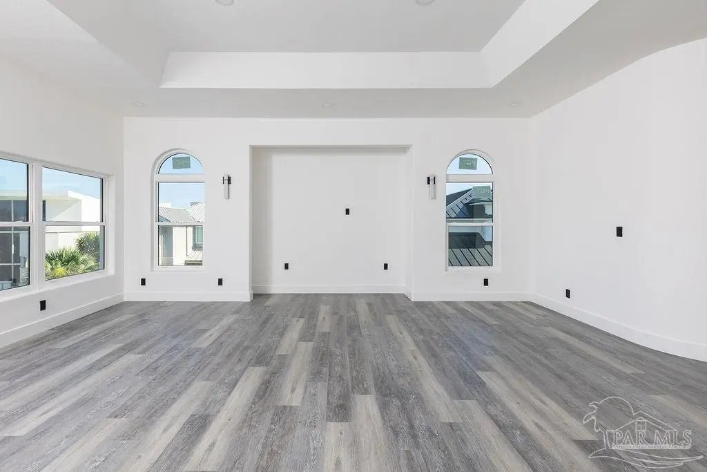 Newly renovated and over 5,000 square feet of total living space in the desired residential gated community of Deluna Point on Pensacola Beach. Direct access to Pensacola Bay and the Gulf of Mexico at the edge of preserved nature, the Gulf Islands National Seashore, make this a coveted location for those seeking the stillness life on an island brings. You've got 3,800 square feet, 6 balconies, 4 bedrooms, and 4.5 bathrooms above grade- plus a finished bottom floor giving you over 5,000 square feet of total living space, 2 extra bedrooms, and the possibility of 2 extra bathrooms. The 8 foot ornate French doors and the height of the entrance gives this home a stately posture. The formal entrance opens on a split level where there are two avenues of entering the main floor- the stairways, or the residential elevator that services all three floors. The main floor consists of the great room, formal dining room, the kitchen with eat-in-kitchen and breakfast bar utility, one bedroom with it's own full bathroom, a half bath for guests, three balconies, and a full service wet bar that holds the whole space together in the center. The kitchen features a large center island with granite counter tops perfect for meal preparation with its own basin sink, double ovens, an oversized sink for cleaning, and a stone finished backsplash for added texture. The full size wet bar is meant to service the kitchen, the formal dining room, and the great room- wherever you find yourself entertaining family and friends. The bedroom on the main floor features its own balcony making it a great use for an in-home office. On the third floor you'll find 3 additional bedrooms and bathrooms, including that of the master suite and ensuite. Just off the kitchenette on the landing of the third floor, the mast suite is exquisite with a built in entertainment space, fireplace, and six piece ensuite. Armani marble props the jacuzzi tub up in the spotlight and builds out the features of the entire ensuite.