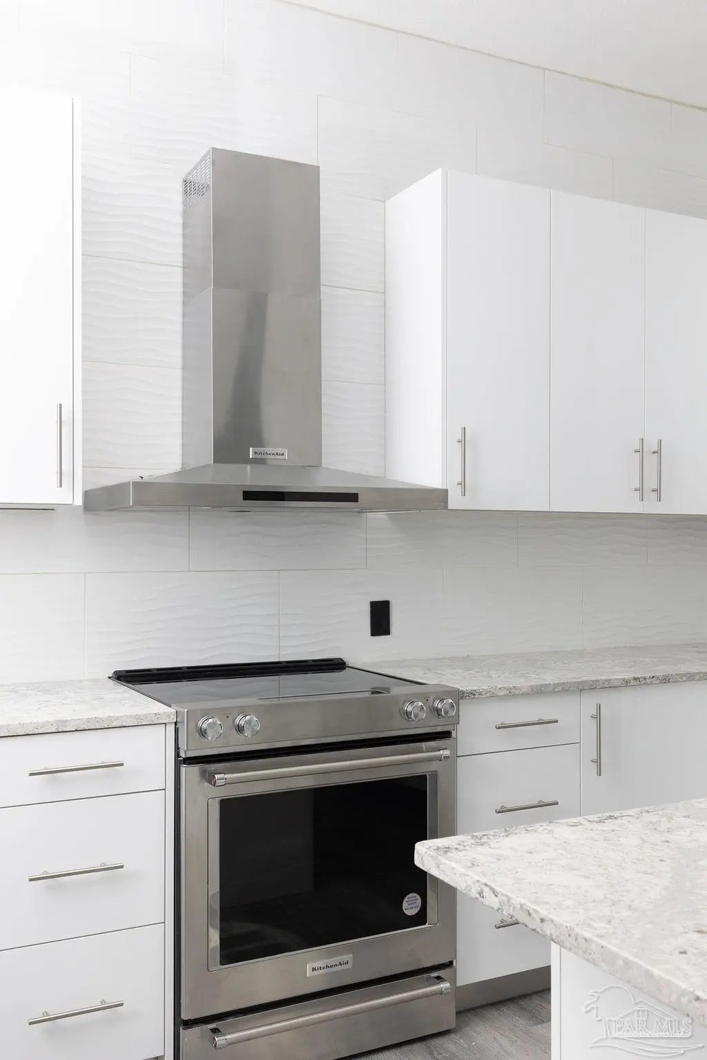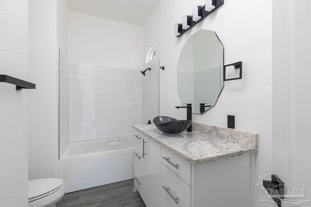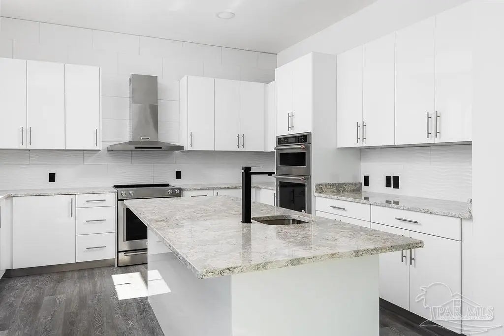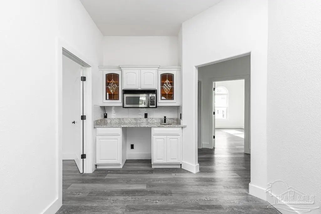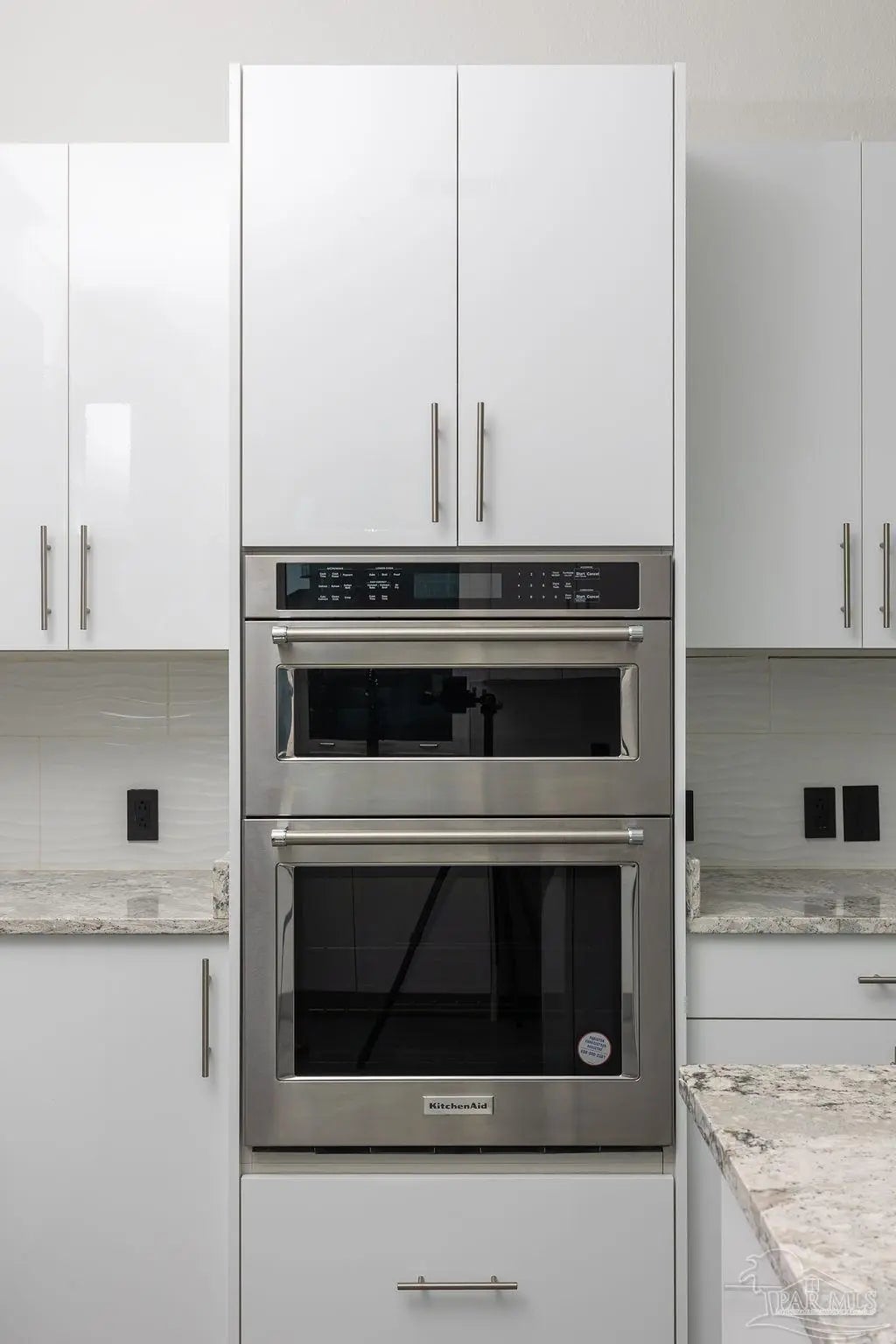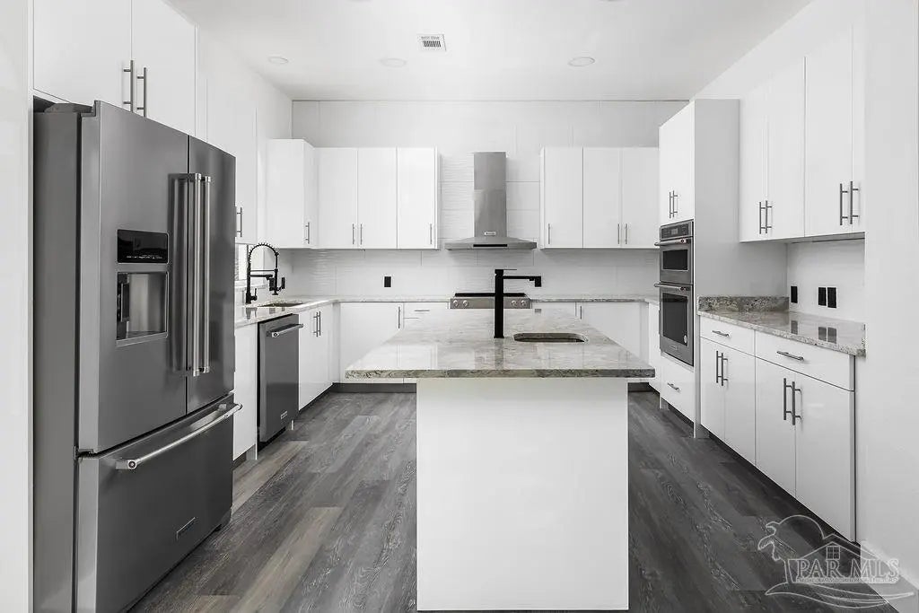 Newly renovated and over 5,000 square feet of total living space in the desired residential gated community of Deluna Point on Pensacola Beach. Direct access to Pensacola Bay and the Gulf of Mexico at the edge of preserved nature, the Gulf Islands National Seashore, make this a coveted location for those seeking the stillness life on an island brings. You've got 3,800 square feet, 6 balconies, 4 bedrooms, and 4.5 bathrooms above grade- plus a finished bottom floor giving you over 5,000 square feet of total living space, 2 extra bedrooms, and the possibility of 2 extra bathrooms. The 8 foot ornate French doors and the height of the entrance gives this home a stately posture. The formal entrance opens on a split level where there are two avenues of entering the main floor- the stairways, or the residential elevator that services all three floors. The main floor consists of the great room, formal dining room, the kitchen with eat-in-kitchen and breakfast bar utility, one bedroom with it's own full bathroom, a half bath for guests, three balconies, and a full service wet bar that holds the whole space together in the center. The kitchen features a large center island with granite counter tops perfect for meal preparation with its own basin sink, double ovens, an oversized sink for cleaning, and a stone finished backsplash for added texture. The full size wet bar is meant to service the kitchen, the formal dining room, and the great room- wherever you find yourself entertaining family and friends. The bedroom on the main floor features its own balcony making it a great use for an in-home office. On the third floor you'll find 3 additional bedrooms and bathrooms, including that of the master suite and ensuite. Just off the kitchenette on the landing of the third floor, the mast suite is exquisite with a built in entertainment space, fireplace, and six piece ensuite. Armani marble props the jacuzzi tub up in the spotlight and builds out the features of the entire ensuite.