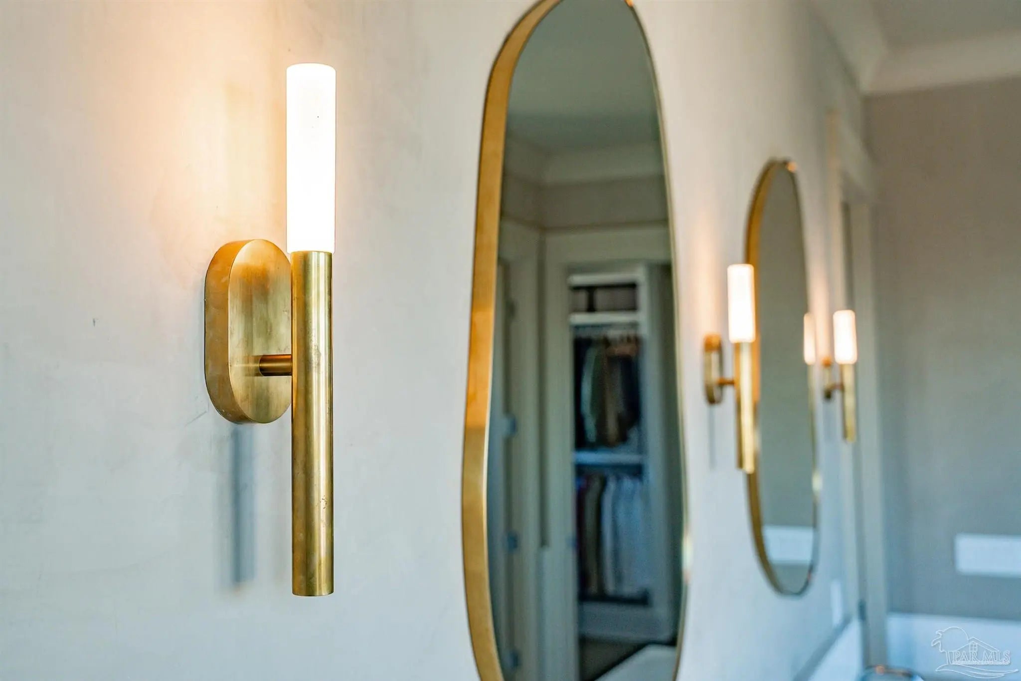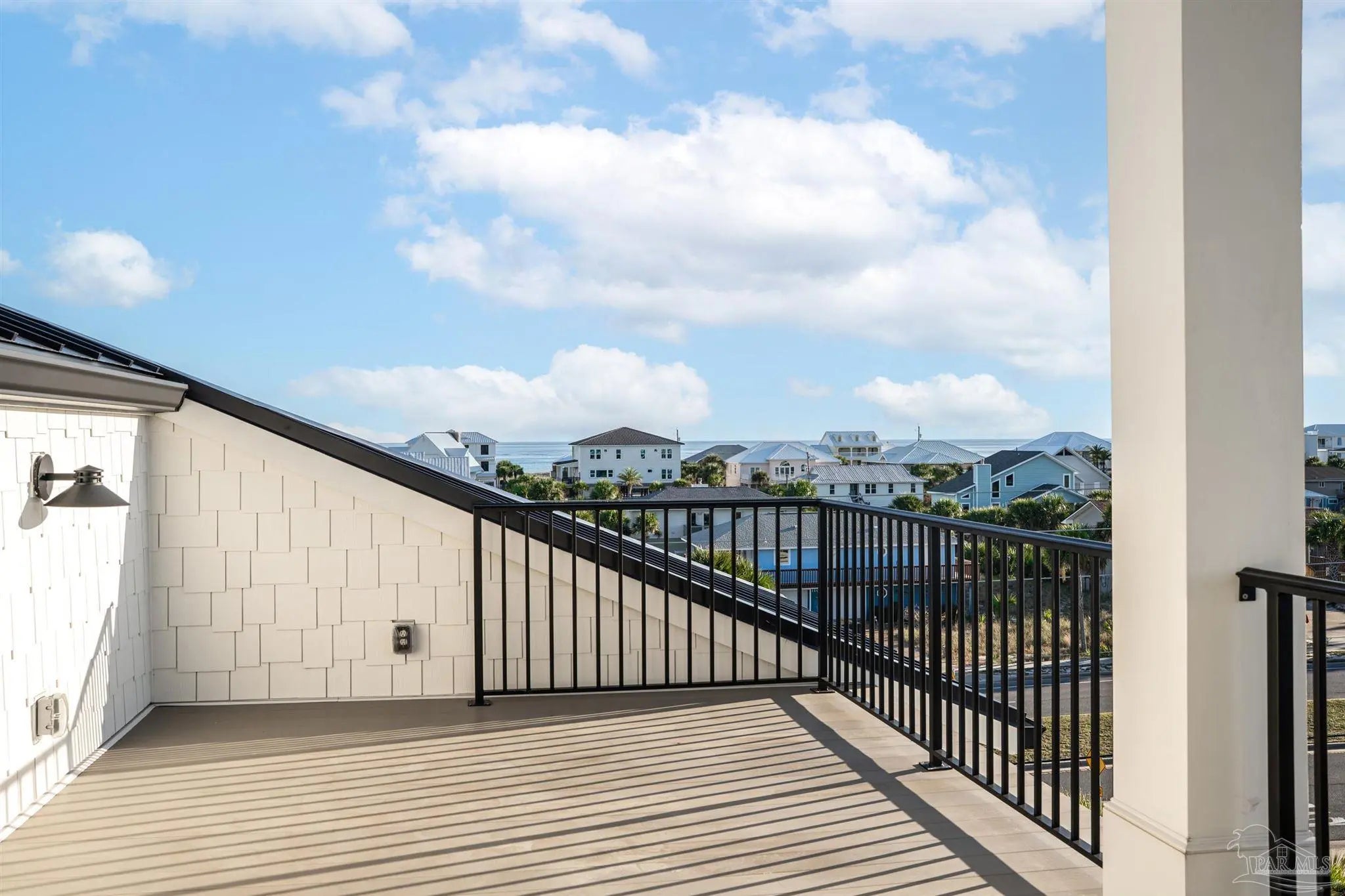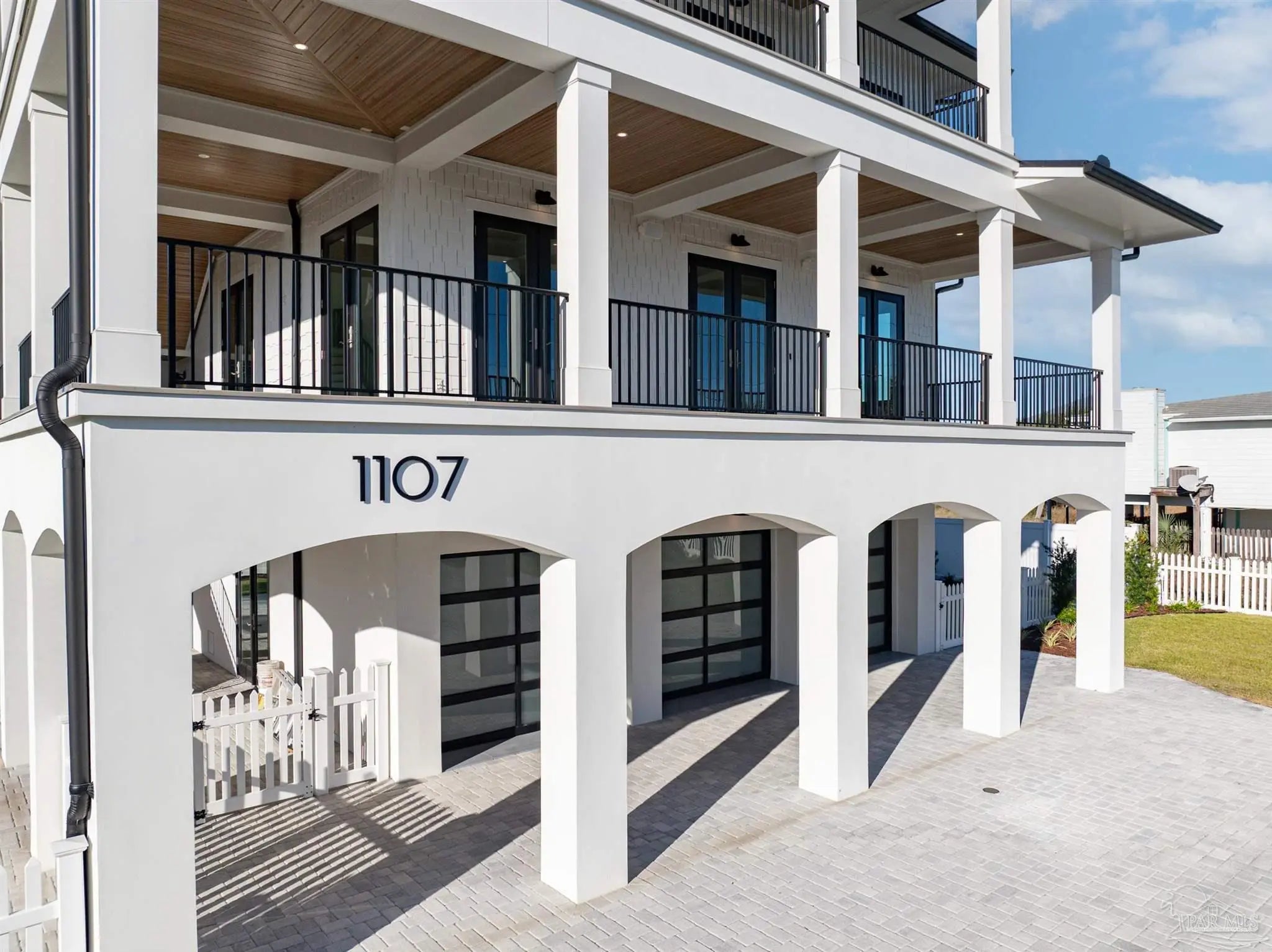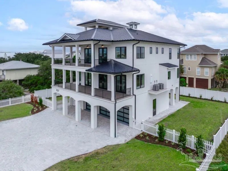 One of the most attractive residences on all of P-beach & believed to be the tallest residential home on the Beach giving views of the Sound & the Gulf. Boasting Elite Caliber finishes plus efficient dollar saving home hardening construction materials installed by craftsmen & perfectly placed on a rare larger estate size .29-acre lot w the entire perimeter enveloped by a heavy-duty custom vinyl fencing system w motorized gate. Parking is a breeze w the unique 50 ft paver parking round about. One of the few home sites that sits adjacent to a 15 ft easement that runs North & South from the sound to the gulf. If you enjoy outdoor living space this beautiful abode has appx 3500 SF of covered outdoor decks w tongue & groove exterior ceiling system at all decks, patios & stairwells. The large ground level covered porch at the rear of the home is well suited for your future outdoor kitchen & flows well with the side yard which can accommodate the attached pool design without a variance. Low maintenance construction & extra attention to detail offer significant insurance, utility & maintenance savings. Enhanced efficiency standards are: larger 14” pilings versus 12” installed to 20’ piling ground depth versus 15’ standard; built 18' above sea level 5' above the base flood elevation; all stainless steel fasteners; structural soffits; go bolt threaded rod anchoring system; spray foam insulation; Senergy encapsulated seal coat exterior polymer system; Aeritis tongue & groove decking; stained & sealed tongue & groove ceilings at all covered porches; 3500sf of covered outdoor living space; 799sf insulated & finished garage; custom gutter system w underground drainage; custom paver walkways; double pane low-e impact Colby Casement windows & Neuma doors w/3 point locking system; white glass aluminum garage doors; aluminum hand rails w/powder coat finish; standing seam metal roof w peel & stick underlayment; large rooftop observation deck & Custom Cab elevator serving all levels.