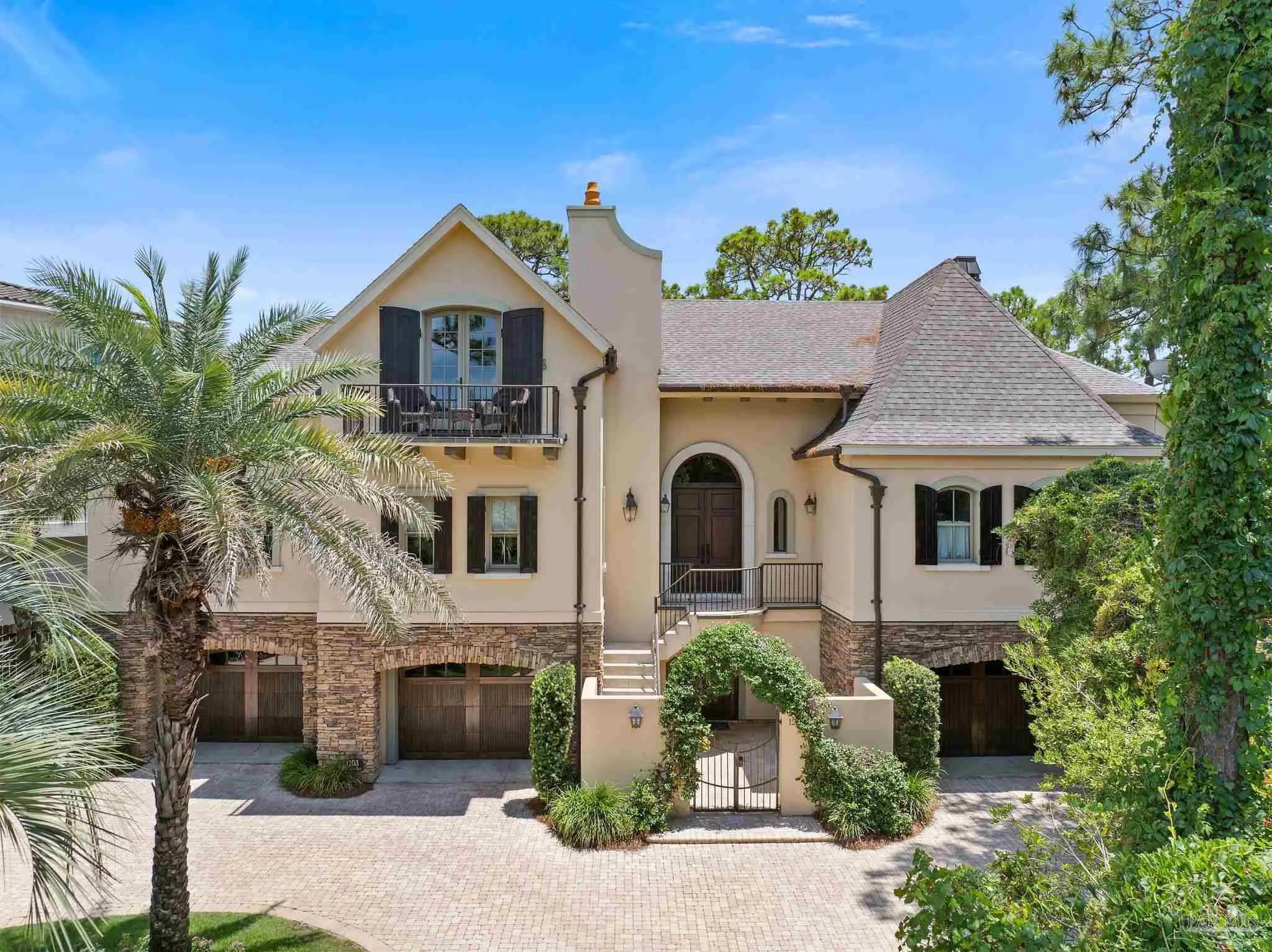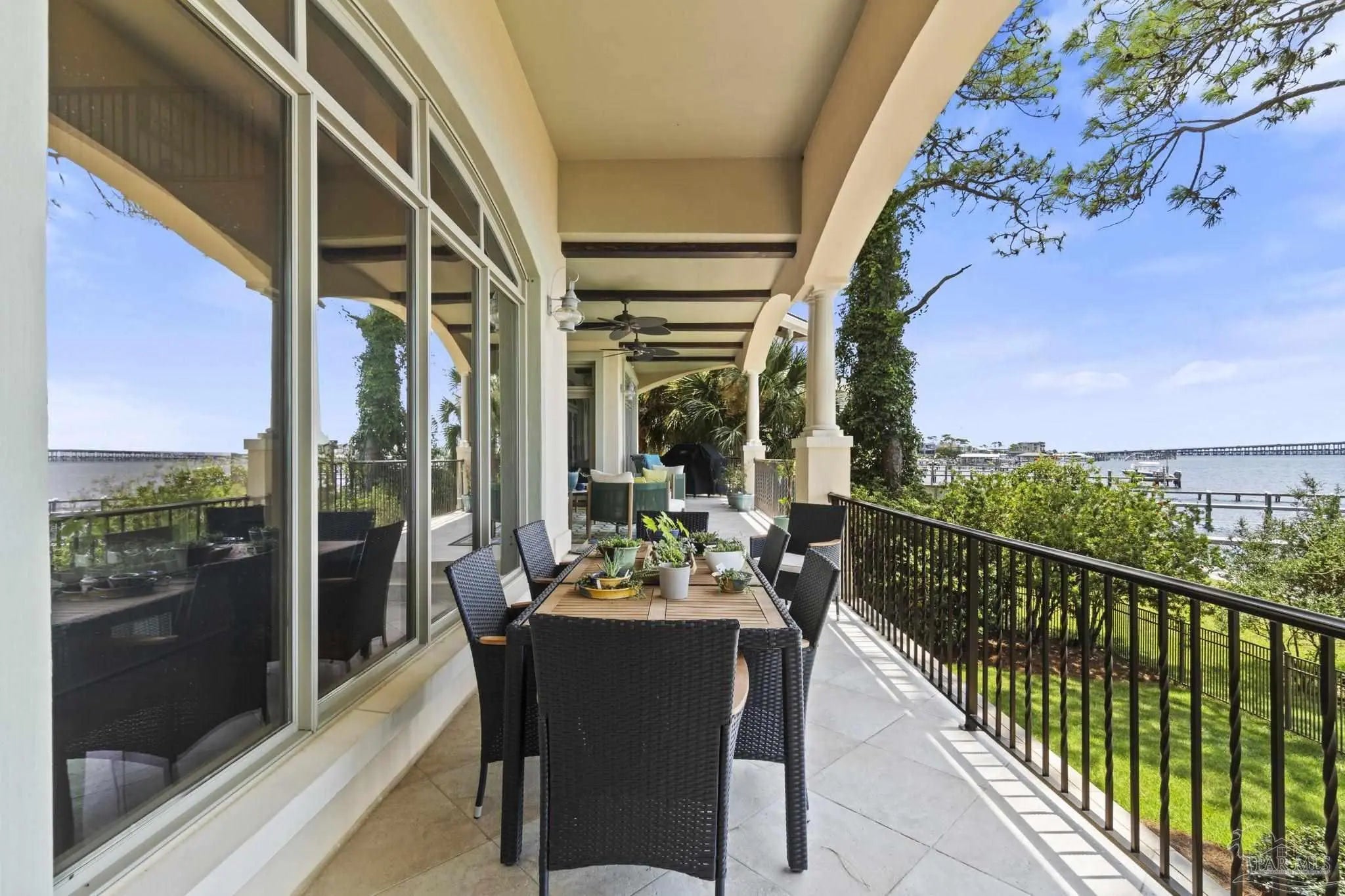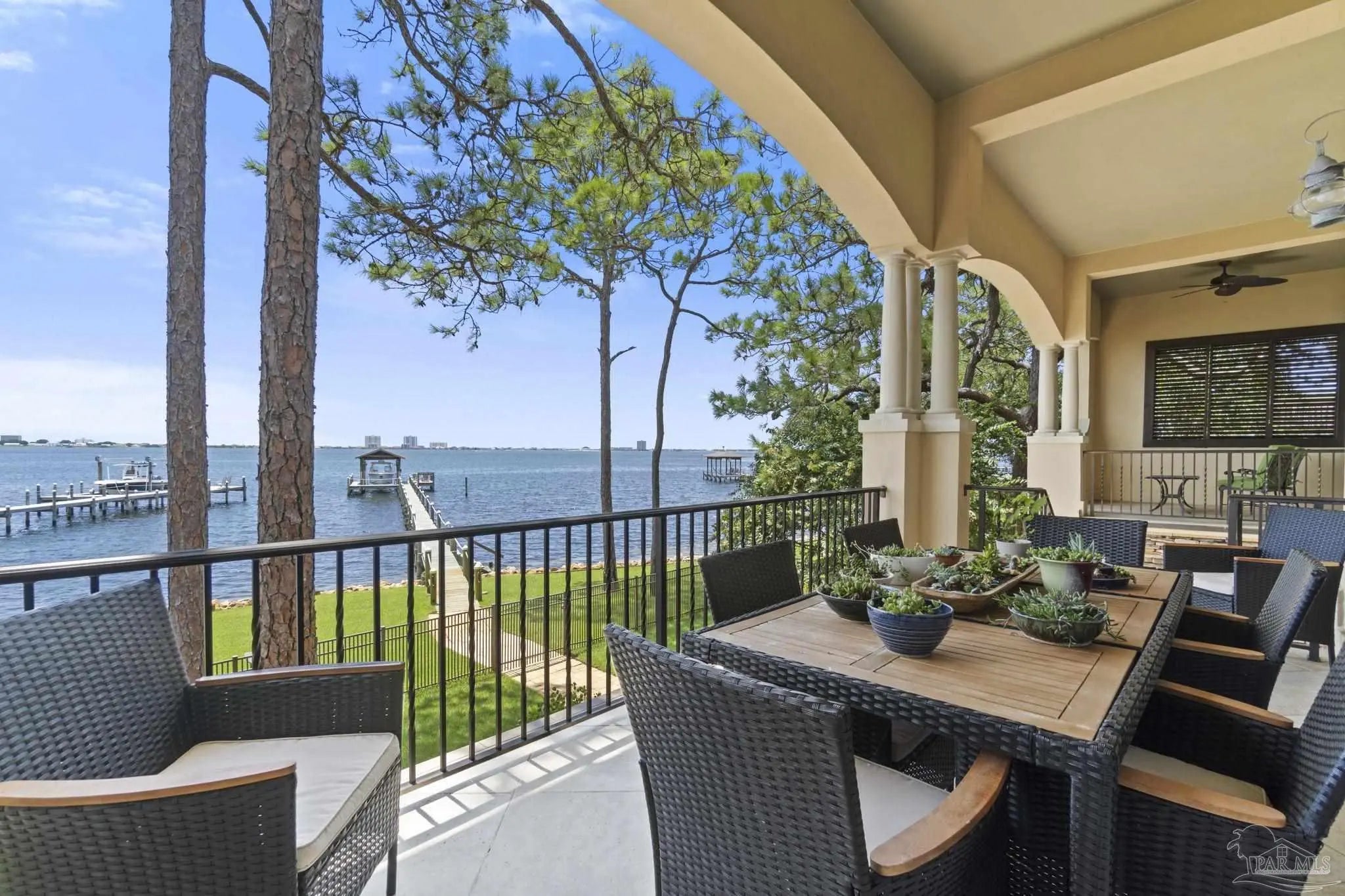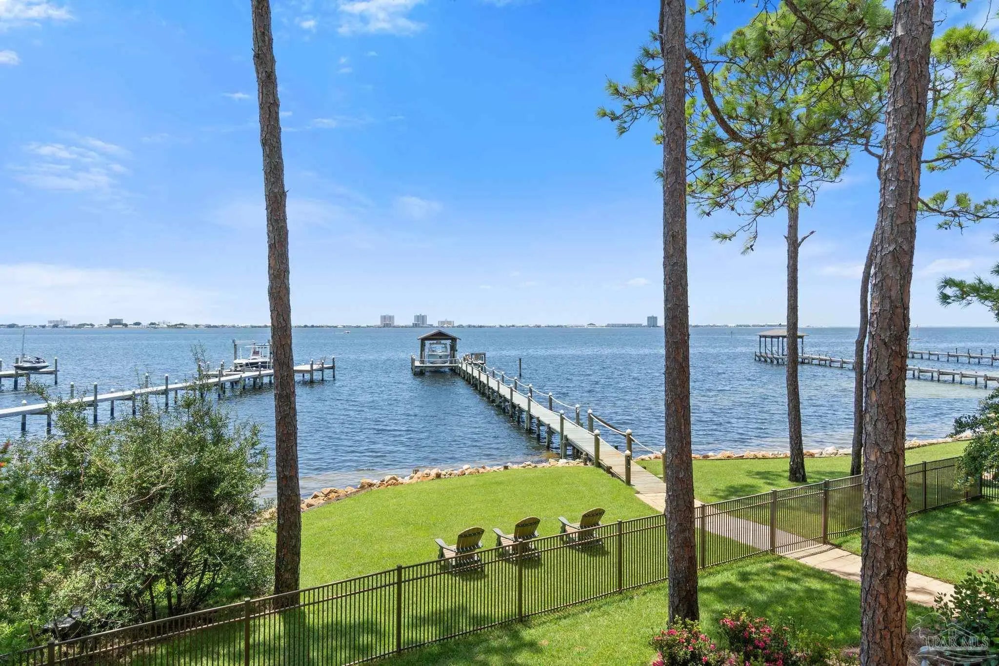 This elegant waterfront French Country home provides a panoramic view of Pensacola Sound and breathtaking sunrises and sunsets. From the courtyard and stacked stone/stucco facade to the end of the boat house and dock with boatlift, you will appreciate the construction and attention to detail. Dramatic travertine floors inlaid with a walnut accent extend into the hallway and kitchen. The 2 story vaulted living room ceiling and beams provide visual interest and large natural wood beams accent the ceilings in the entry, living room, dining area and master suite. The view of the Sound is enhanced by the windows, French doors and balconies facing south. Both the living and dining rooms enjoy the fireplace with custom stone surround, wall sconces, and custom cabinetry. The master bedroom with a 20' ceiling overlooks the water. The spacious master bath features a double vanity area, designer fixtures, built-in cabinetry, a spacious shower and a freestanding tub. The separate "his and her" closets are walk-in, one has a cedar closet and attic access for additional storage. The kitchen shows chef’s level high end appliances and a large kitchen island provides abundant work space and bar style seating. The wet bar and ice maker add to easy entertaining. A small office space is perfect for a computer work station. Note the dramatic beauty of the library/office with 8' double entry doors from New Orleans and a dramatic coffered ceiling. The large laundry houses a second refrigerator. The elevator or the stairway lead upstairs to the bedrooms have walk-in closets and full baths. A private sitting area overlooks the living room, and could be converted into a 4th bedroom. The Geothermal A/C units, ICF construction and Icynene insulation keep this space (and the entire house) cool and quiet. Enjoy the huge 4 car garage! Fifty-four concrete pilings add stability and safety to the home.